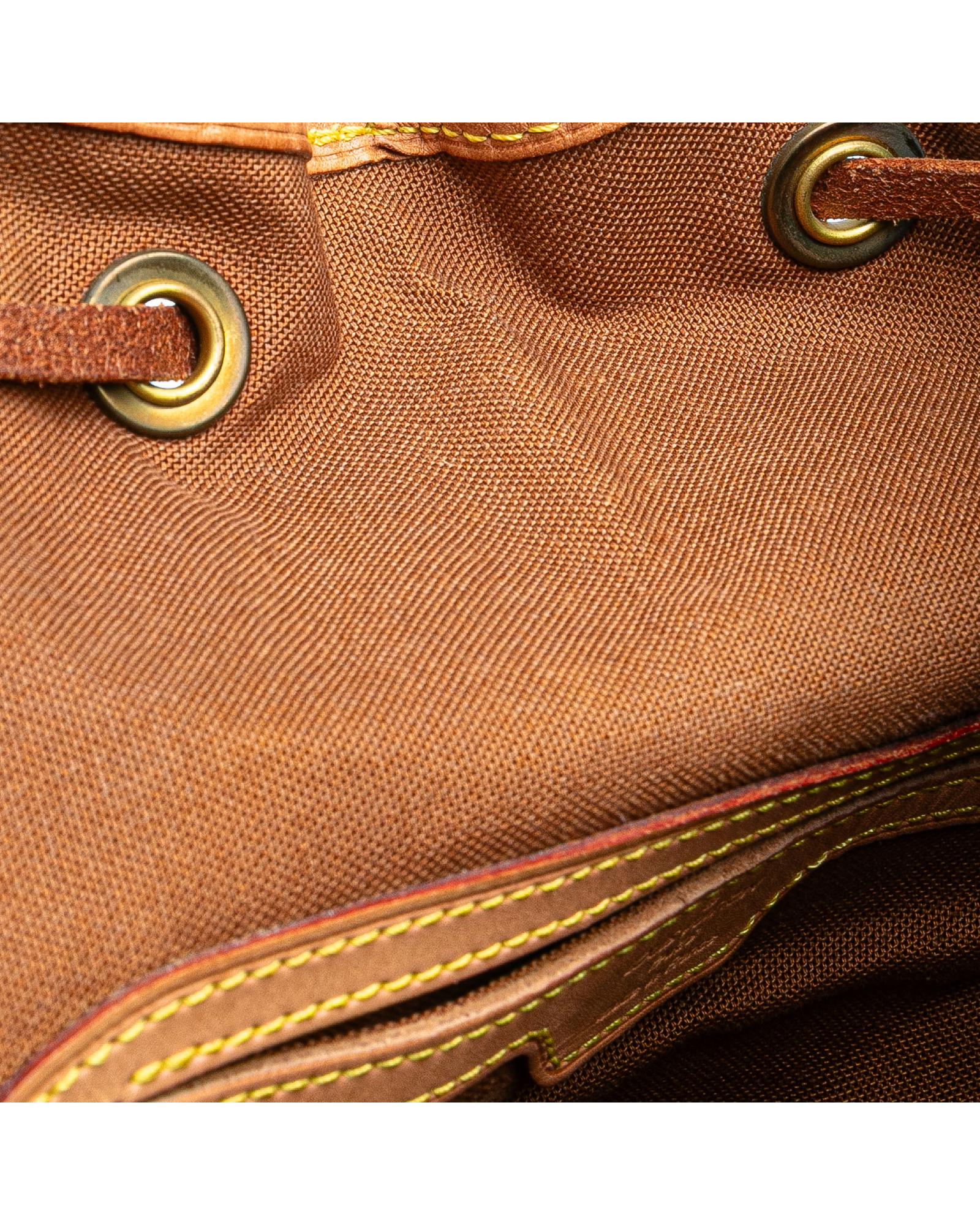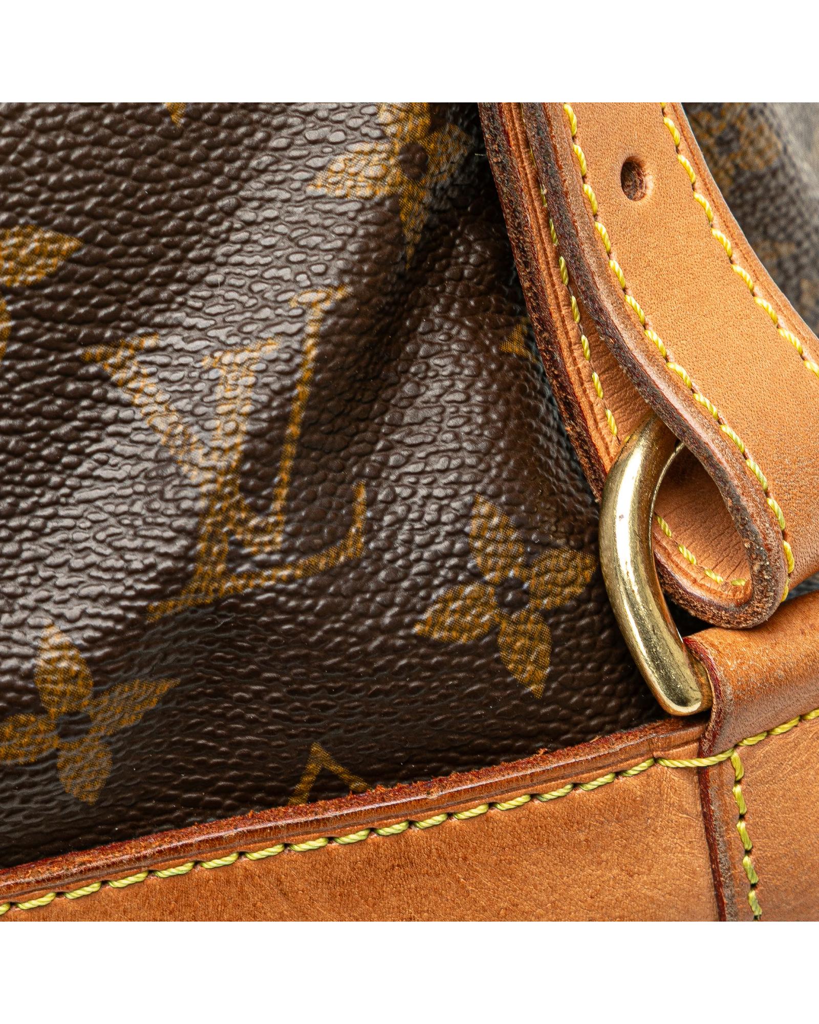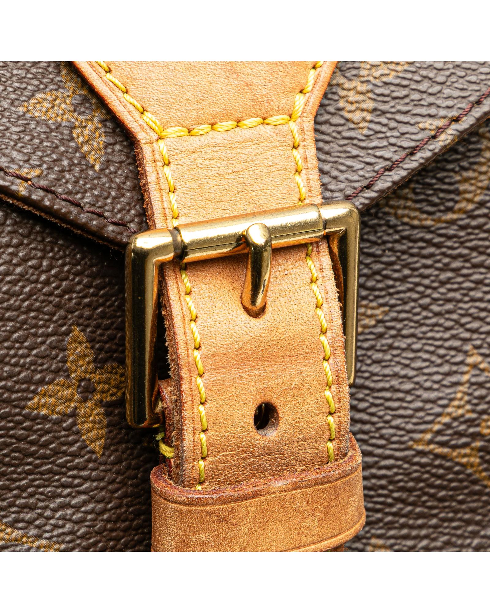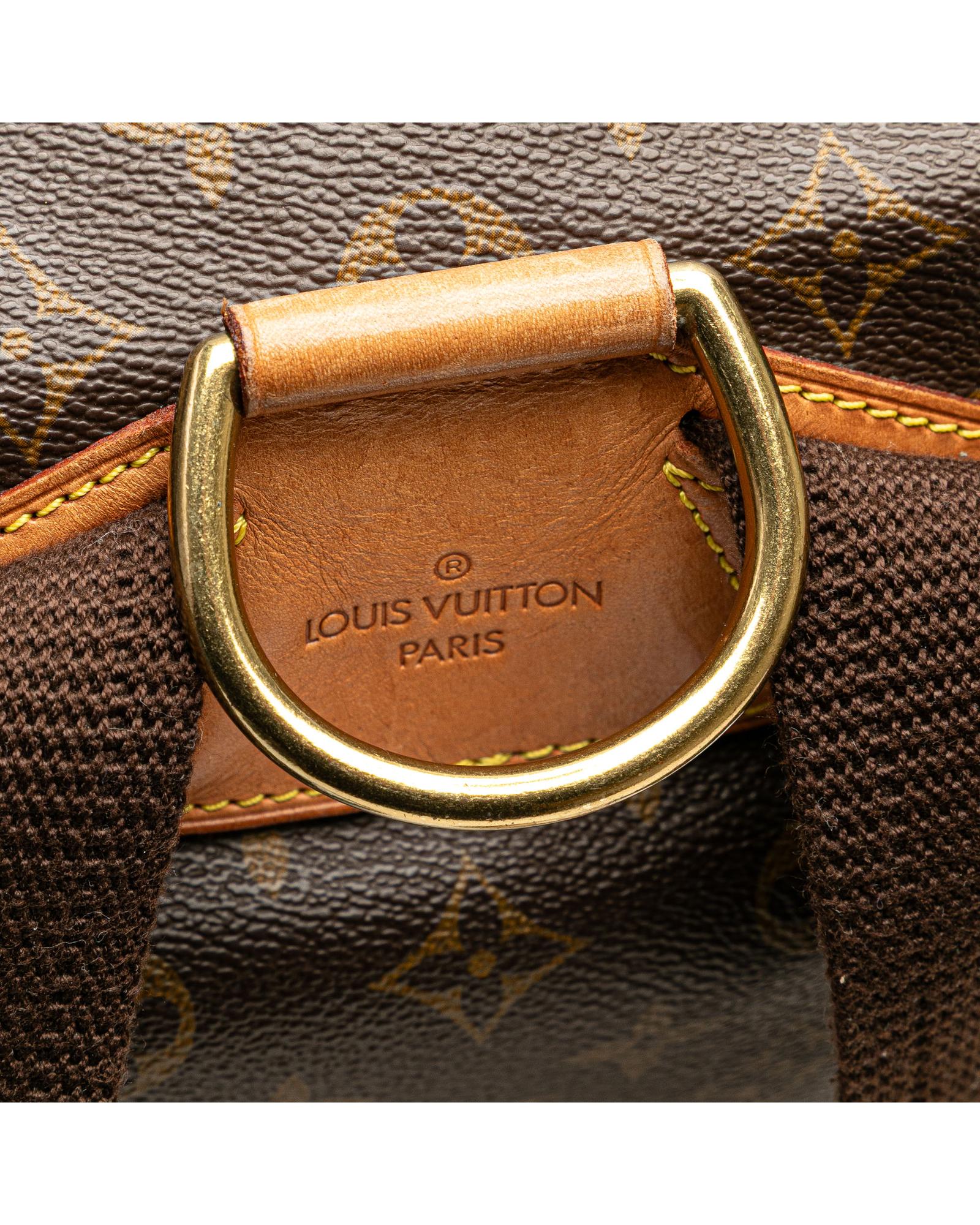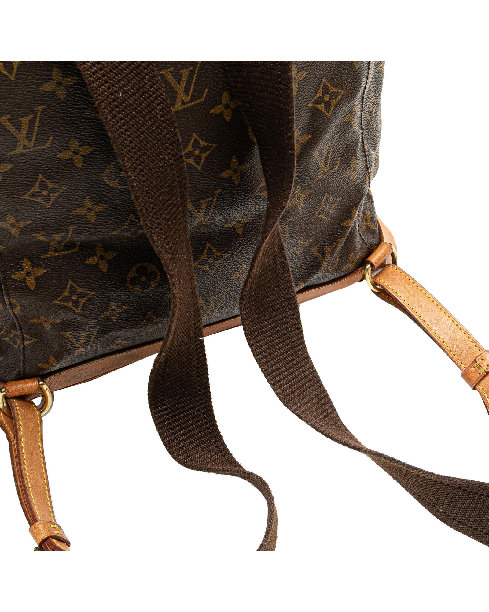The Montsouris GM features a monogram canvas body with vachetta leather trim adjustable flat back straps a flap with belt buckle detail a top drawstring closure an exterior front zip pocket and an interior slip pocket.Brand: Louis Vuitton