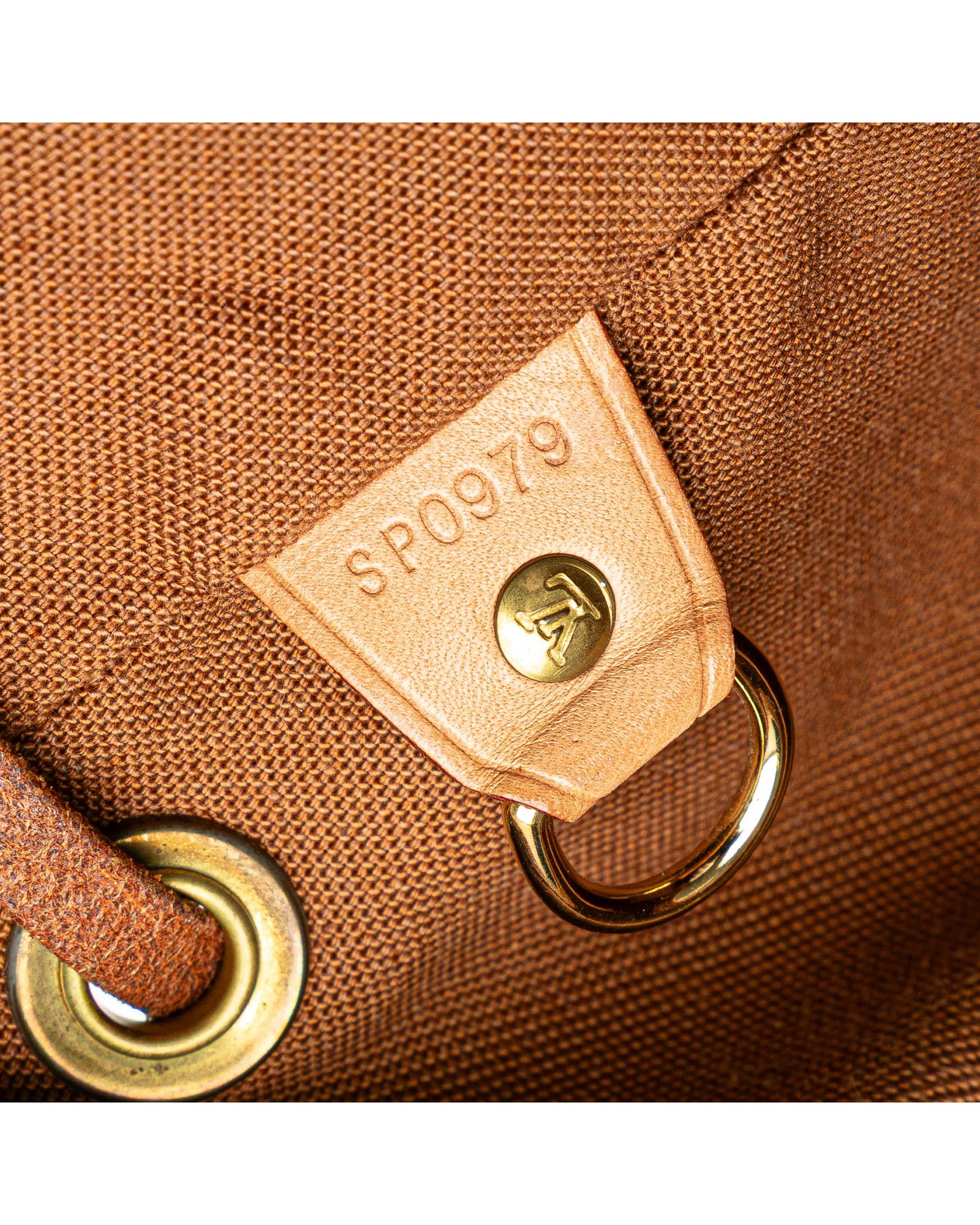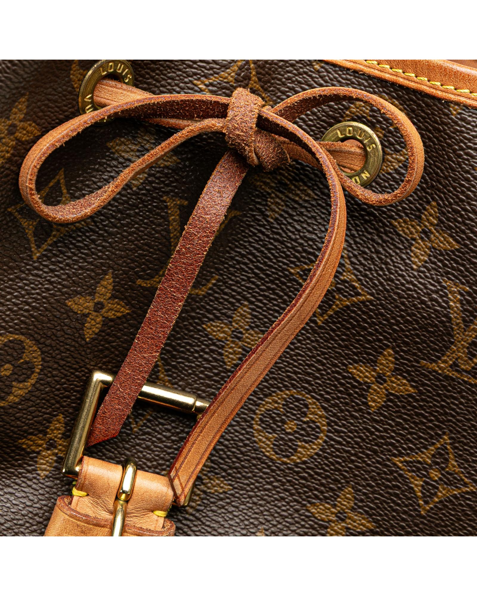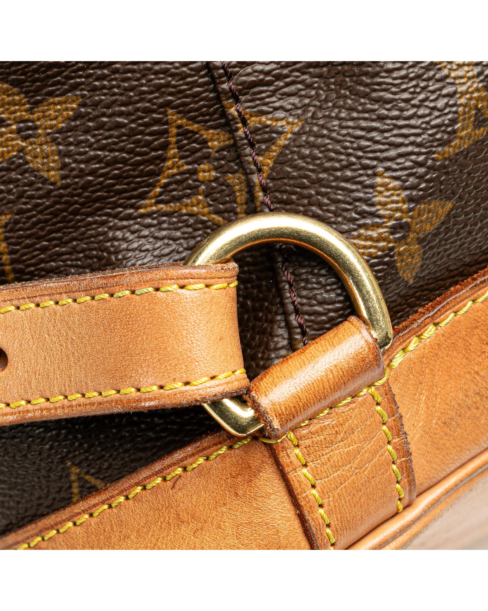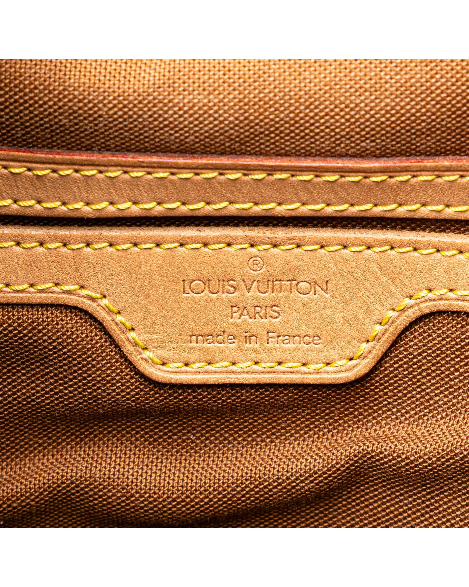 The Montsouris GM features a monogram canvas body with vachetta leather trim adjustable flat back straps a flap with belt buckle detail a top drawstring closure an exterior front zip pocket and an interior slip pocket.Brand: Louis Vuitton
