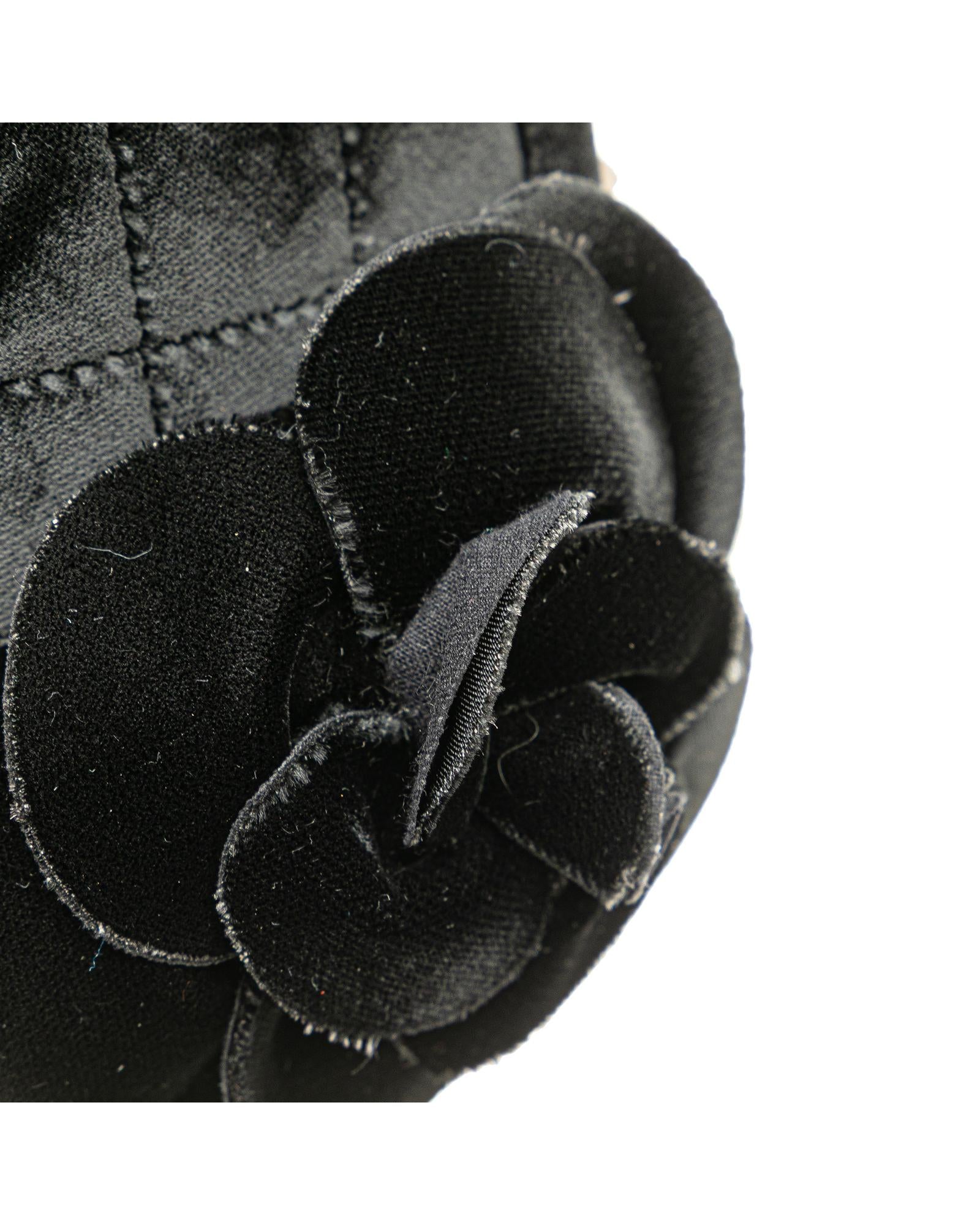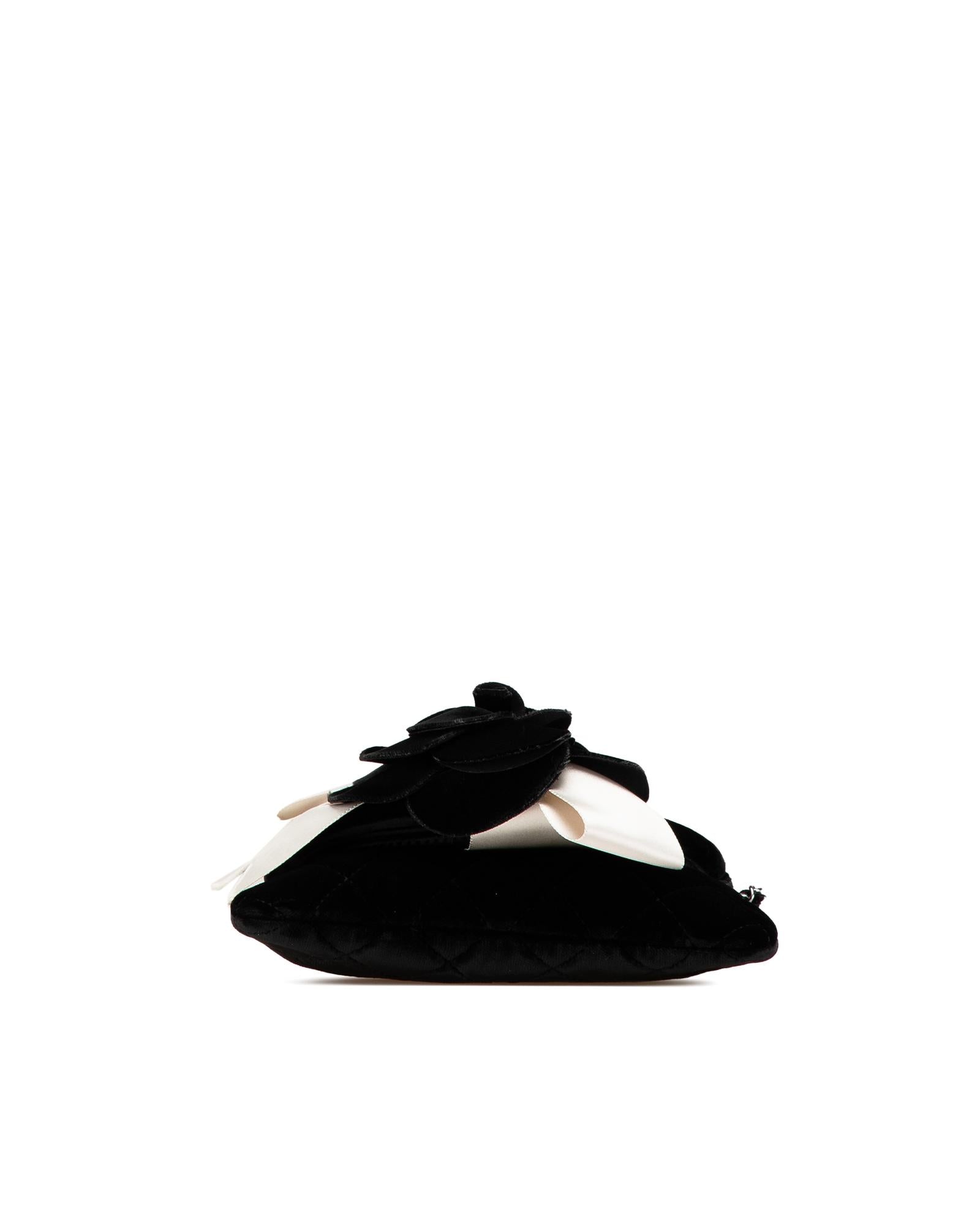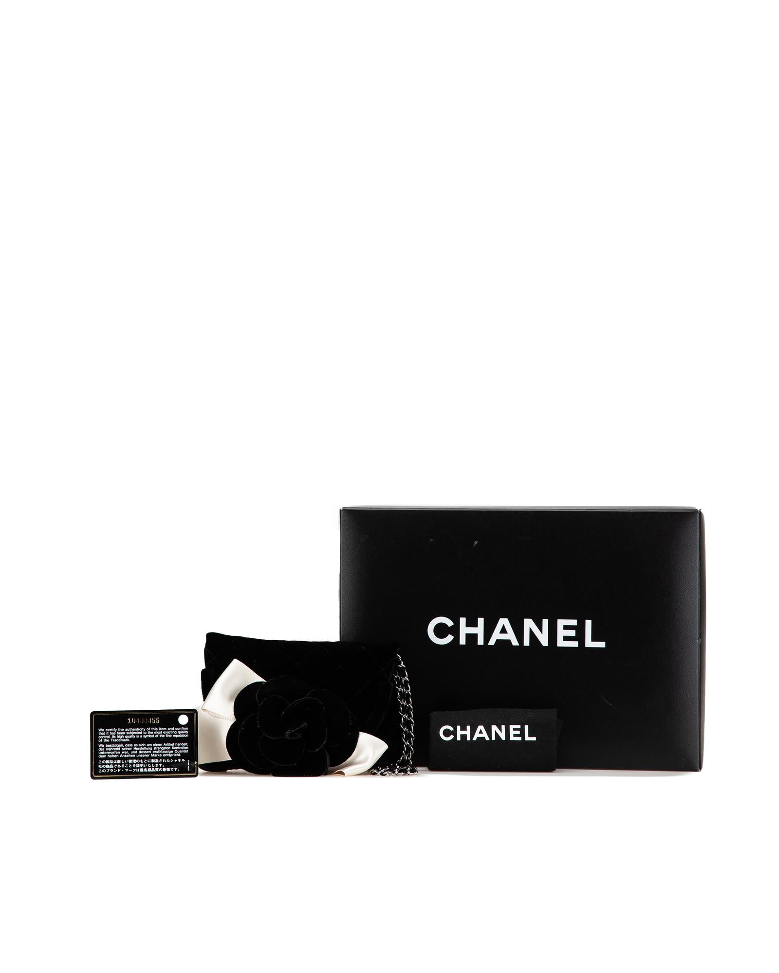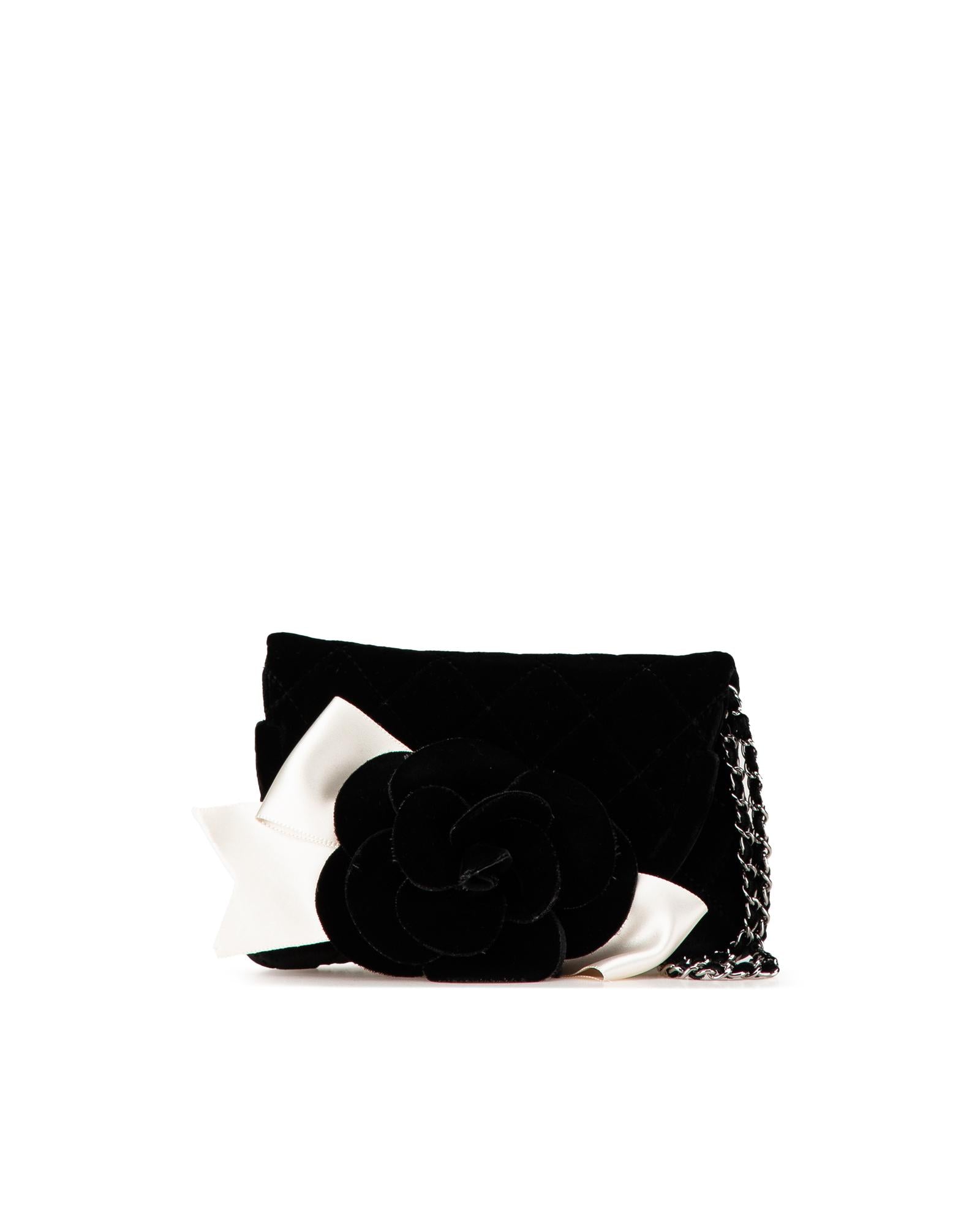 This clutch bag features a quilted velvet body with flower and satin ribbon embellishment a chain link wrist strap a front flap closure and interior slip pockets.Brand: Chanel