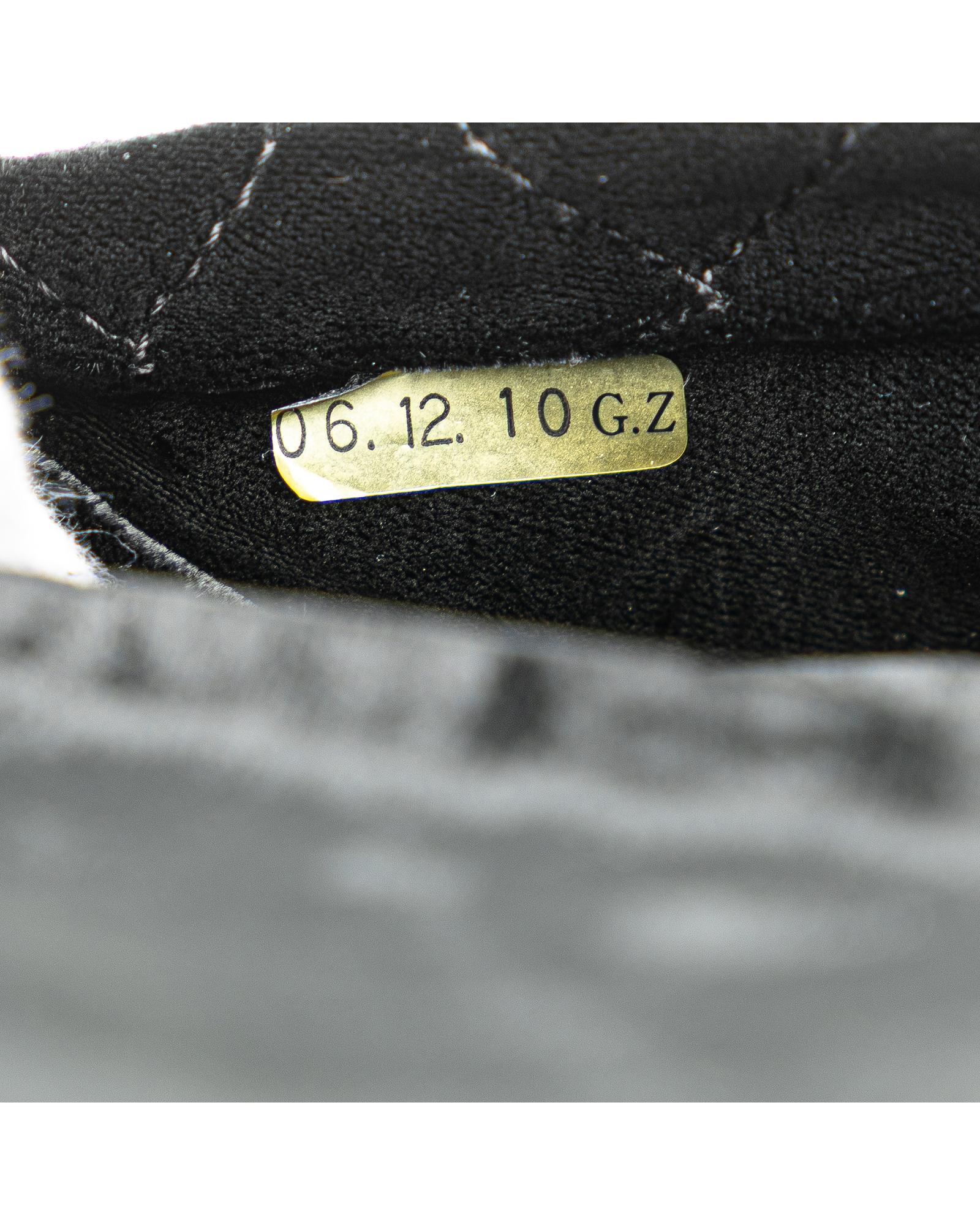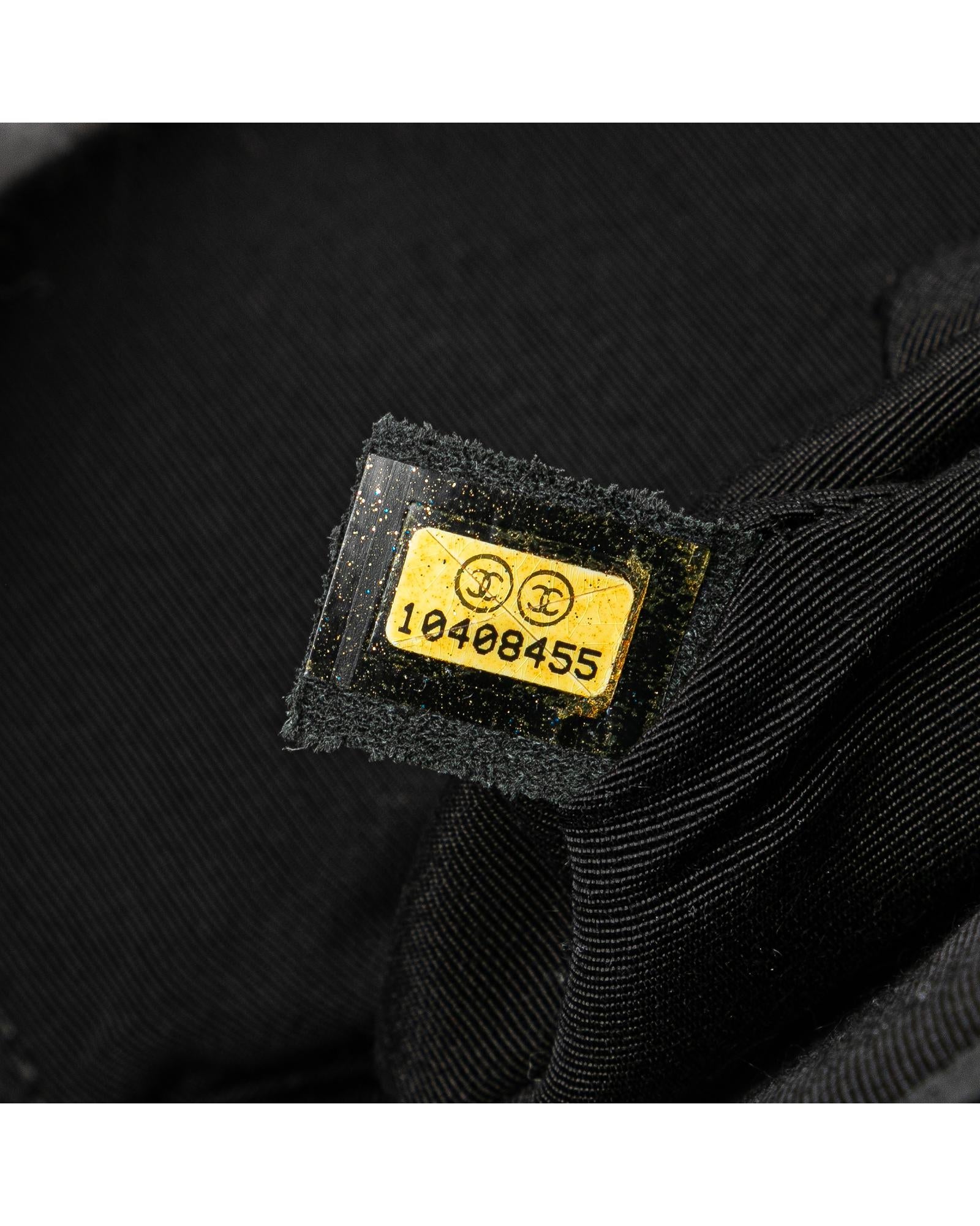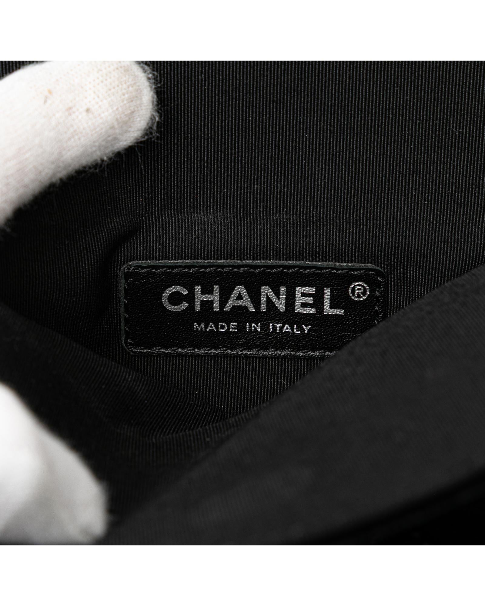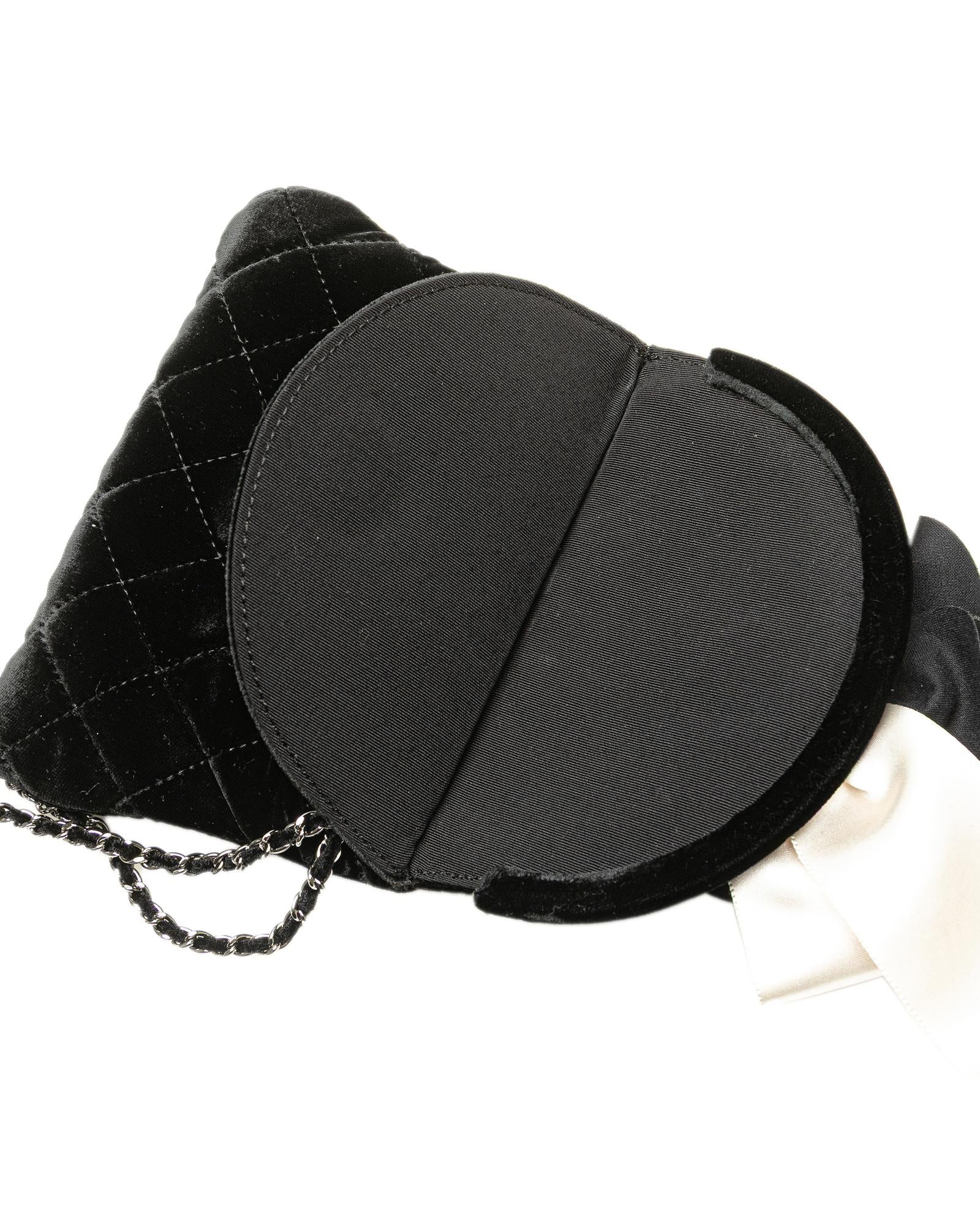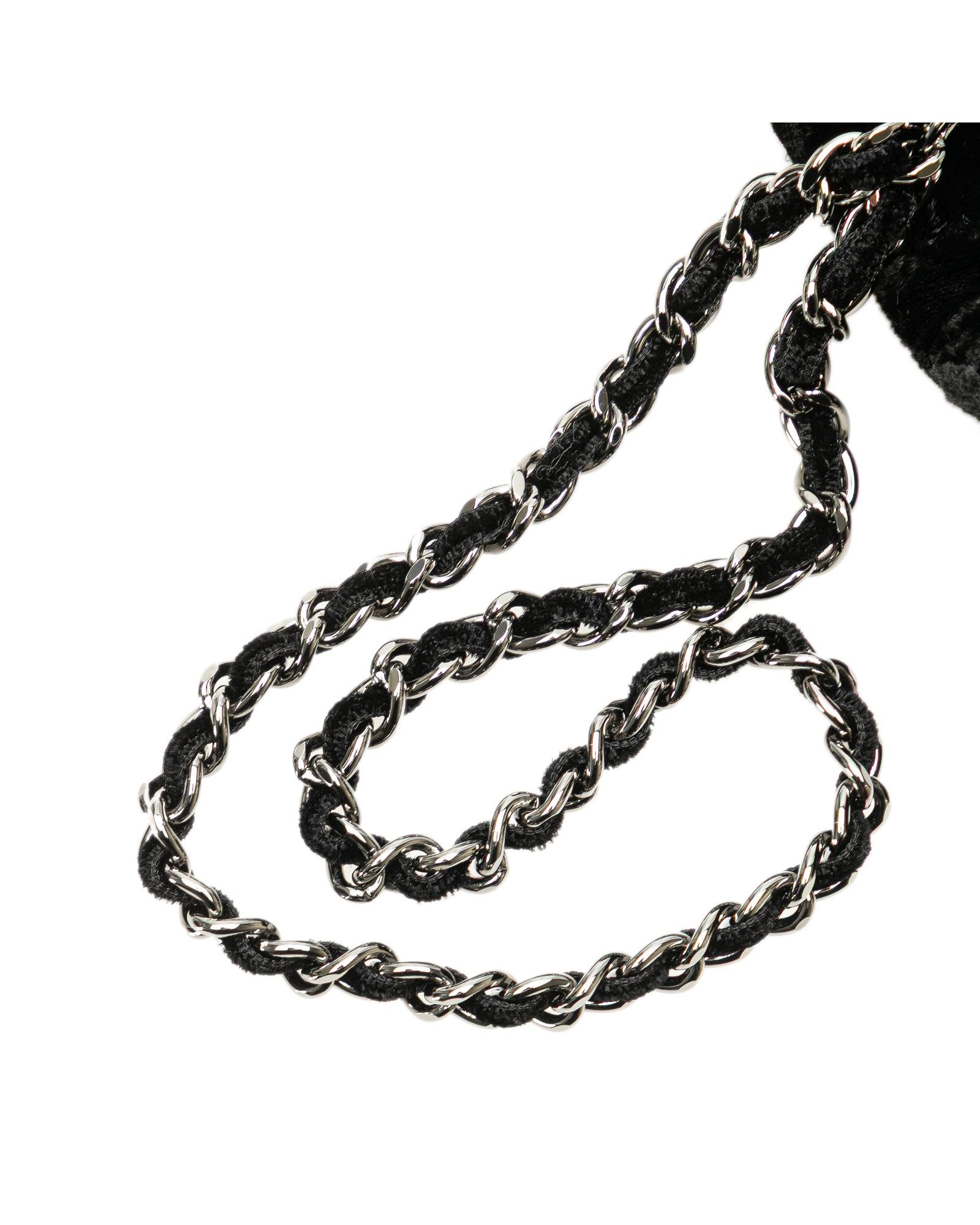 This clutch bag features a quilted velvet body with flower and satin ribbon embellishment a chain link wrist strap a front flap closure and interior slip pockets.Brand: Chanel