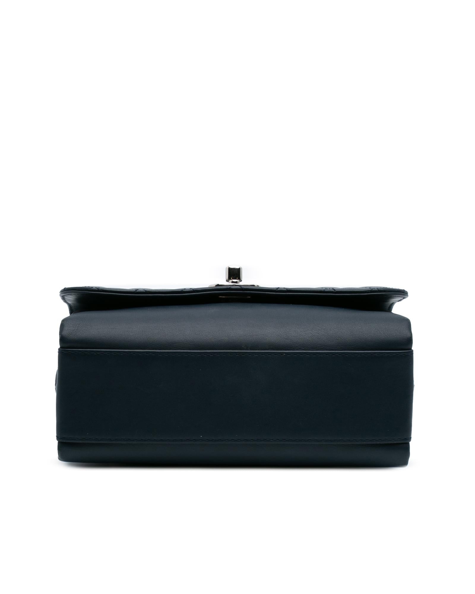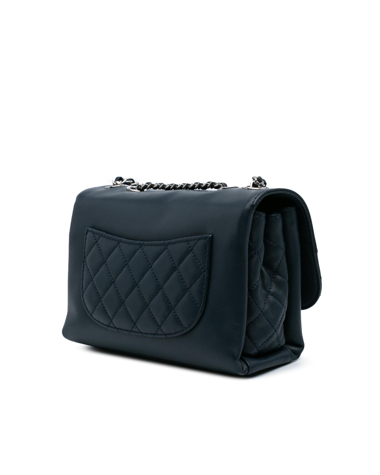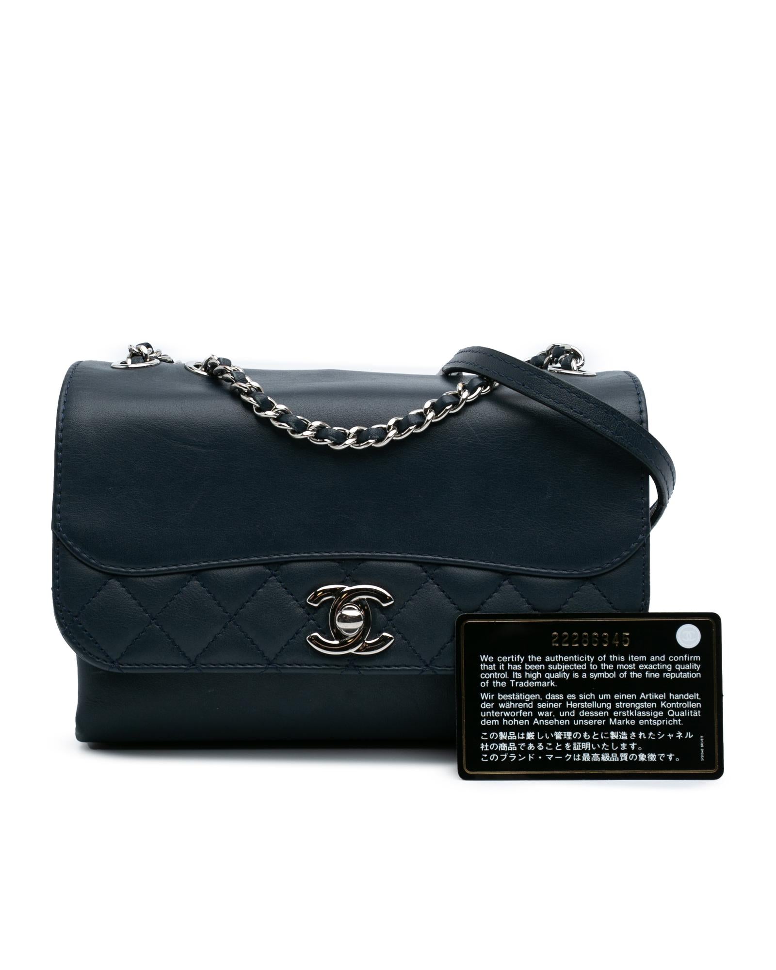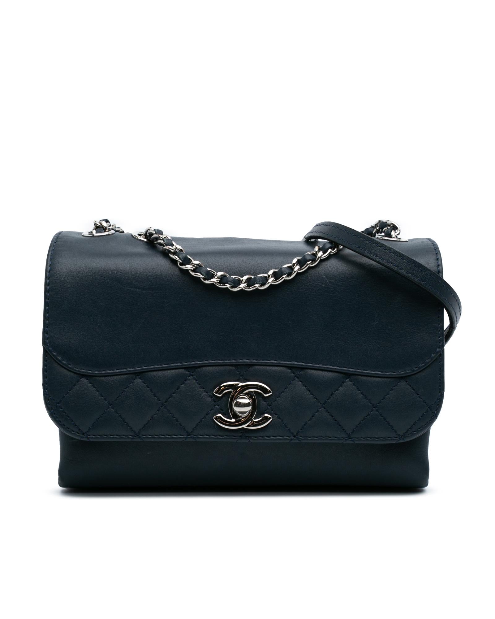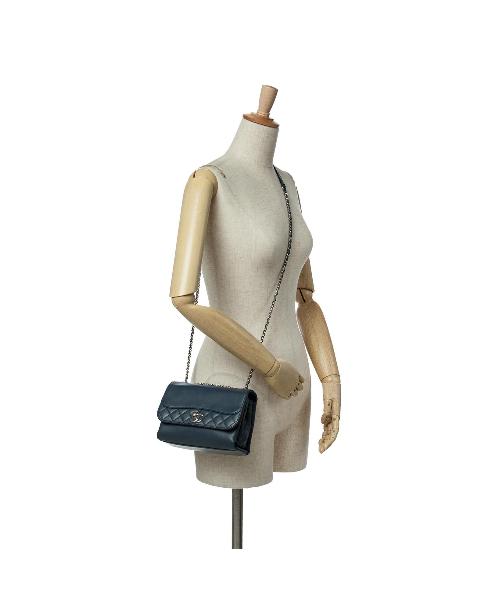 This crossbody bag features a leather body with quilt details a leather-woven chain strap with leather shoulder guard a front flap with twist lock closure an exterior back slip pocket and interior open compartments.