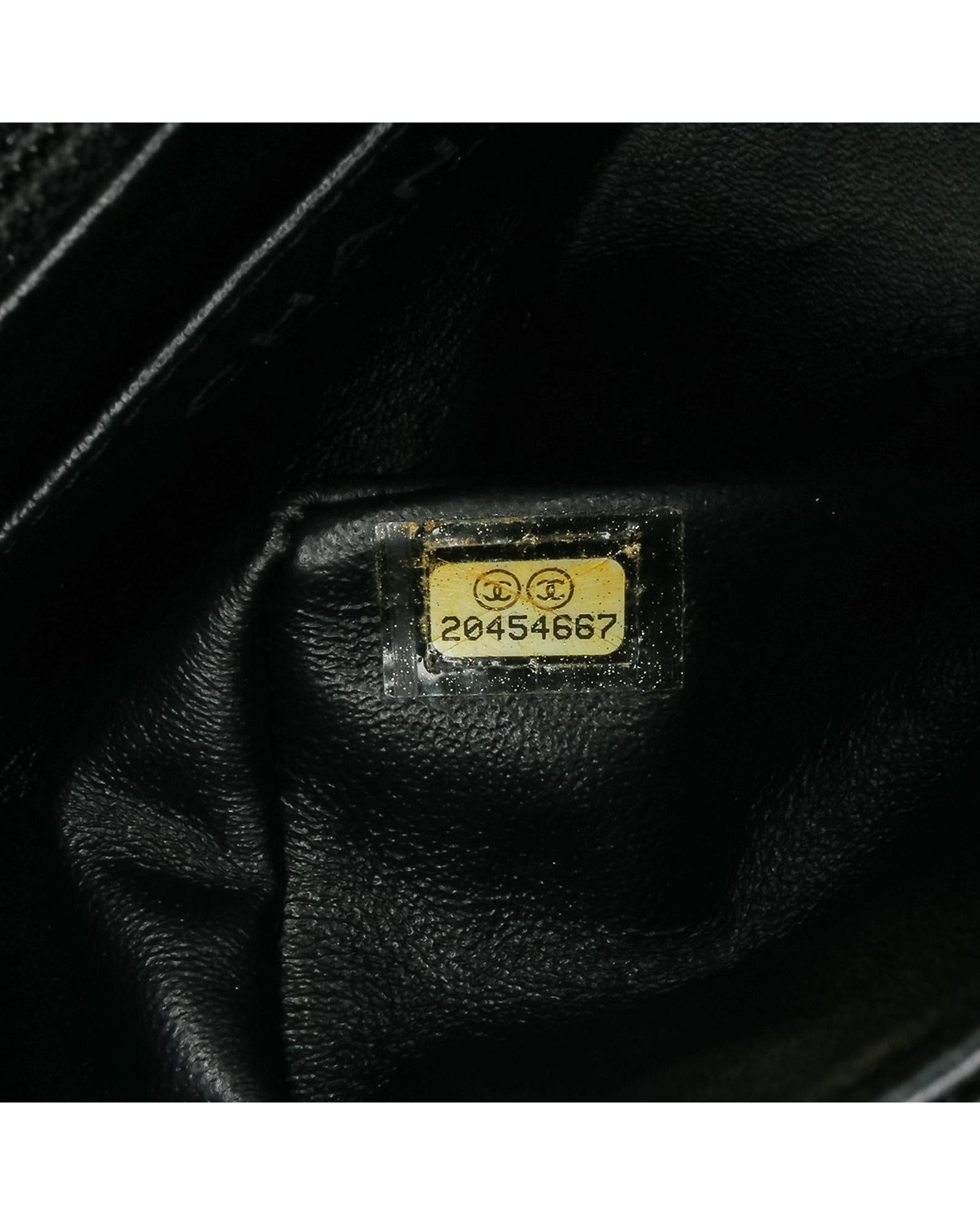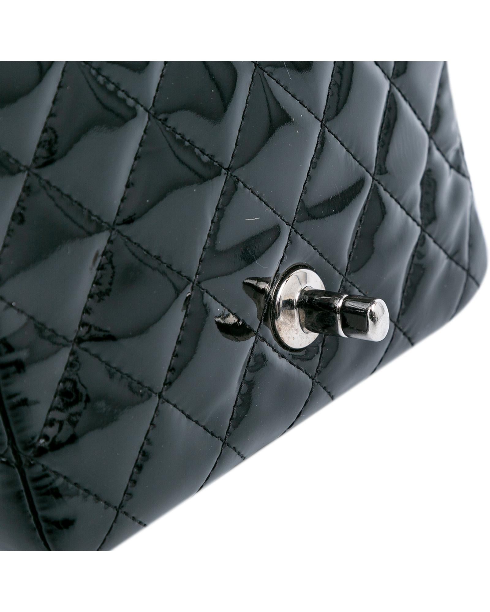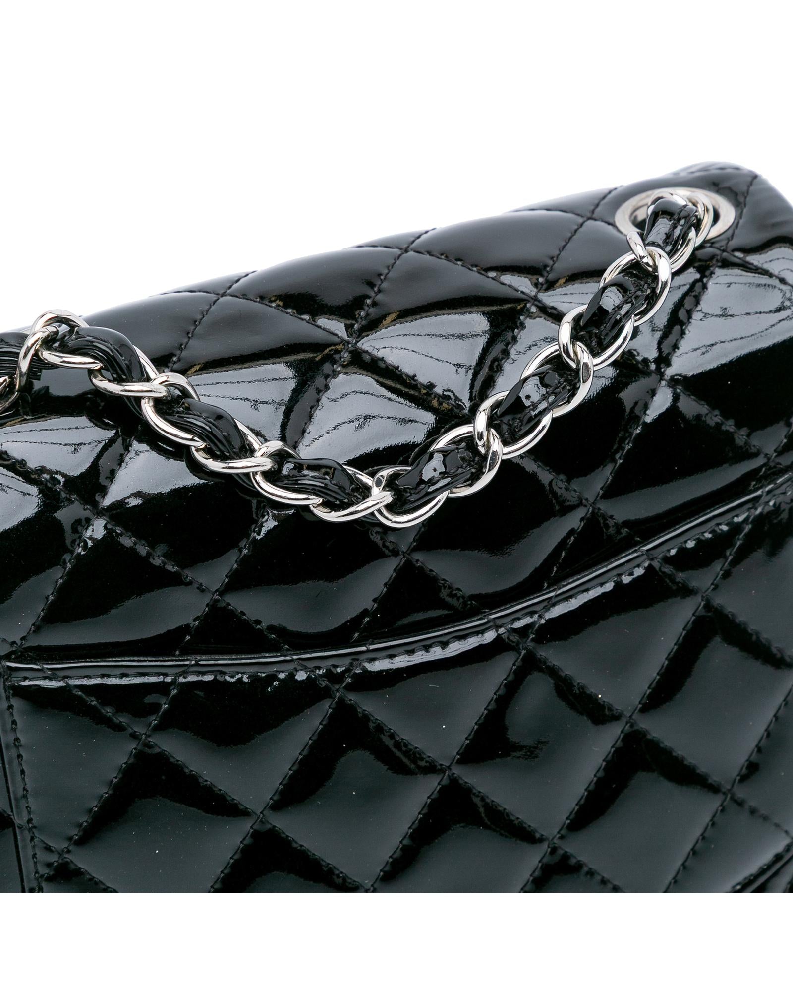 This flap bag features a quilted patent leather body a leather woven chain shoulder strap a front flap with interlocking Cs and a twist lock closure an exterior back slip pocket and interior zip and slip pockets.Brand: Chanel
