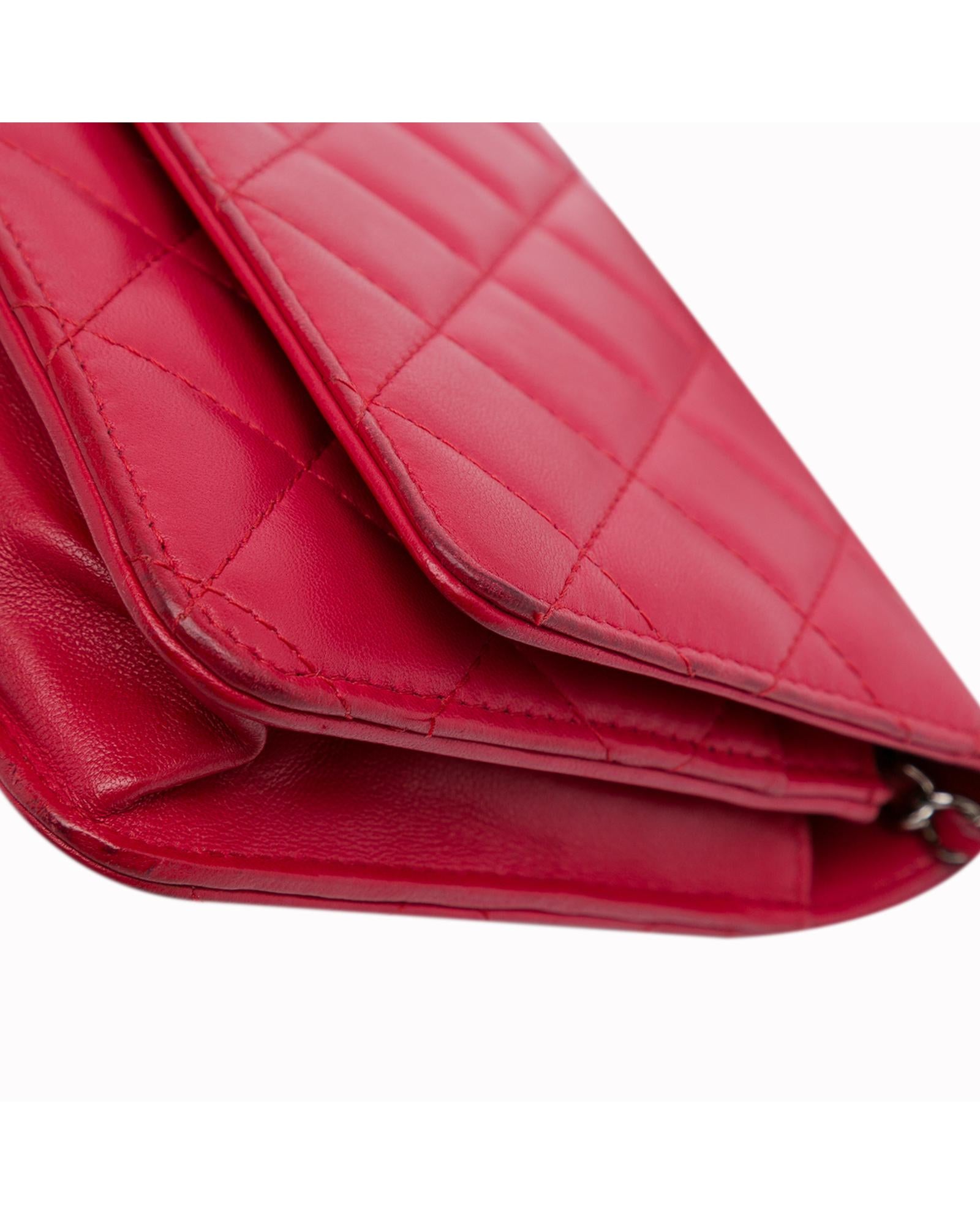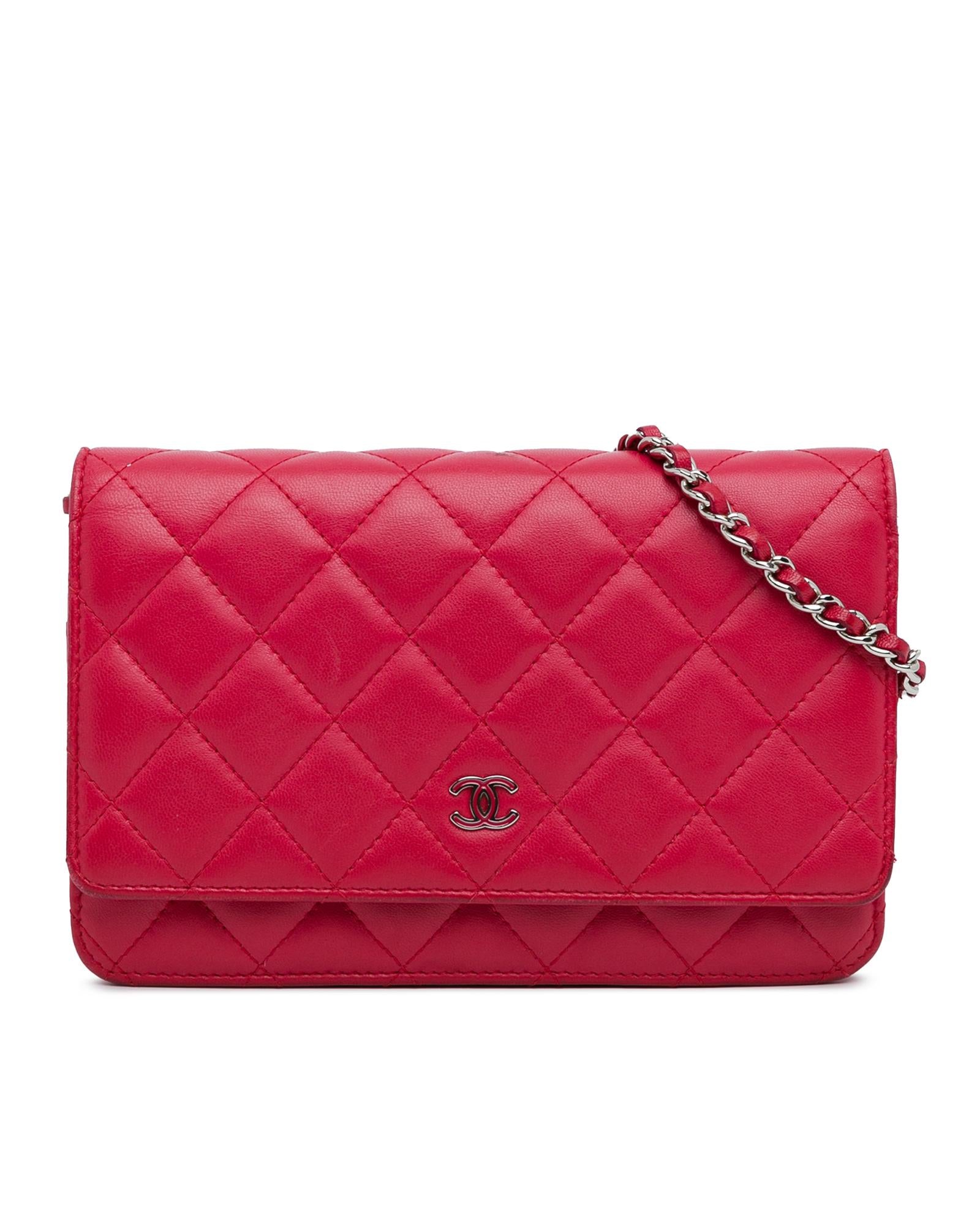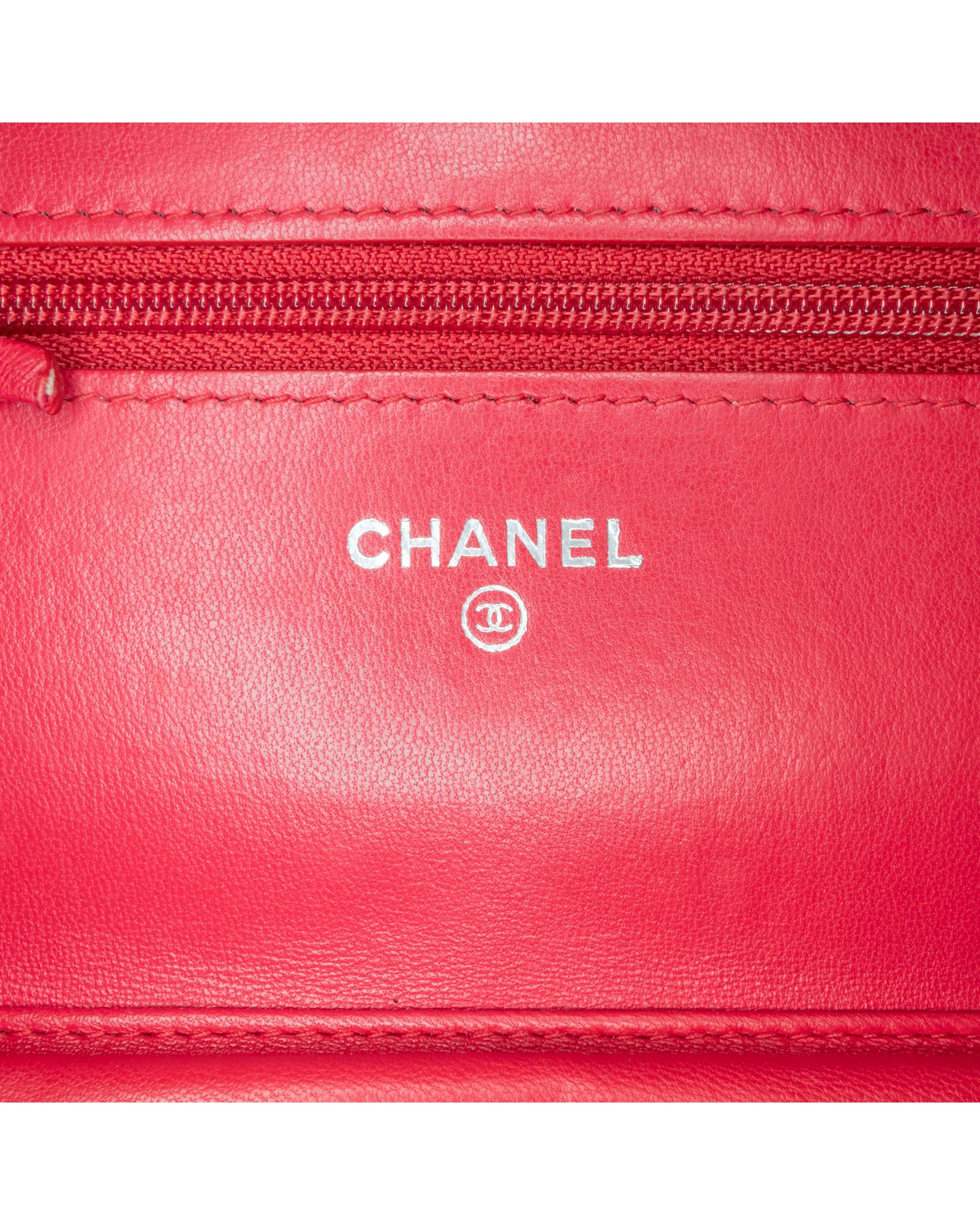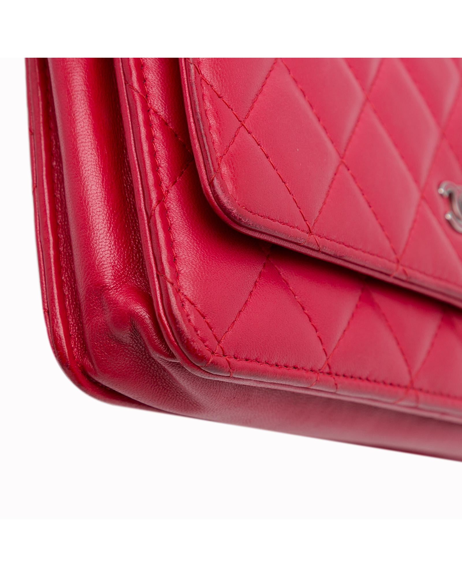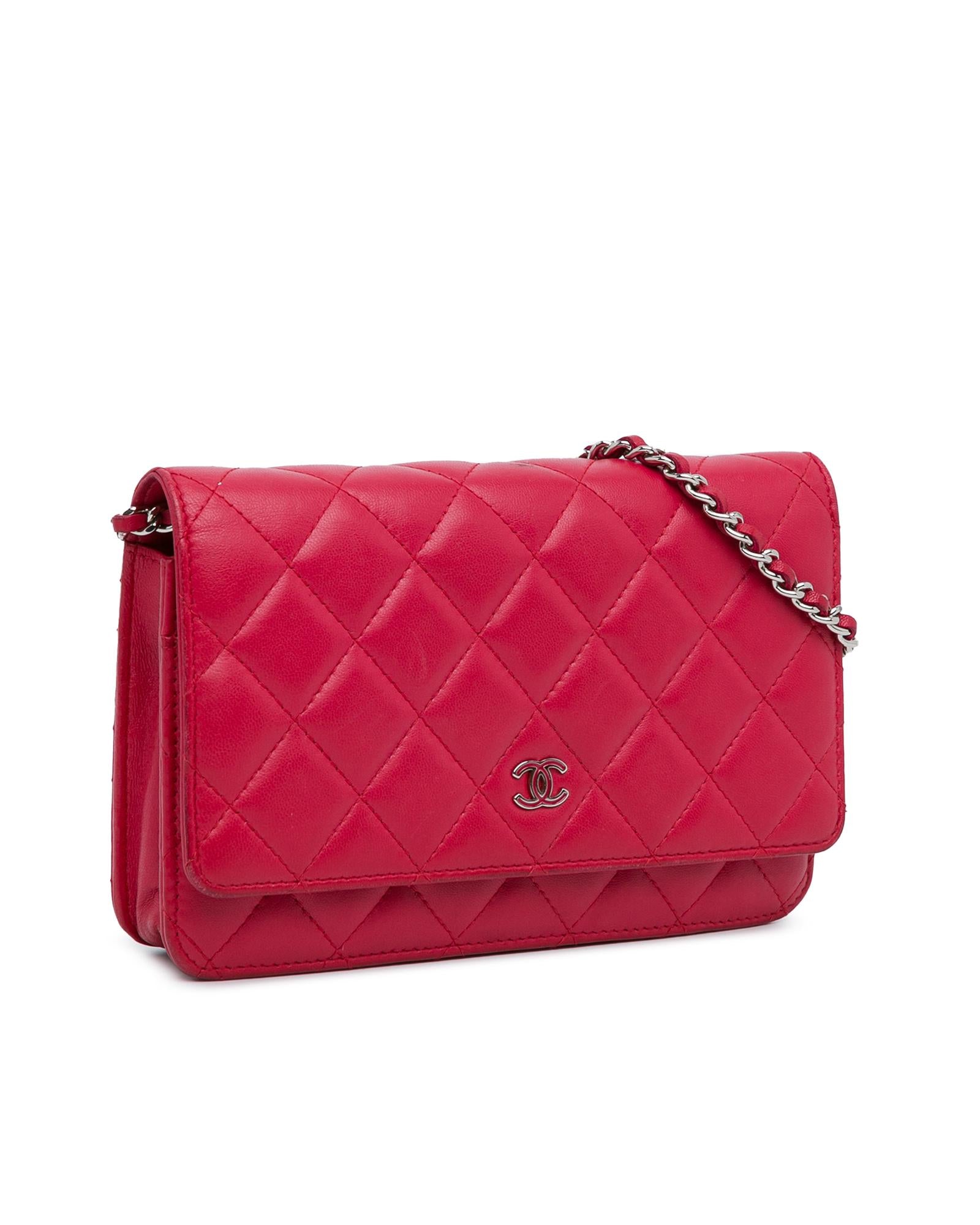 This wallet on chain features a quilted lambskin leather body a leather woven chain strap a front flap with magnetic closure an exterior back slip pocket and interior zip and slip pockets.Brand: Chanel
