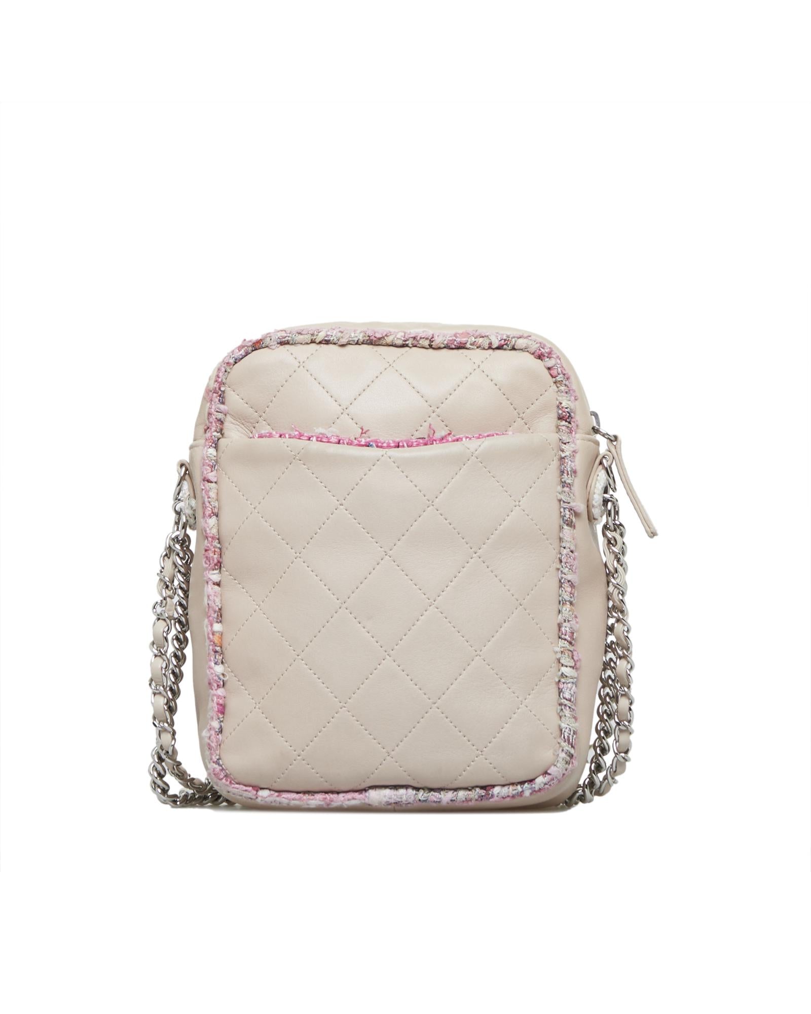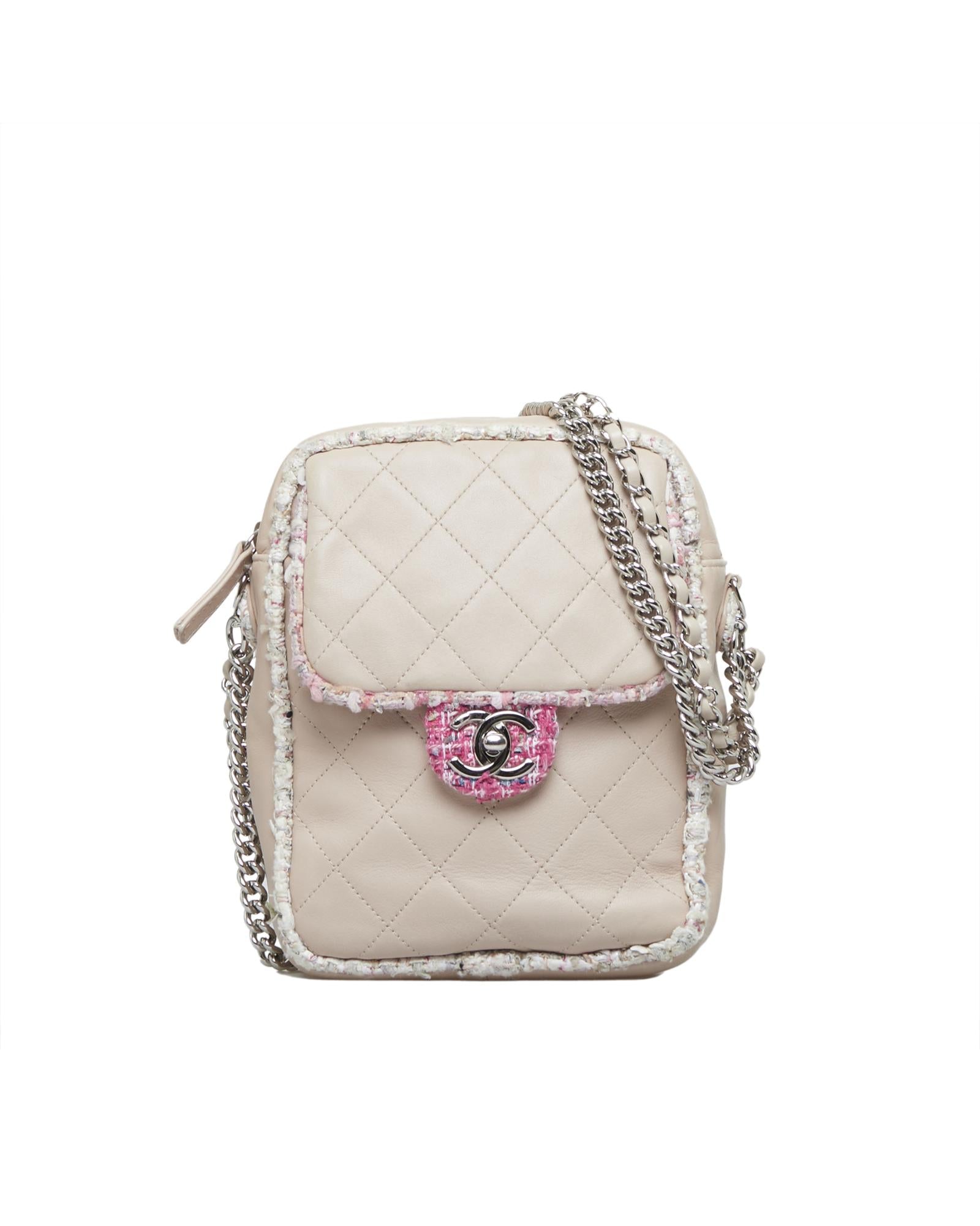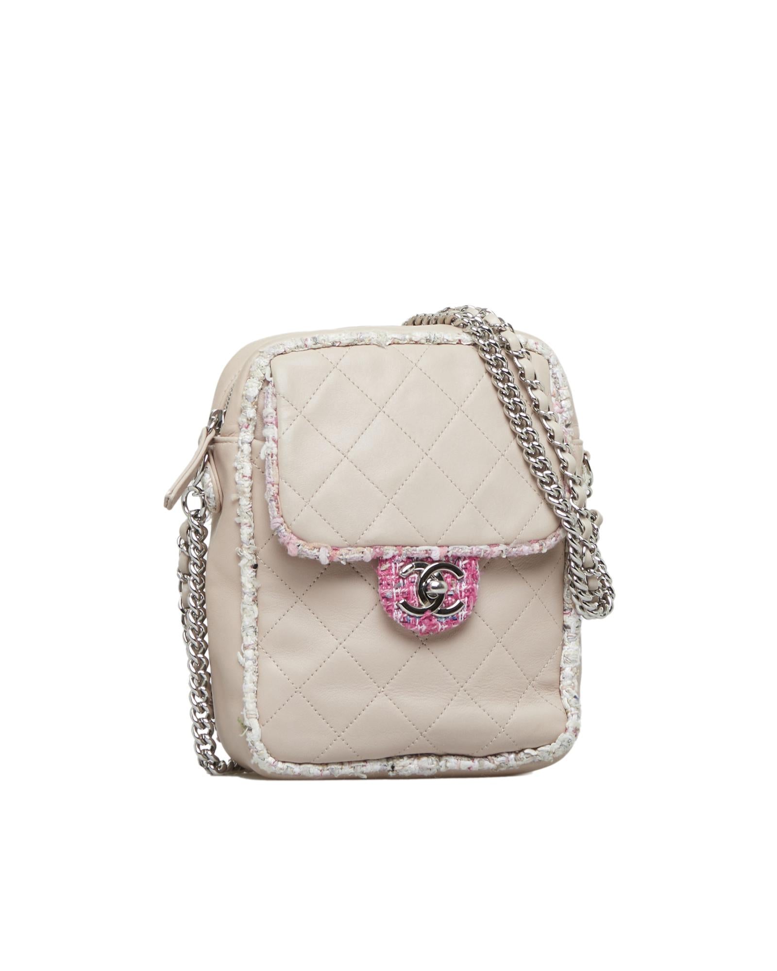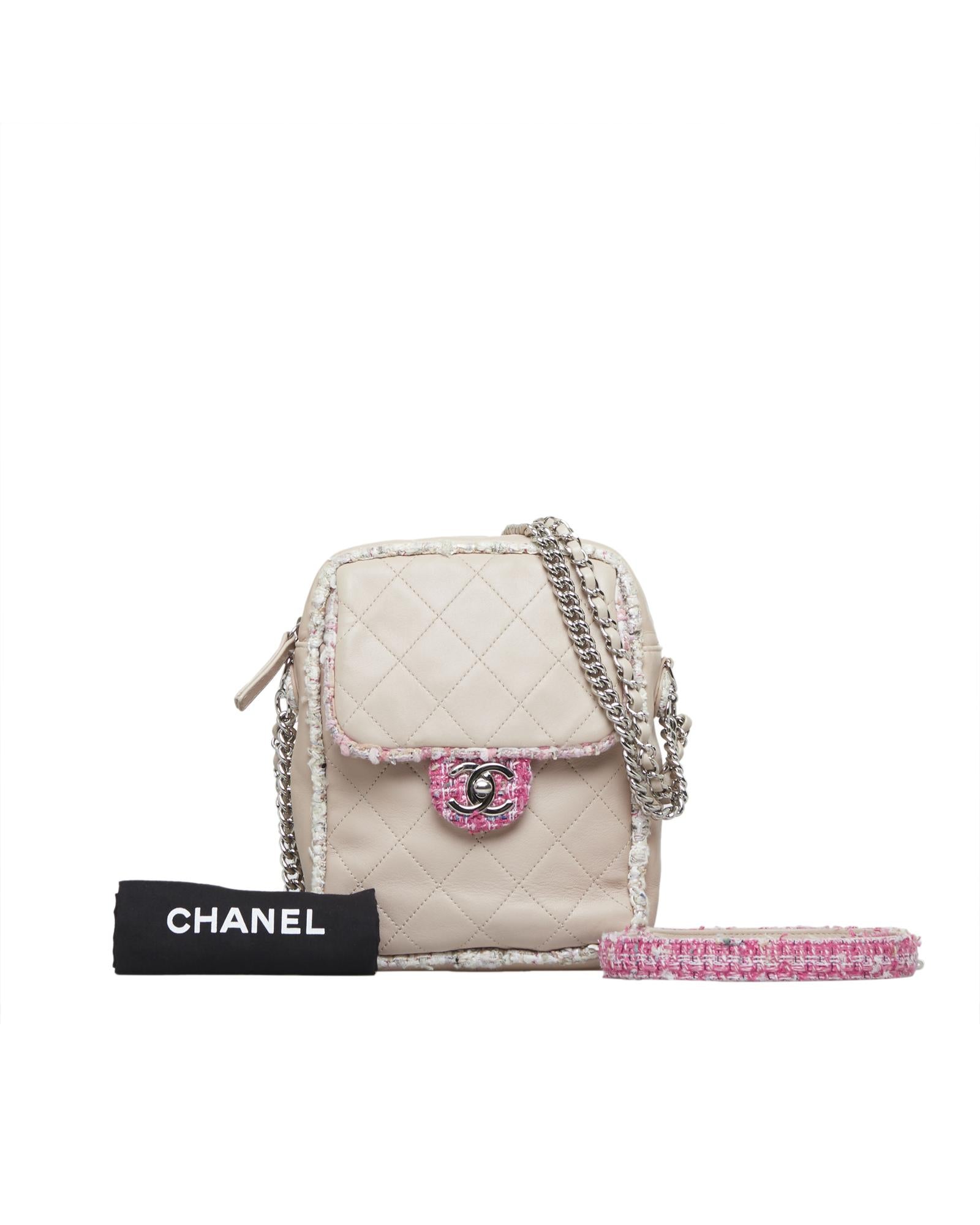This crossbody bag features a quilted lambskin leather body with a tweed trim an exterior slip pocket leather-woven chain straps a top zip closure and an exterior pocket with a flap closure.Brand: Chanel