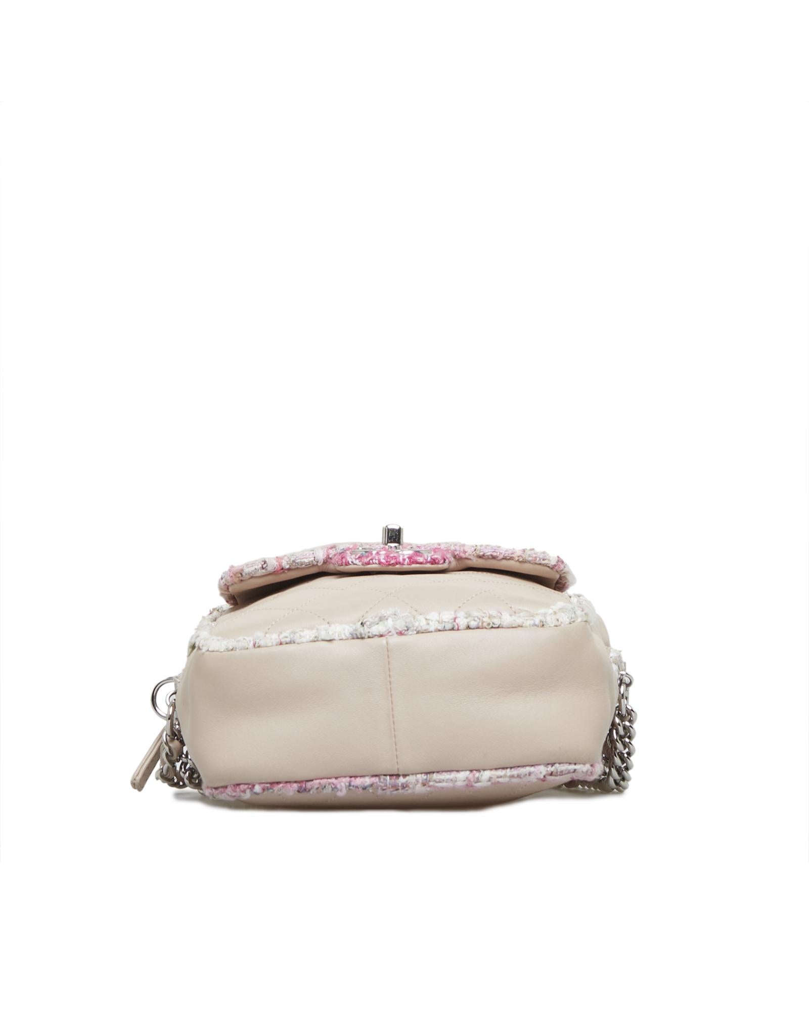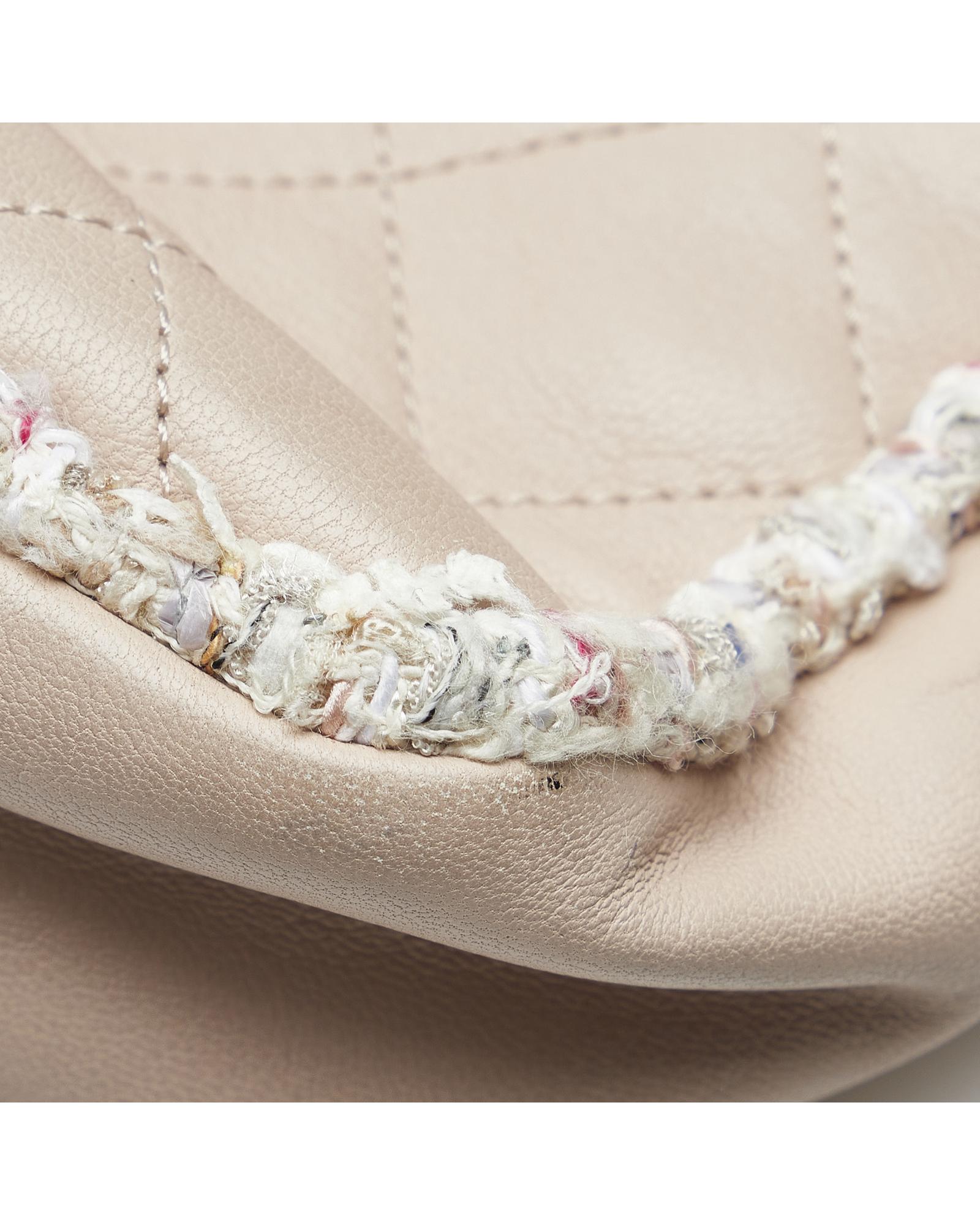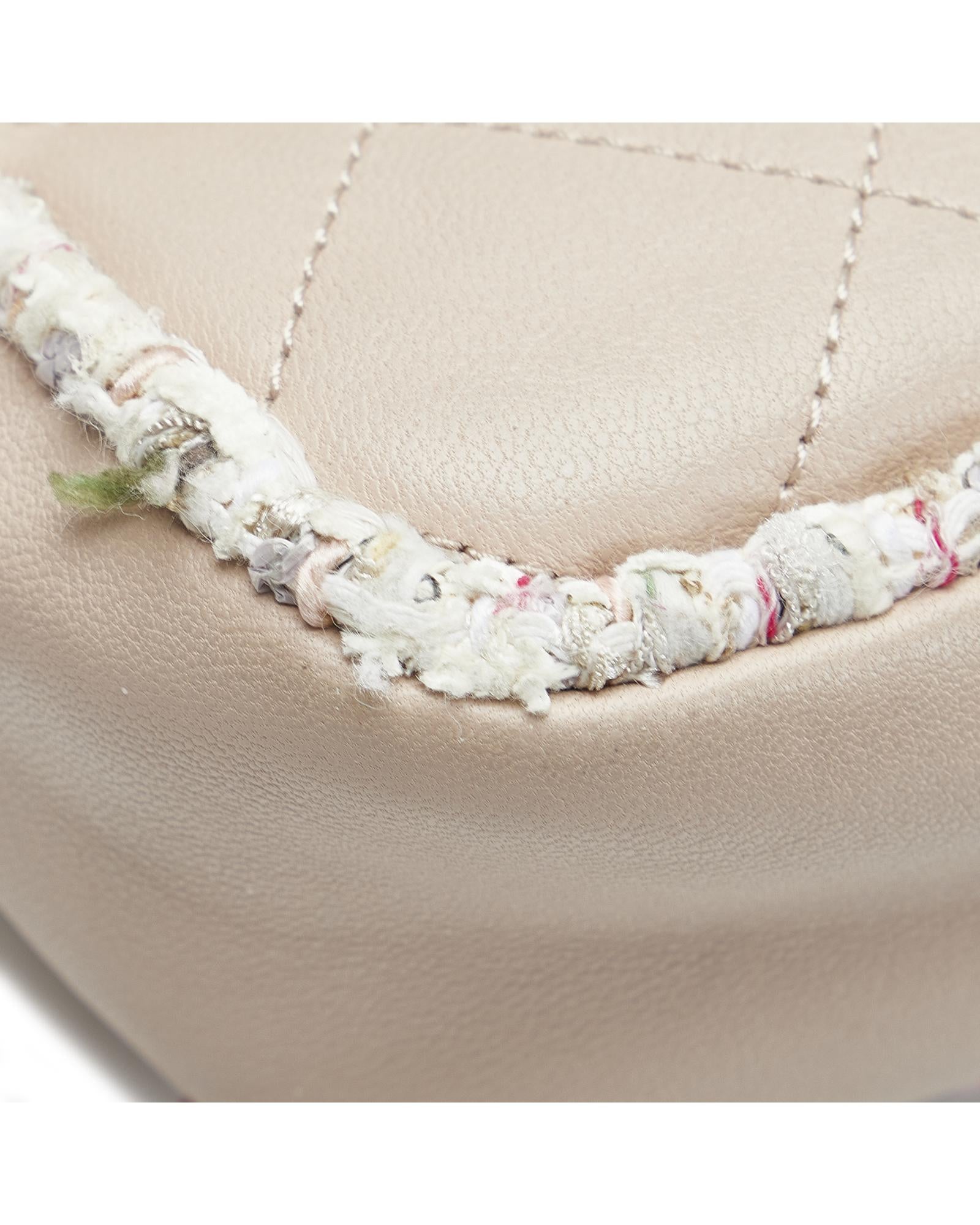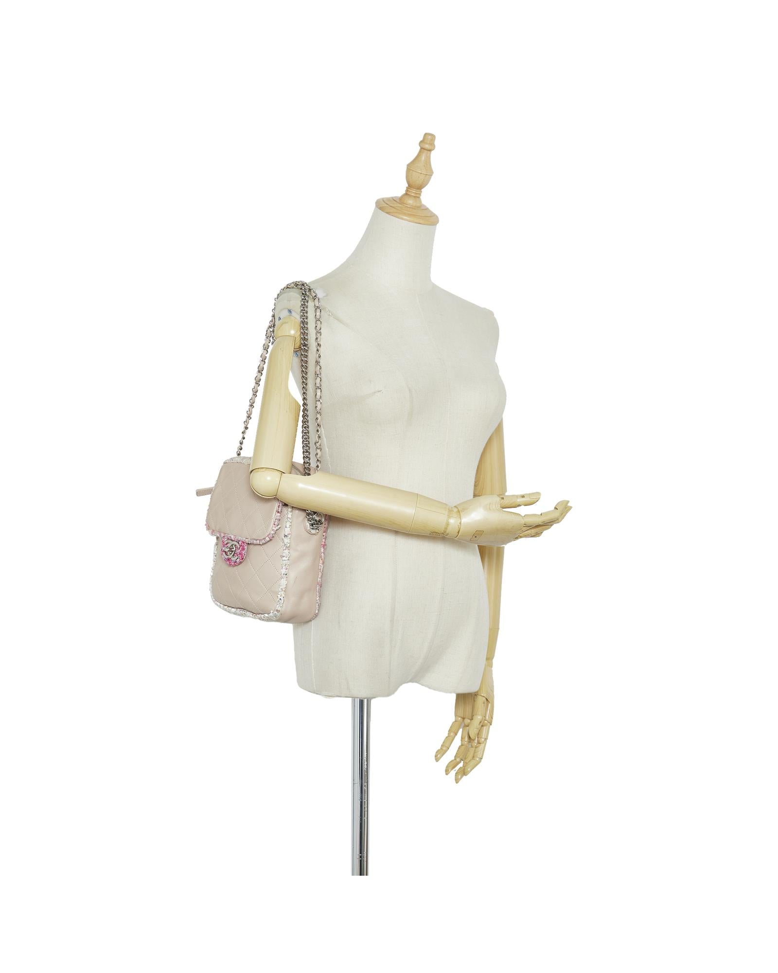 This crossbody bag features a quilted lambskin leather body with a tweed trim an exterior slip pocket leather-woven chain straps a top zip closure and an exterior pocket with a flap closure.Brand: Chanel