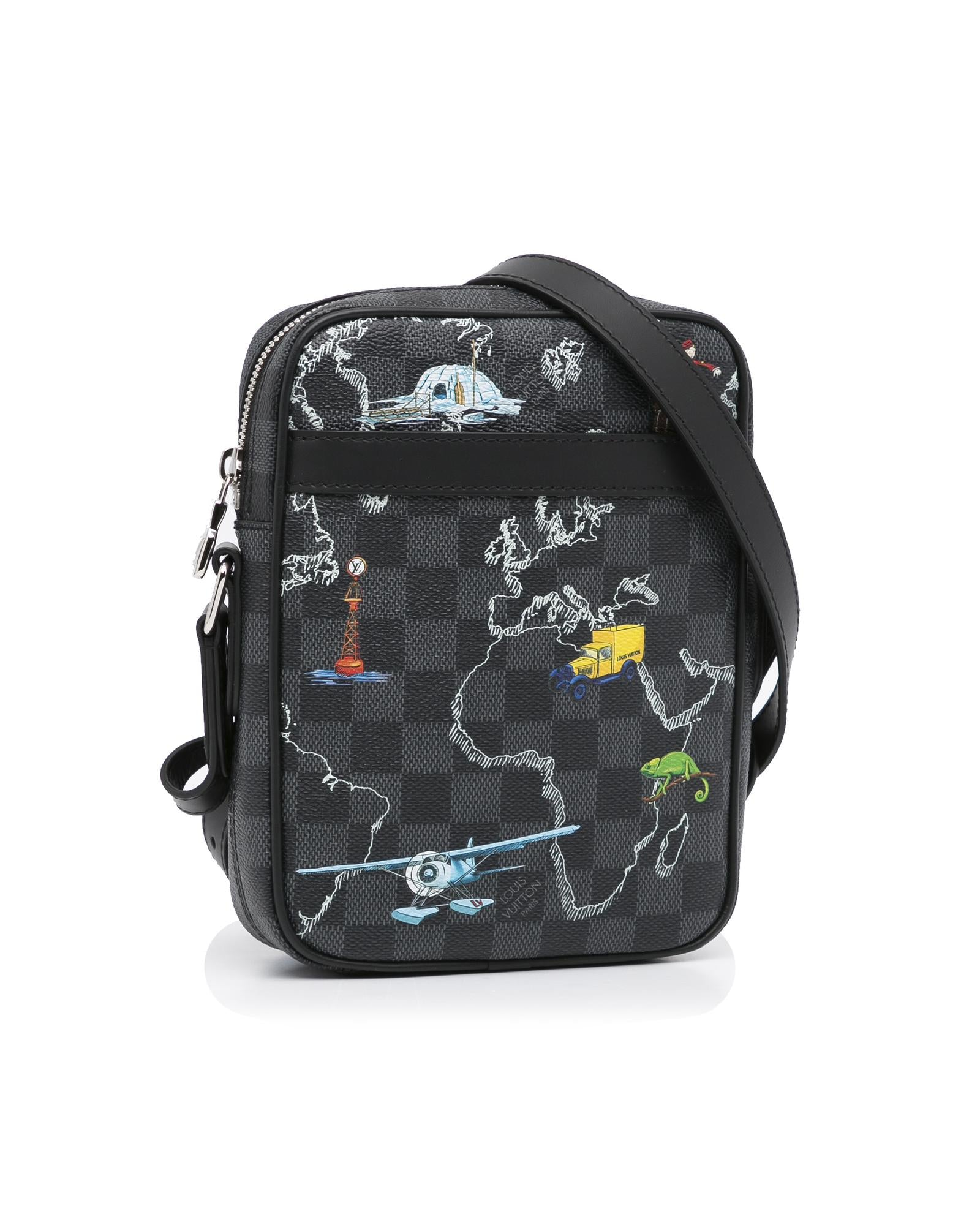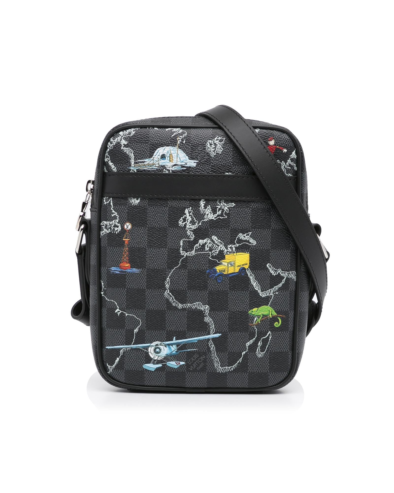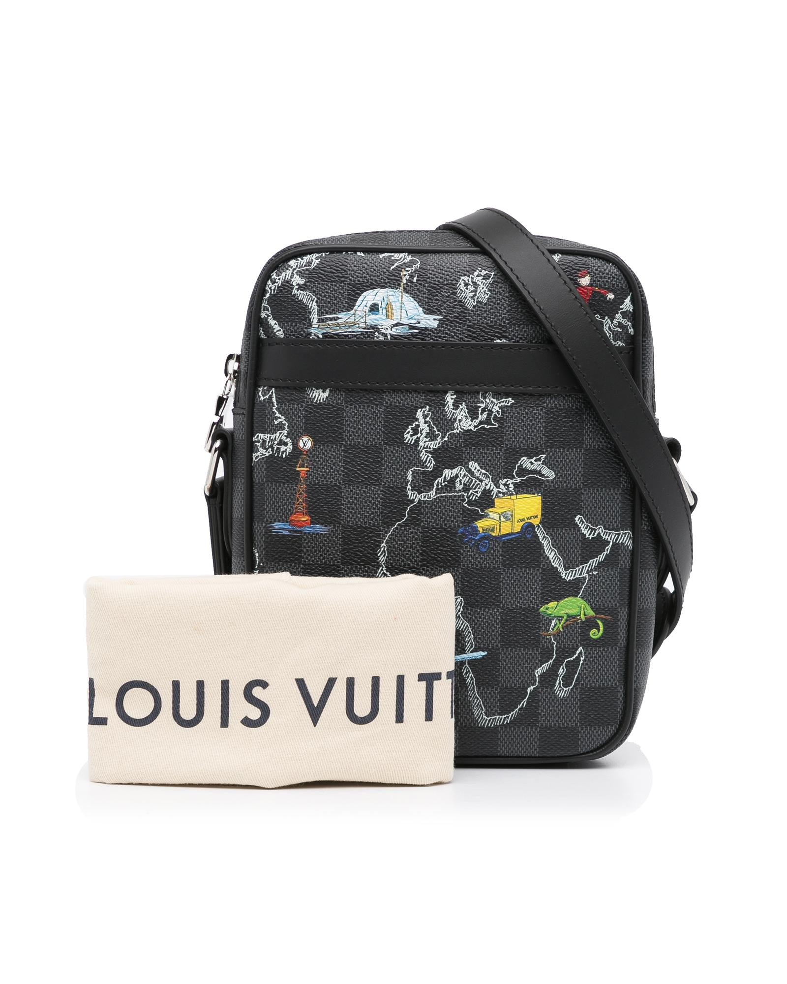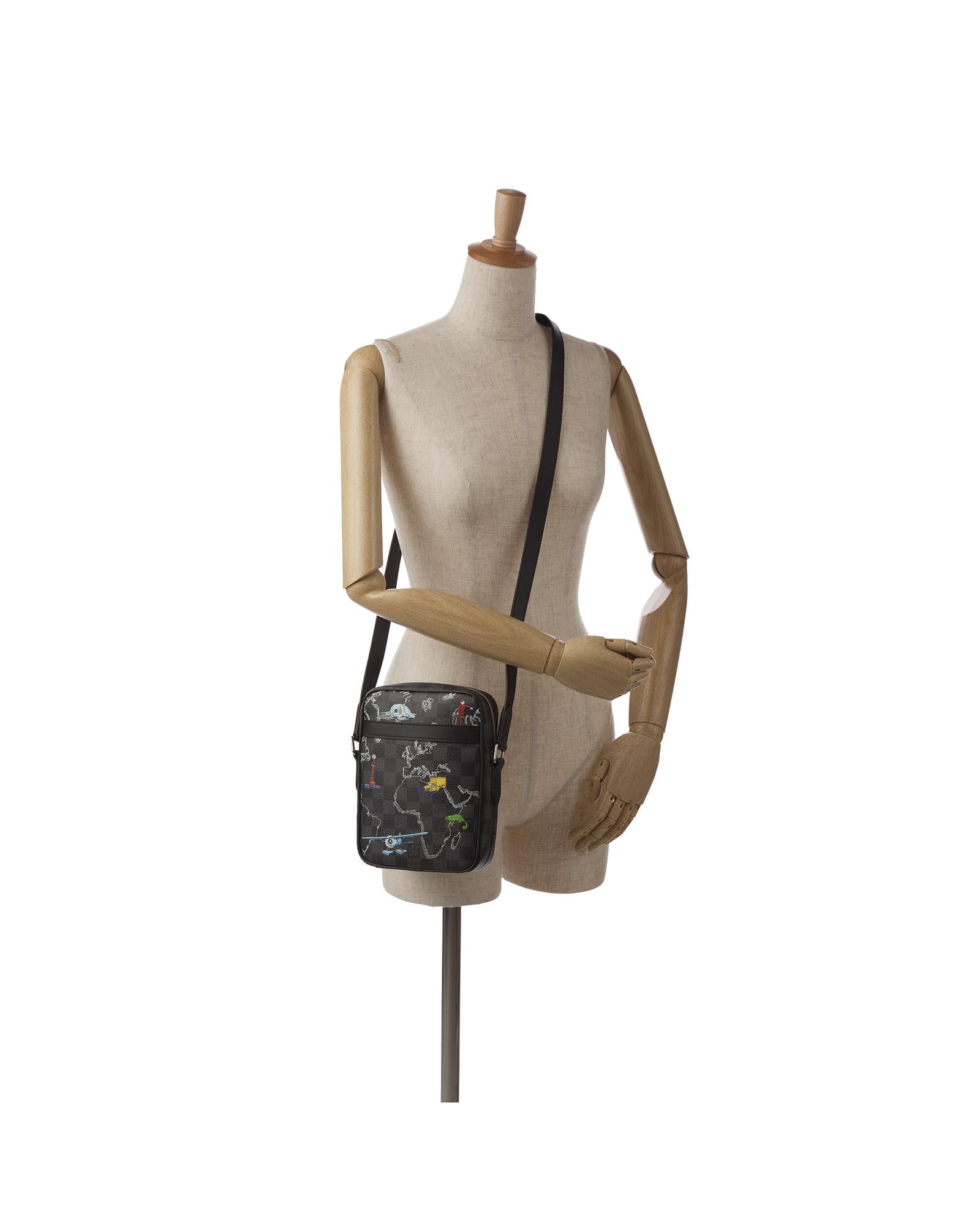 The Danube features an damier canvas body an exterior front slip pocket an adjustable shoulder strap and a top zip closure.