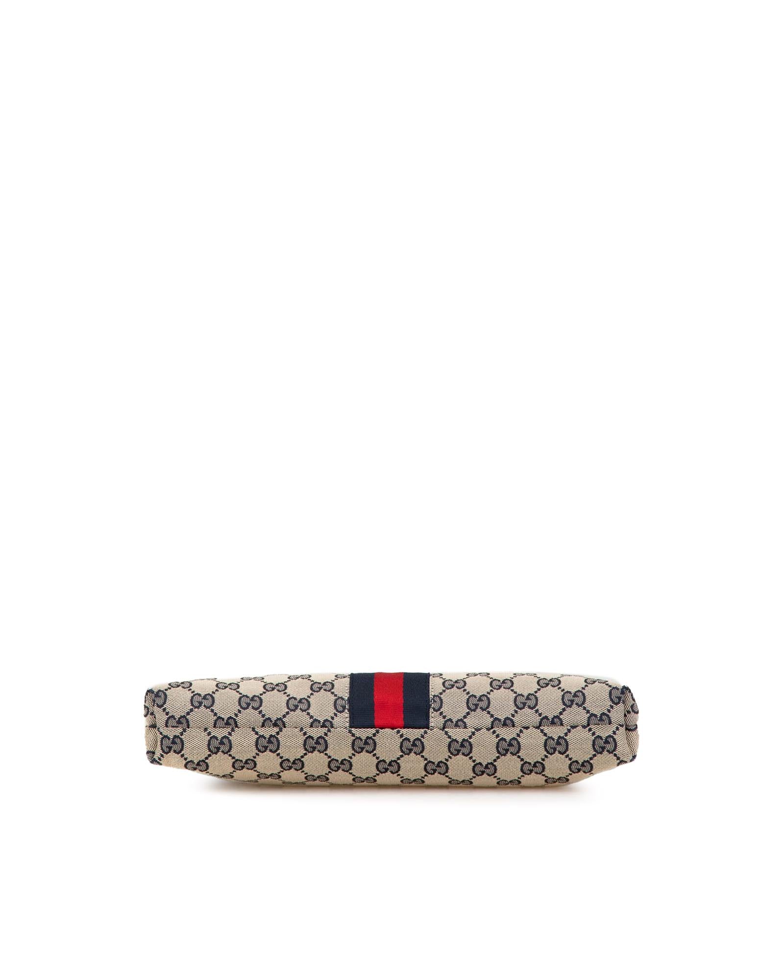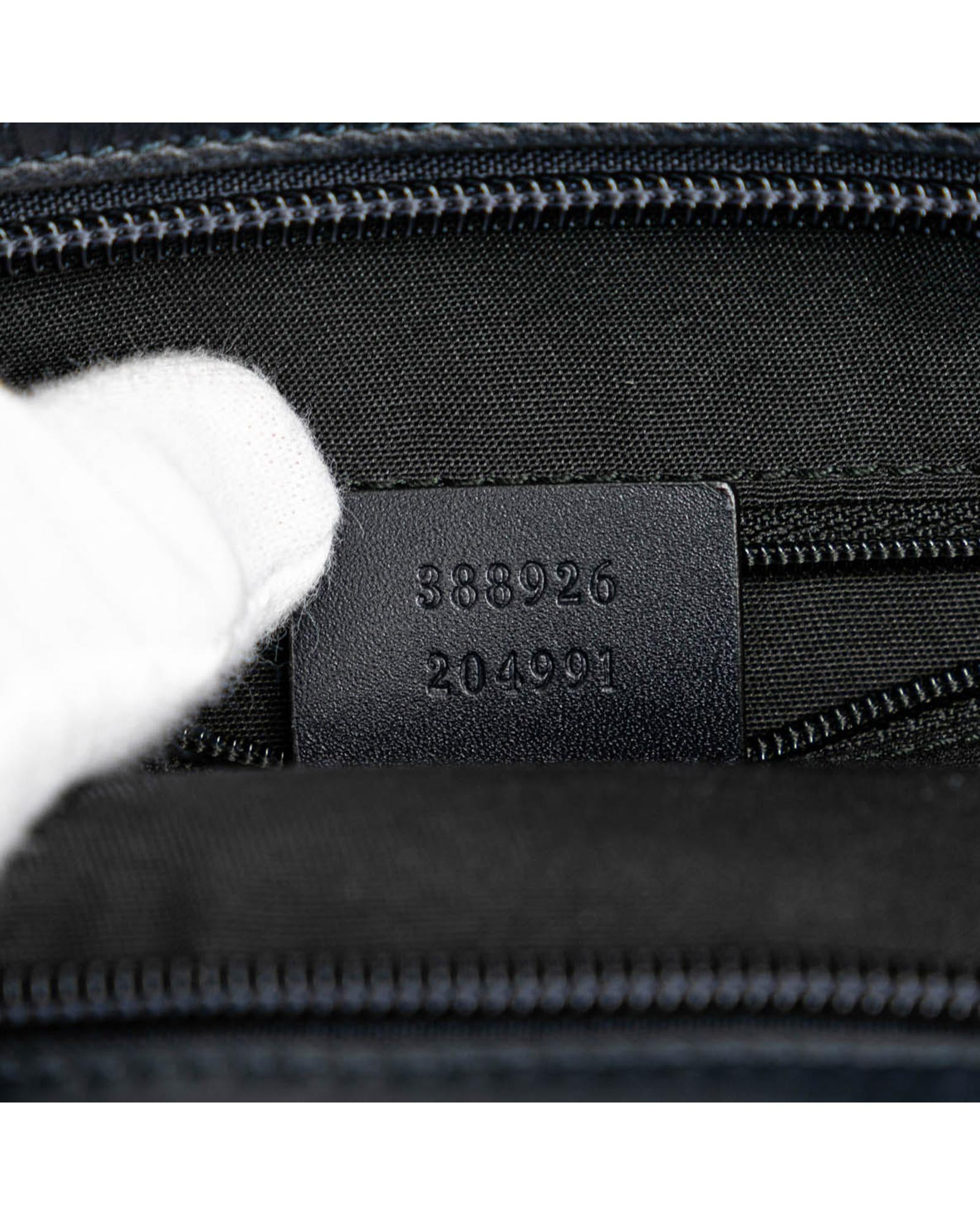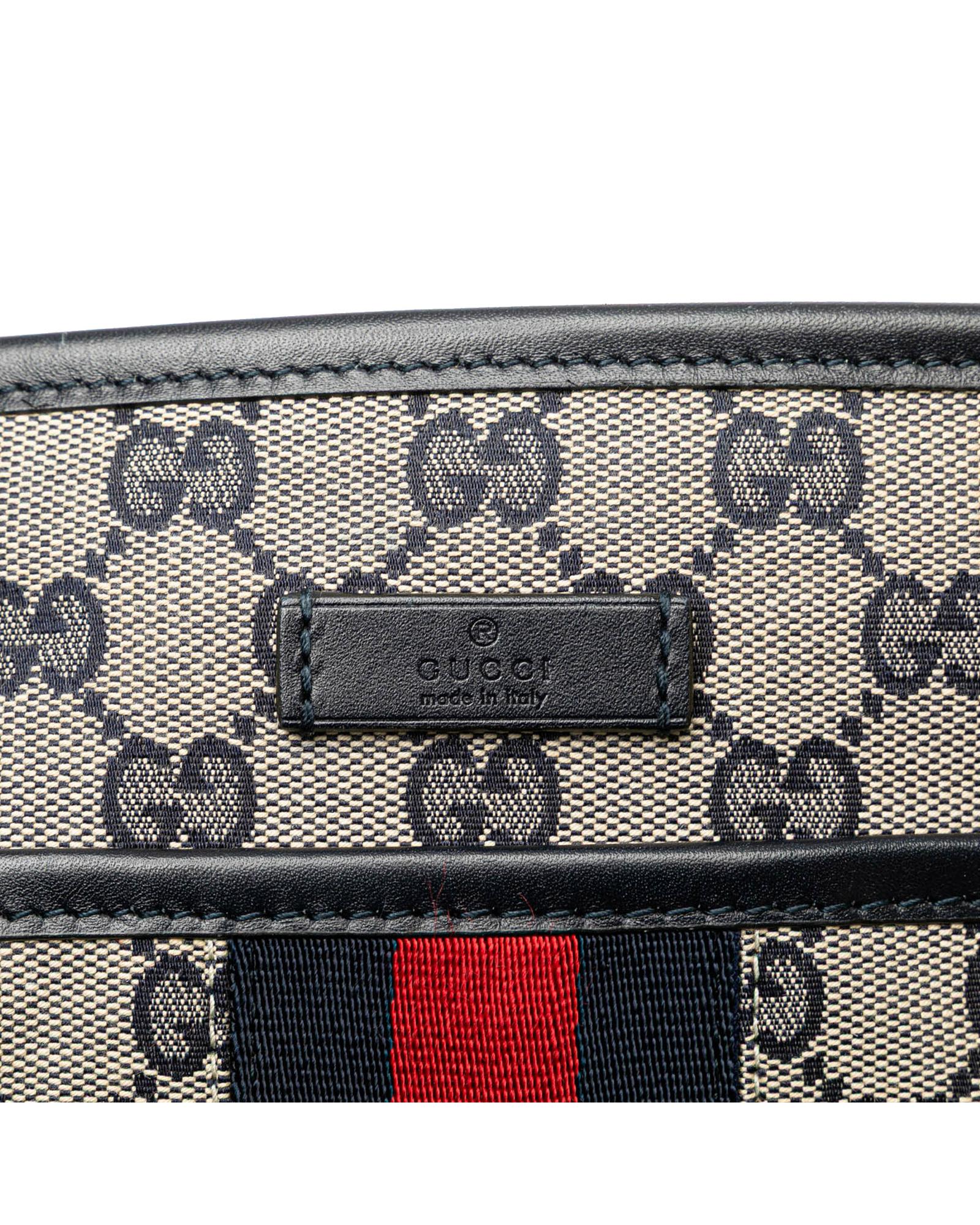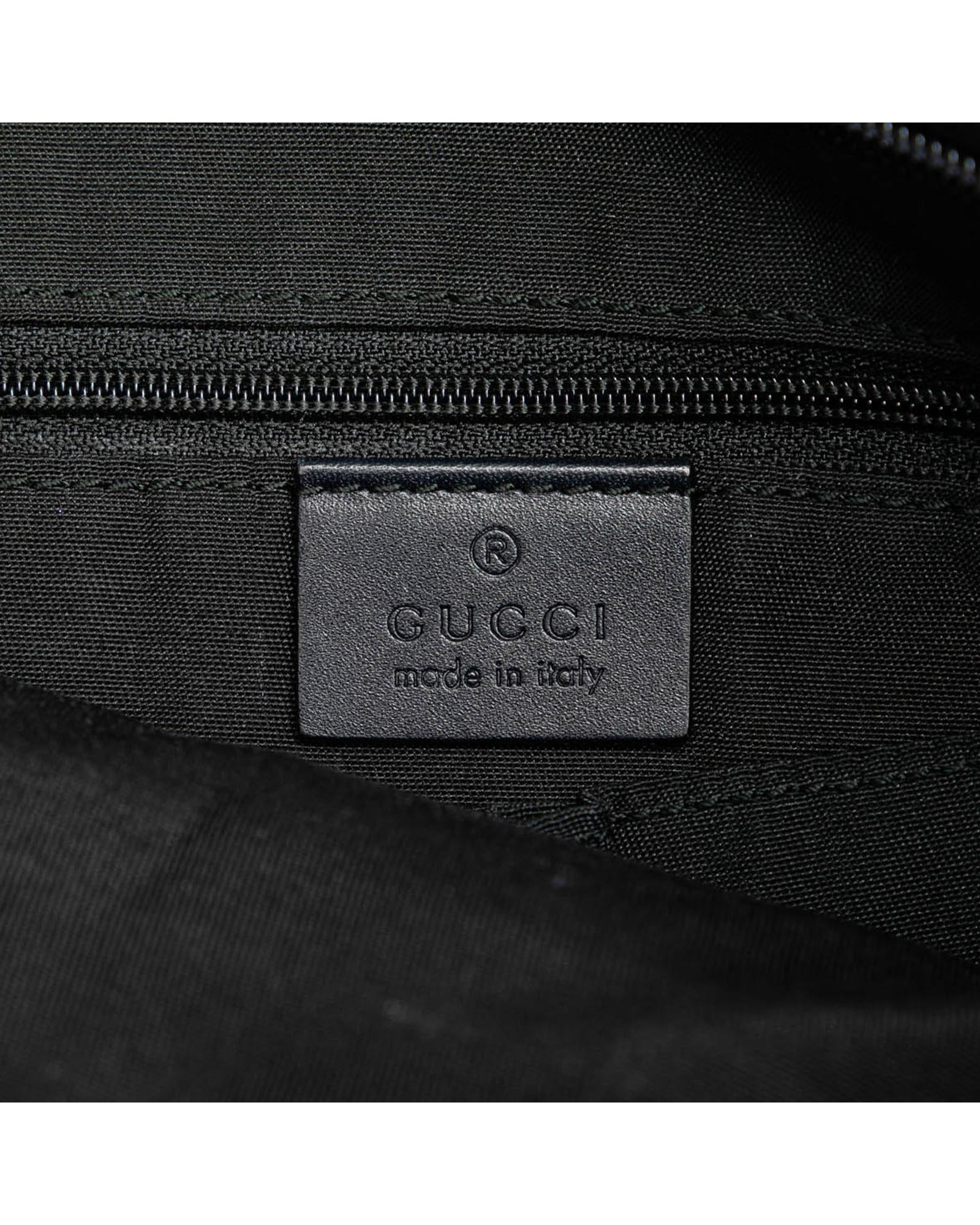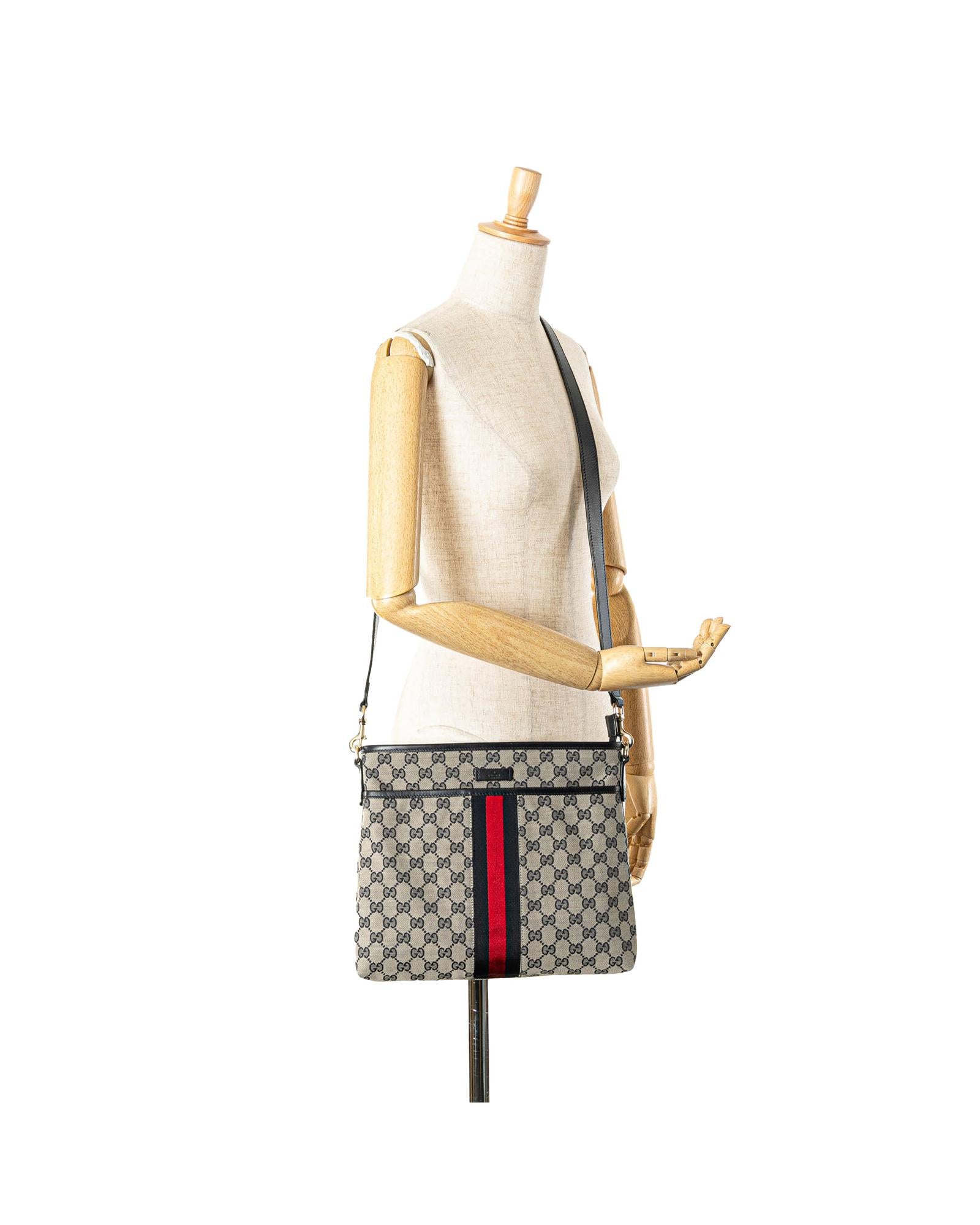 This crossbody bag features a canvas body with leather trim an adjustable flat leather strap a top zip closure an exterior front slip pocket and interior zip and slip pockets.Brand: Gucci