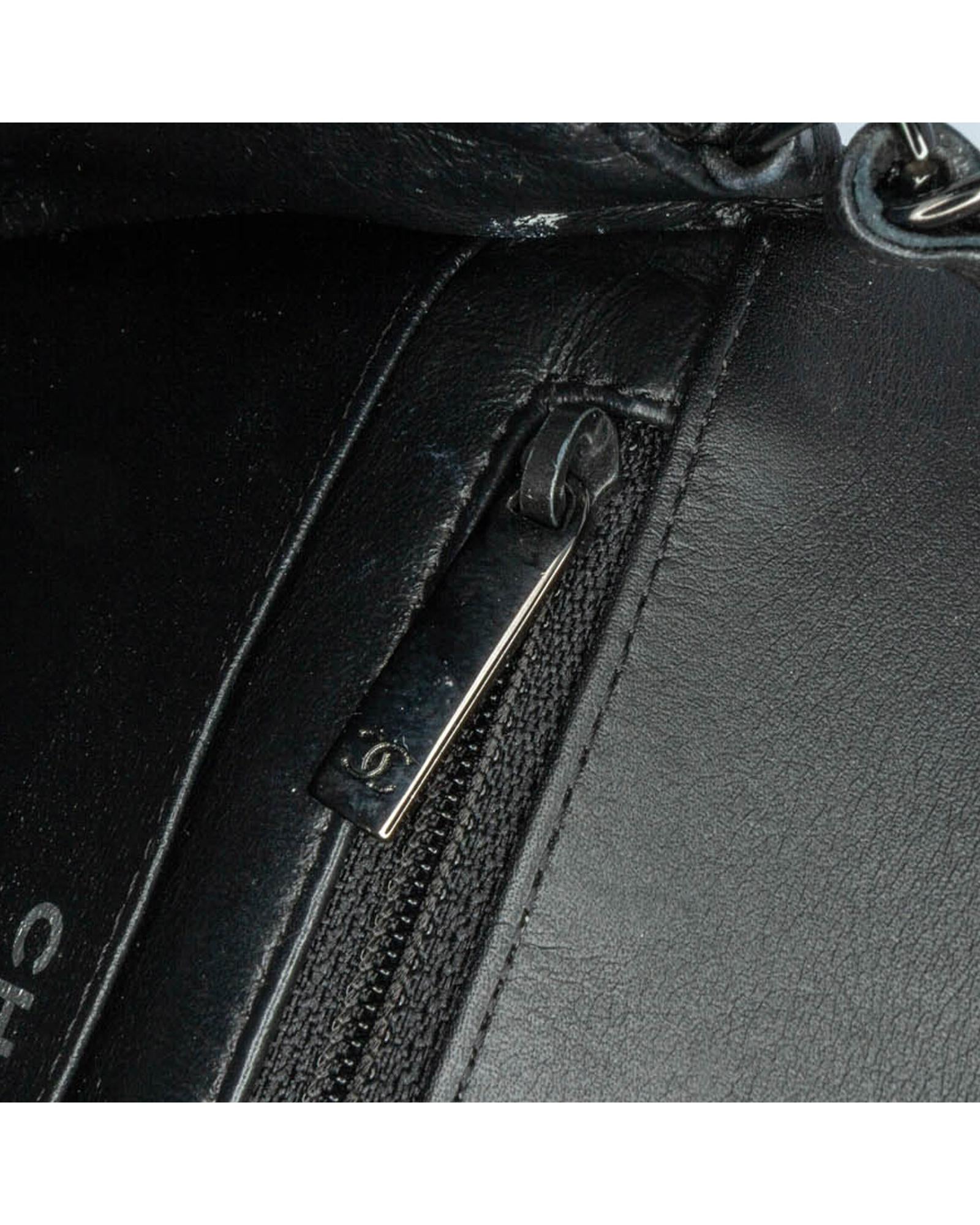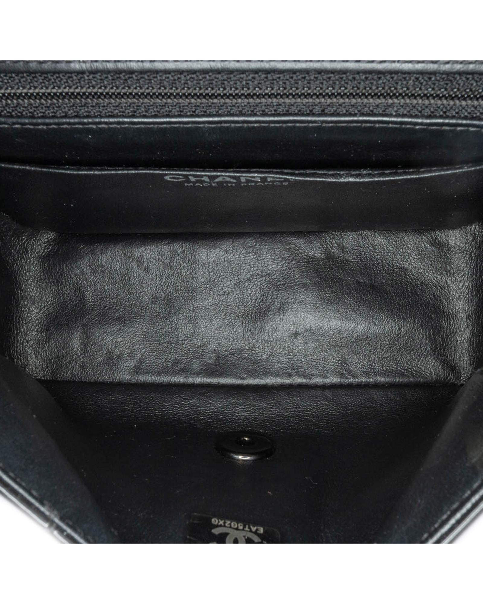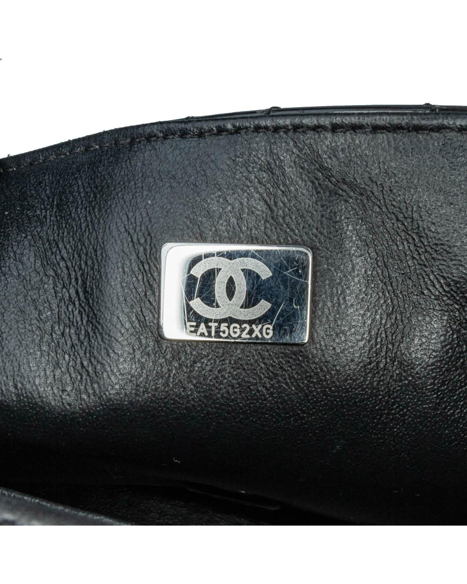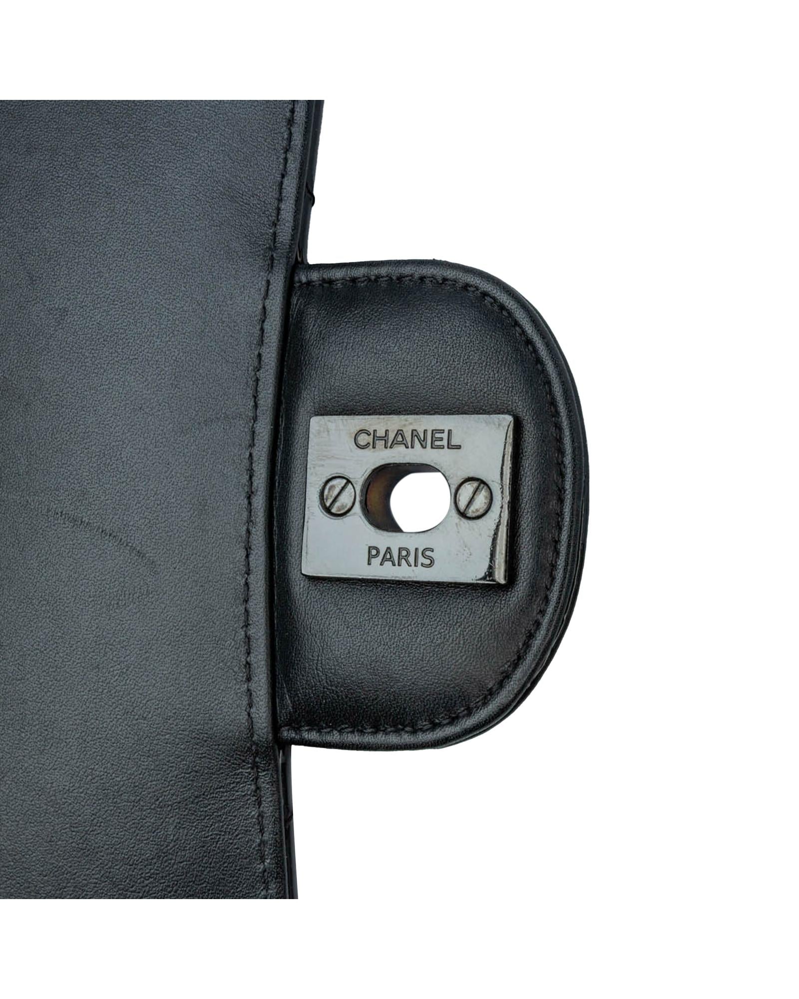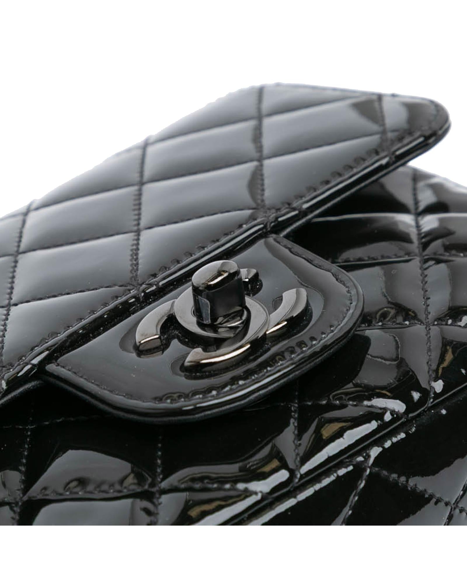 This flap bag features a quilted patent leather body with black hardware a leather woven chain link shoulder strap a front flap with interlocking Cs and a twist lock closure an exterior back slip pocket and interior zip and slip pockets.Brand: Chanel