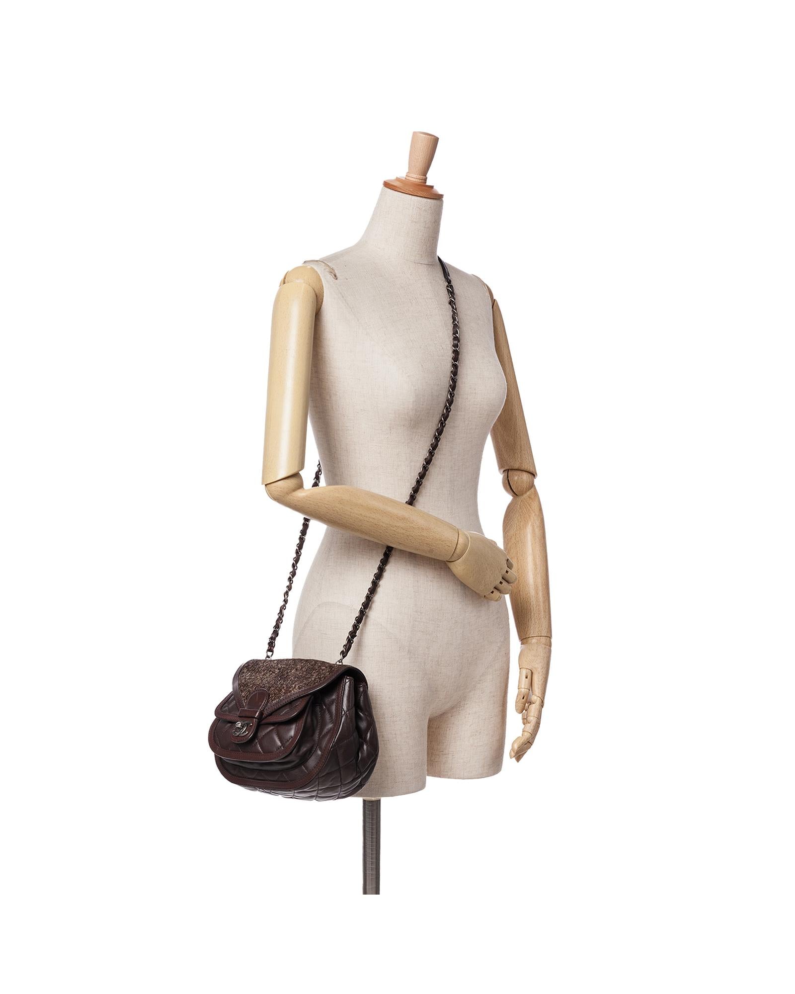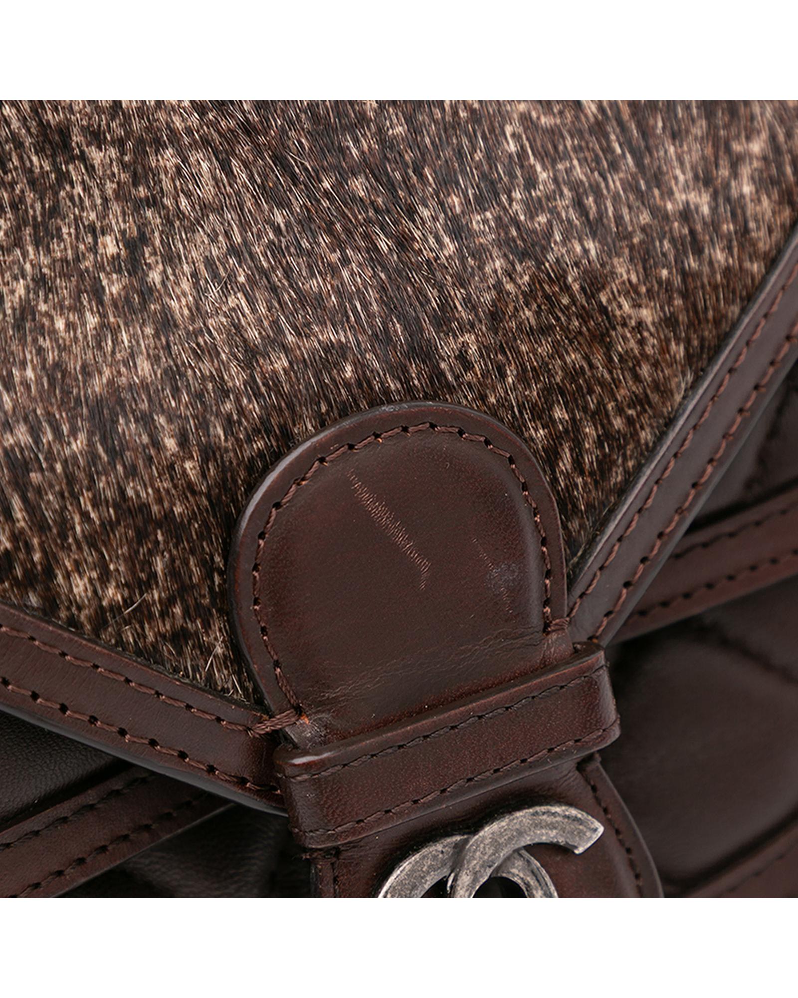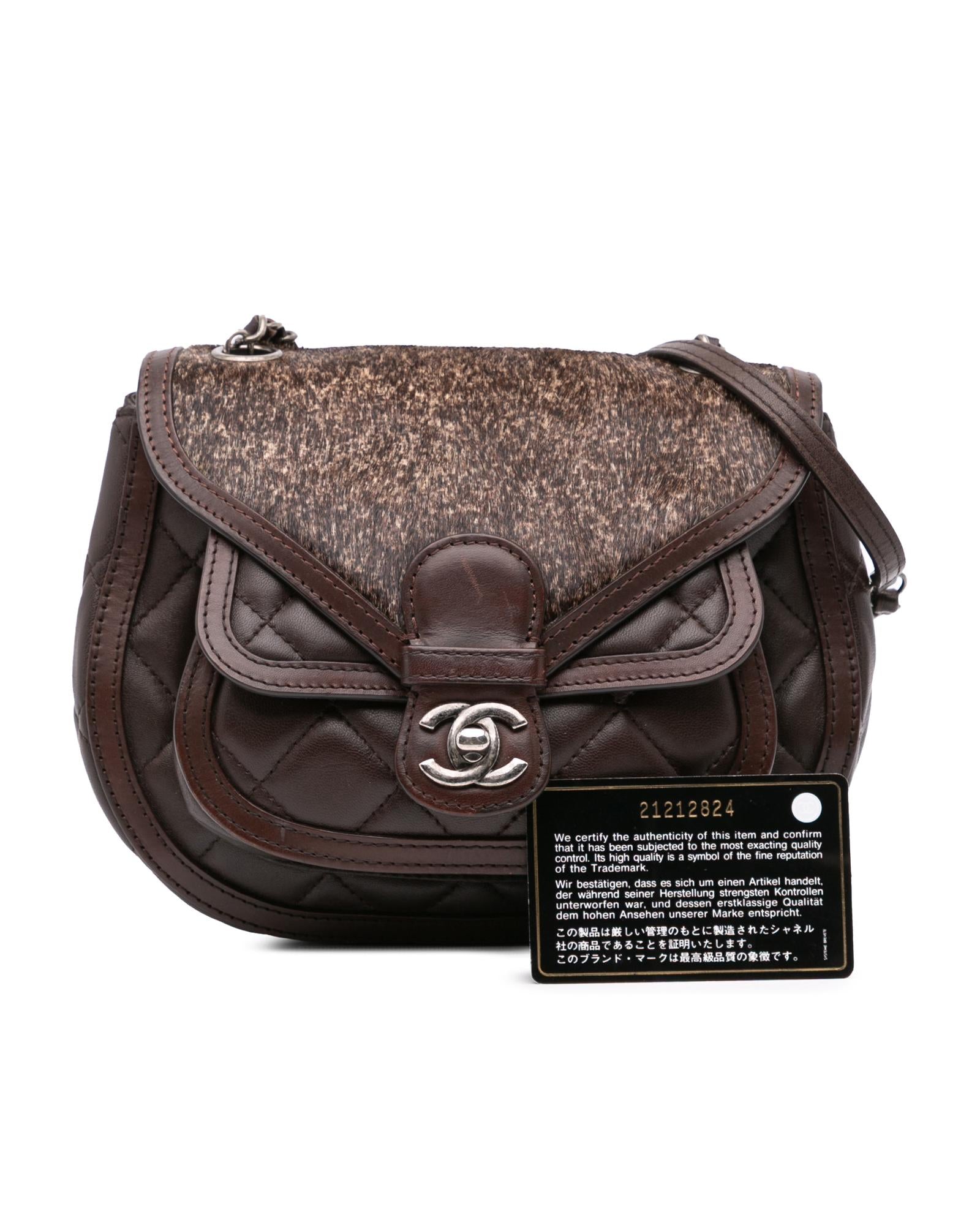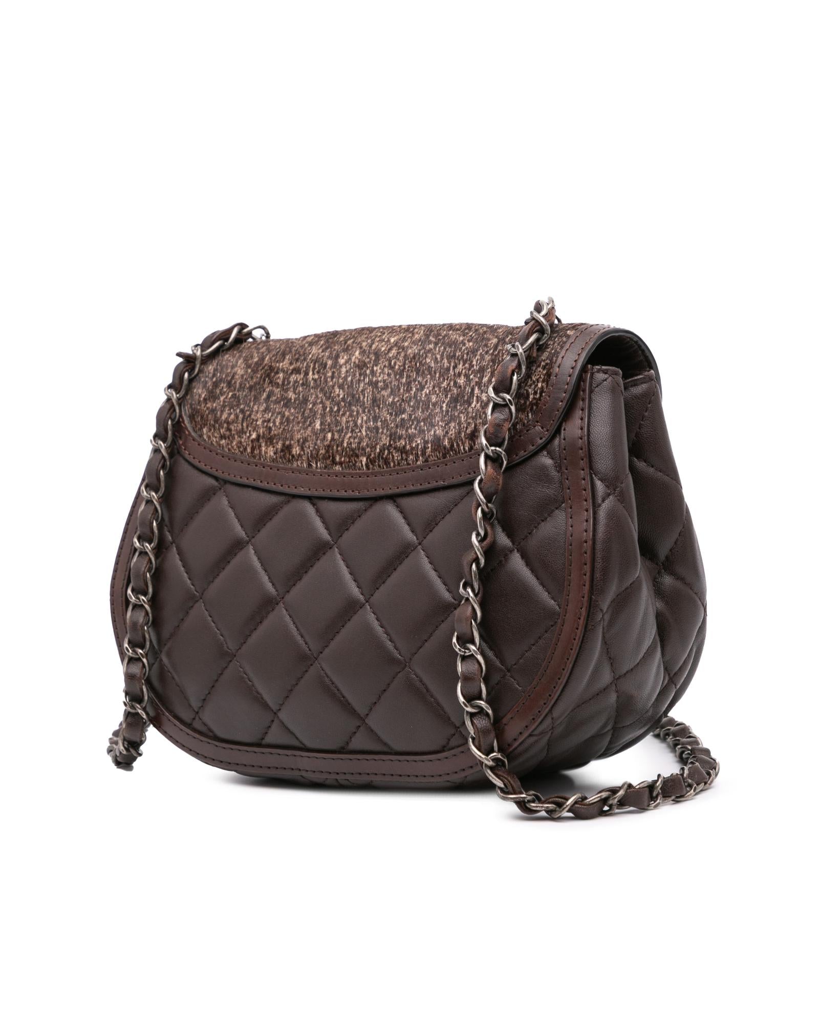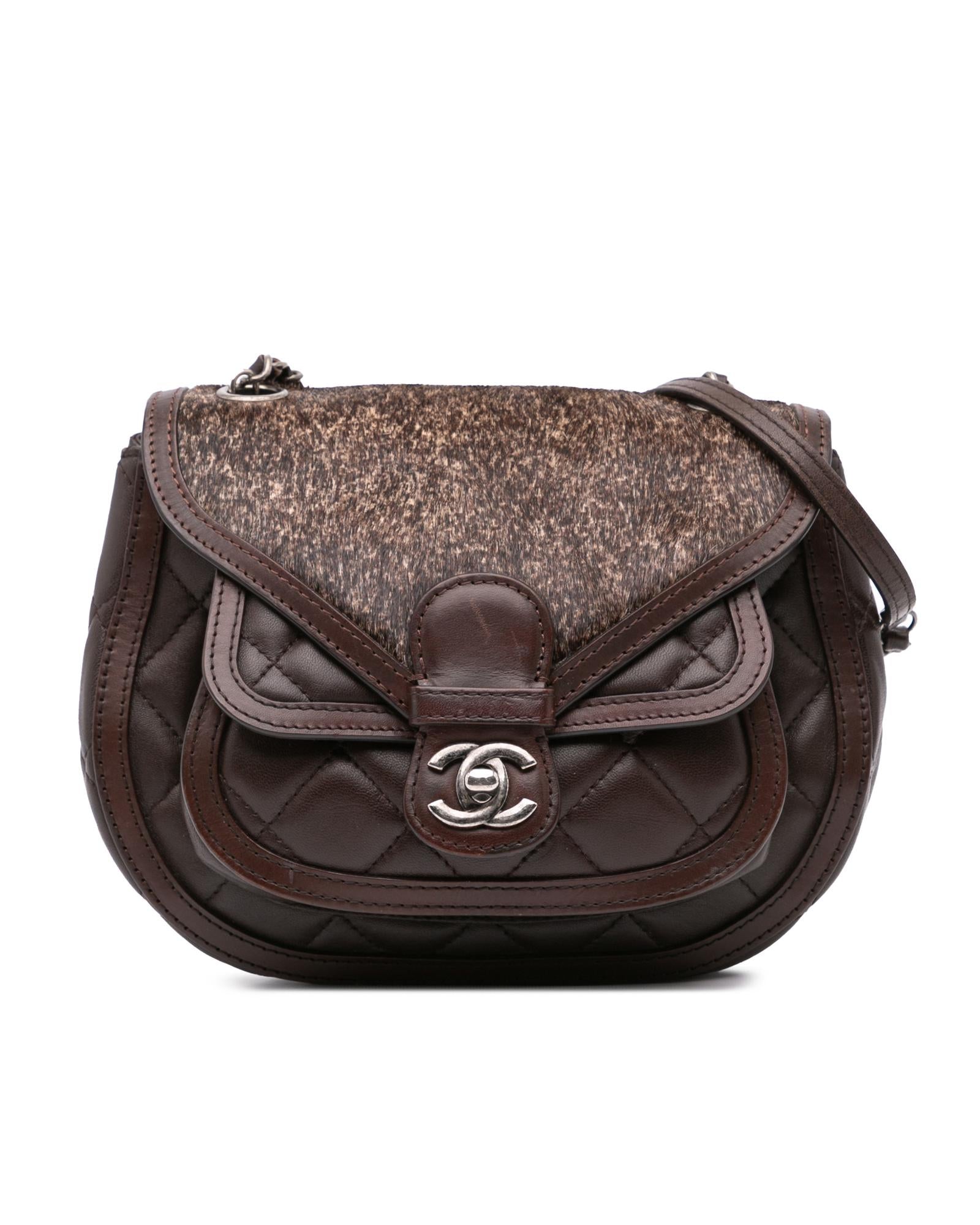 This crossbody bag features a quilted lambskin leather and pony hair body a leather woven chain link strap with leather guard a pony hair flap with turn-lock closure and interior zip and slip pockets.Brand: Chanel