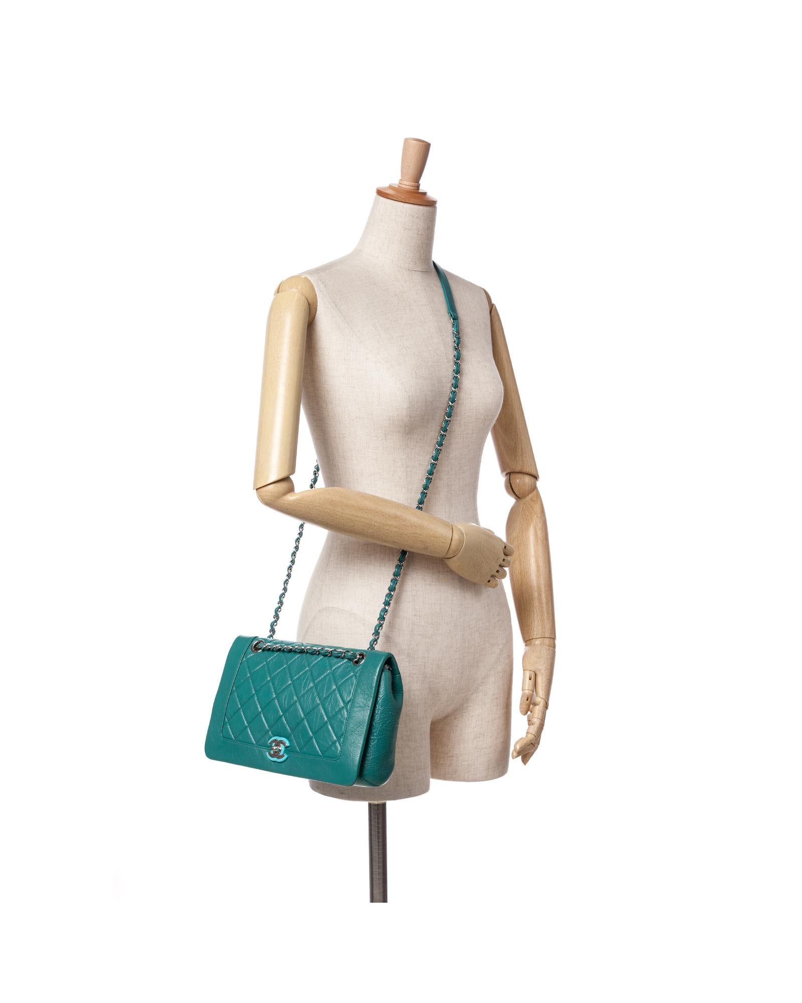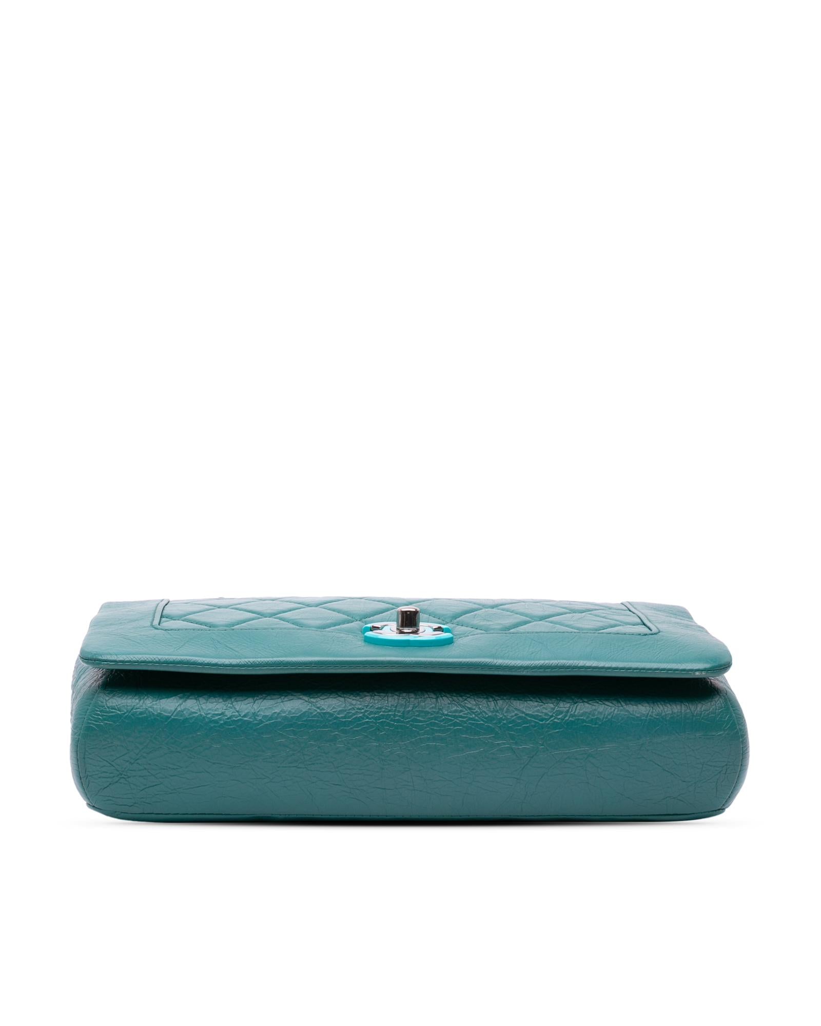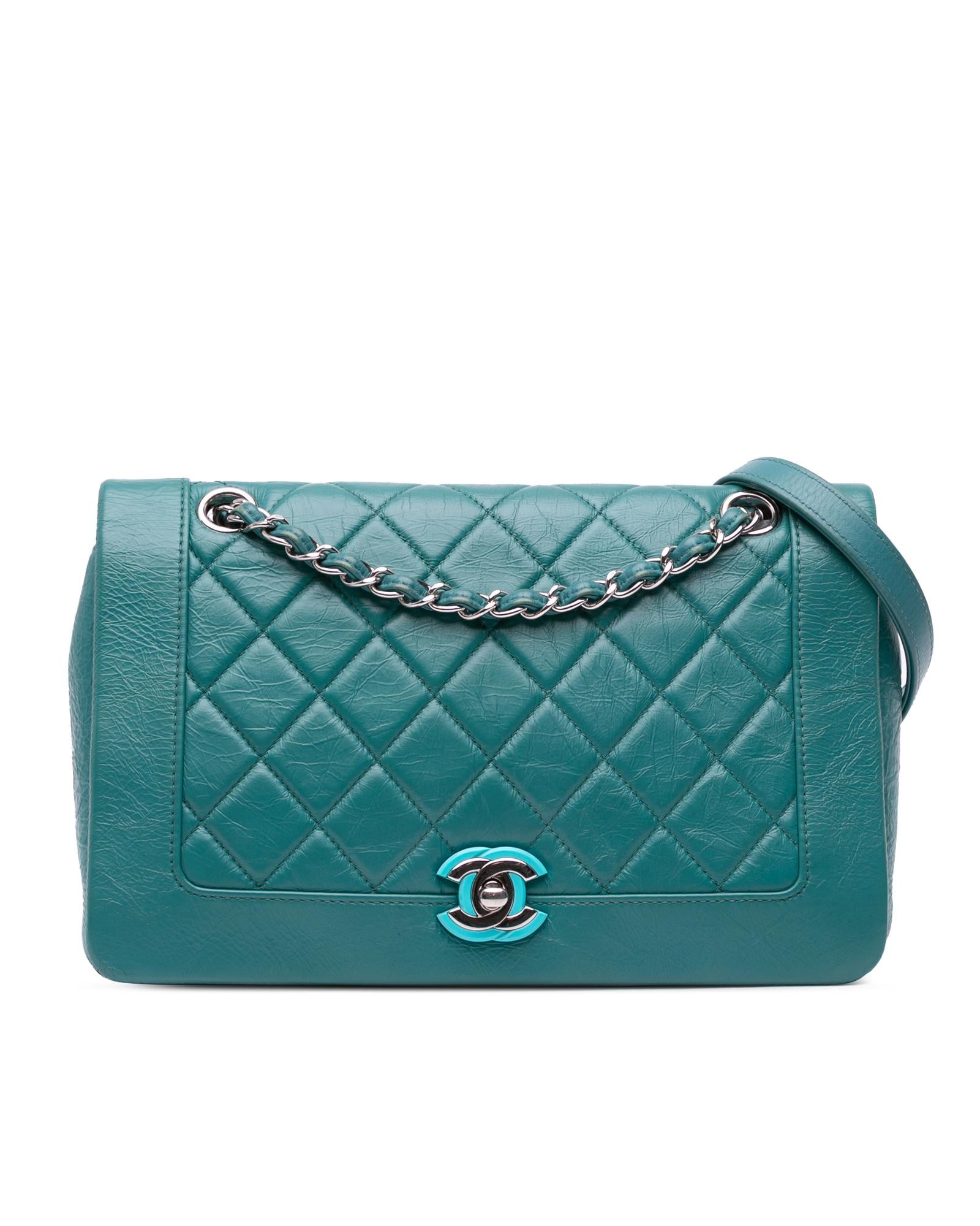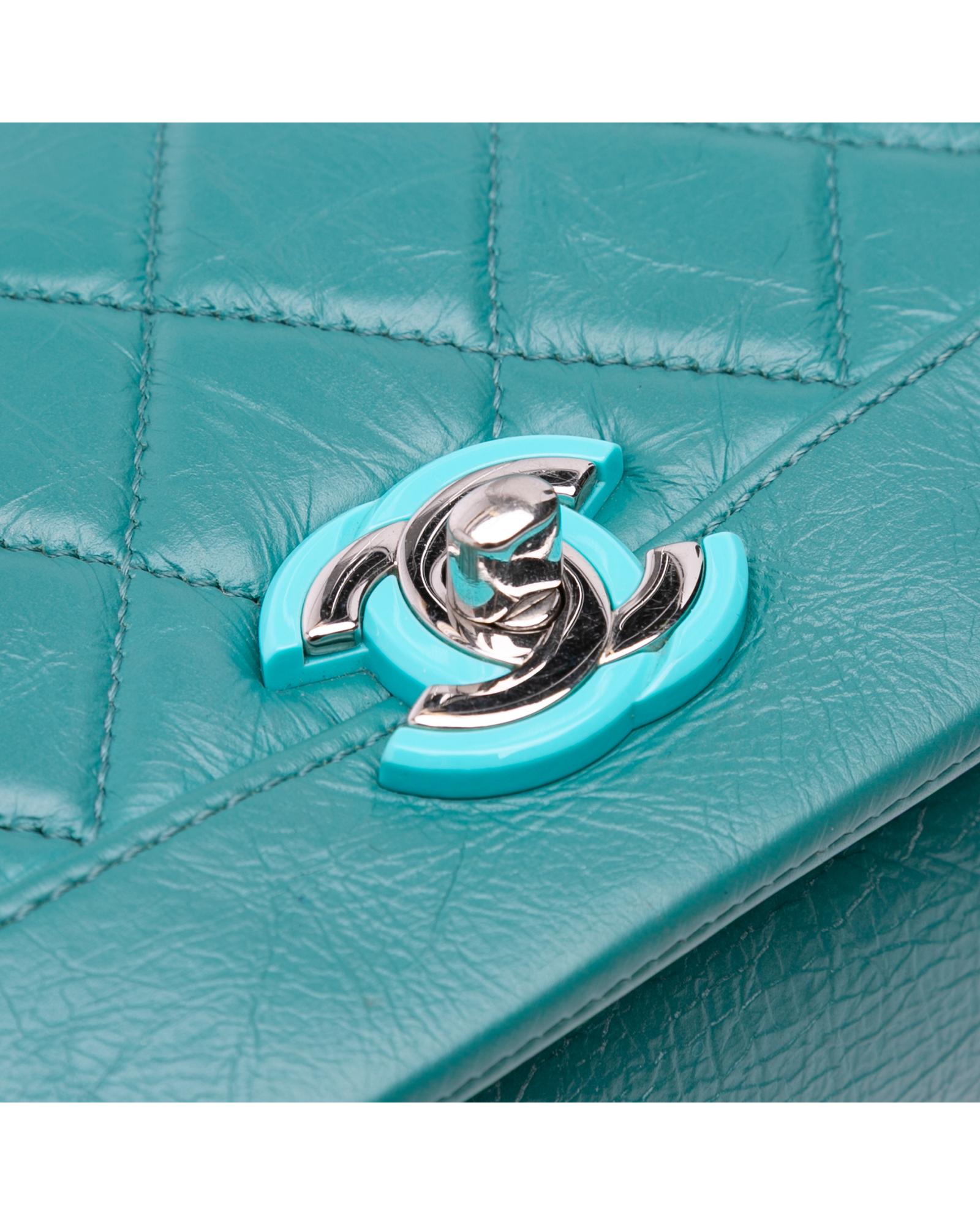 This crossbody features a quilted crumpled calf leather body a leather-woven chain link strap with leather shoulder guard a top flap with CC turn-lock closure an exterior back slip pocket and an interior zip pocket.Brand: Chanel