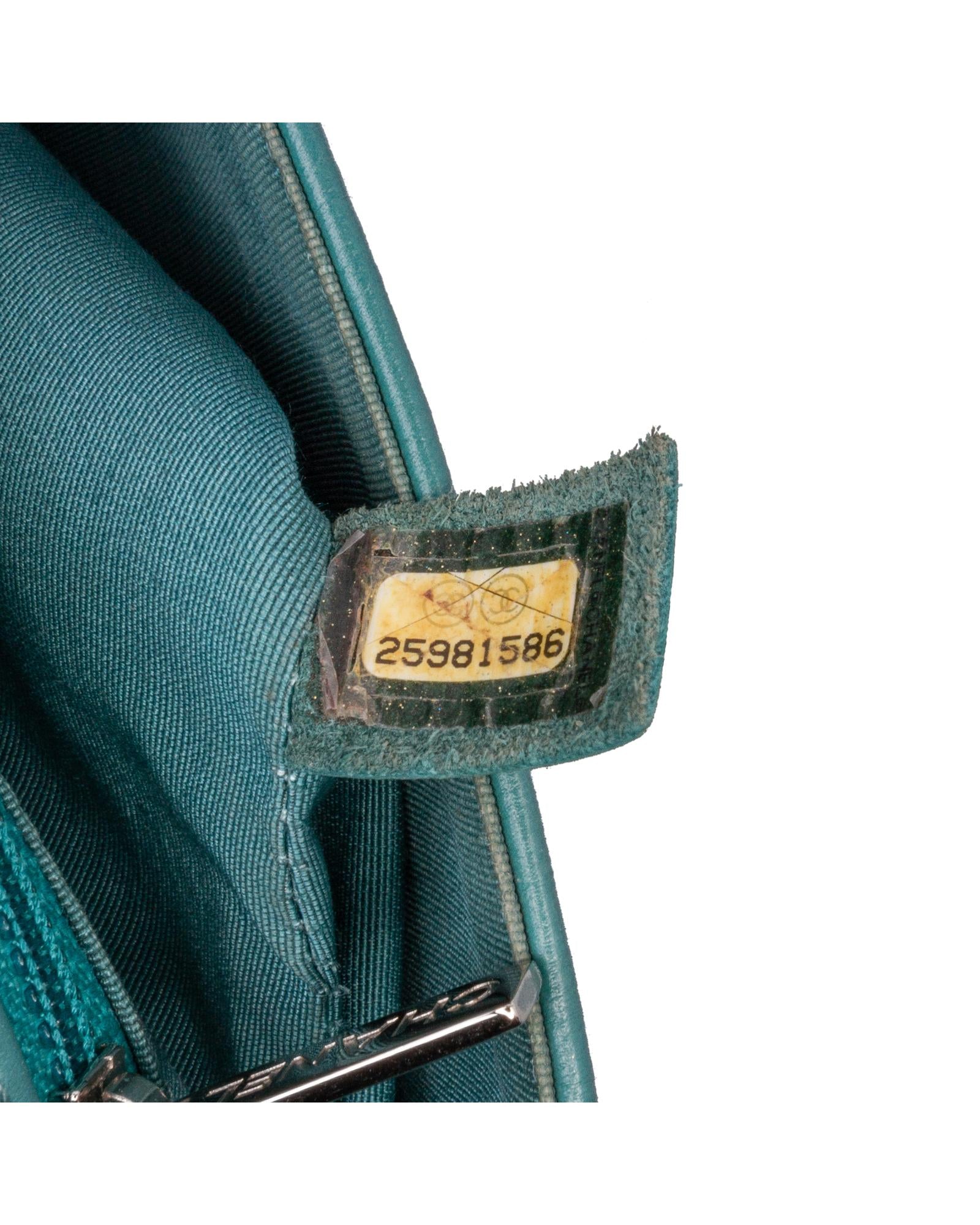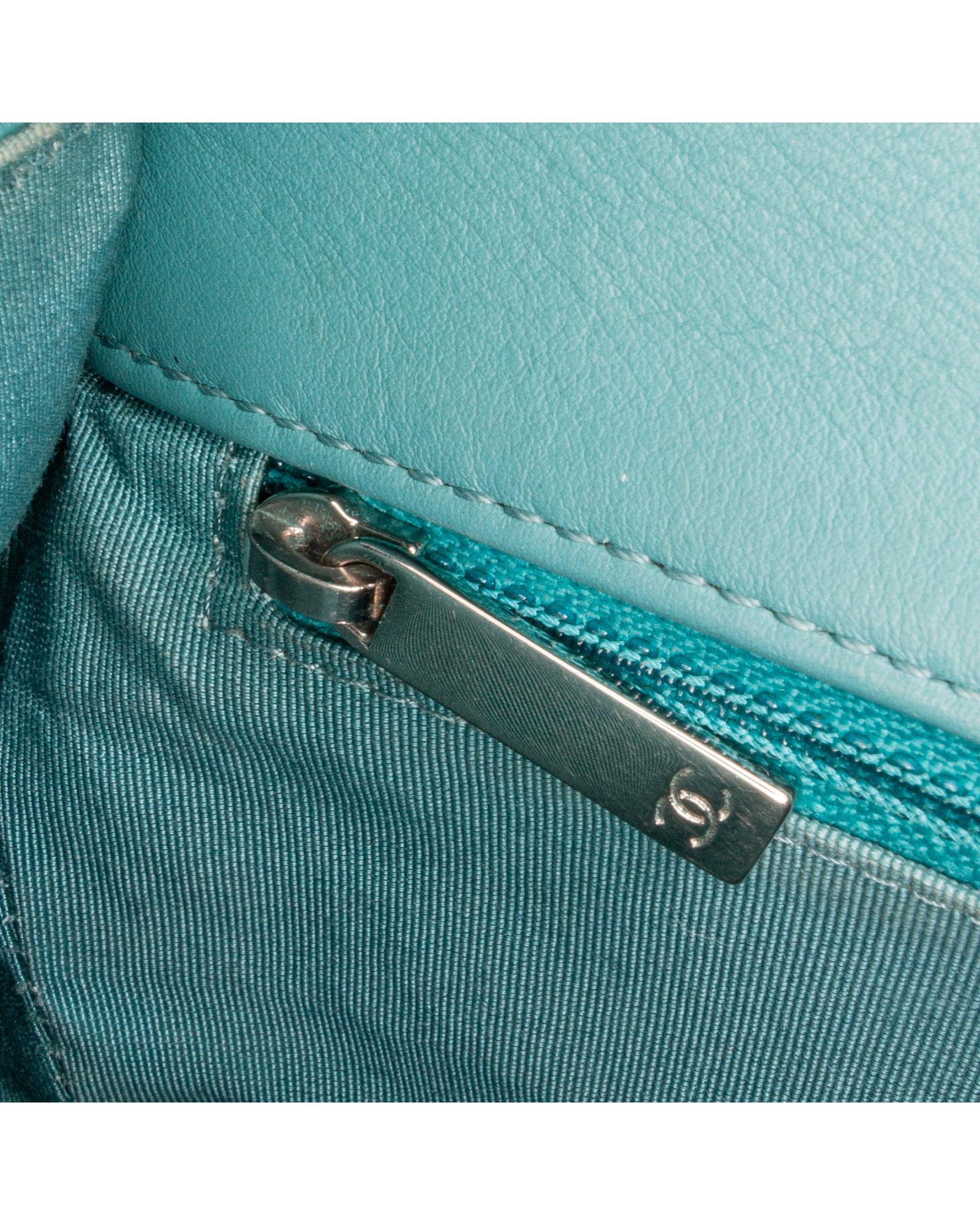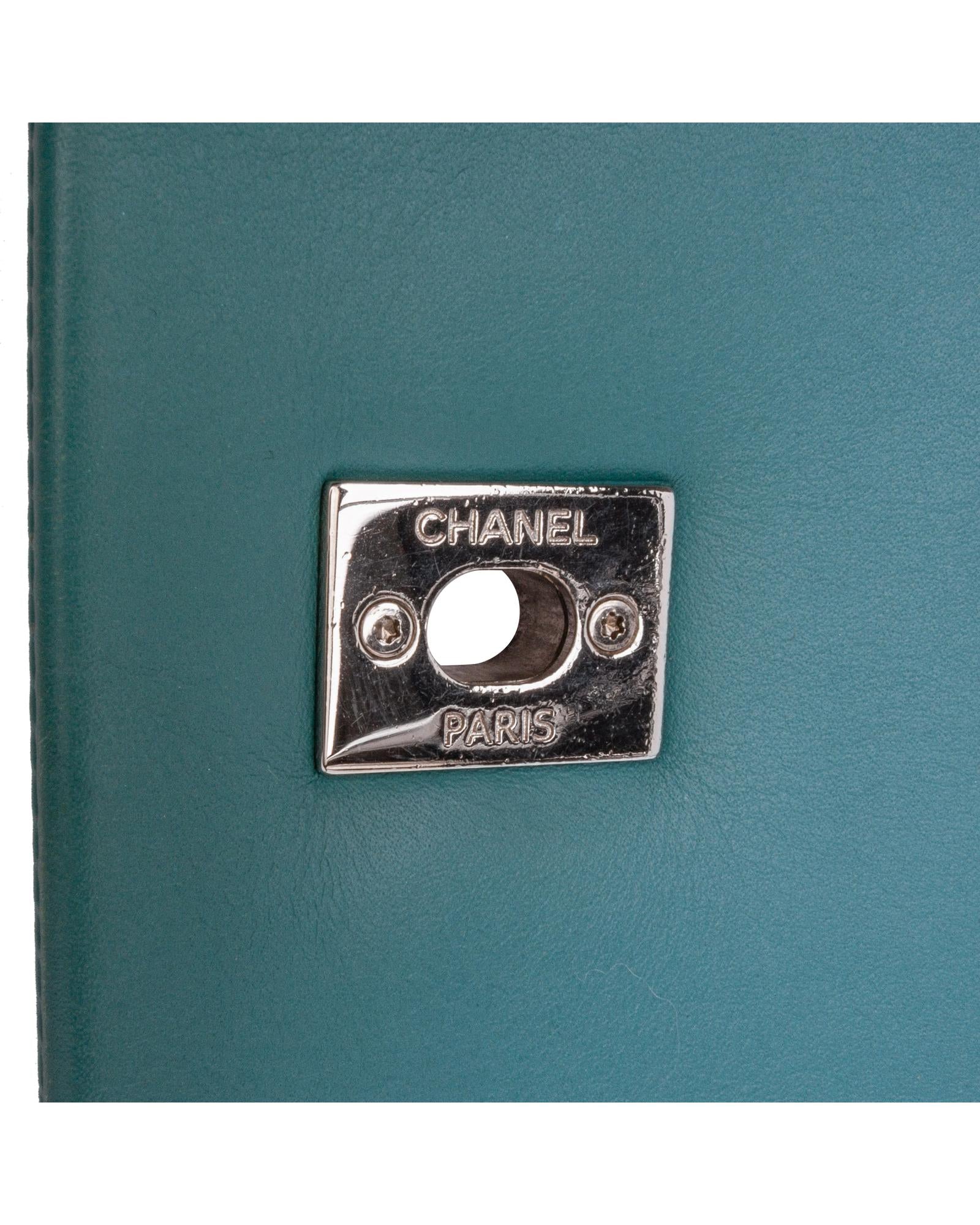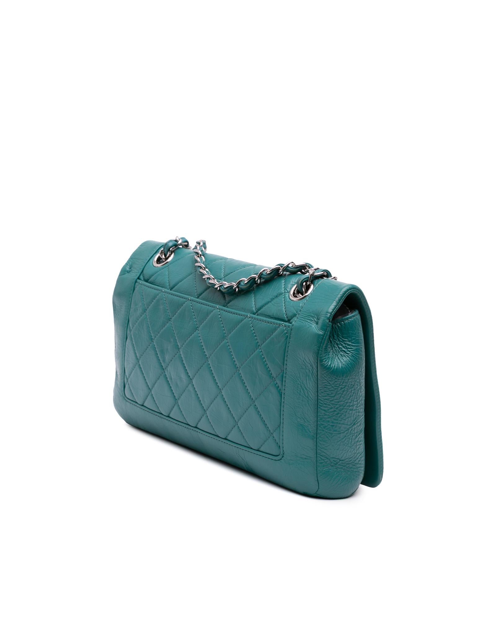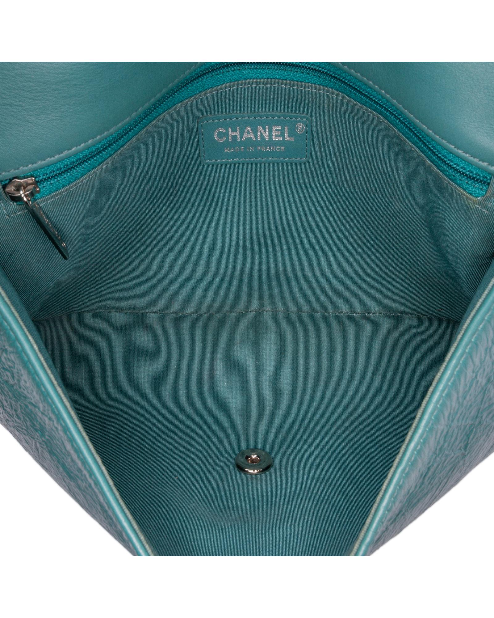 This crossbody features a quilted crumpled calf leather body a leather-woven chain link strap with leather shoulder guard a top flap with CC turn-lock closure an exterior back slip pocket and an interior zip pocket.Brand: Chanel