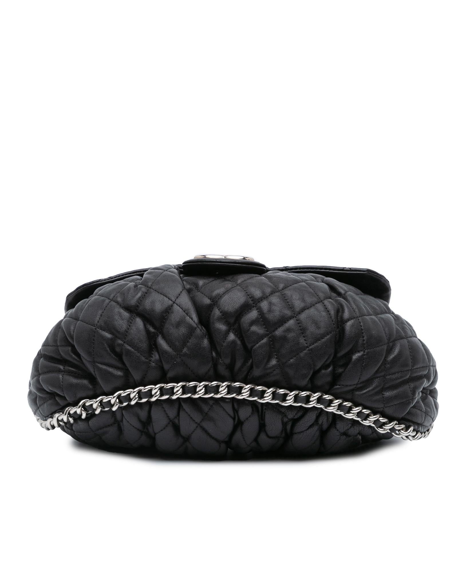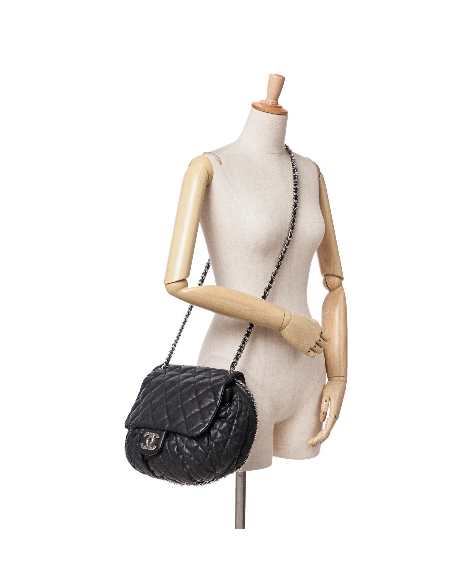 The Chain Around crossbody bag features a quilted lambskin leather body a leather-woven chain link strap a front flap with magnetic snap closure and interior zip and slip pockets.