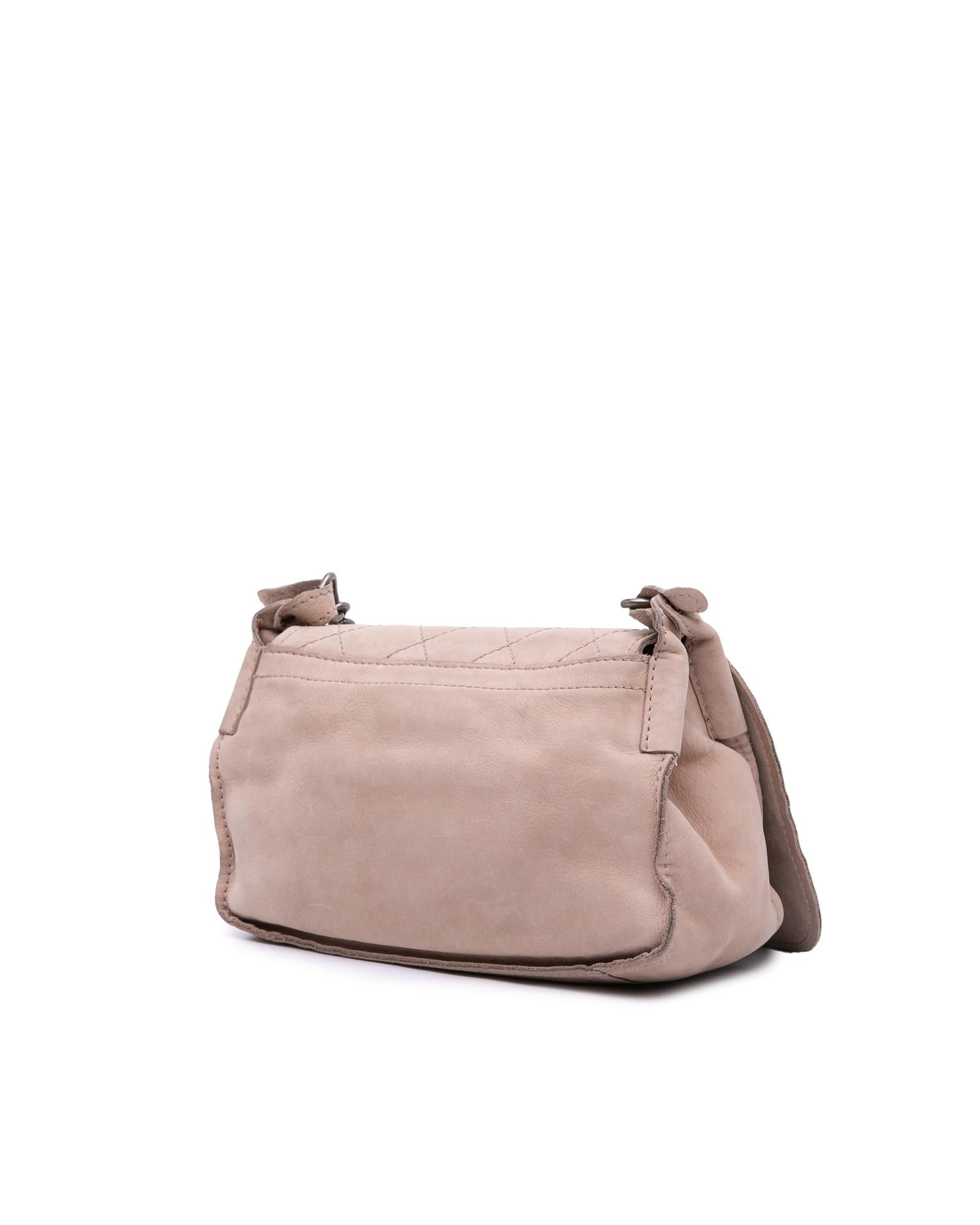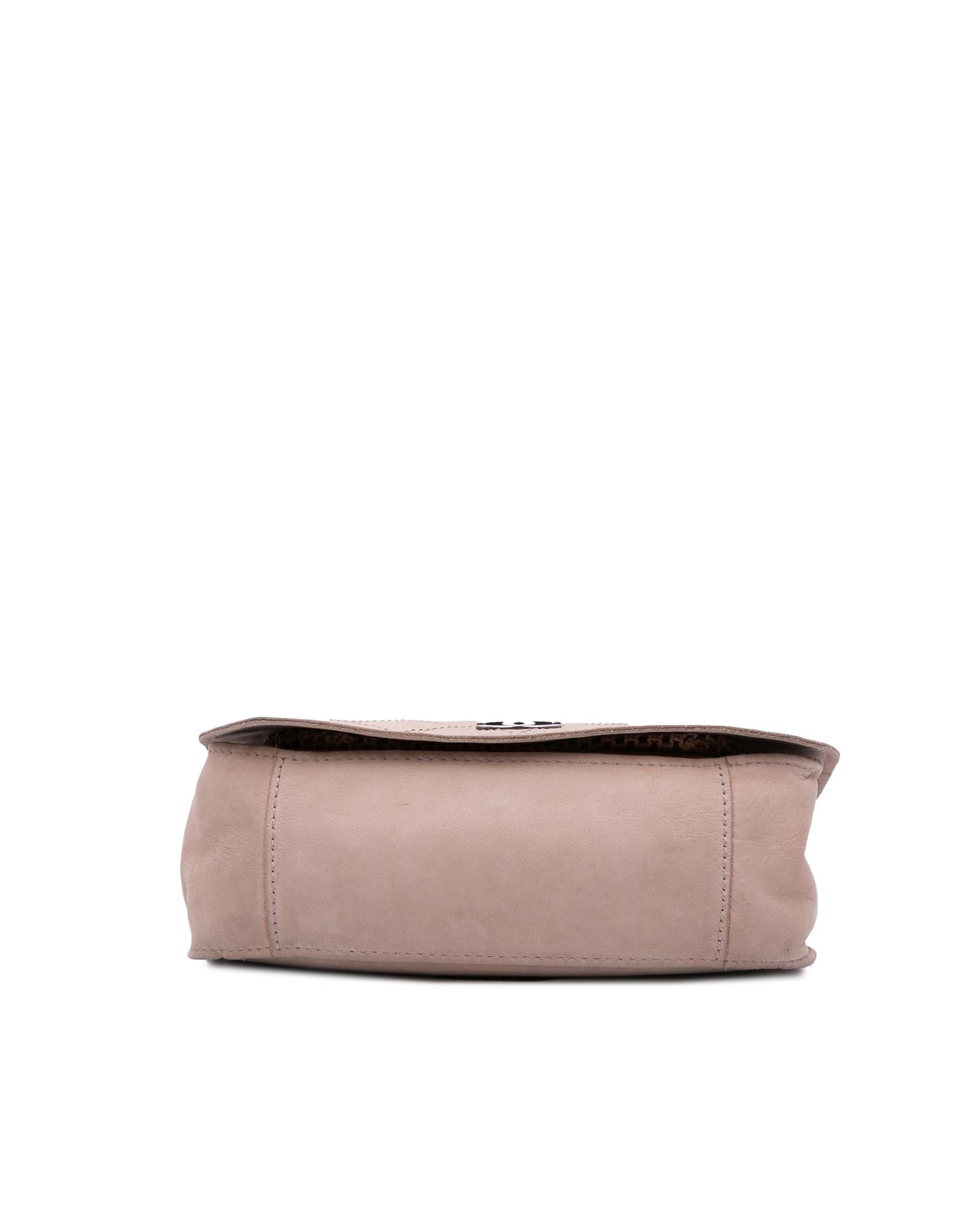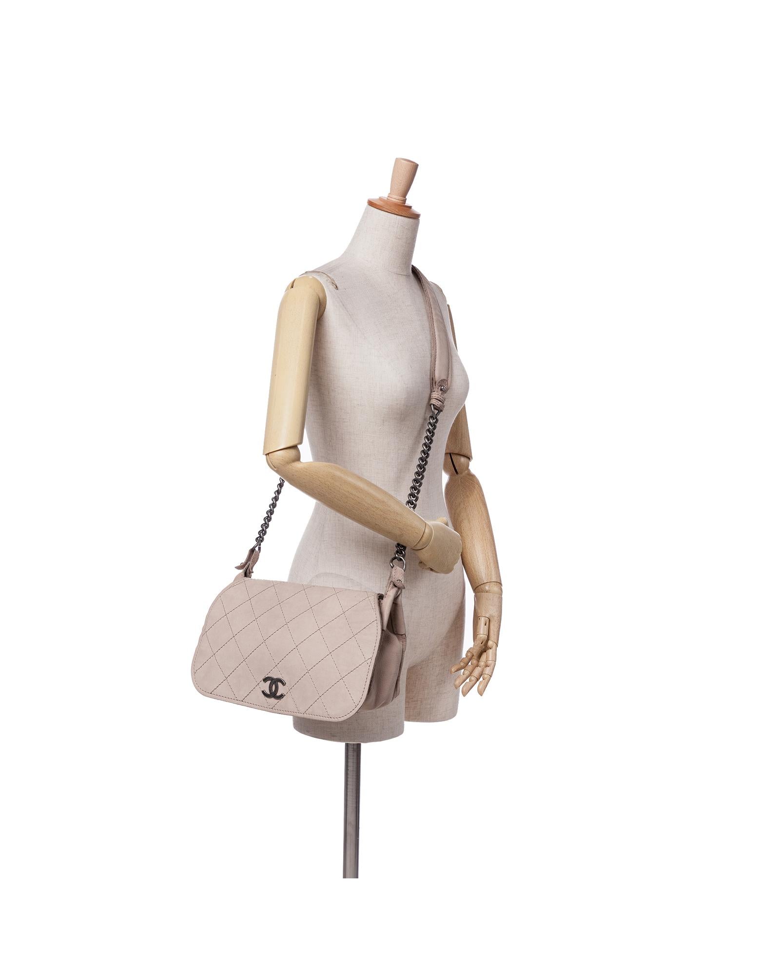 The crossbody bag features a calf leather body a chain link strap with leather shoulder guard a flap with snap button closure and an interior zip pocket.