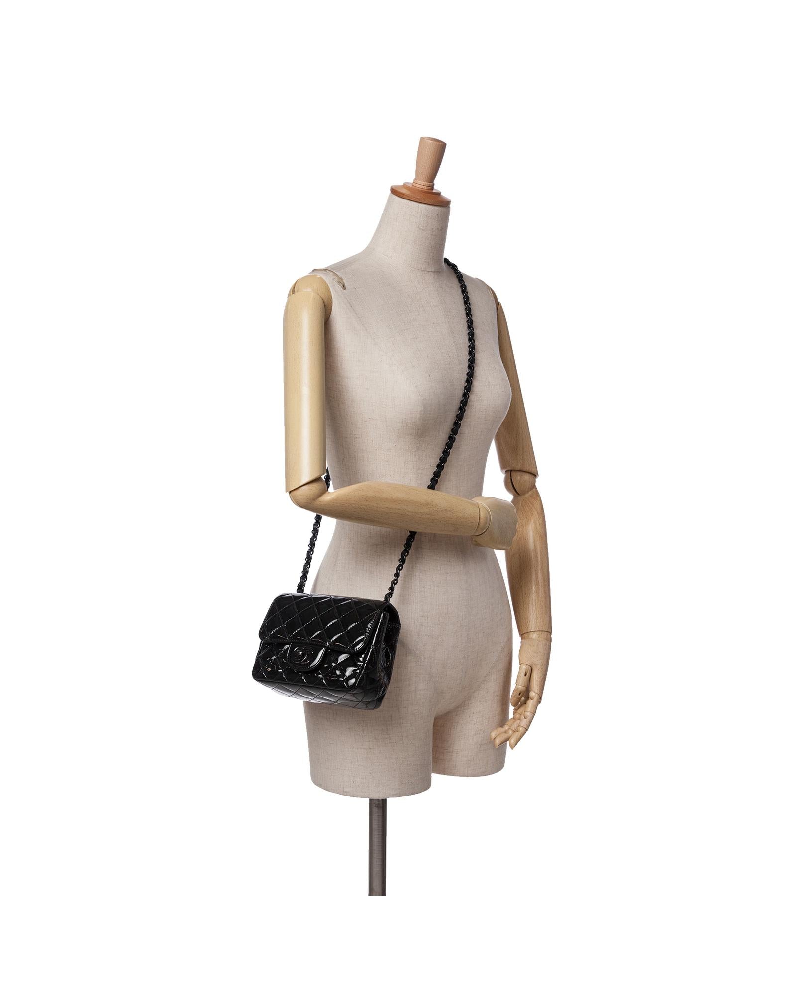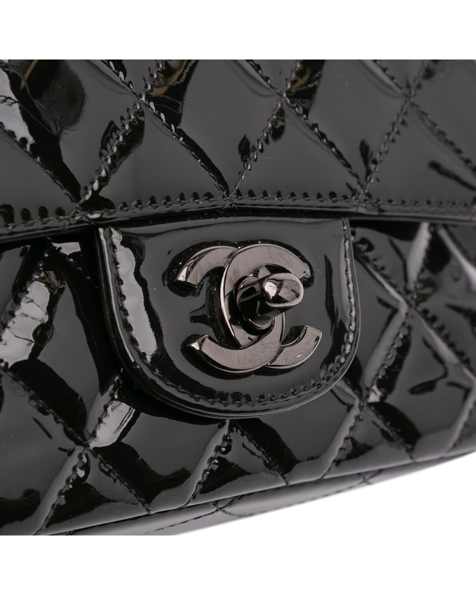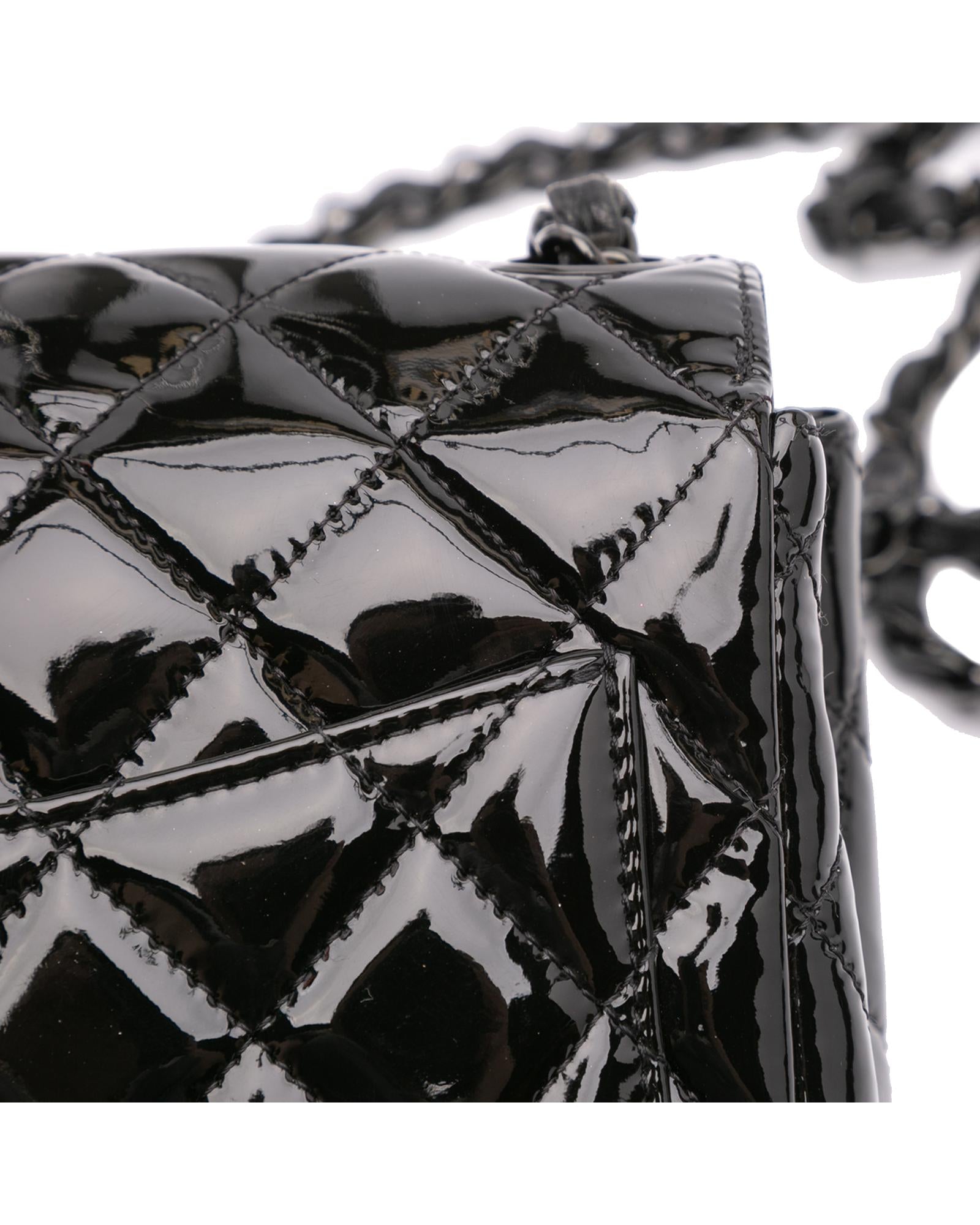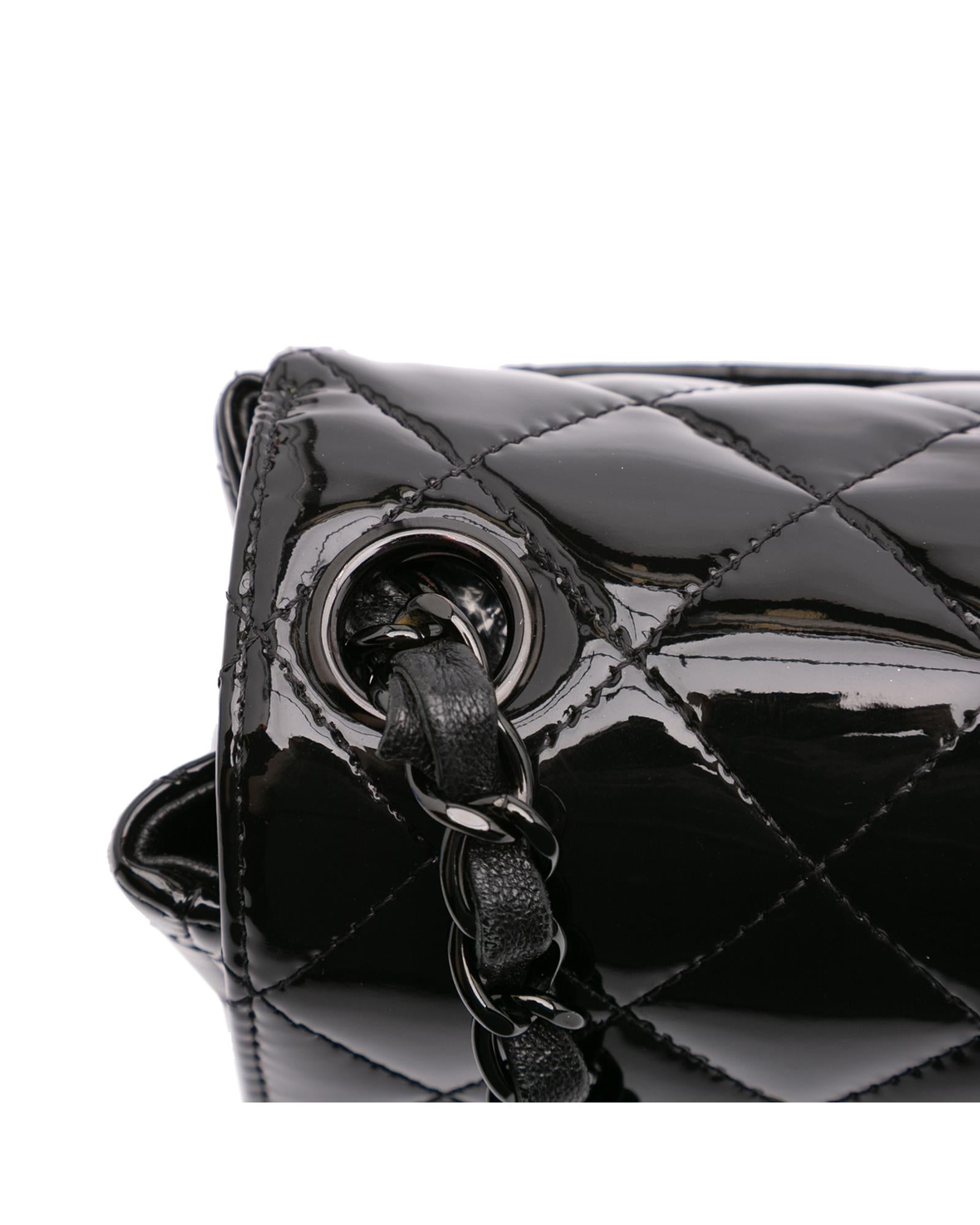 This flap bag features a quilted patent leather body with black hardware a leather woven chain link shoulder strap a front flap with interlocking Cs and a twist lock closure an exterior back slip pocket and interior zip and slip pockets.Brand: Chanel