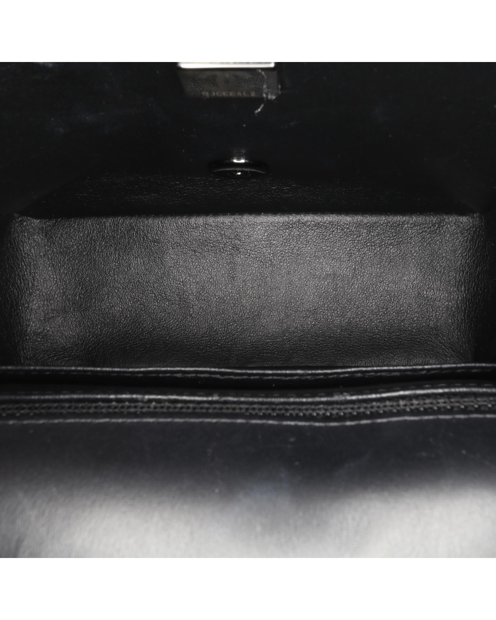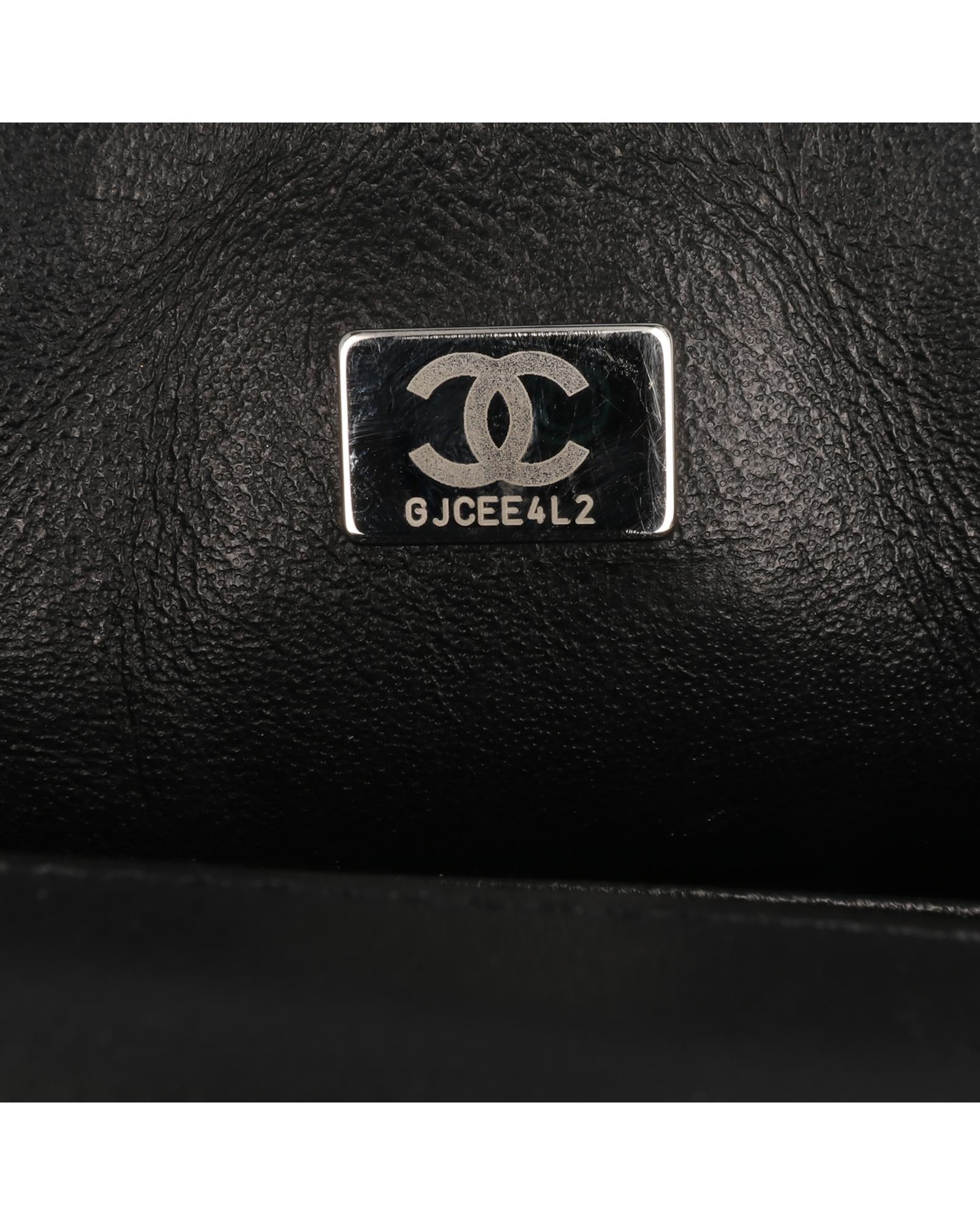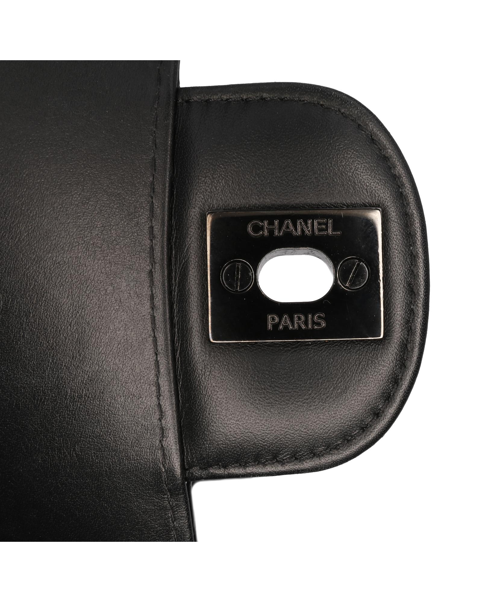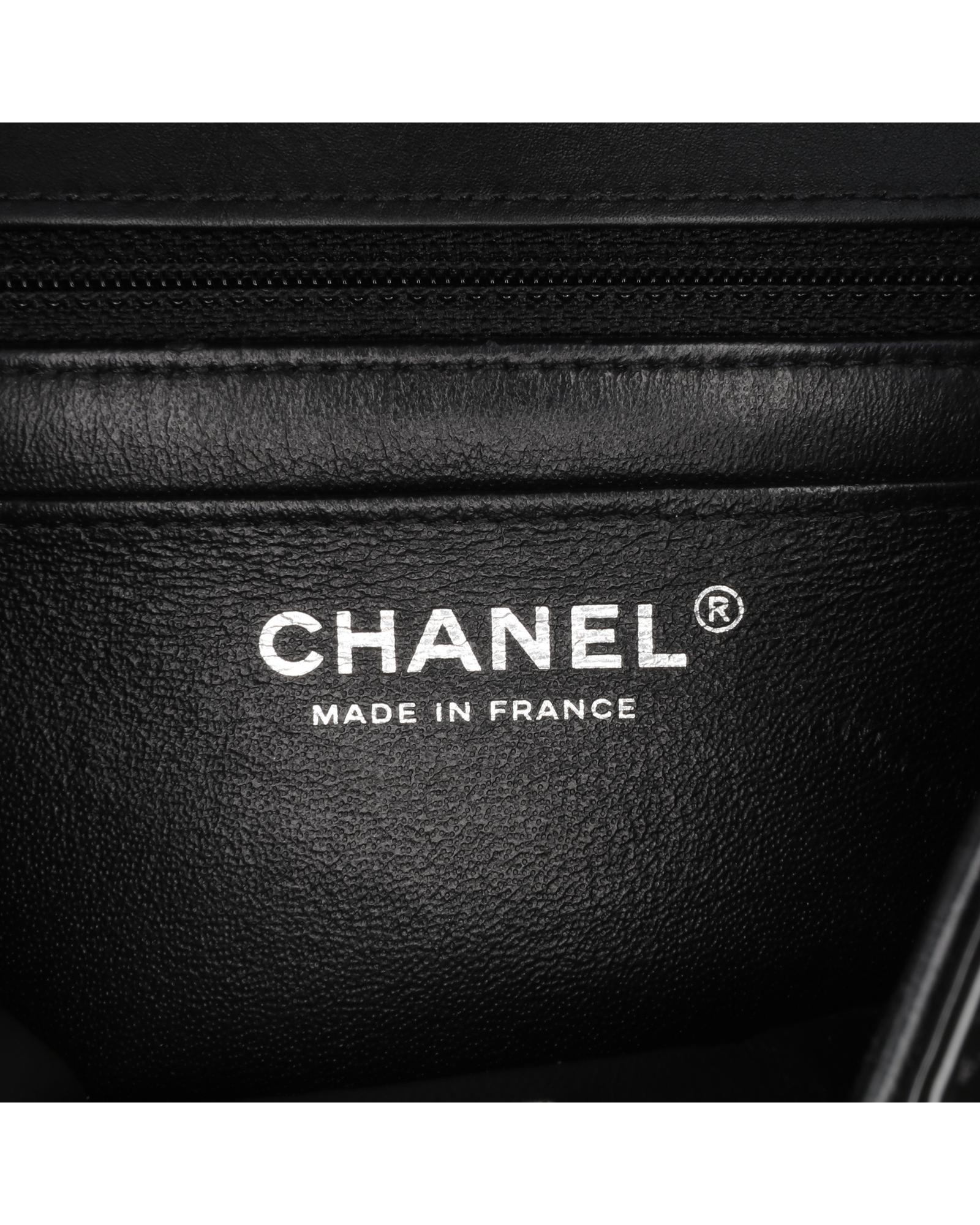 This flap bag features a quilted patent leather body with black hardware a leather woven chain link shoulder strap a front flap with interlocking Cs and a twist lock closure an exterior back slip pocket and interior zip and slip pockets.Brand: Chanel