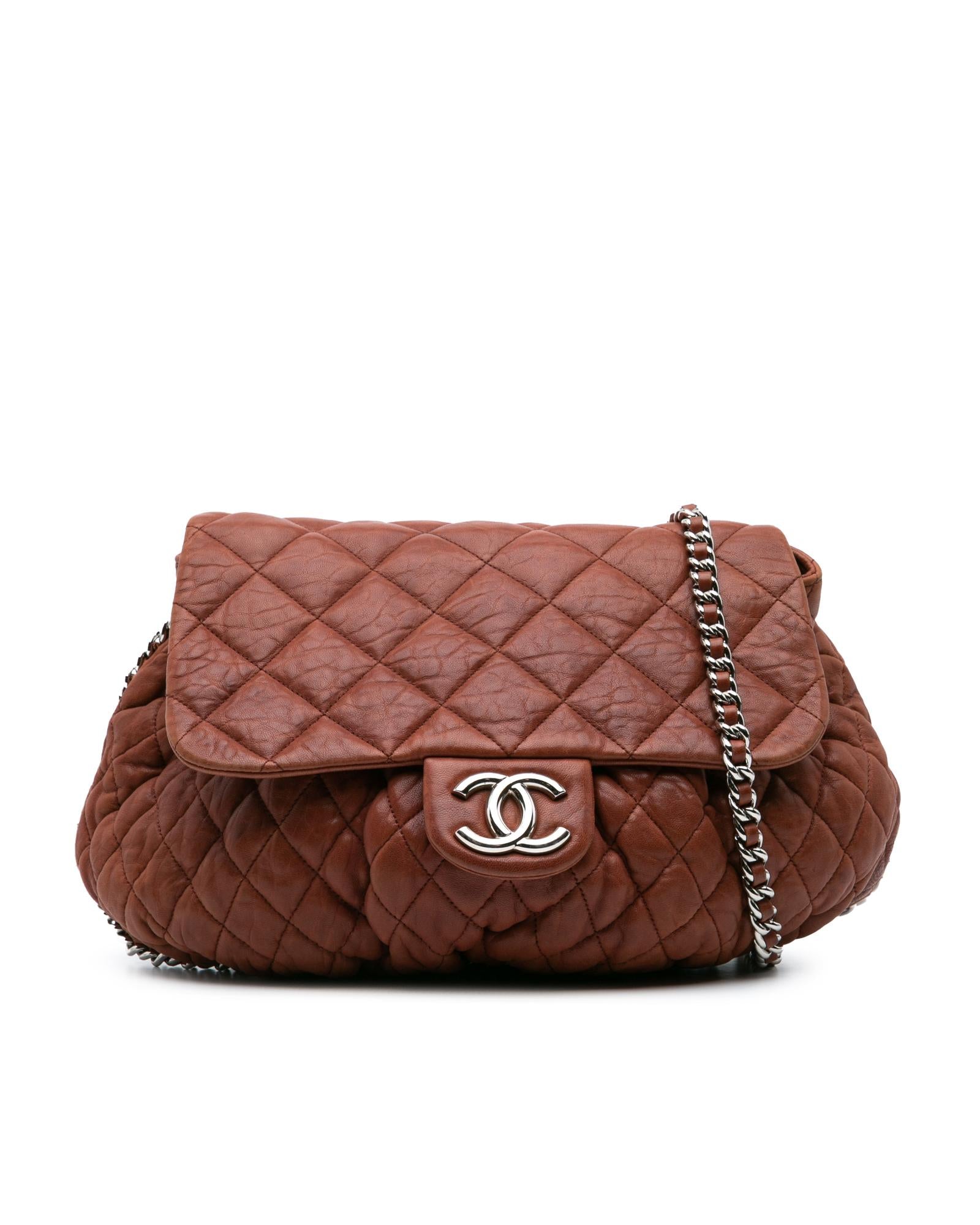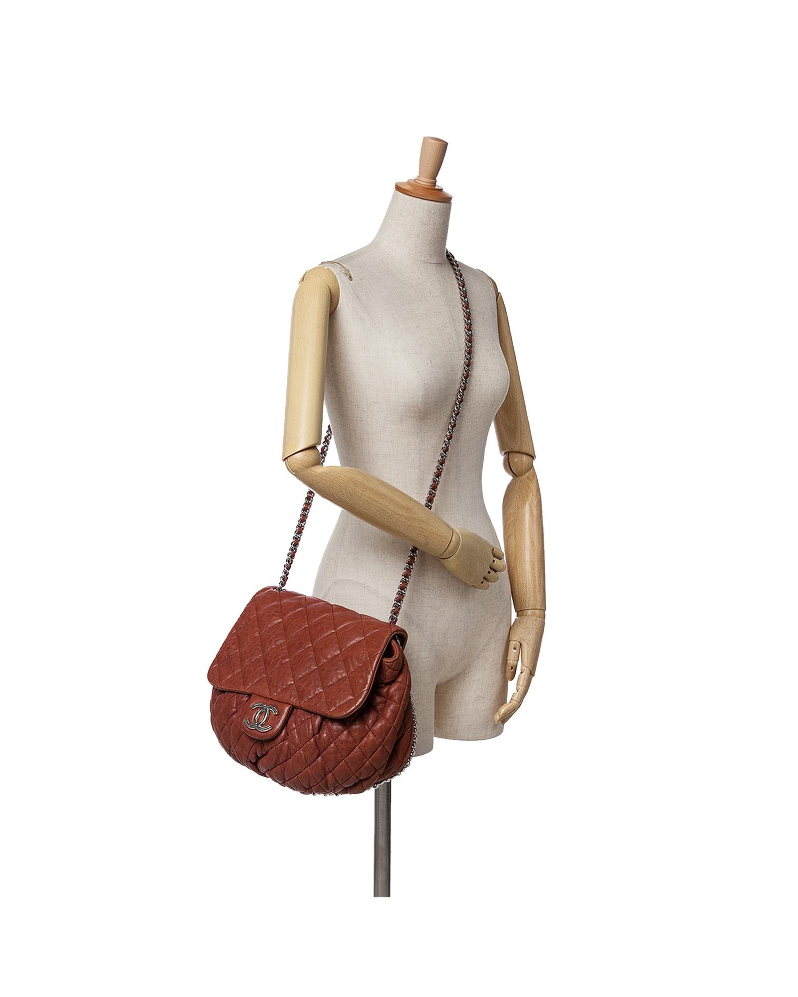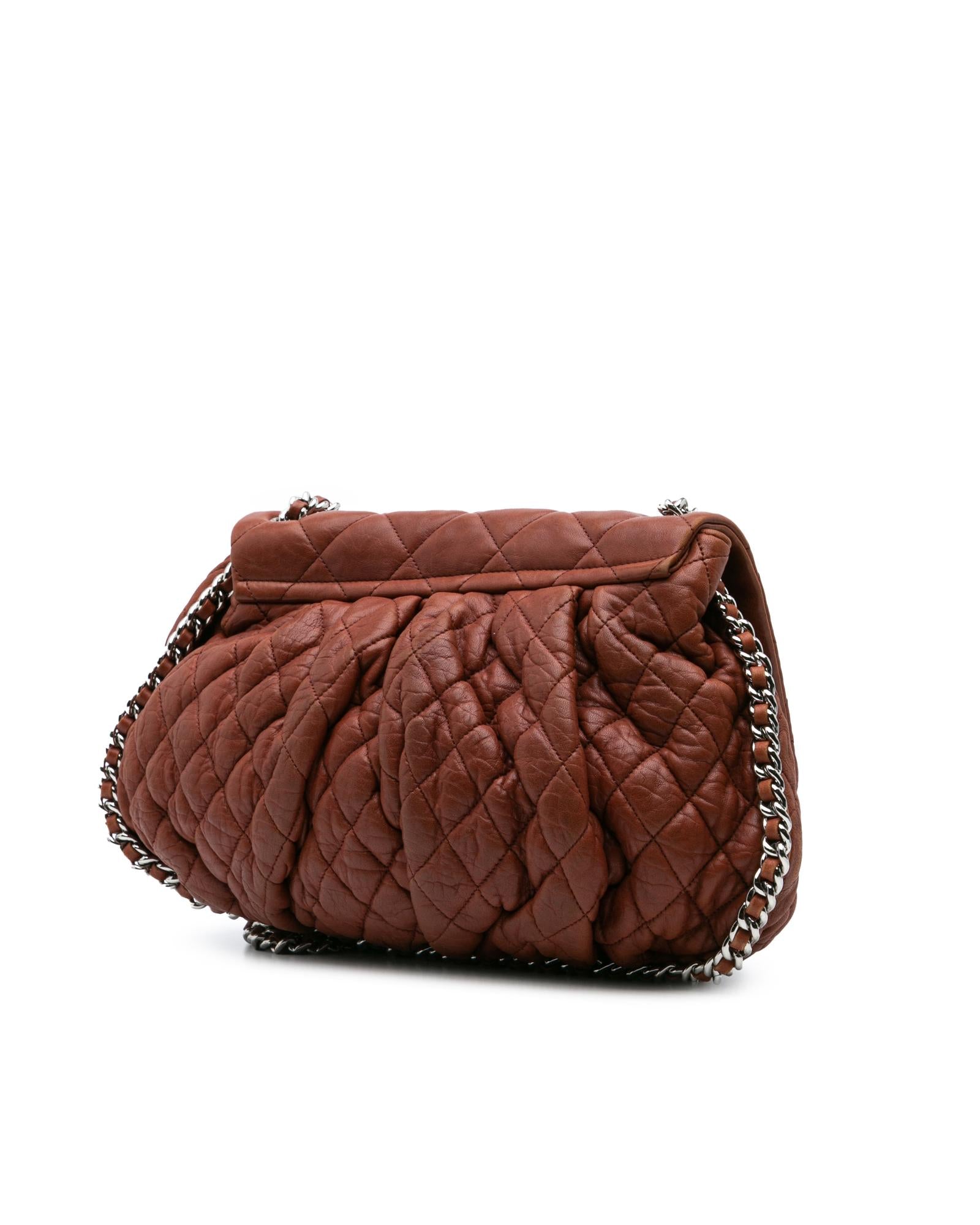 The Chain Around Flap features a lambskin leather body a leather woven chain link strap a front flap with magnetic snap closure and interior zip and slip pockets.
