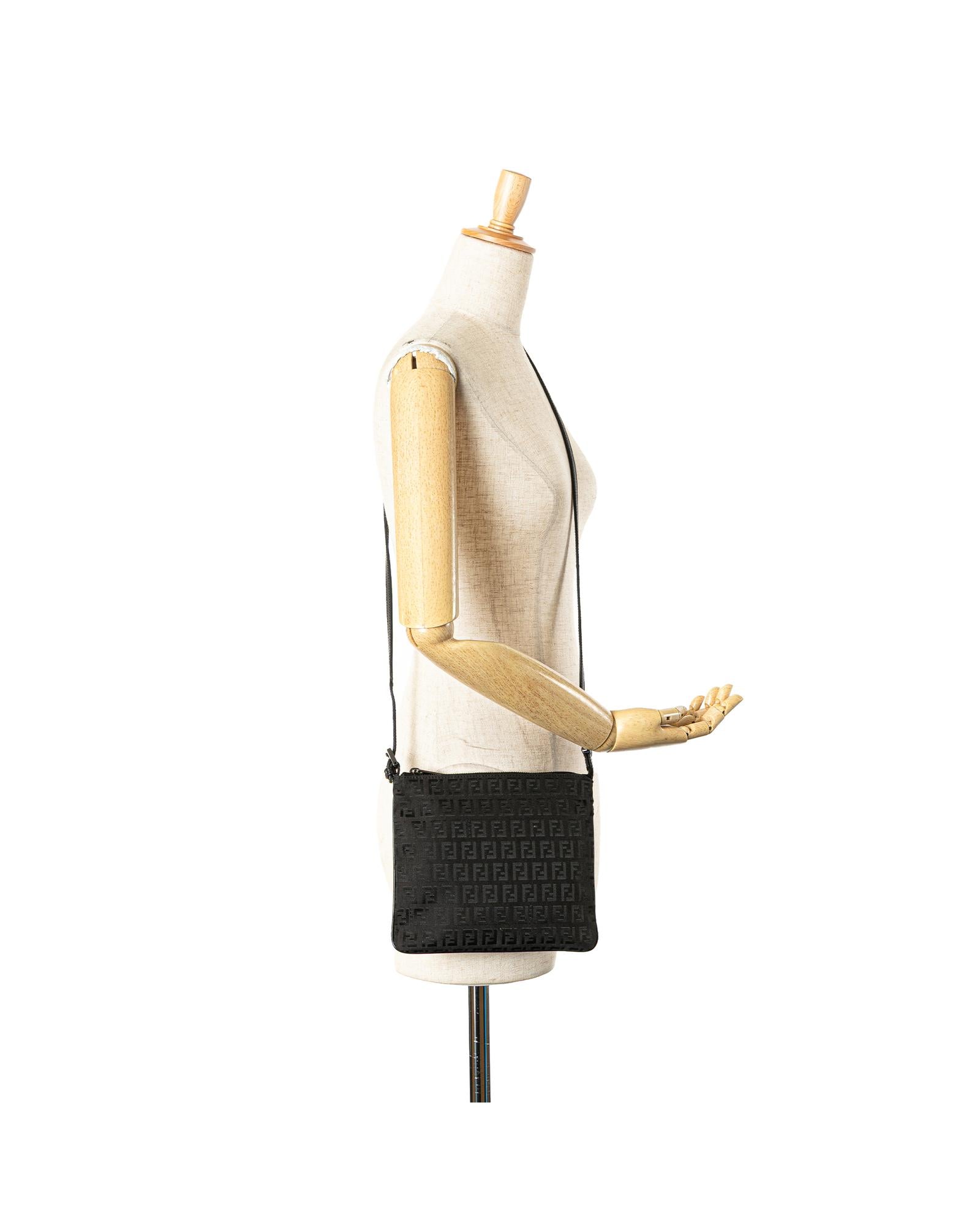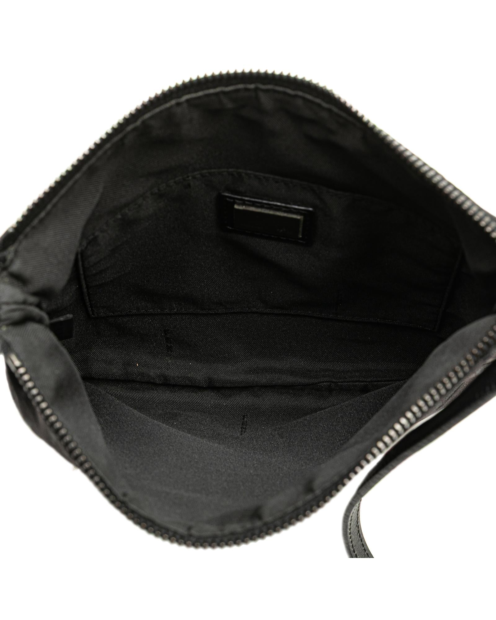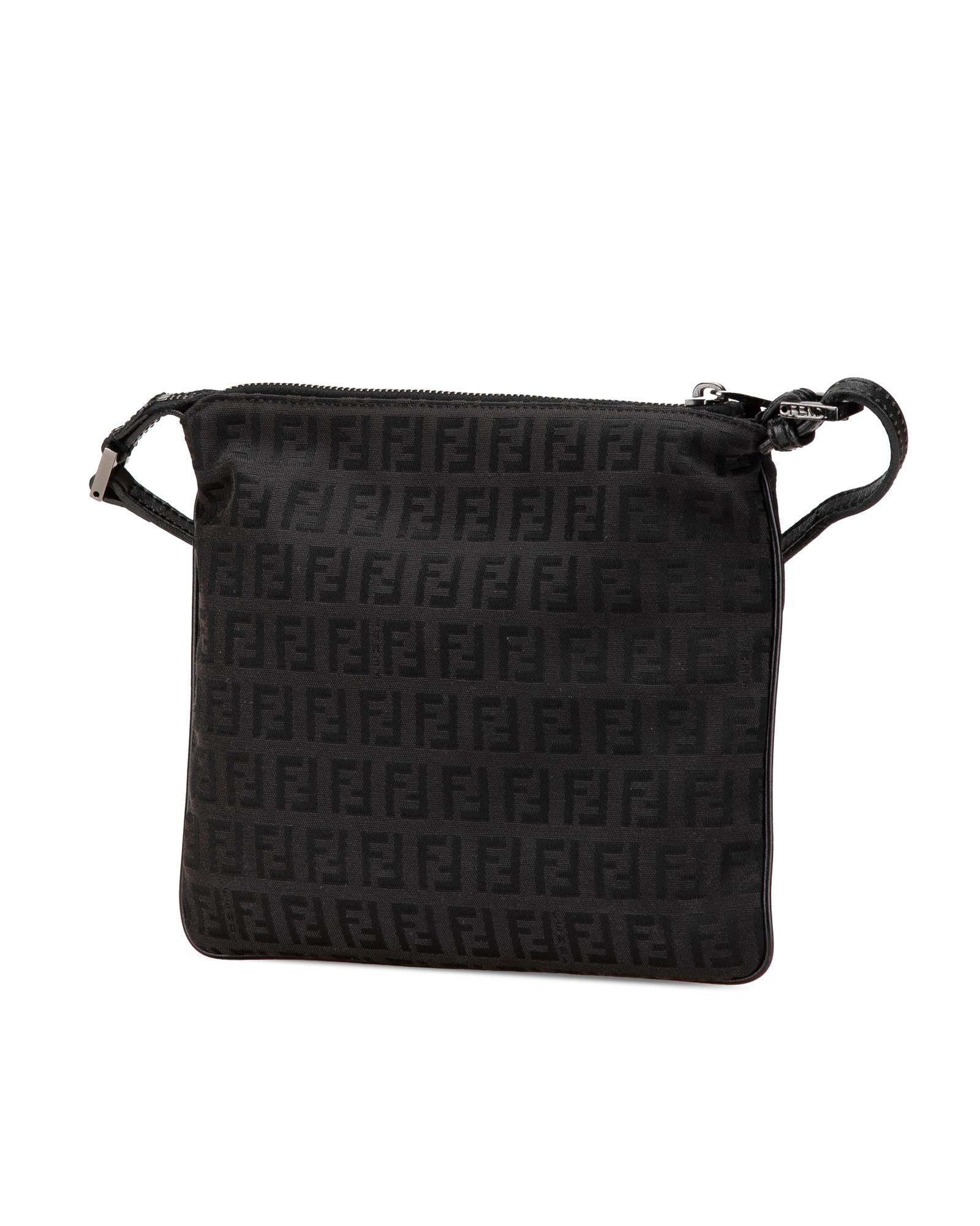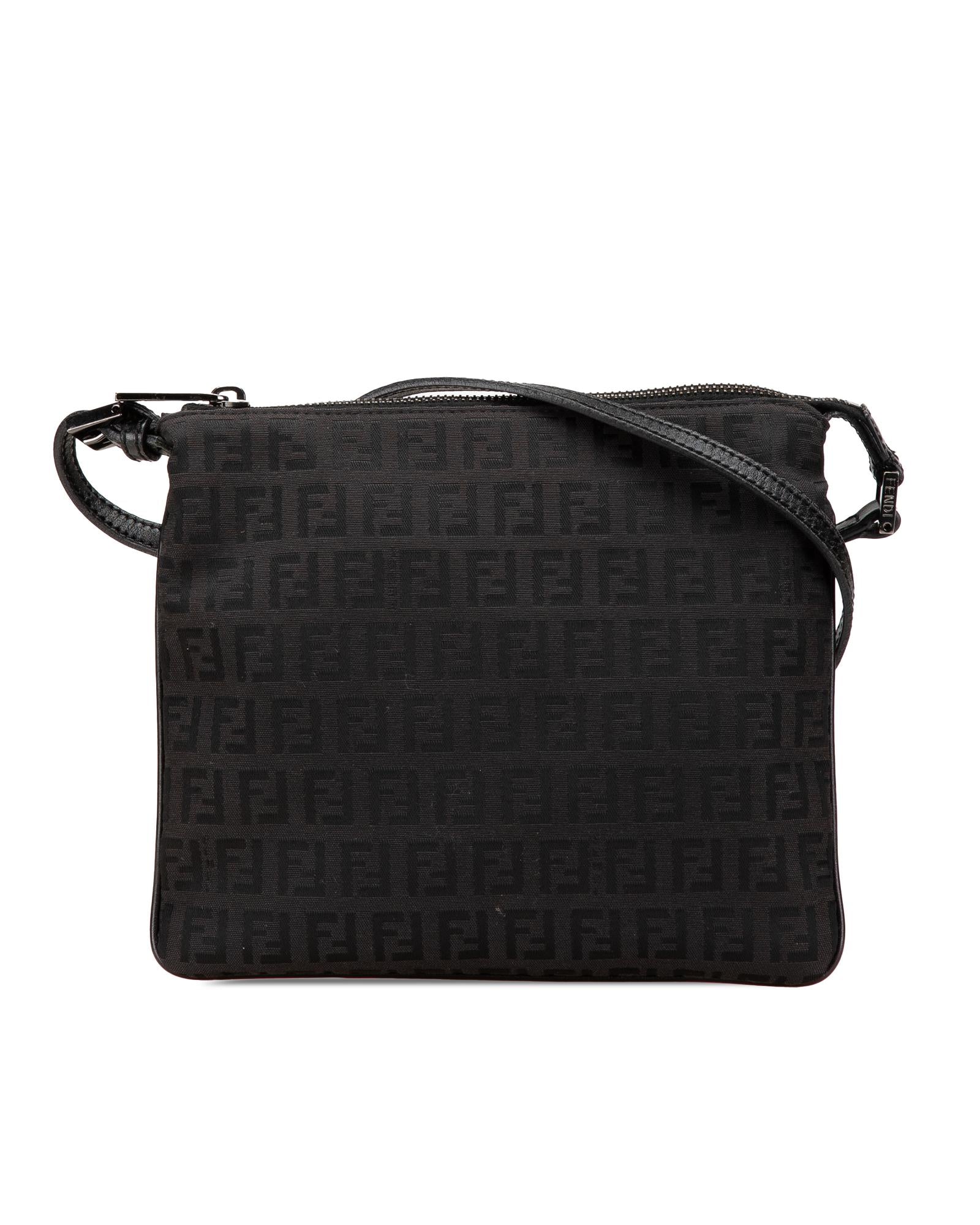 This crossbody features a canvas body with leather trim a flat leather strap a top zip closure and an interior slip pocket.