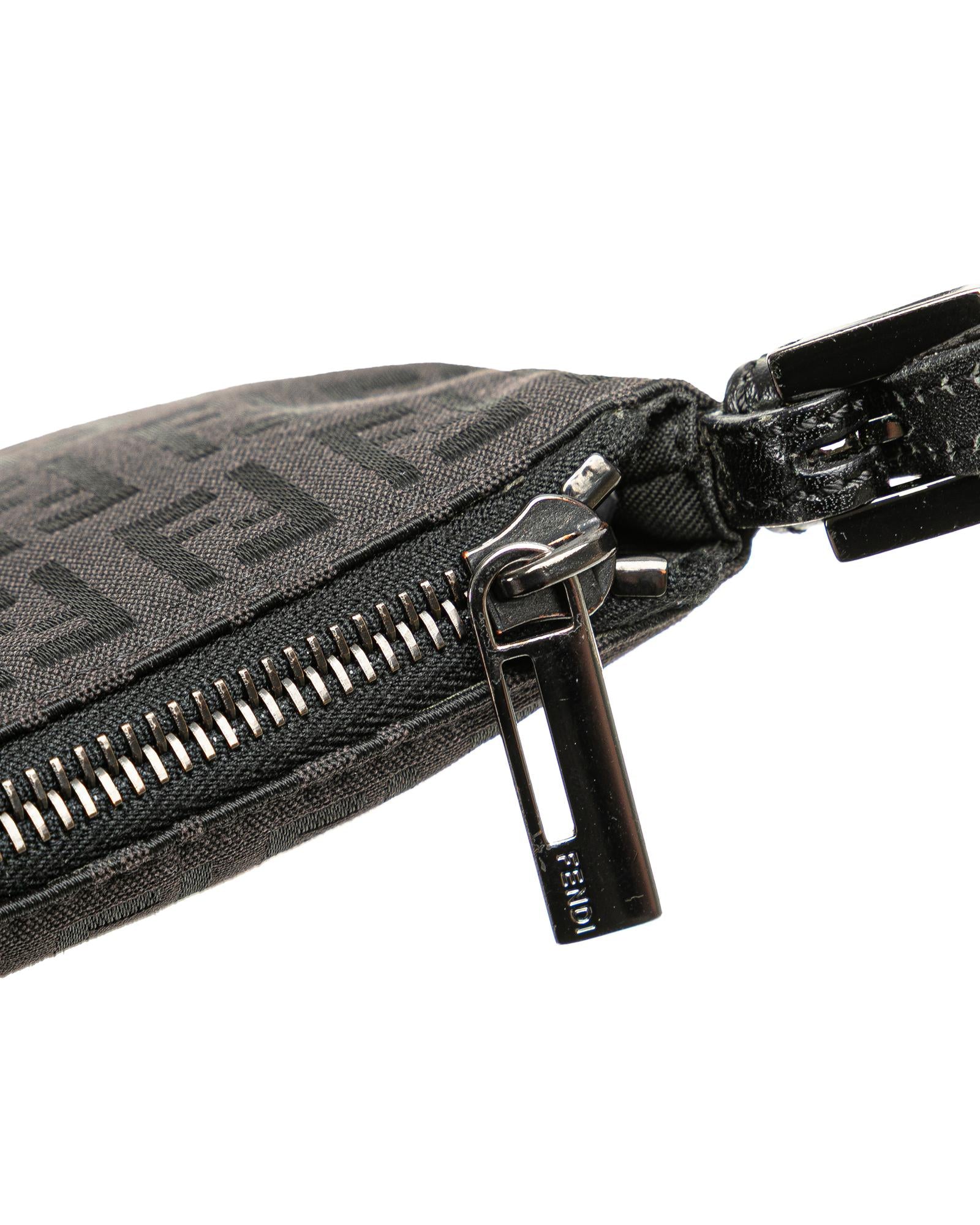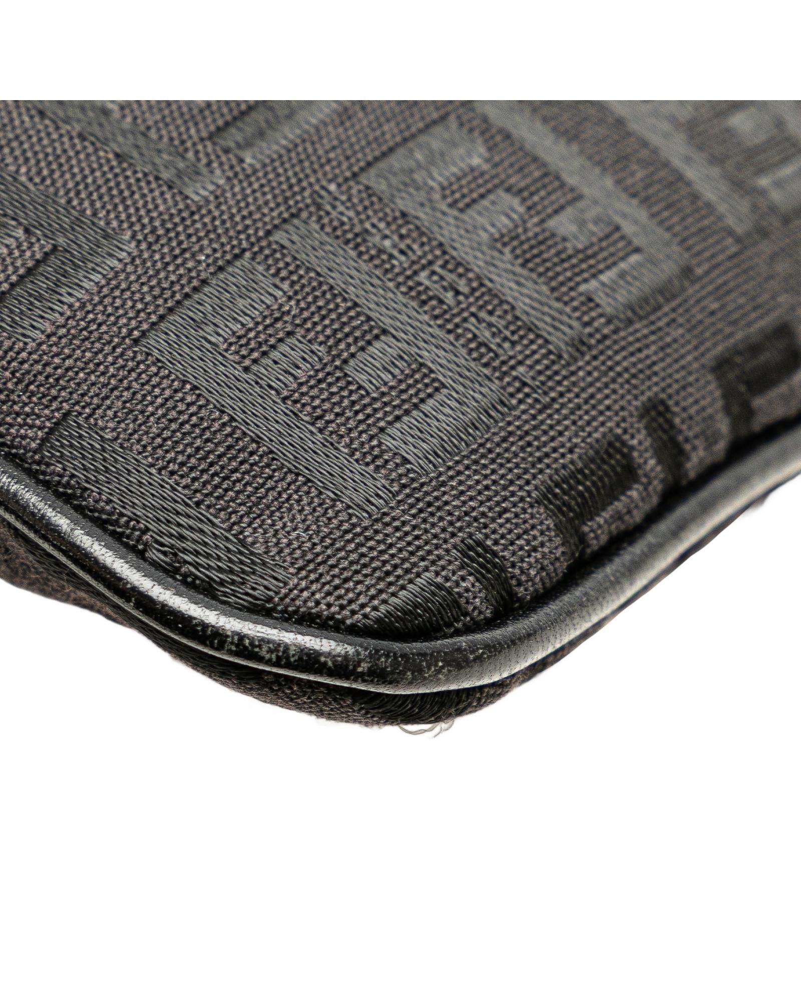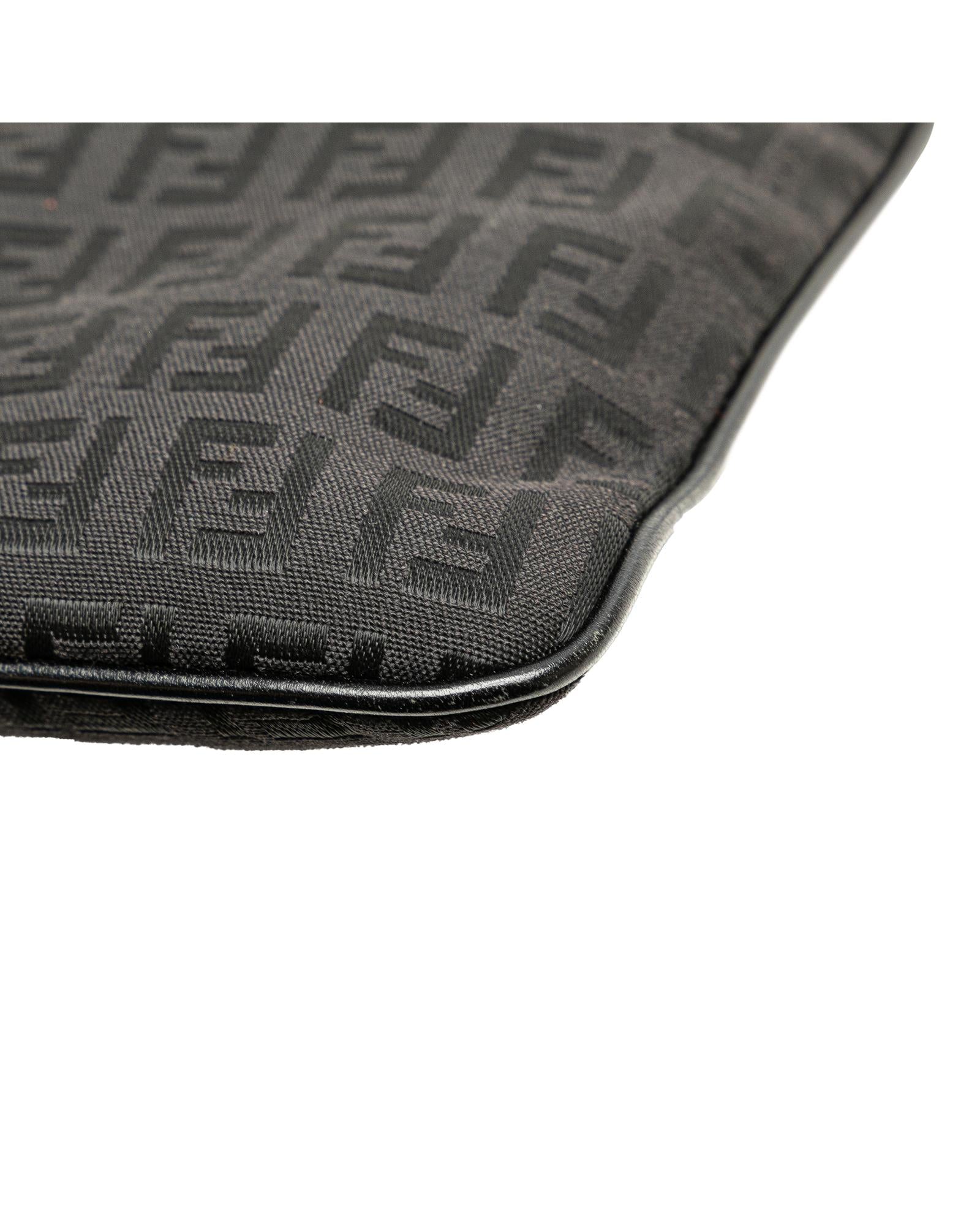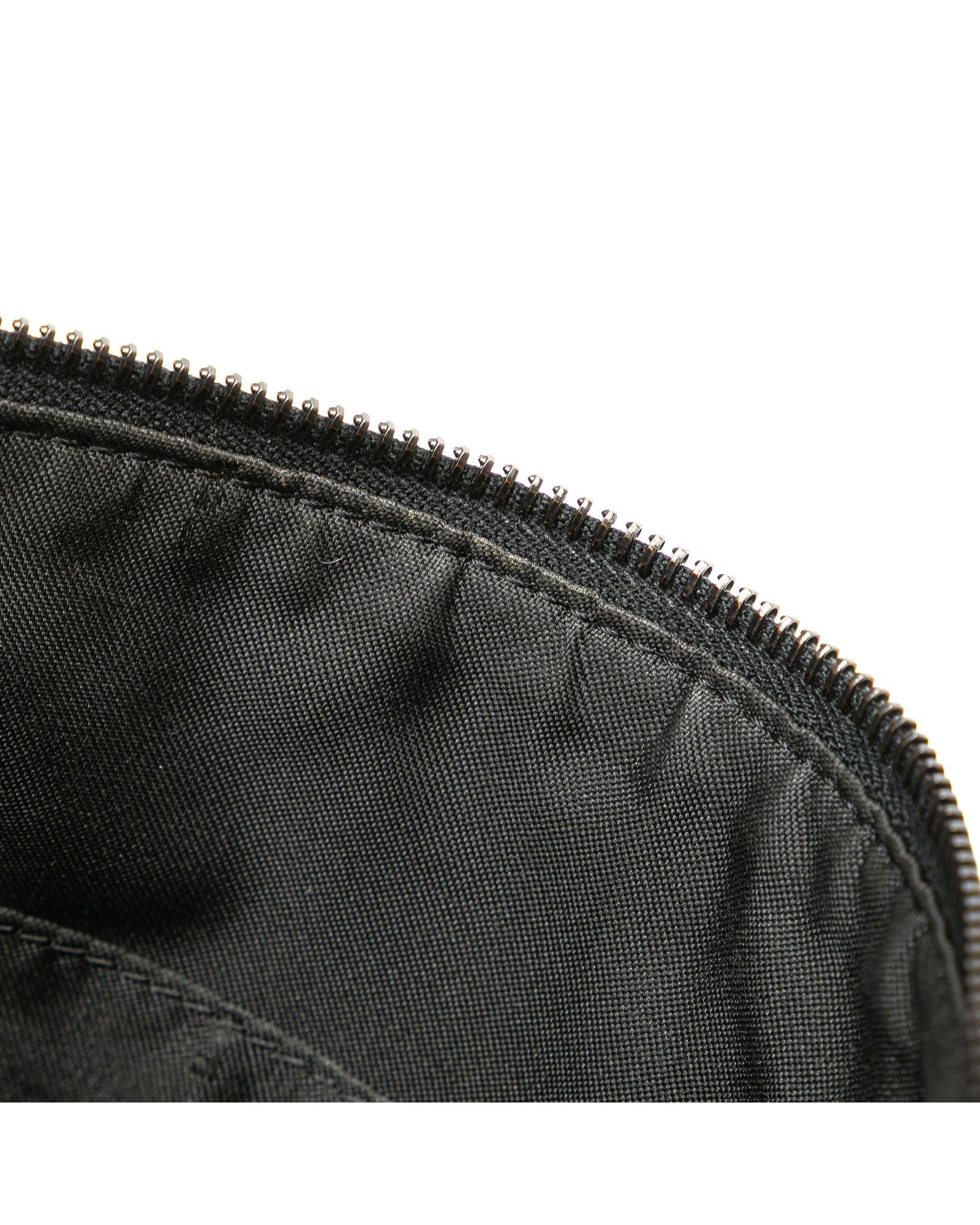This crossbody features a canvas body with leather trim a flat leather strap a top zip closure and an interior slip pocket.
