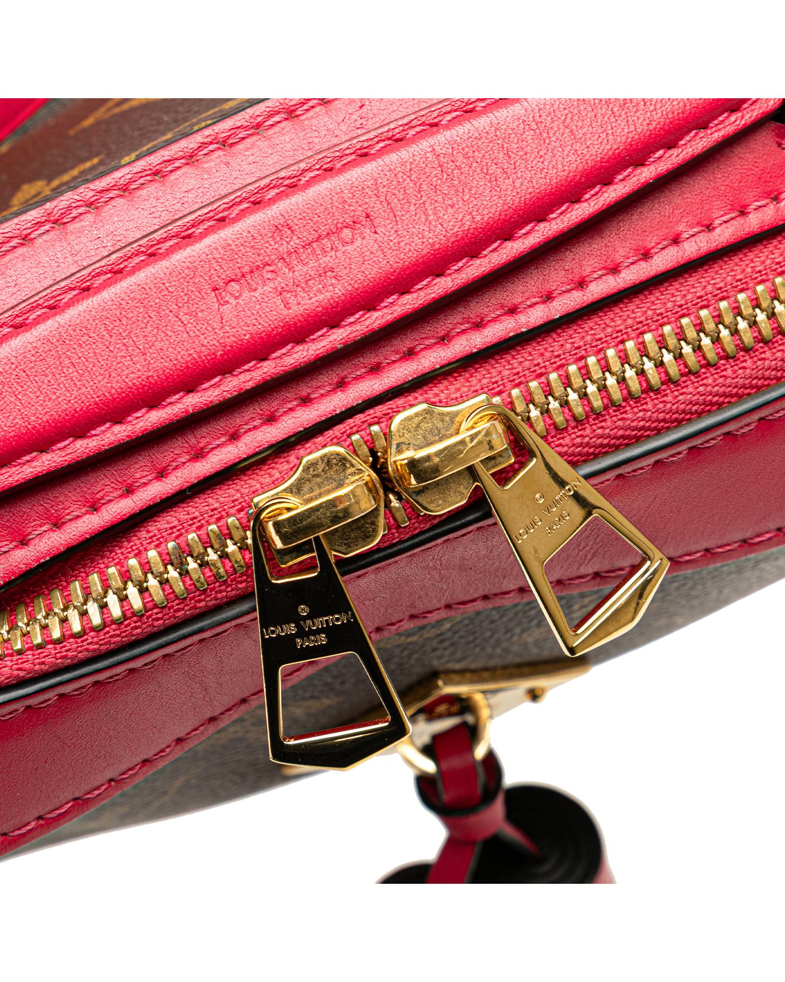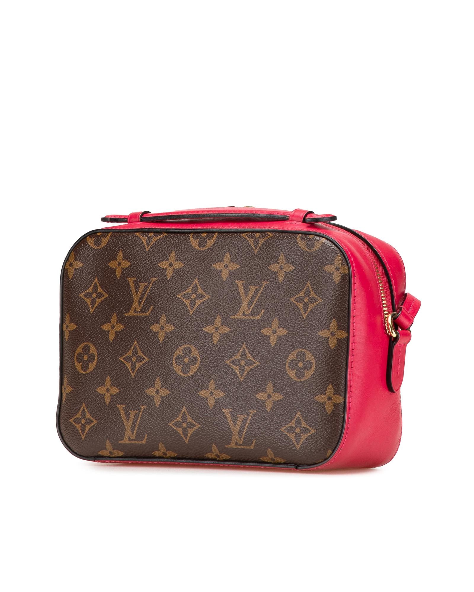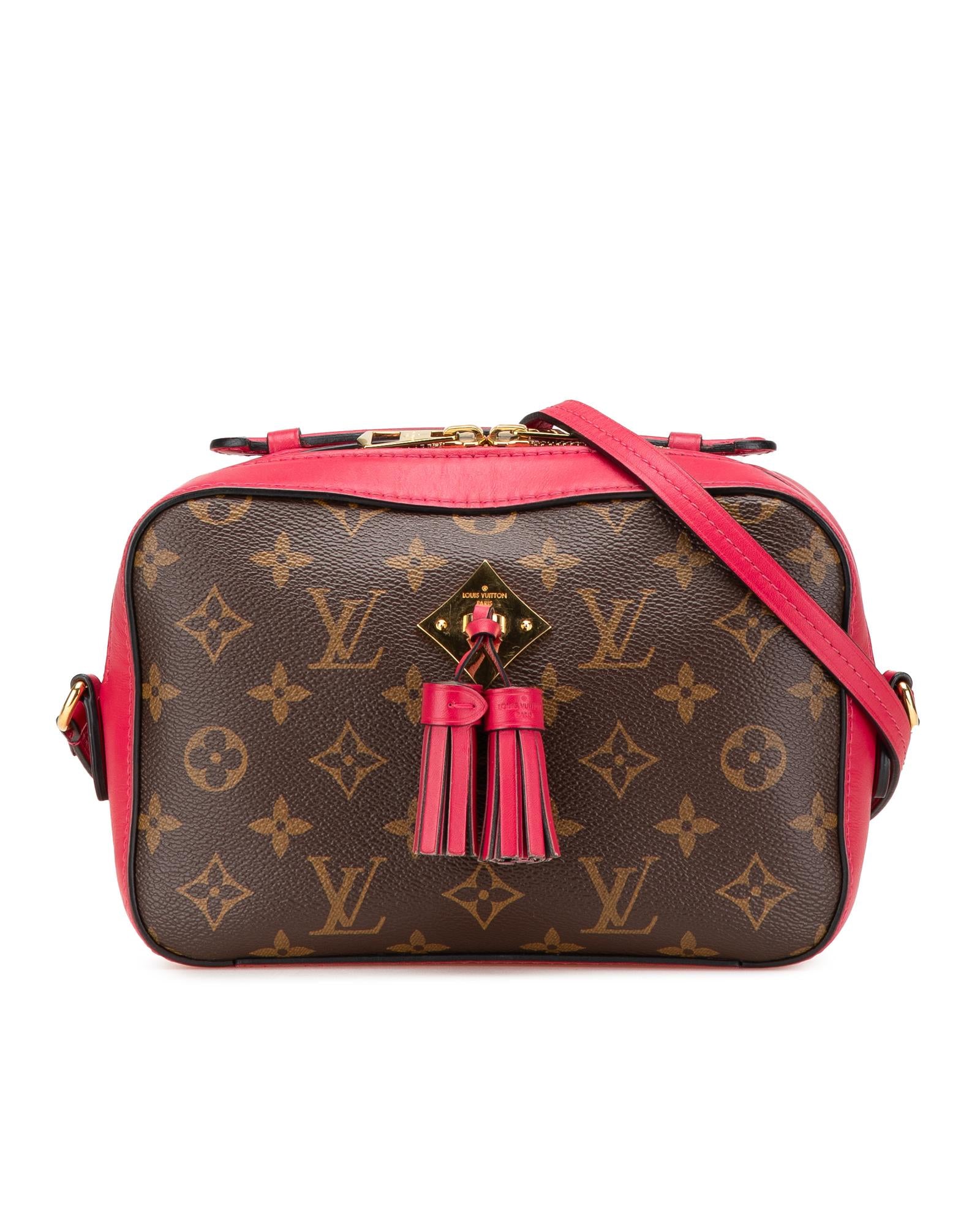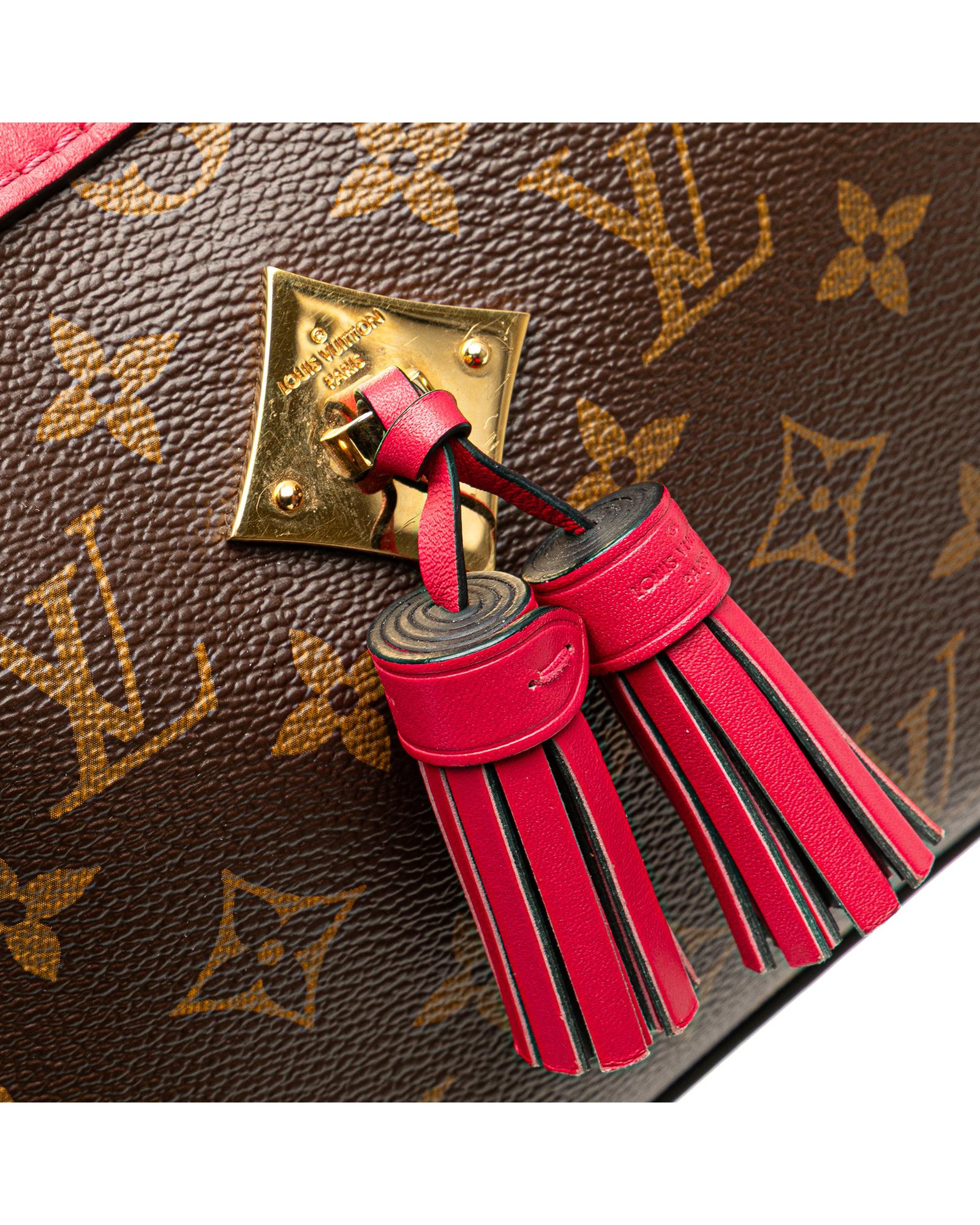 The Monogram Saintonge features a monogram canvas with leather trim a flat leather top handle a flat leather shoulder strap a top zip closure and an interior slip pocket.