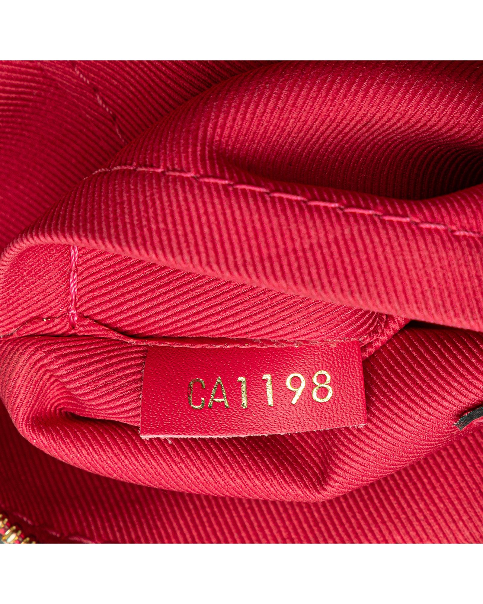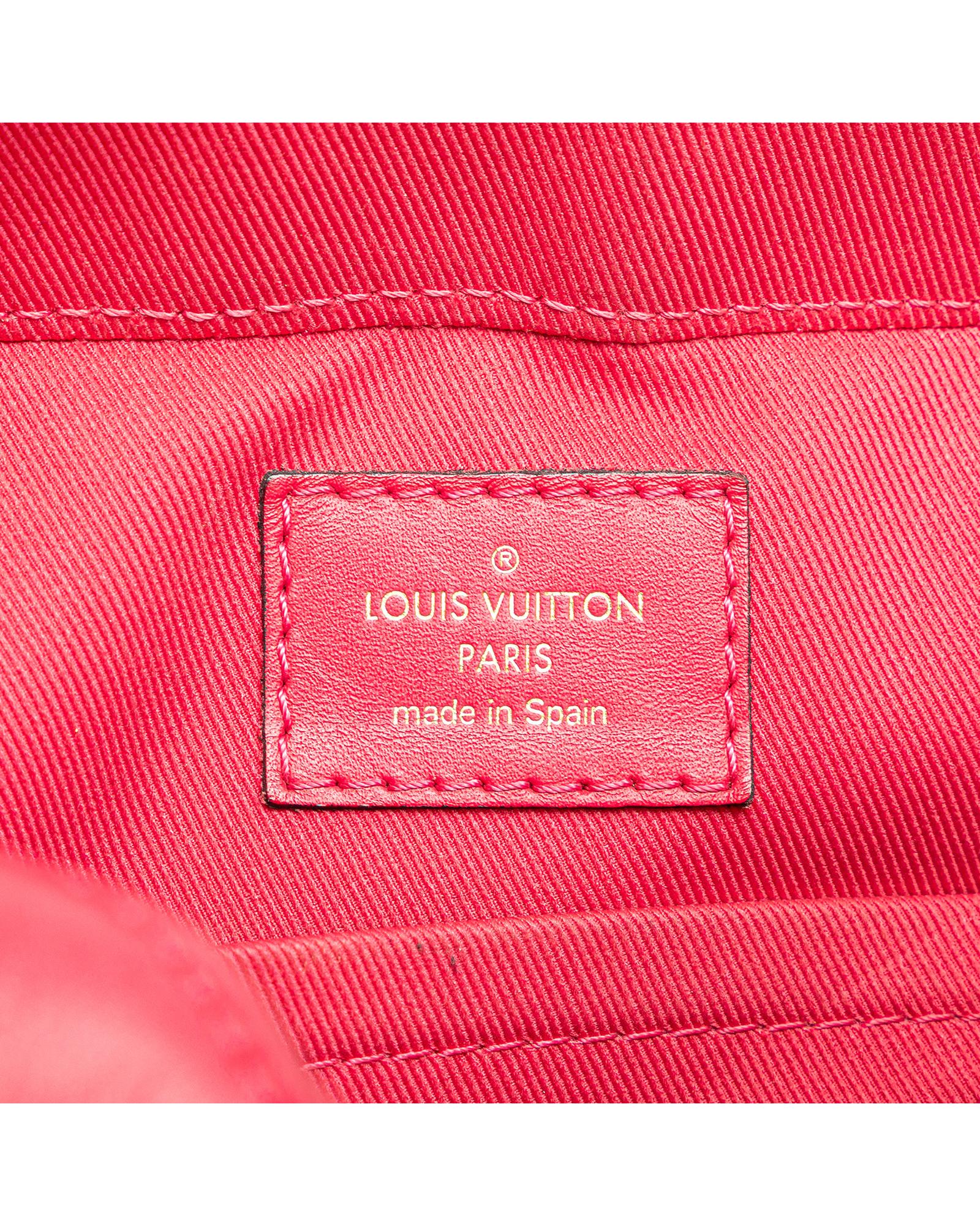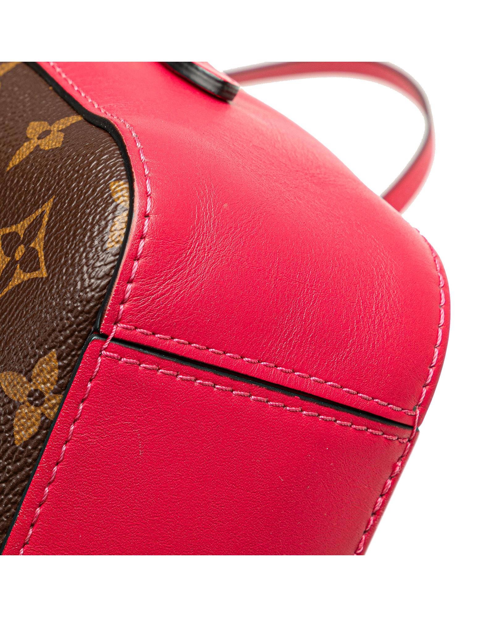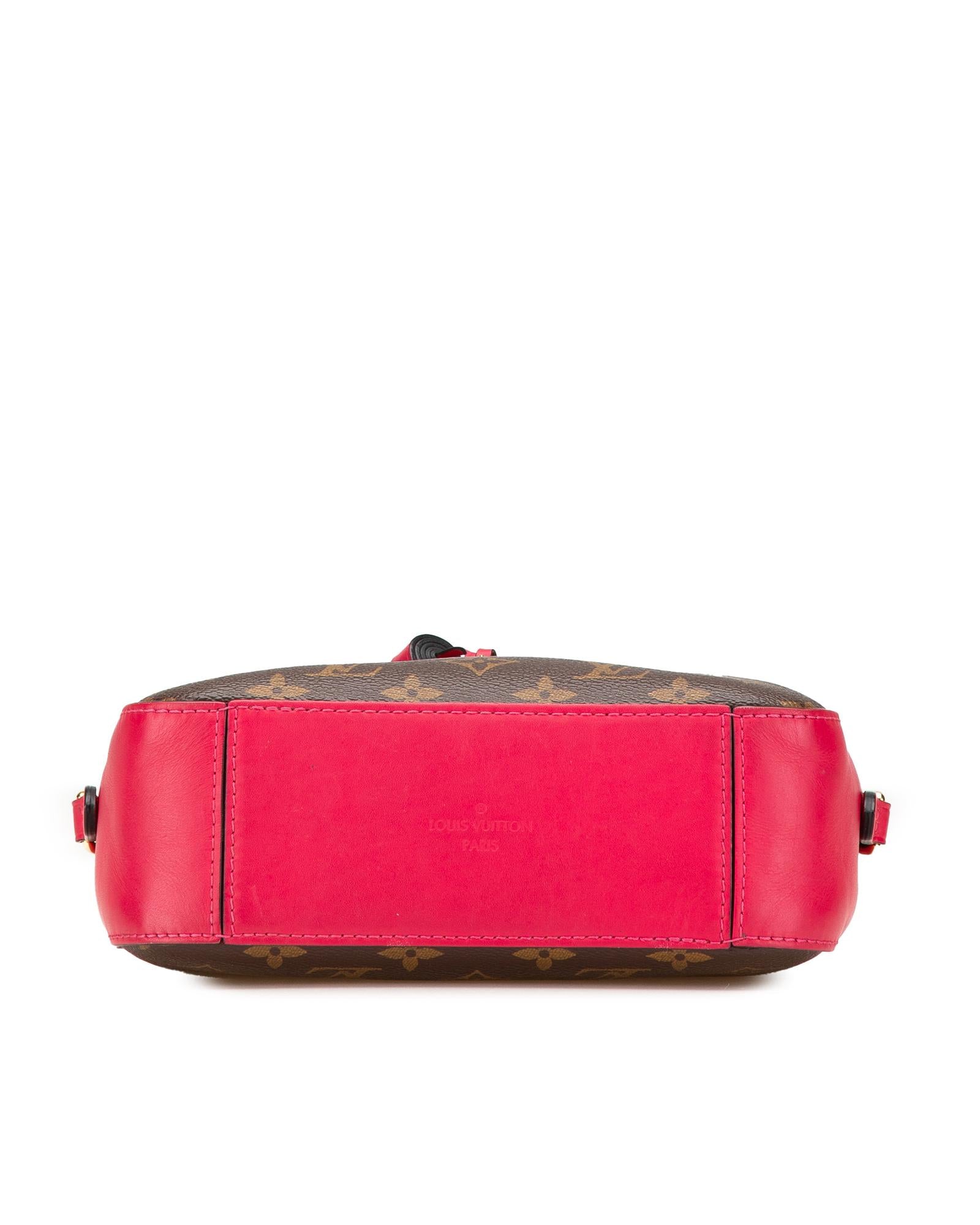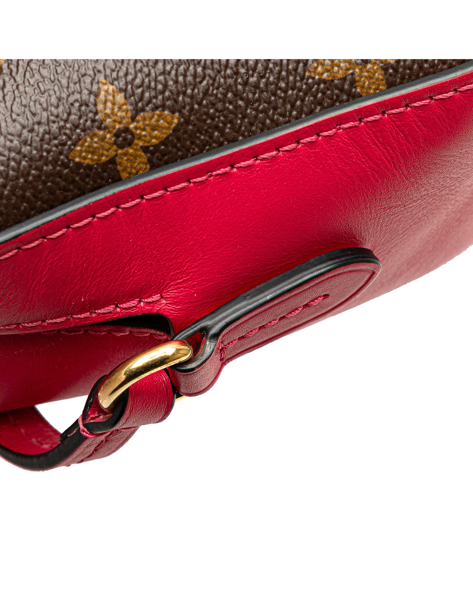 The Monogram Saintonge features a monogram canvas with leather trim a flat leather top handle a flat leather shoulder strap a top zip closure and an interior slip pocket.