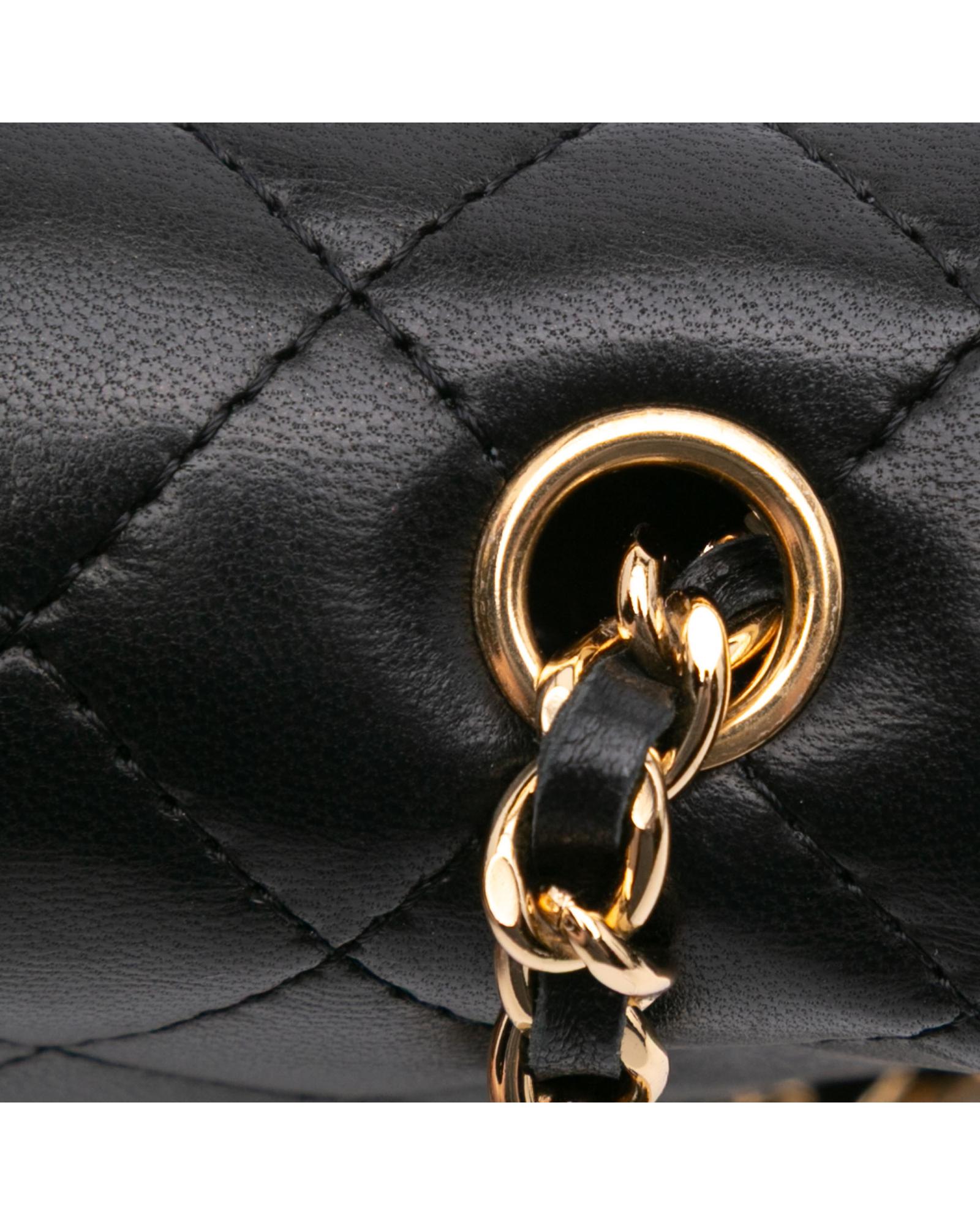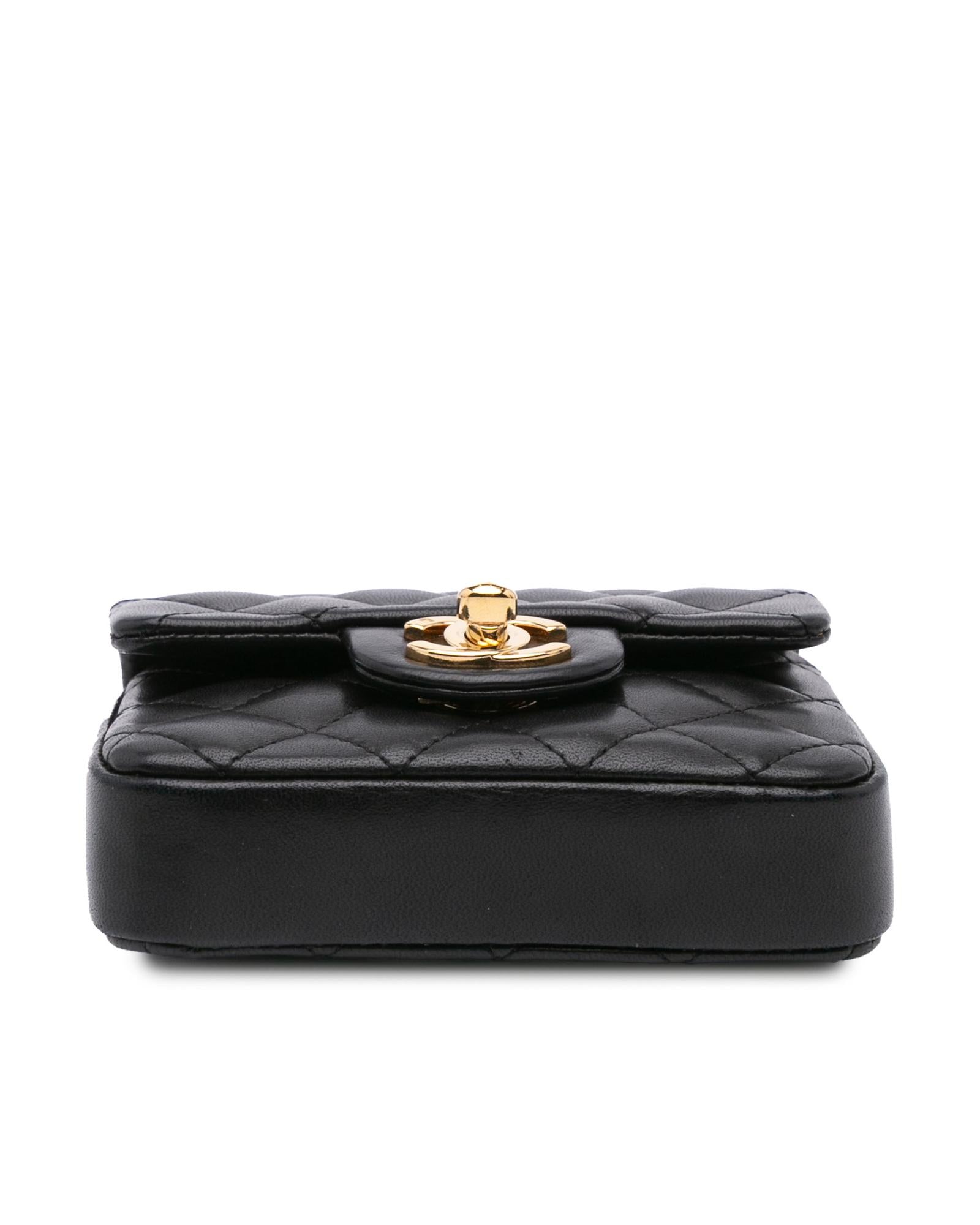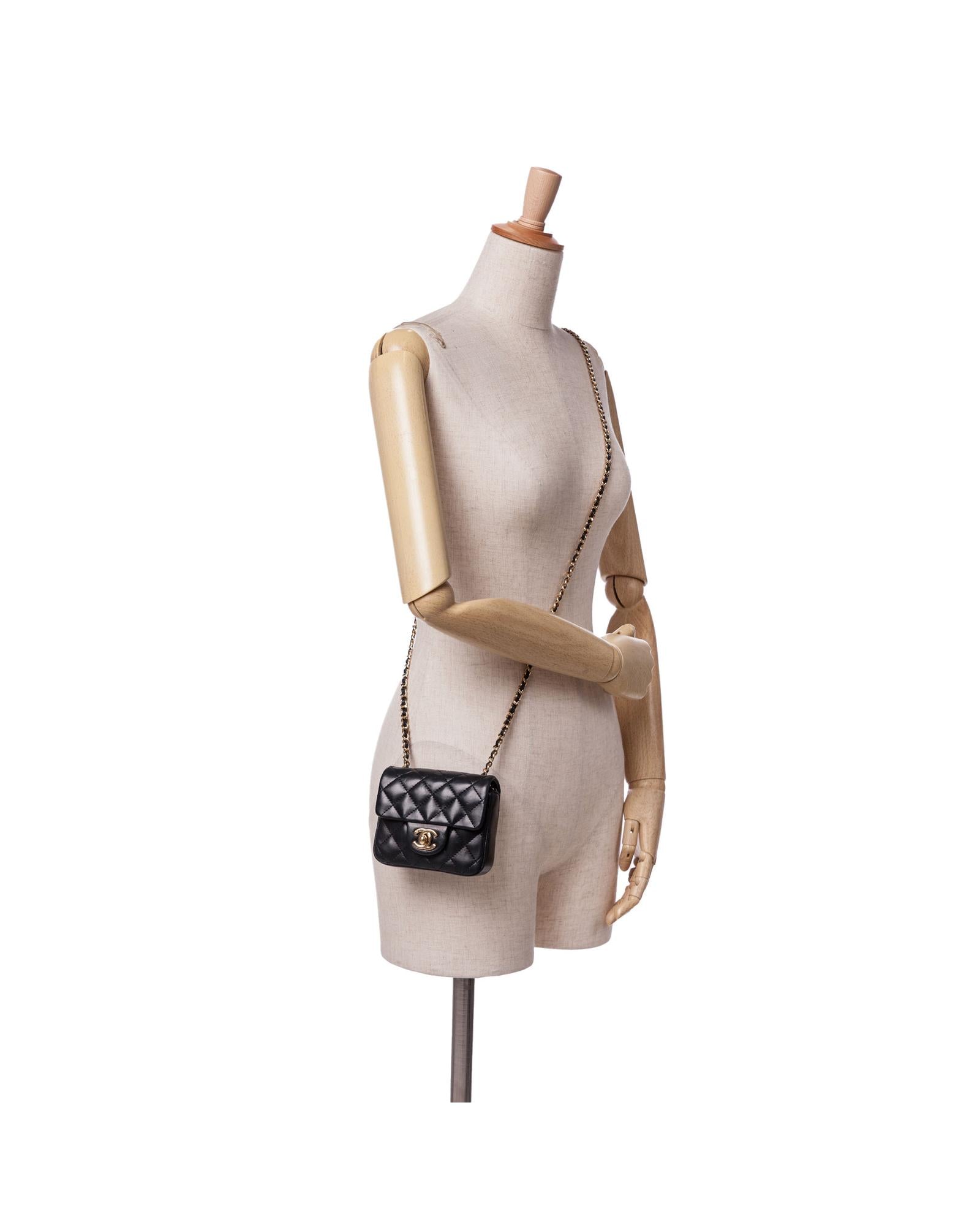 This flap bag features a quilted lambskin leather body a leather-woven chain strap a front flap with CC turn lock closure and interior slip pockets.