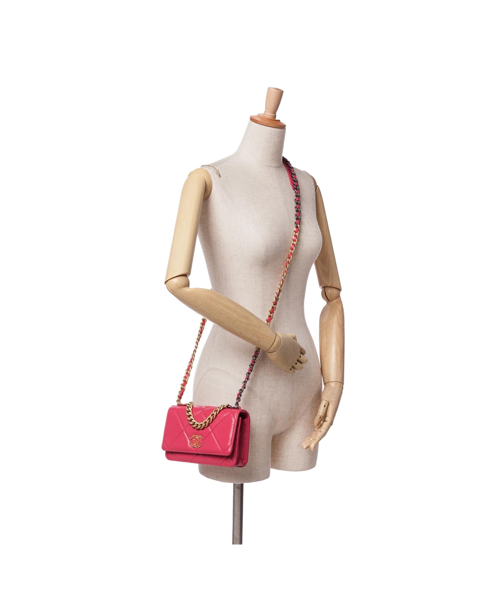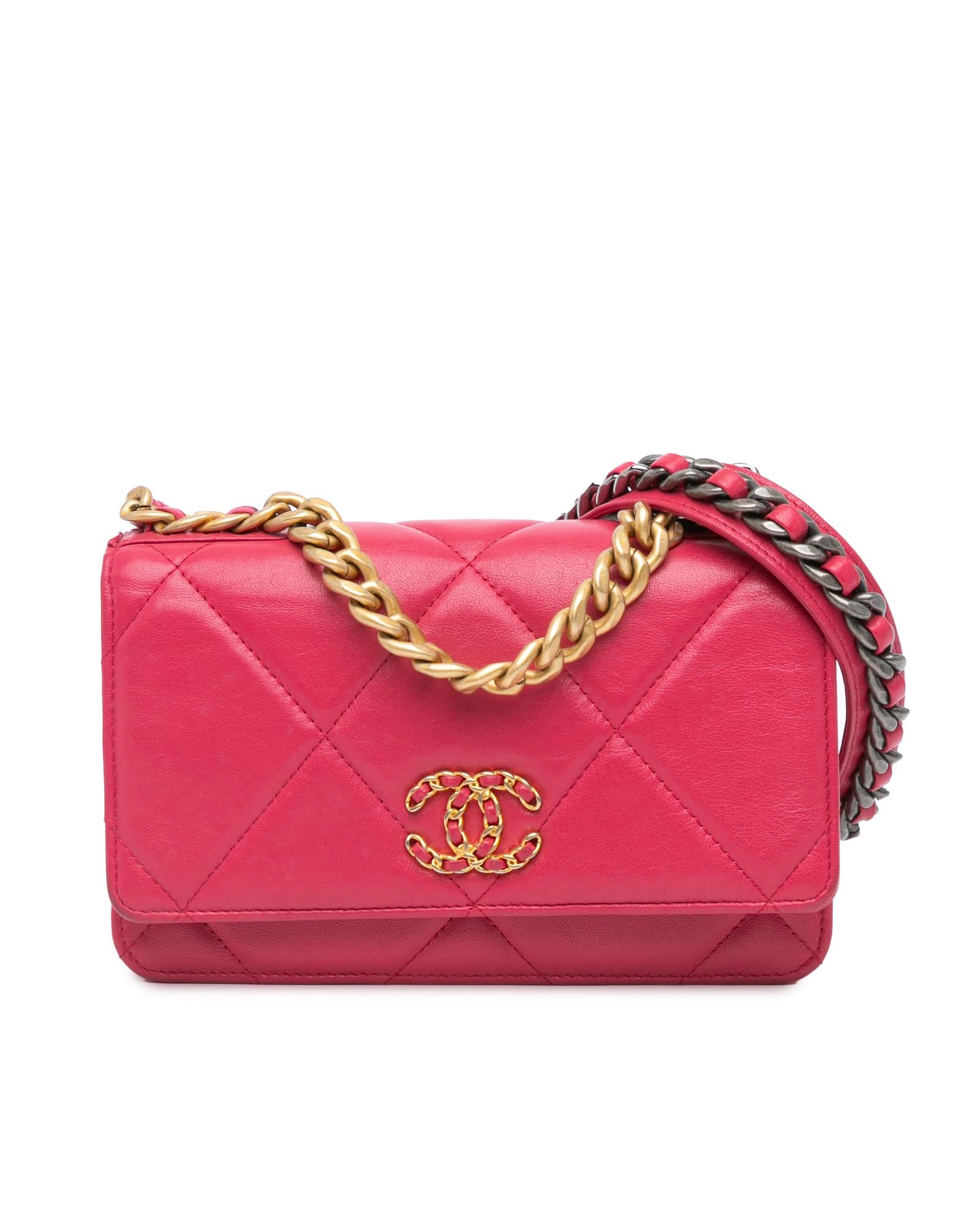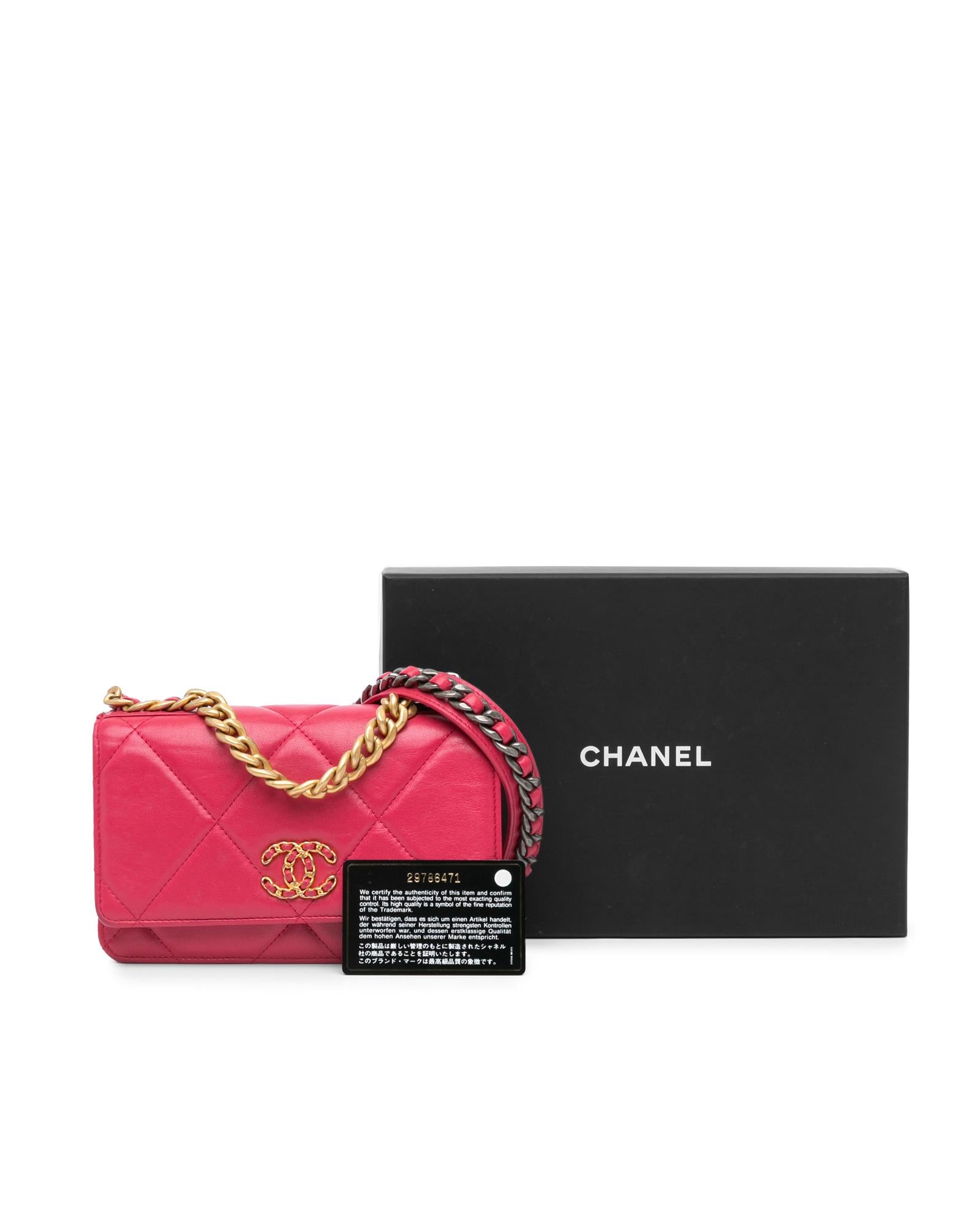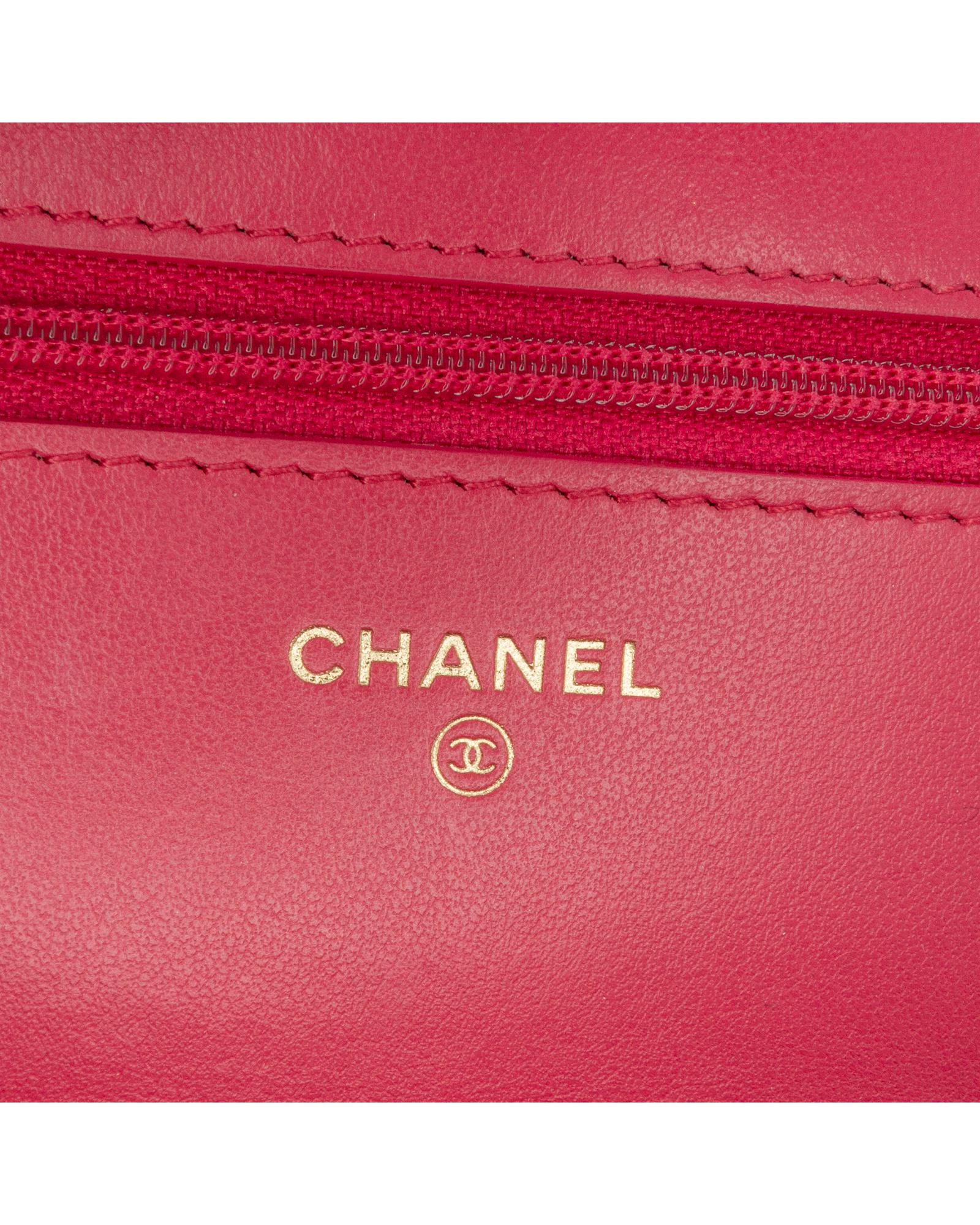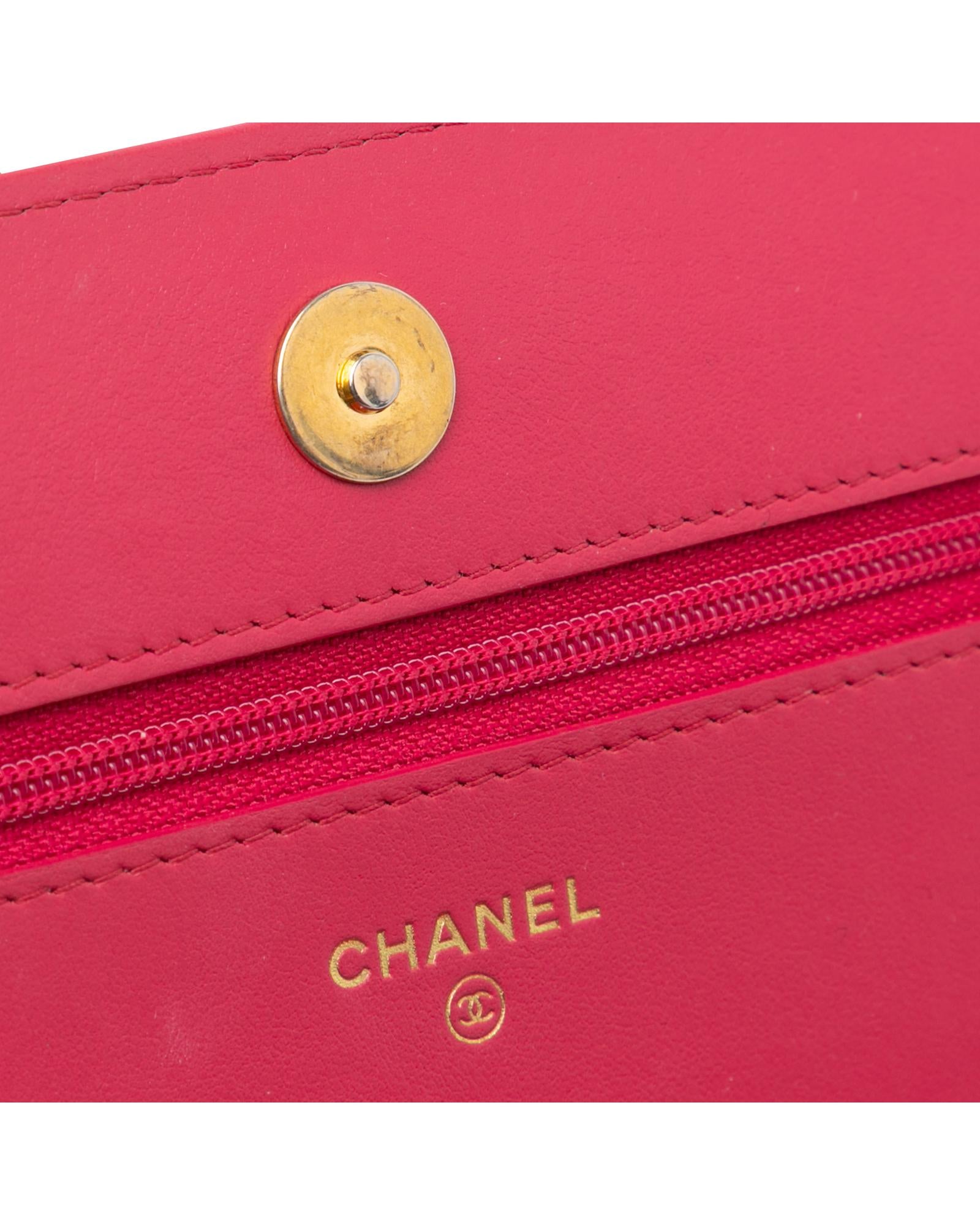 This wallet on chain features a quilted lambskin leather body a chain-link handle a leather woven chain shoulder strap with leather guard a flap with magnetic closure and interior zip and slip pockets.Brand: Chanel