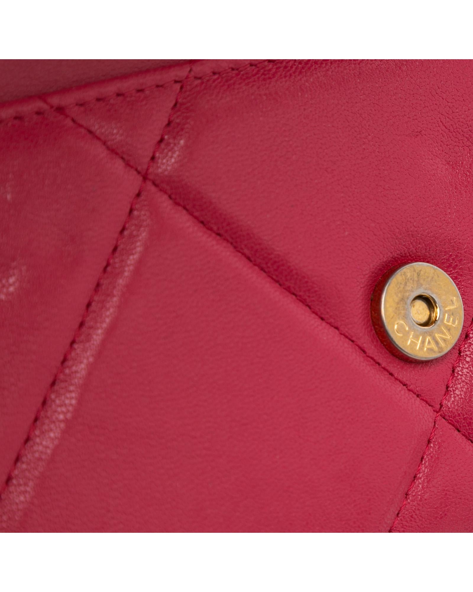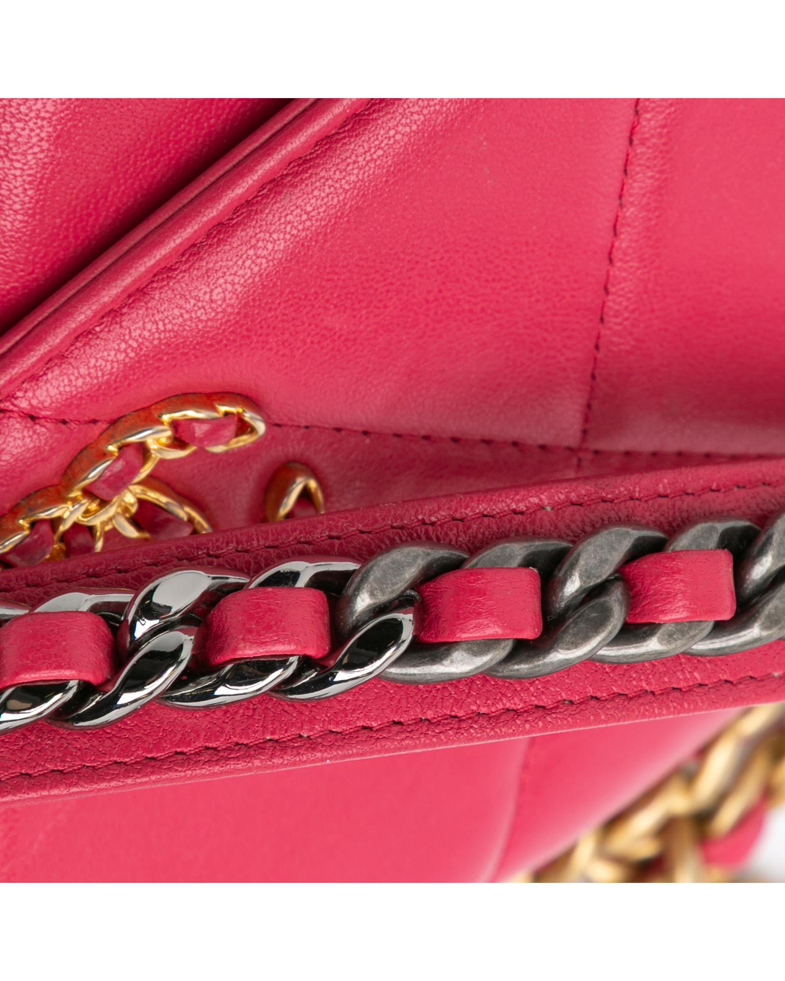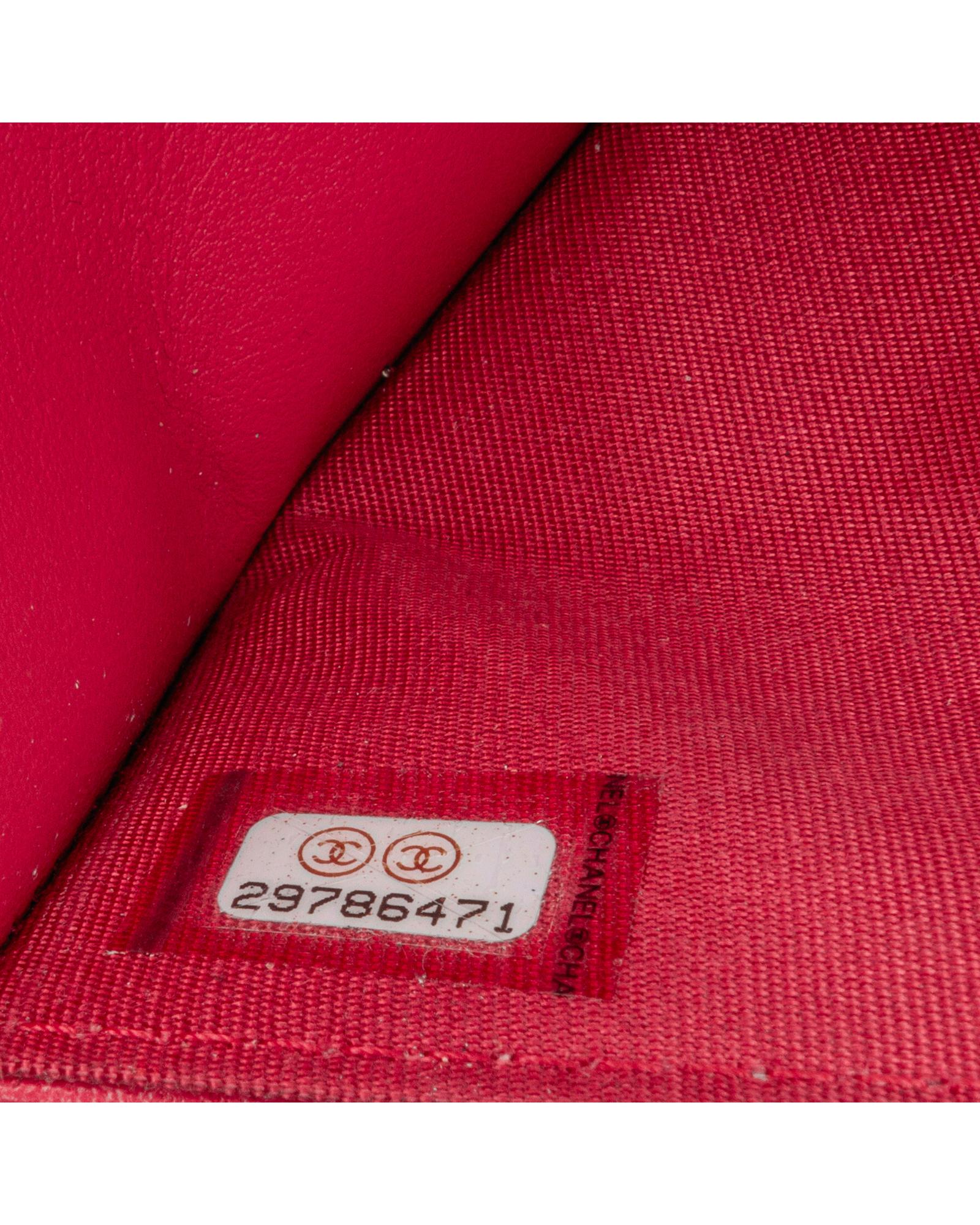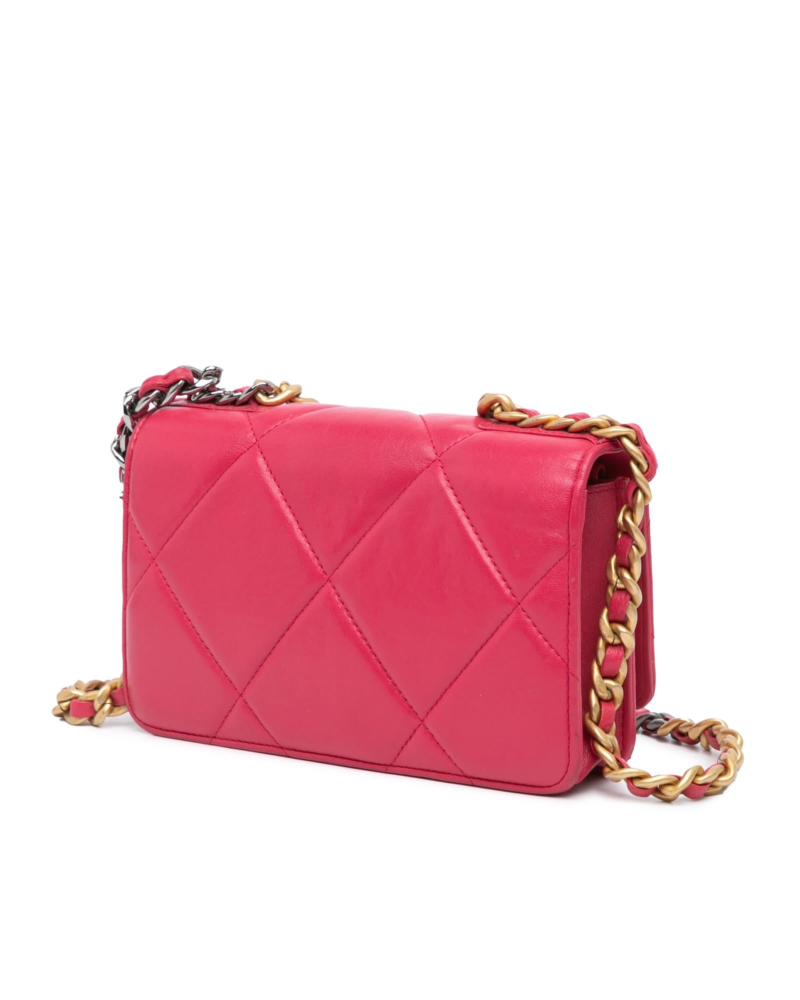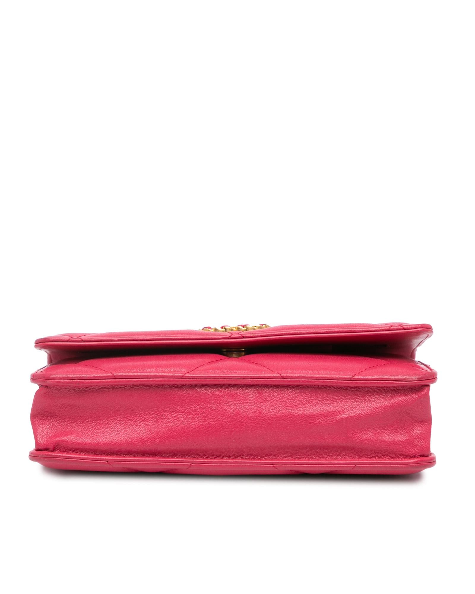 This wallet on chain features a quilted lambskin leather body a chain-link handle a leather woven chain shoulder strap with leather guard a flap with magnetic closure and interior zip and slip pockets.Brand: Chanel