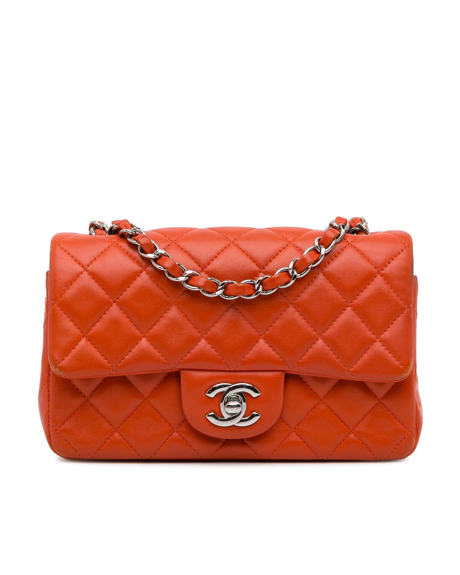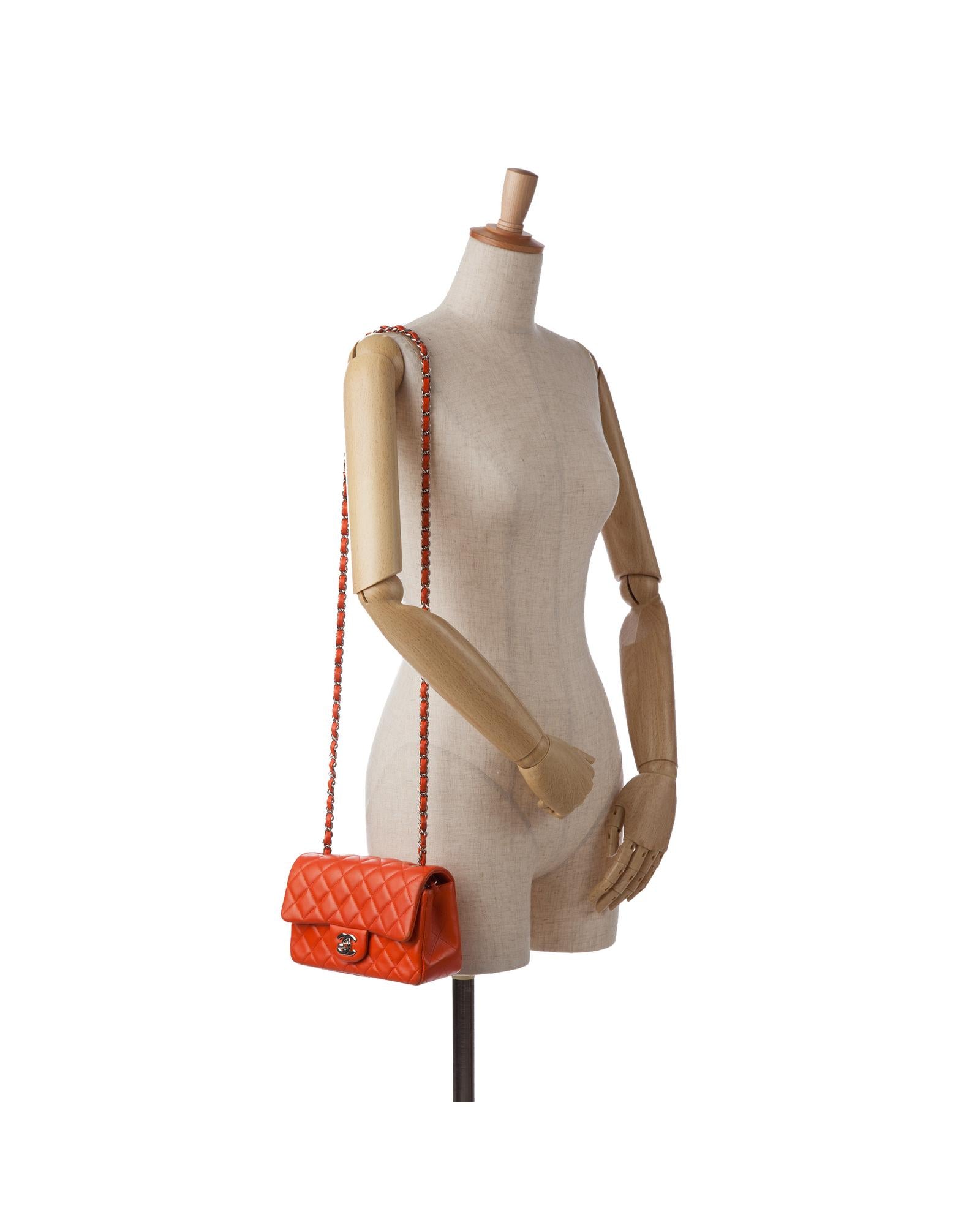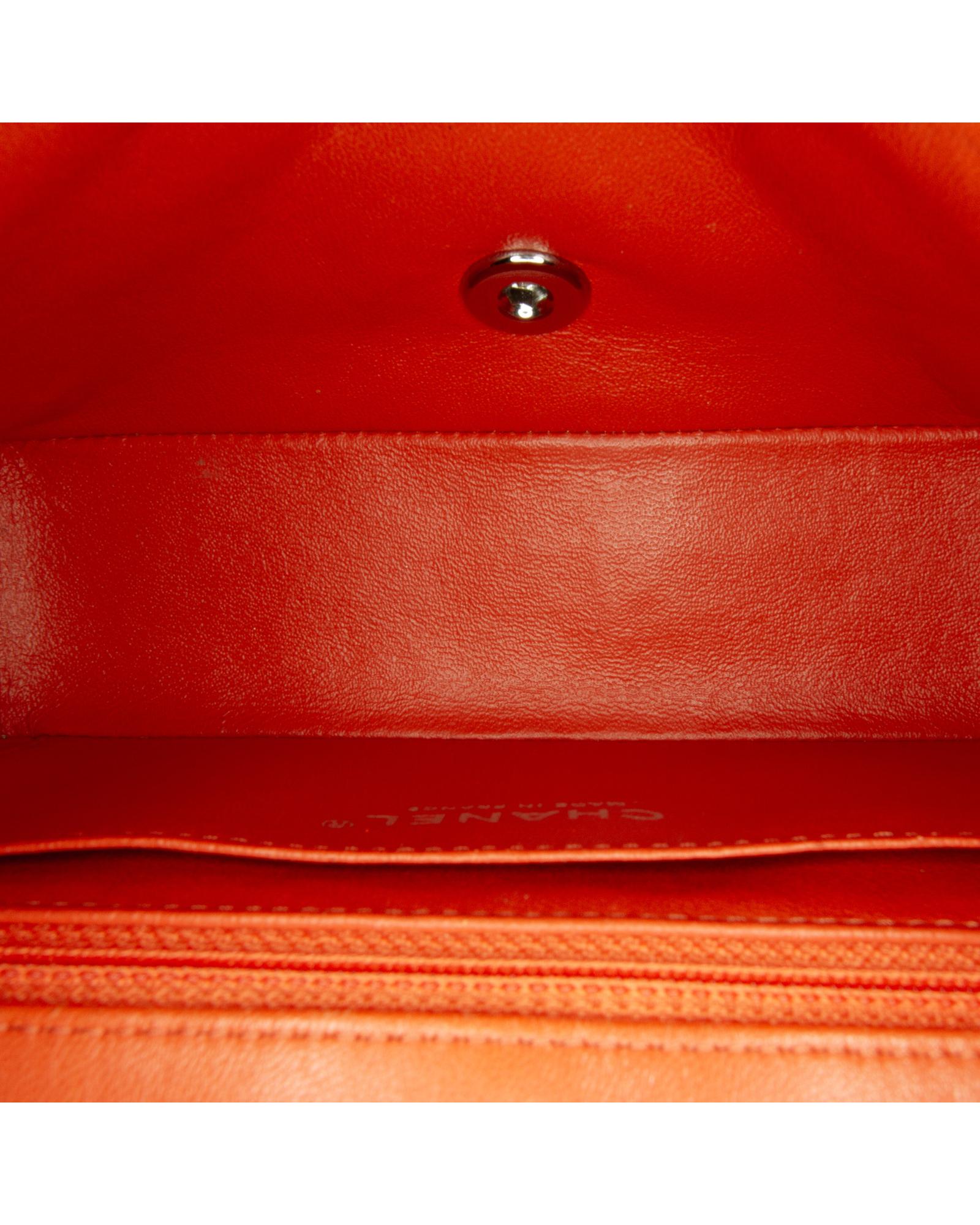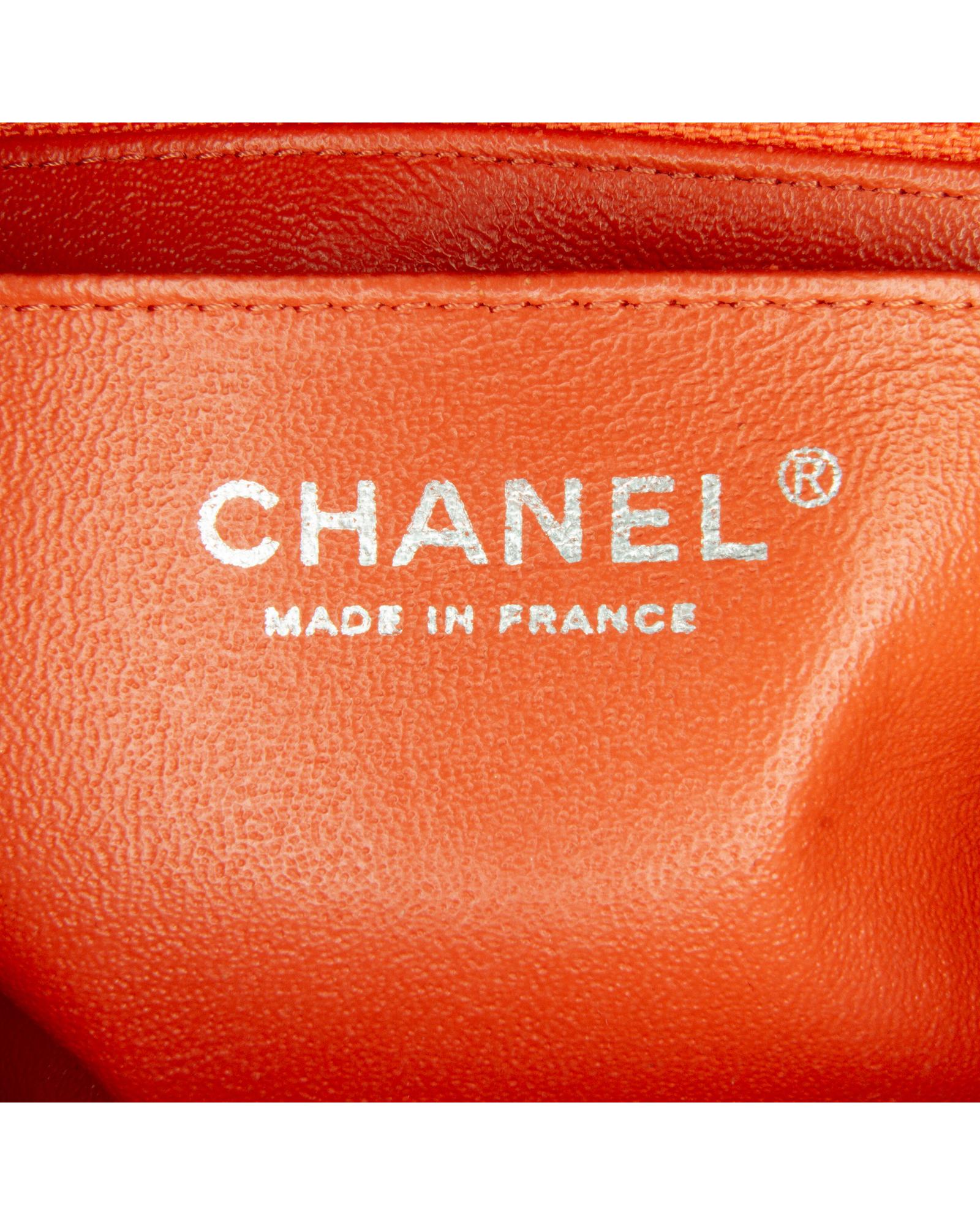 This flap bag features a quilted lambskin body a leather woven chain shoulder strap a front flap with a twist lock closure an exterior back slip pocket and interior zip and slip pockets.Brand: Chanel