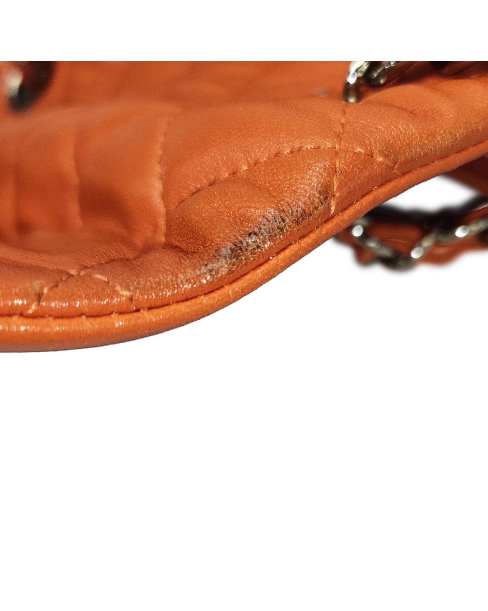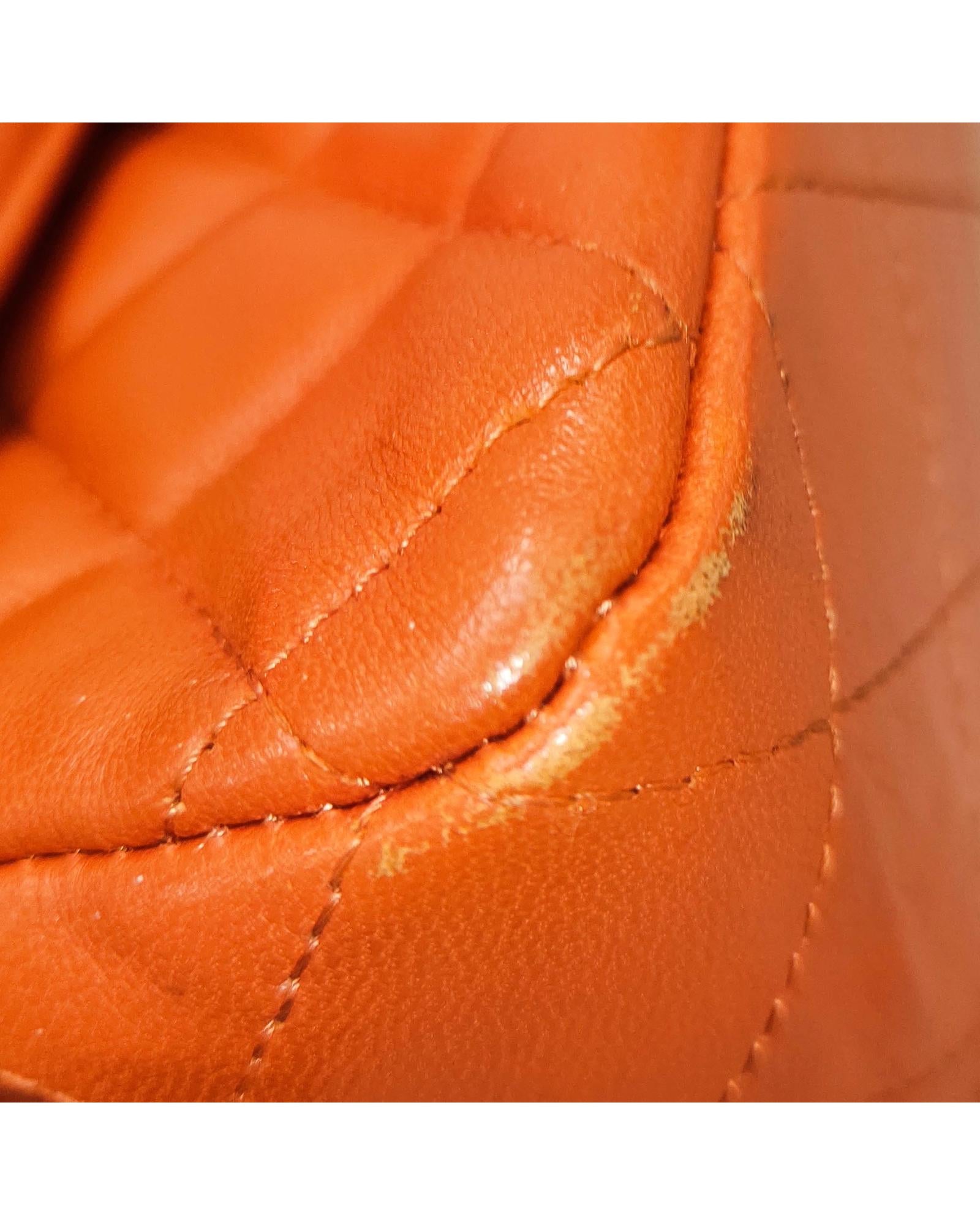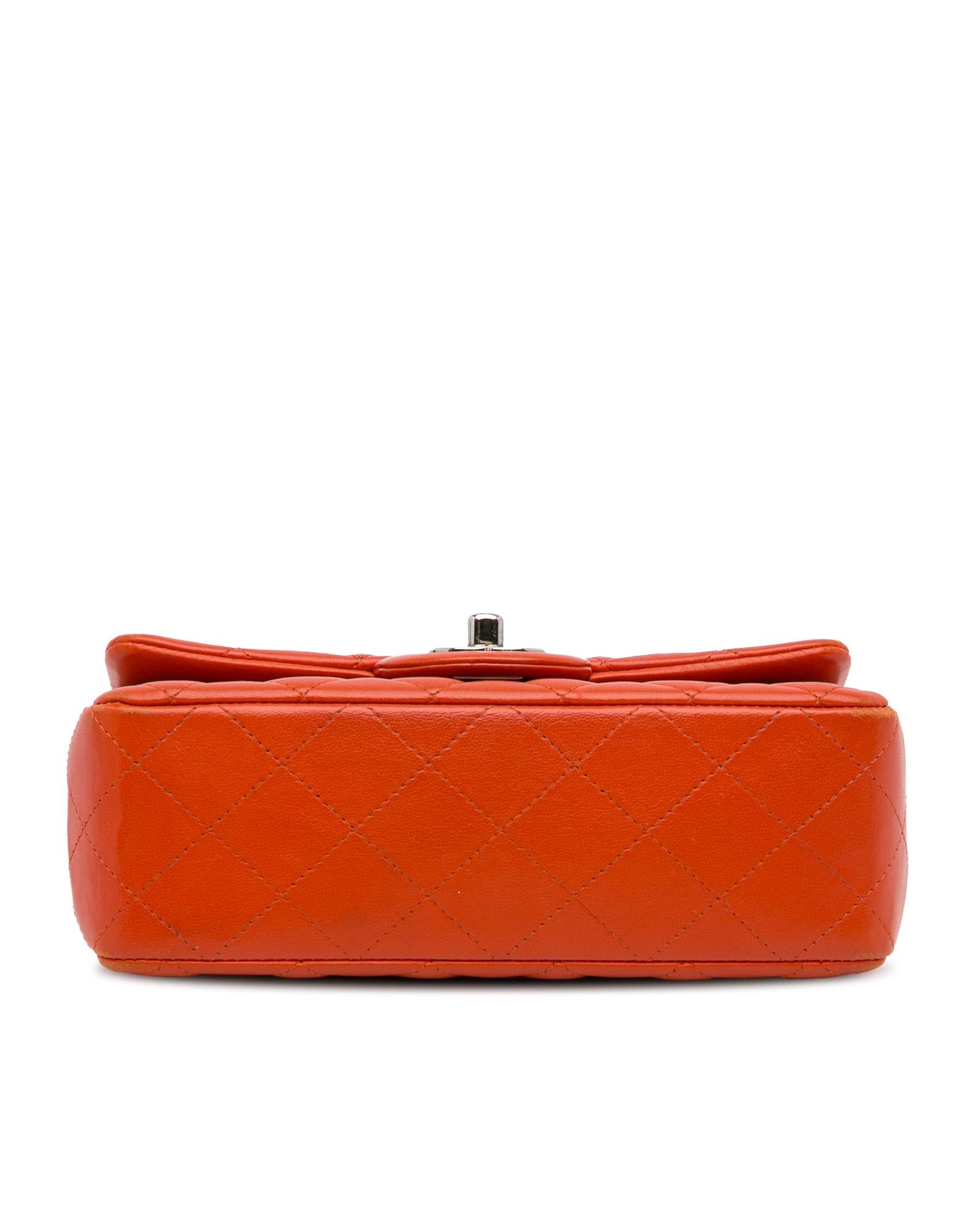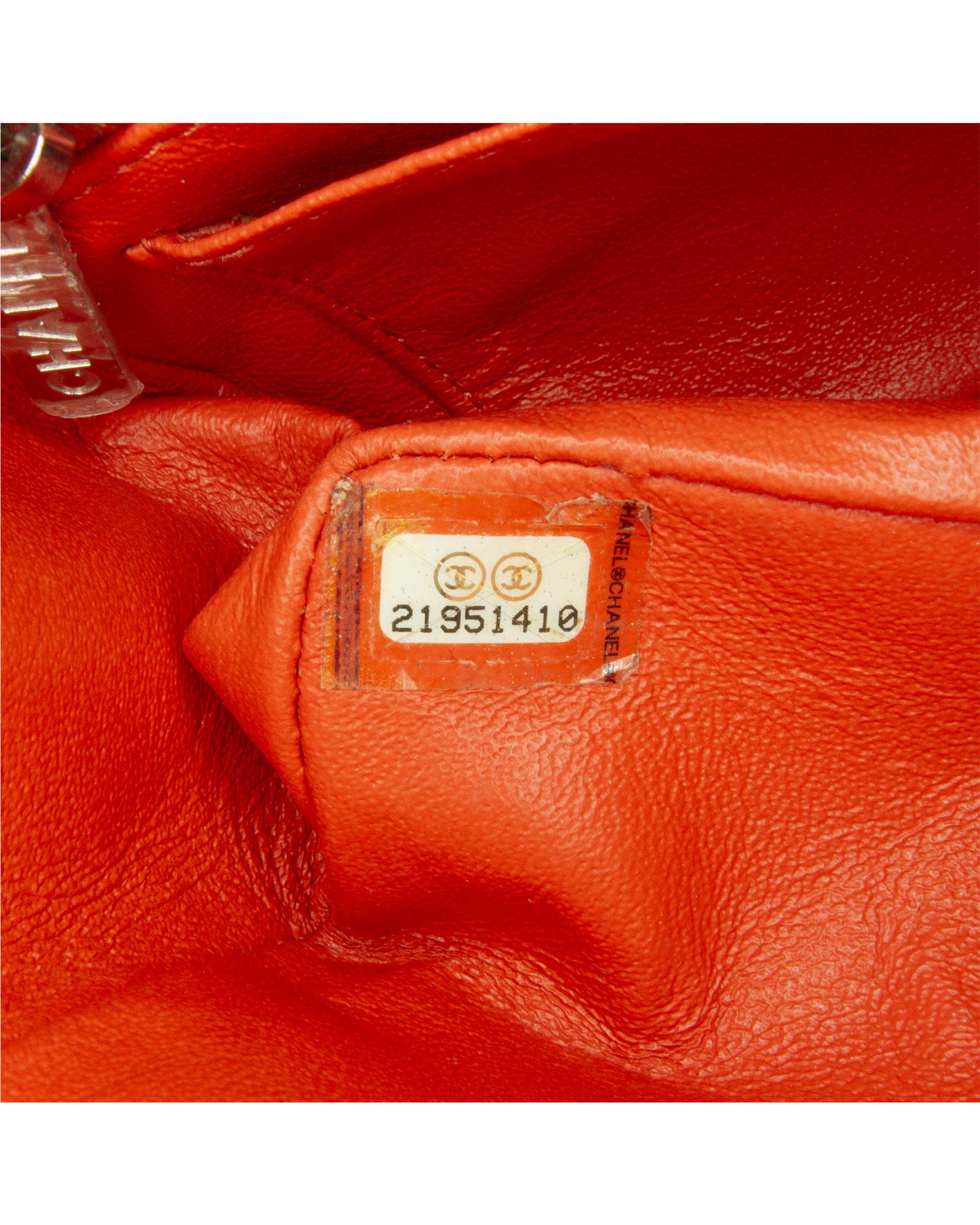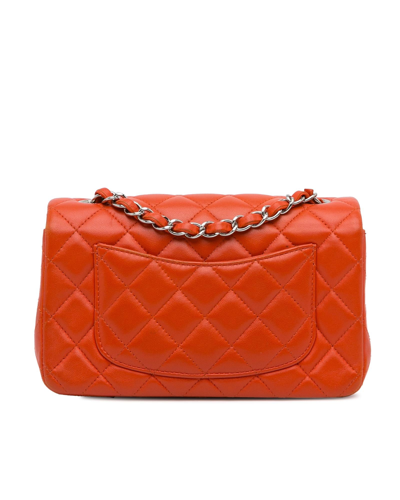 This flap bag features a quilted lambskin body a leather woven chain shoulder strap a front flap with a twist lock closure an exterior back slip pocket and interior zip and slip pockets.Brand: Chanel