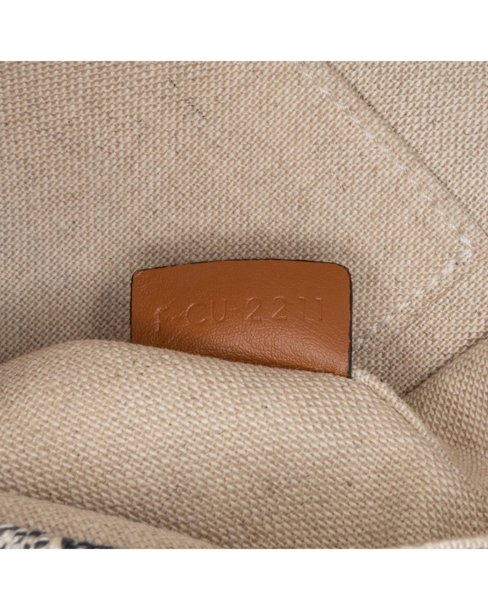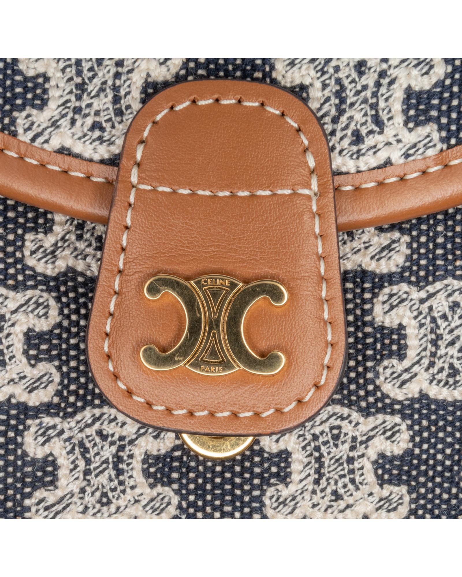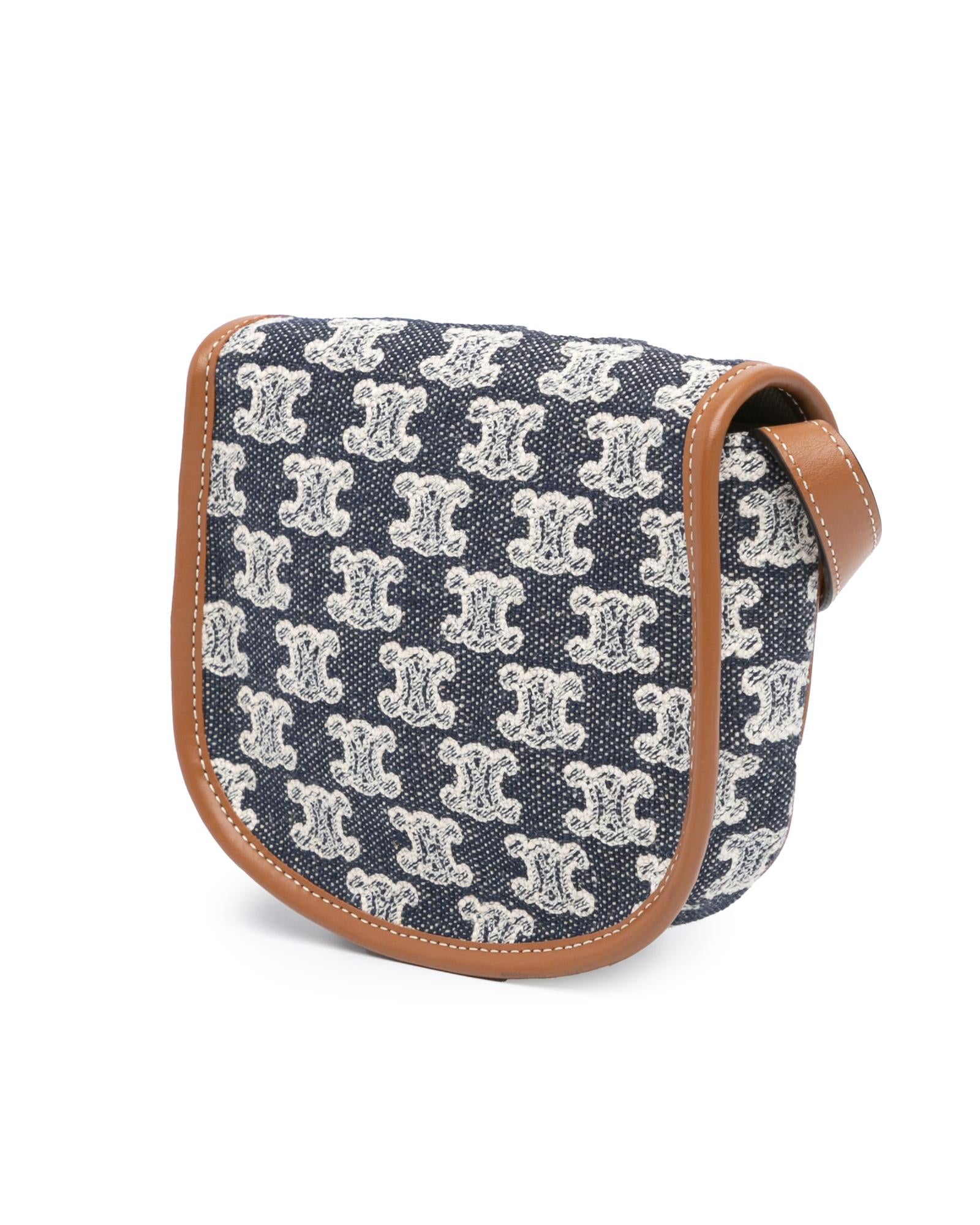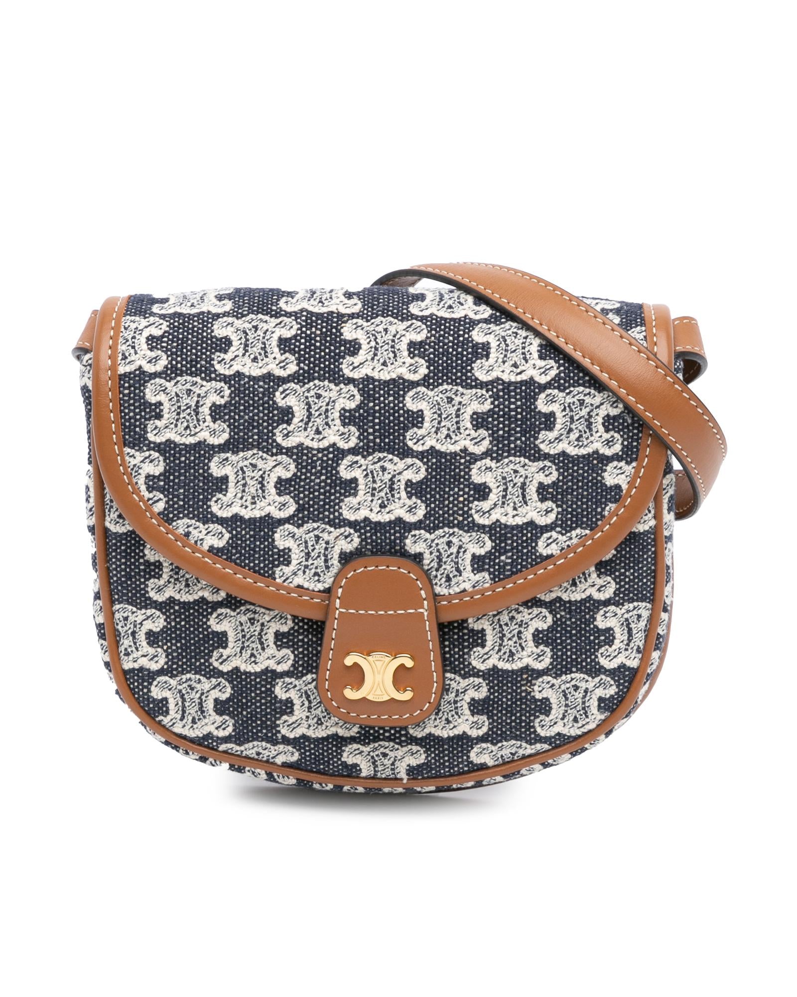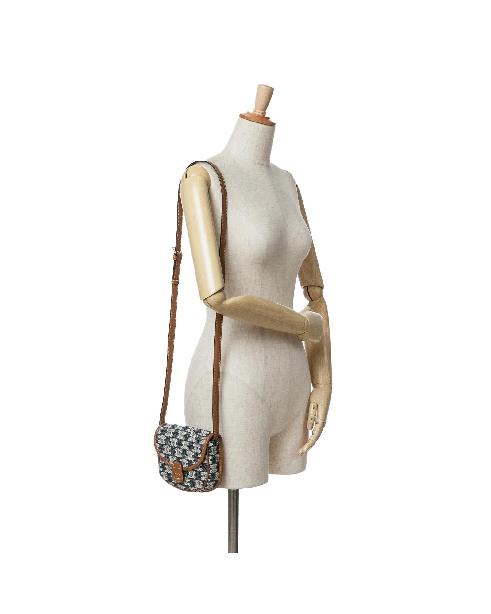 This crossbody bag features an embroidered canvas body with leather trim an adjustable flat leather shoulder strap a front flap with magnetic snap closure and an interior slip pocket.