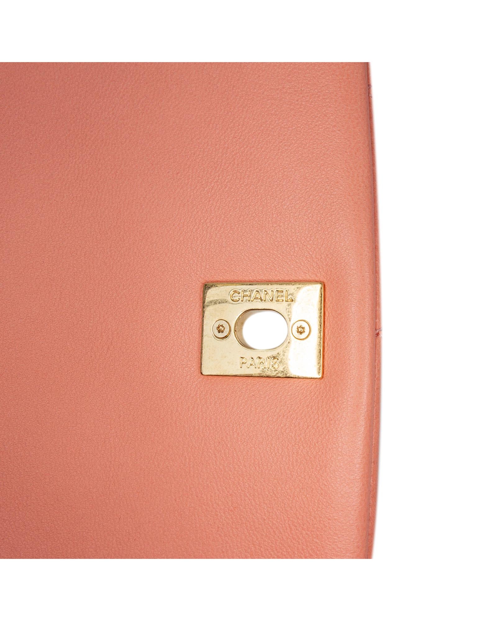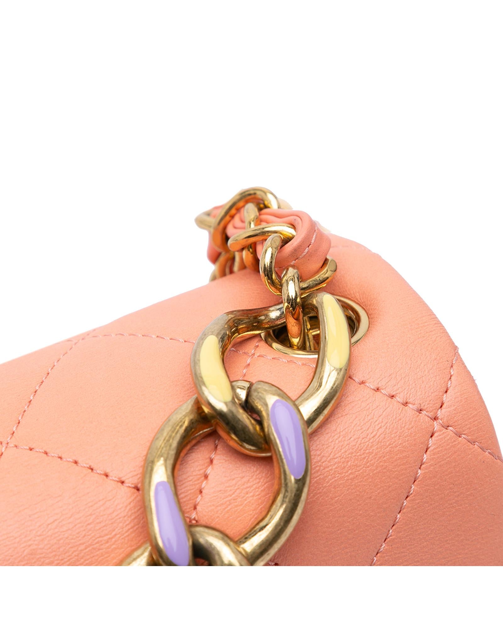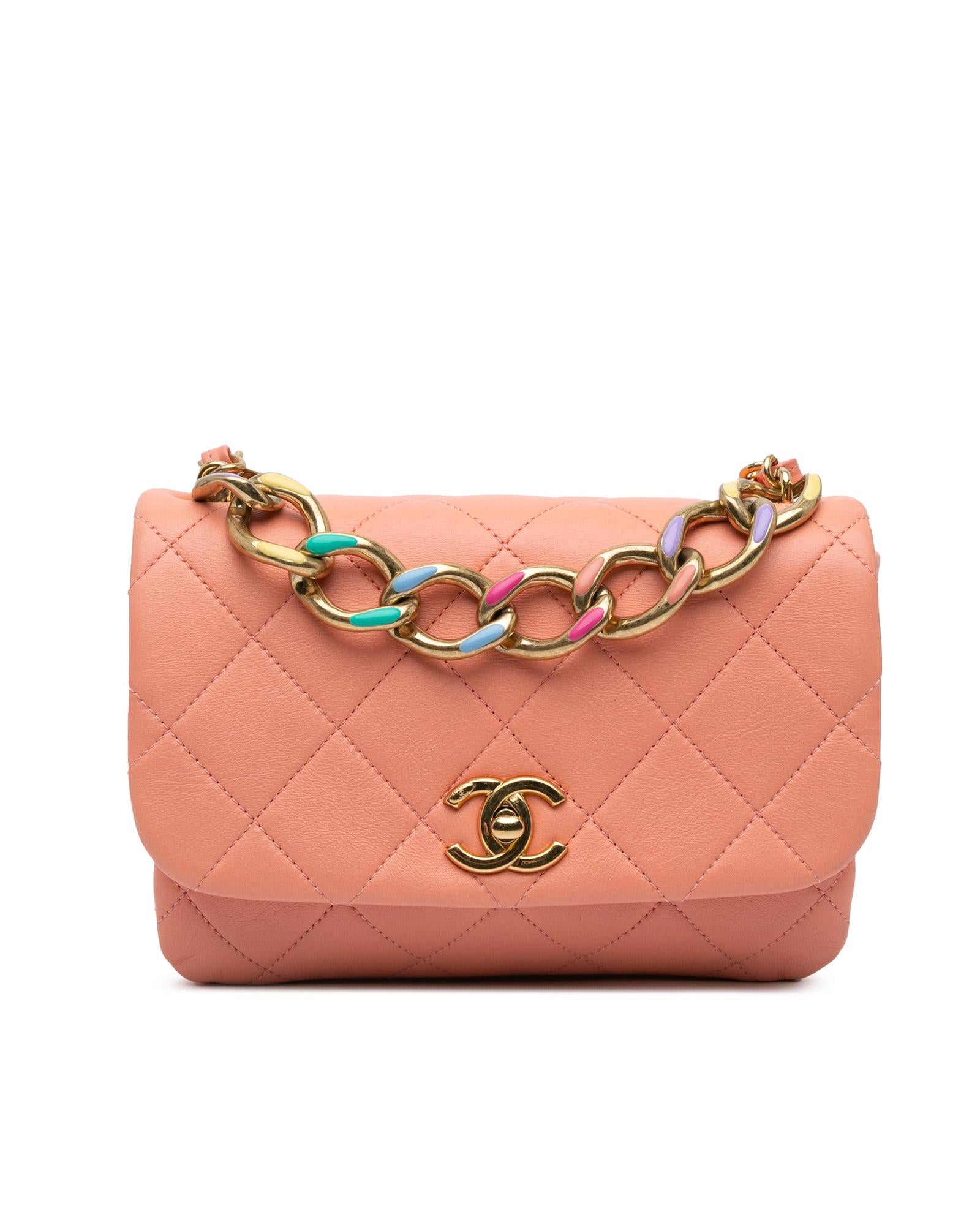 This satchel features a quilted lambskin leather body a chain link top handle a leather-woven chain link strap a flap with CC turn-lock closure an exterior back slip pocket and an interior zip pocket.