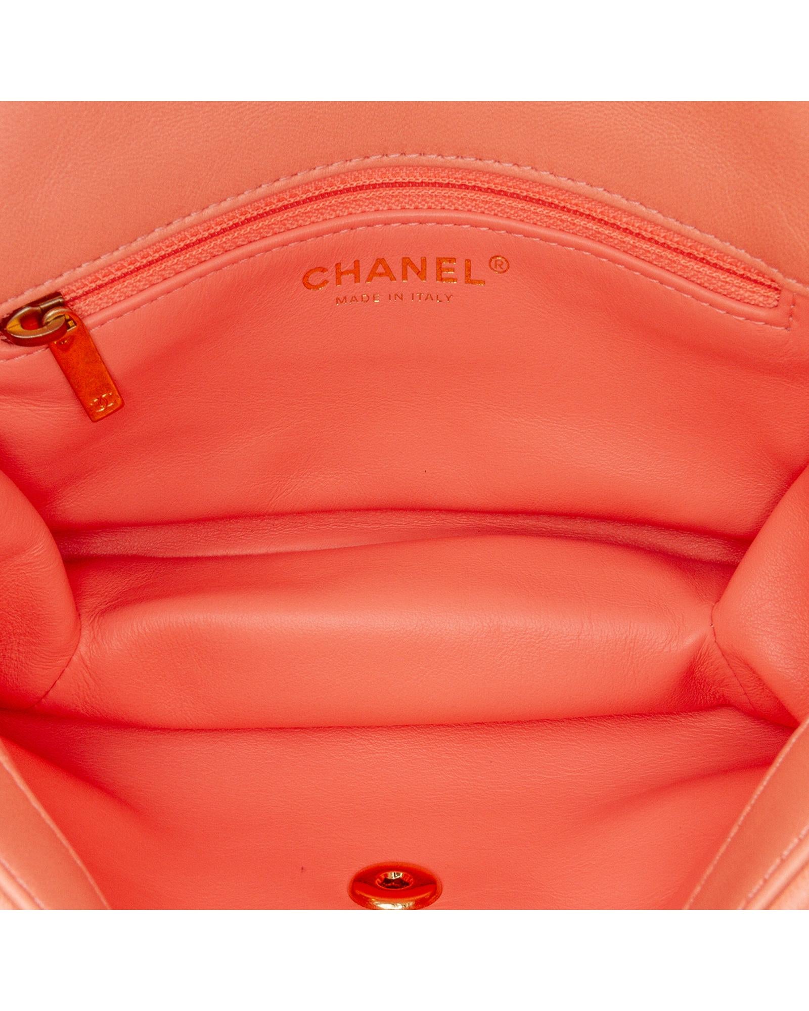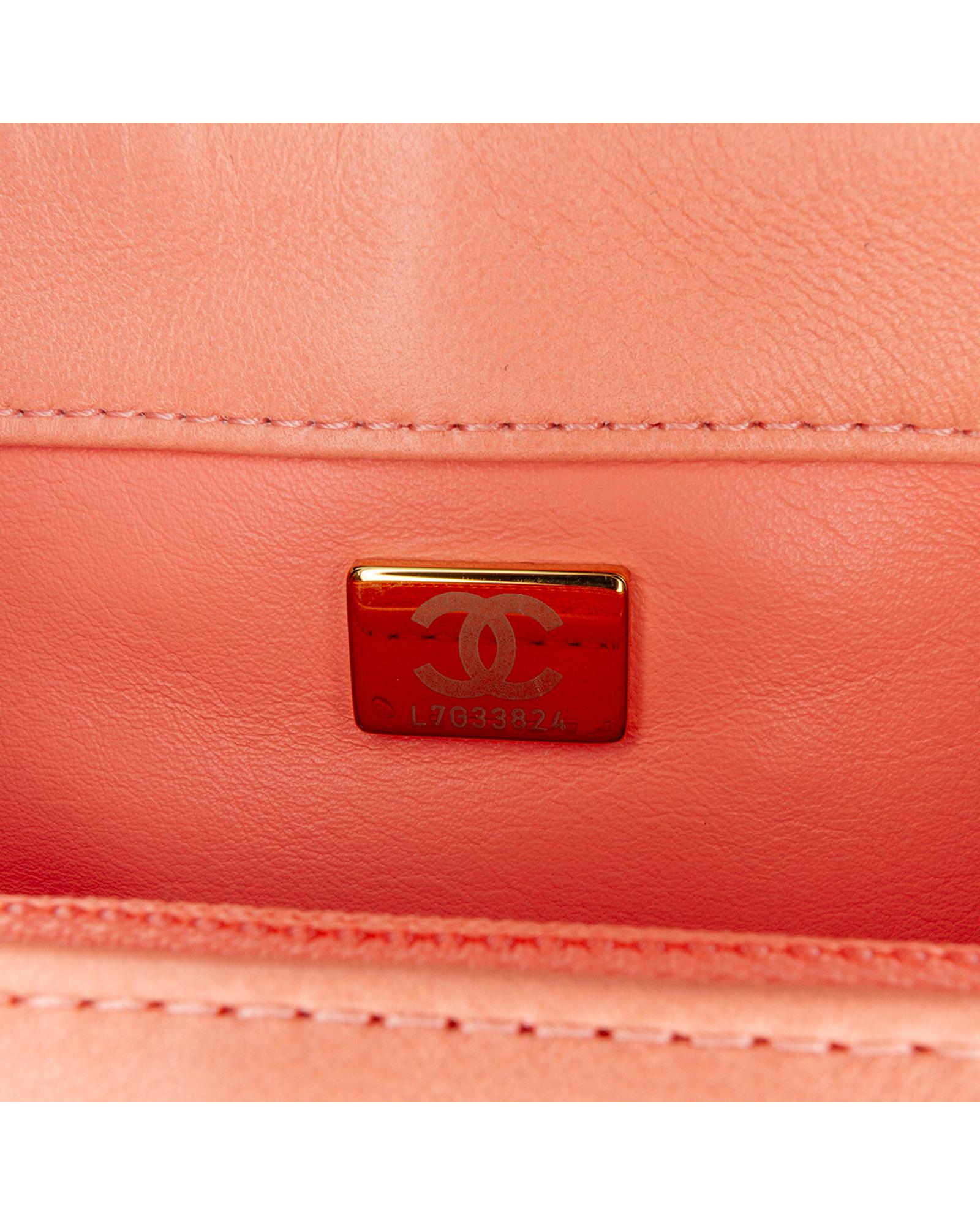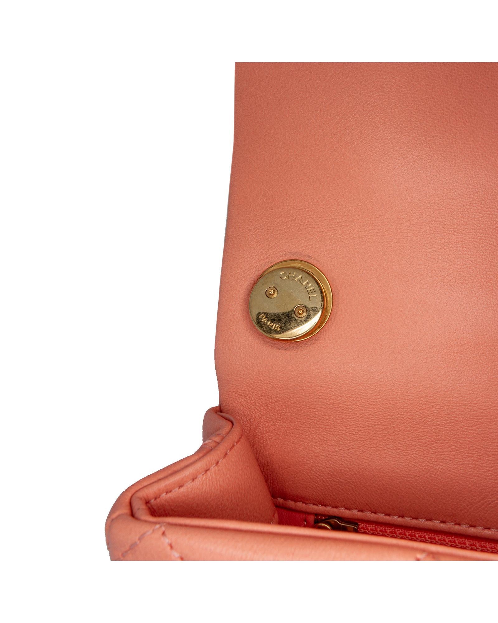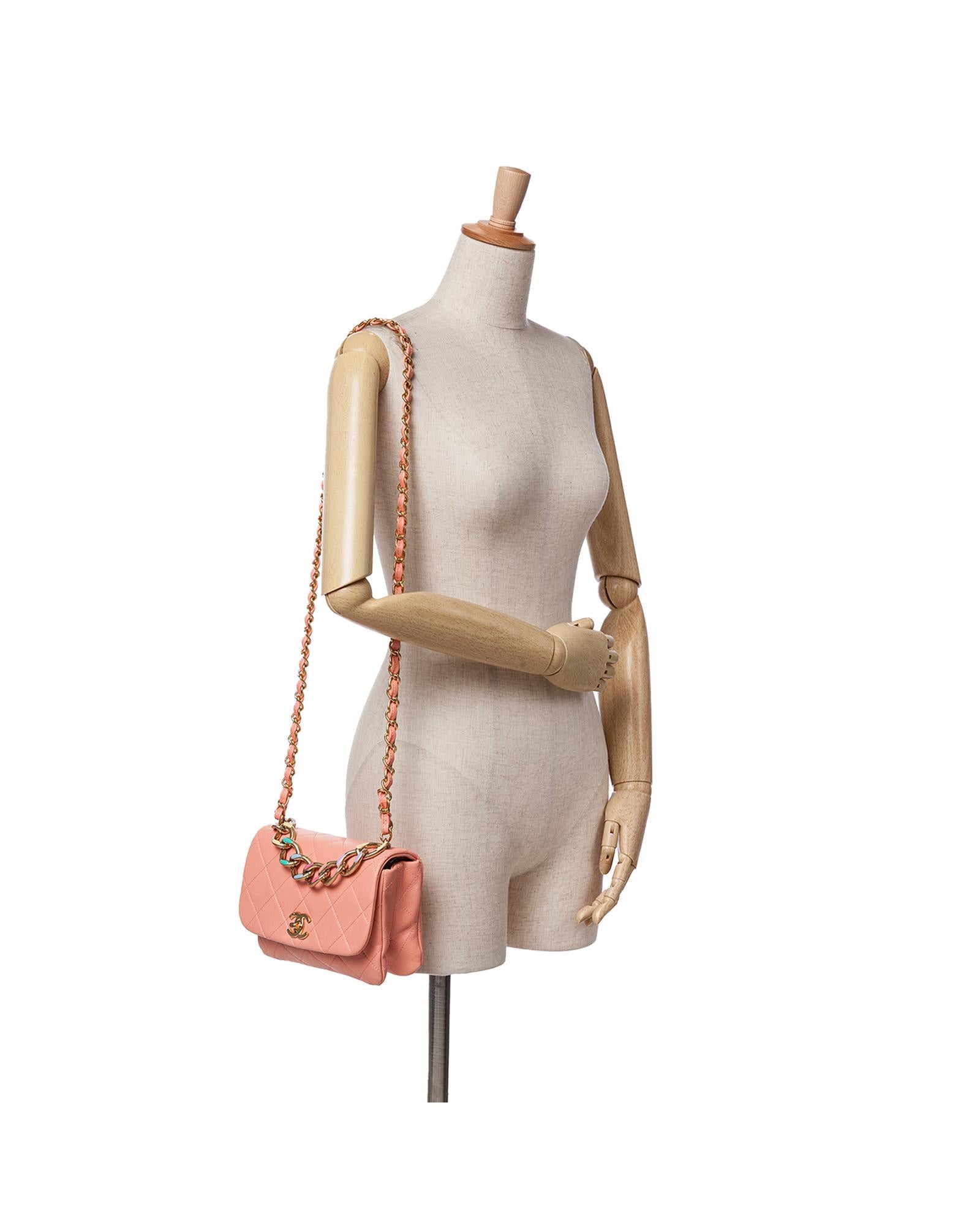 This satchel features a quilted lambskin leather body a chain link top handle a leather-woven chain link strap a flap with CC turn-lock closure an exterior back slip pocket and an interior zip pocket.