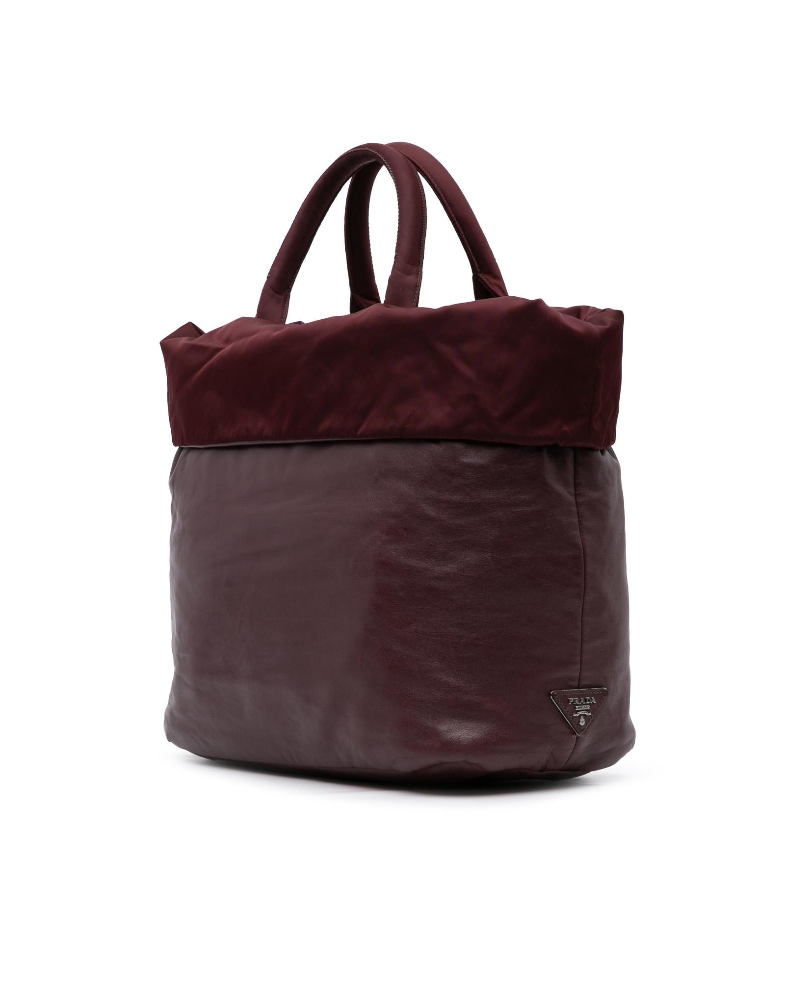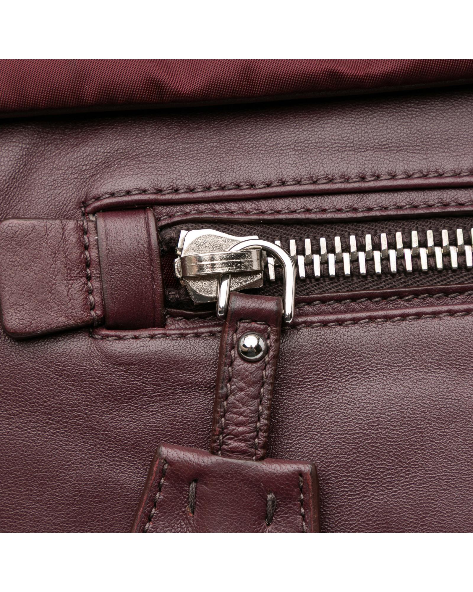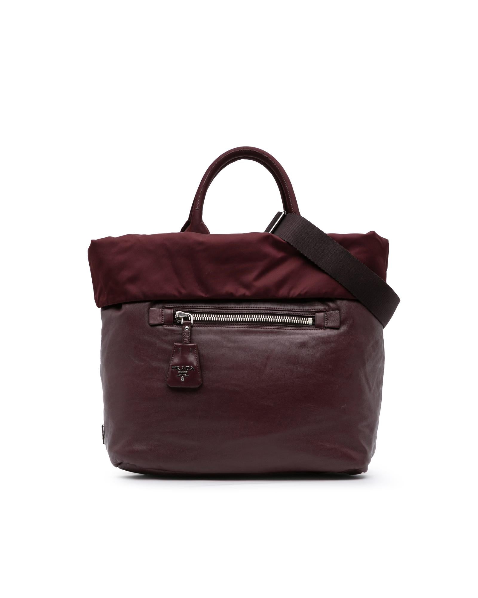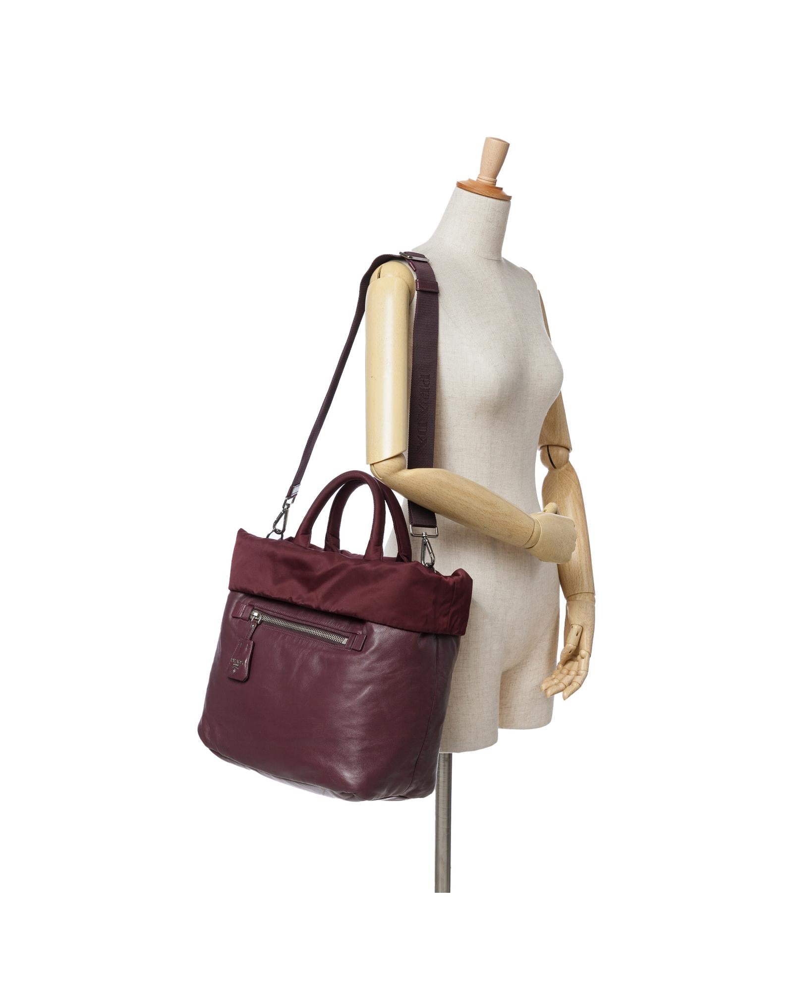 This satchel features a nylon and nappa leather body rolled handles a detachable flat shoulder strap an open top an exterior front zip pocket and an interior zip pocket.
