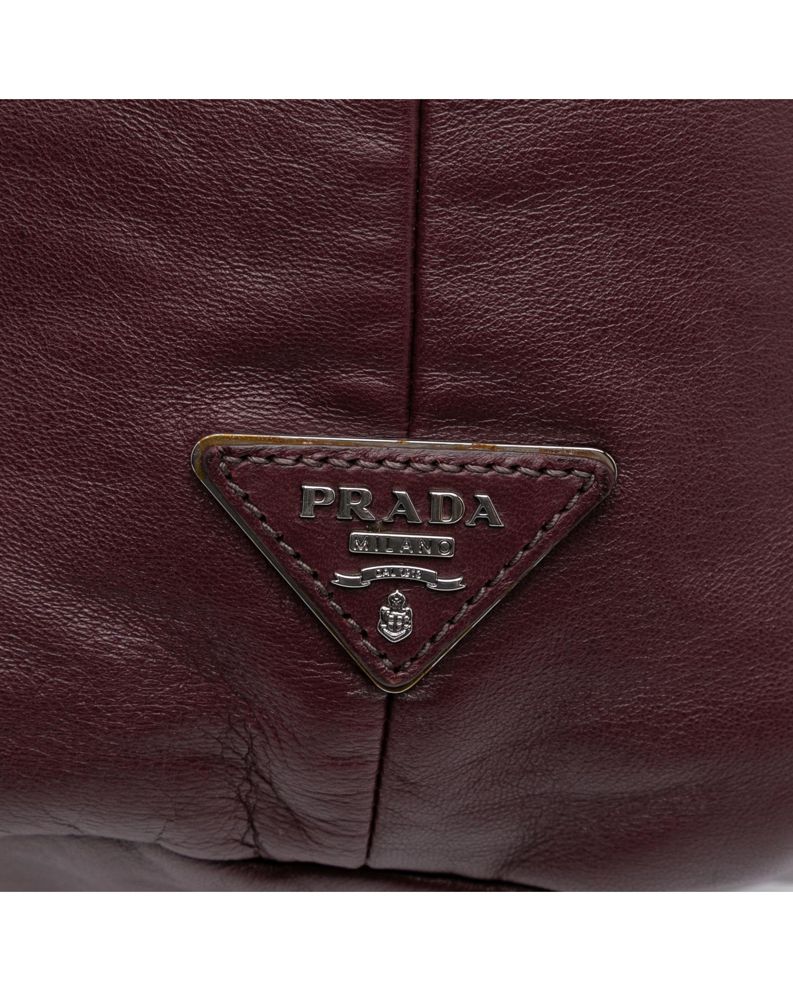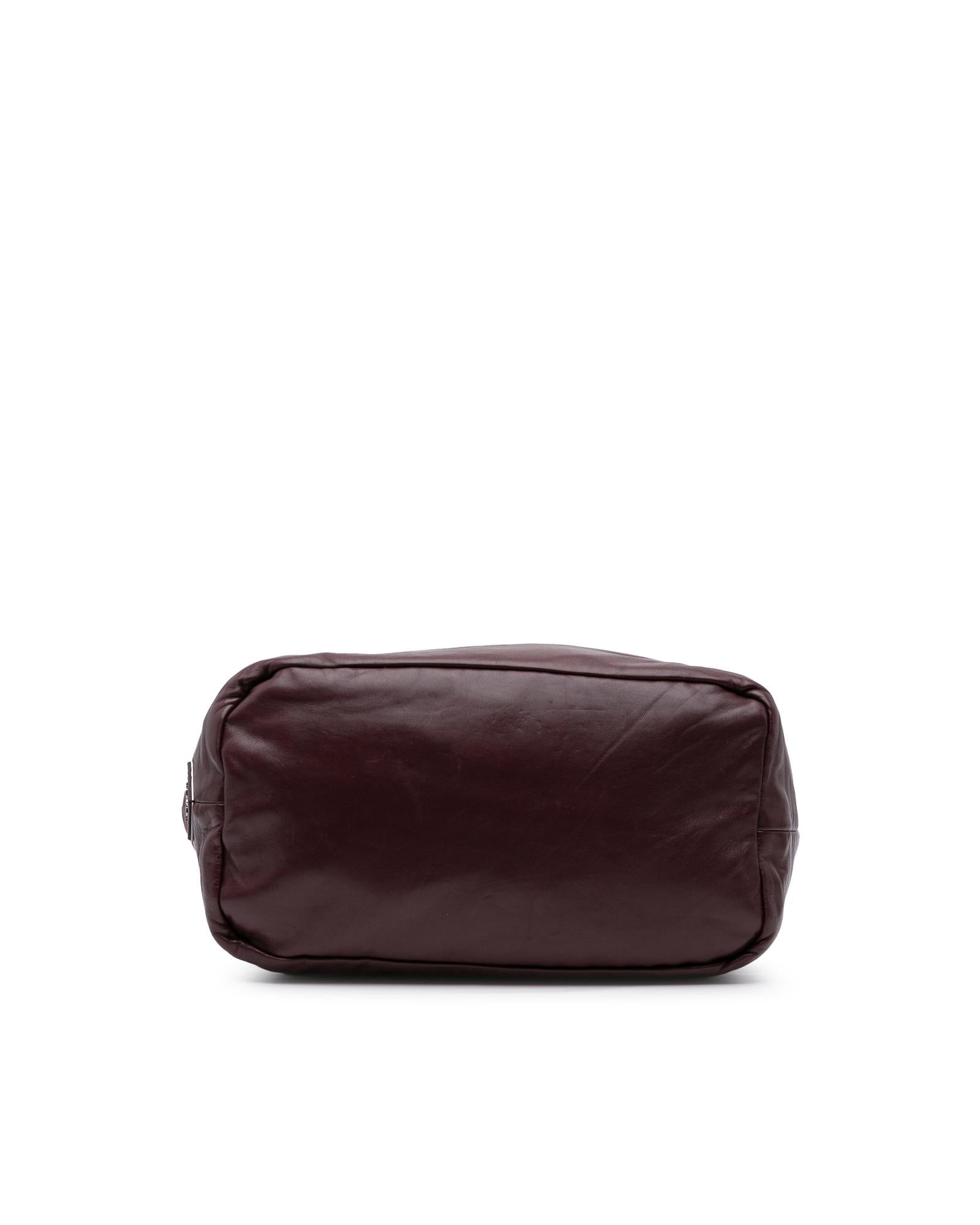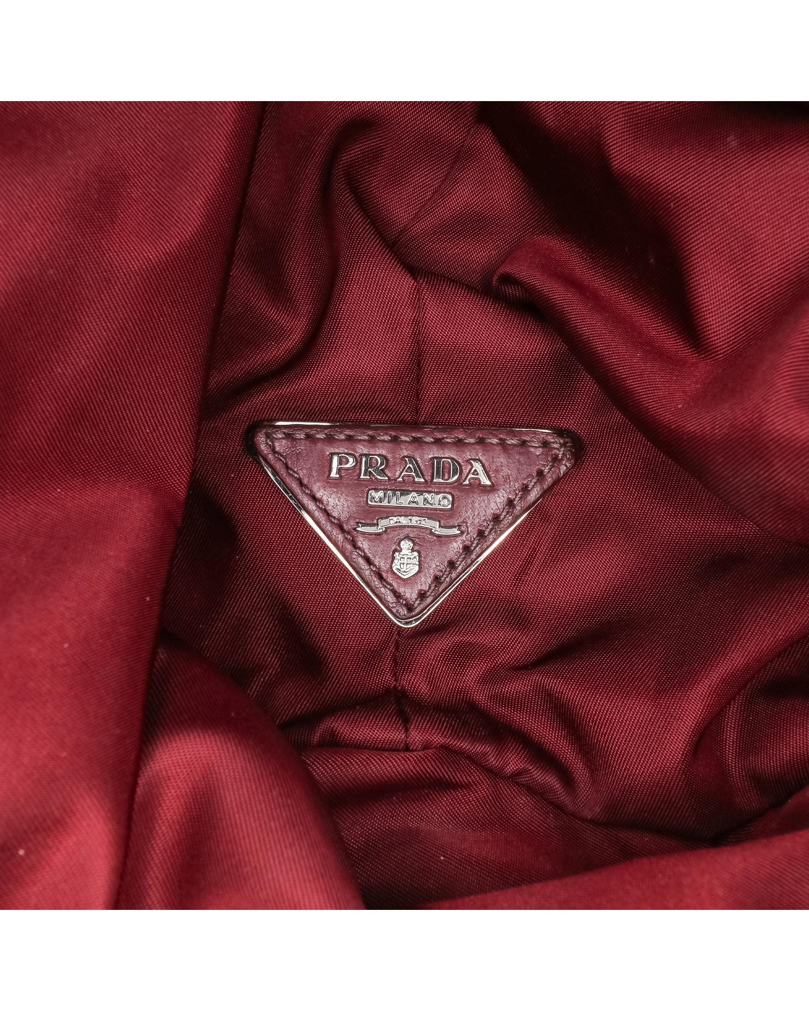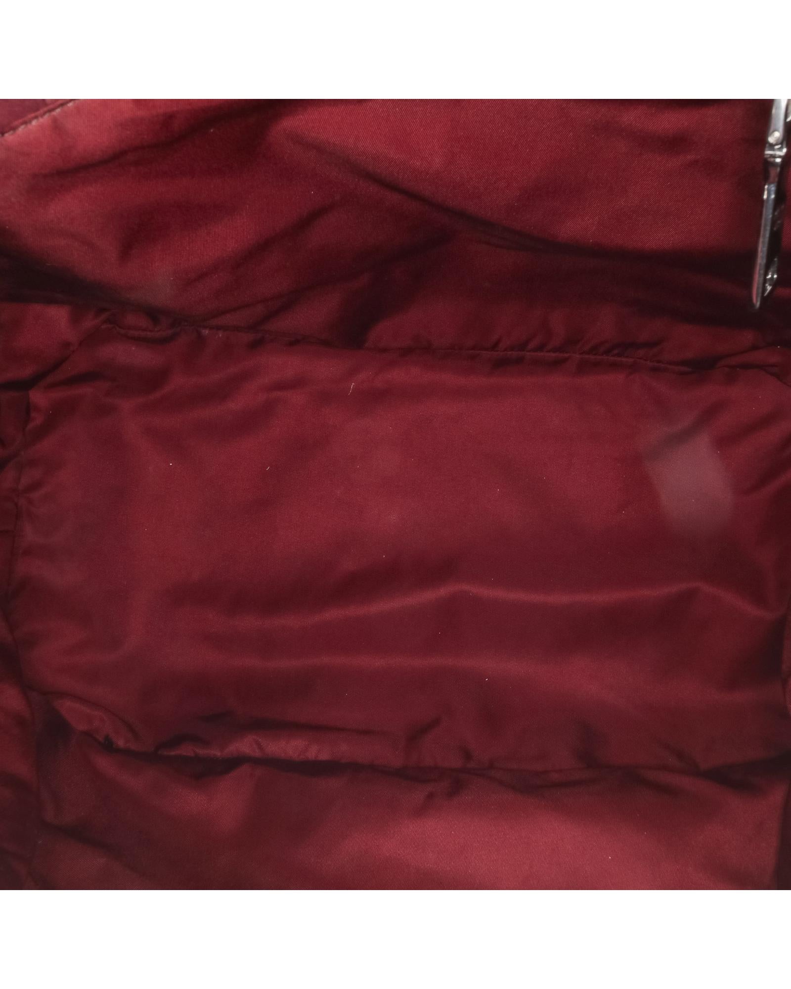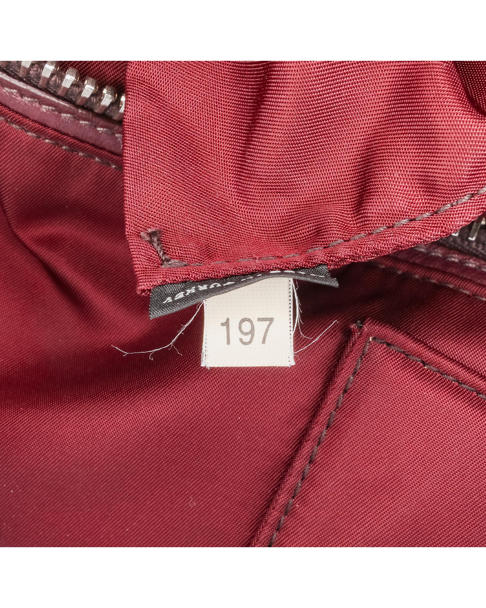 This satchel features a nylon and nappa leather body rolled handles a detachable flat shoulder strap an open top an exterior front zip pocket and an interior zip pocket.