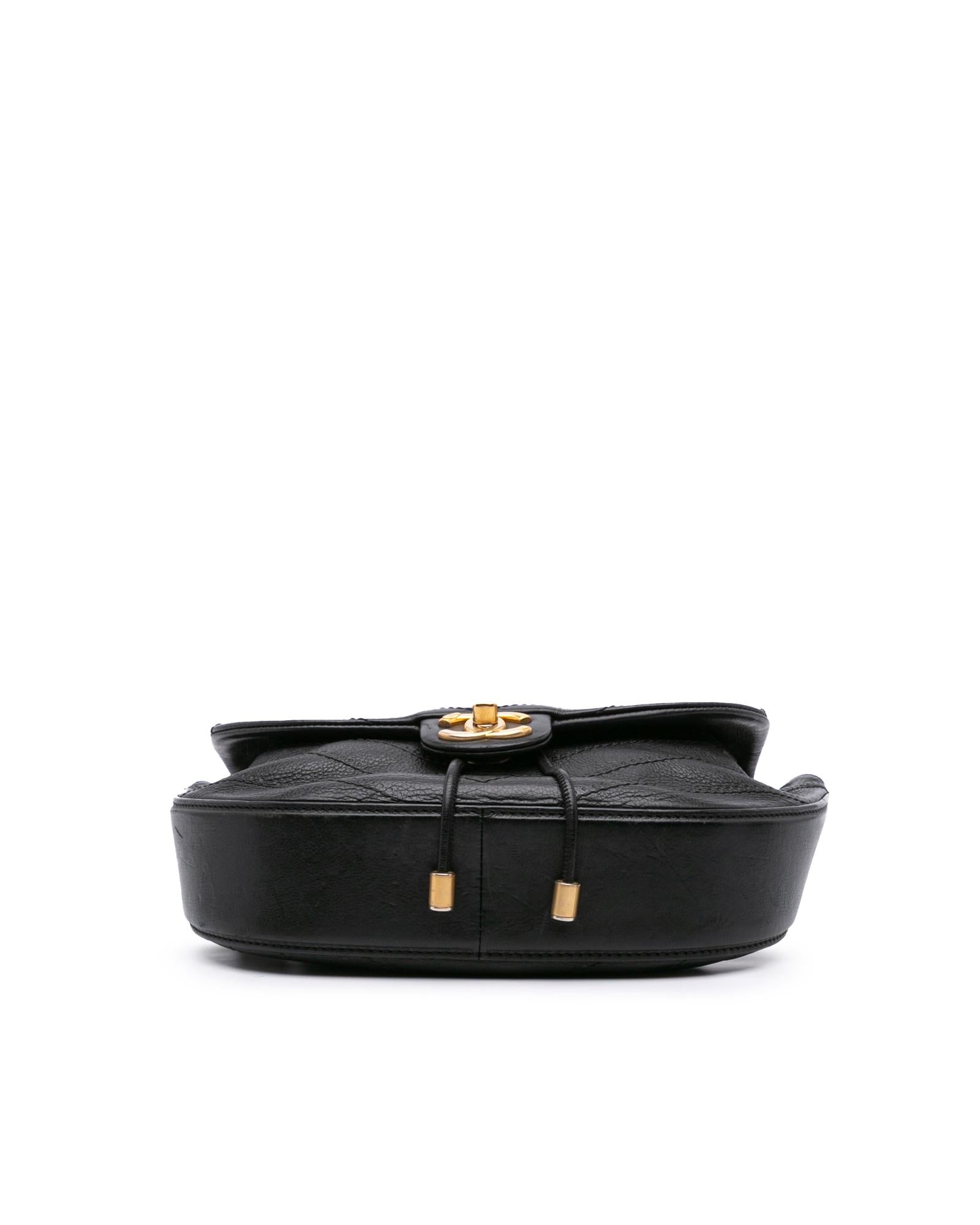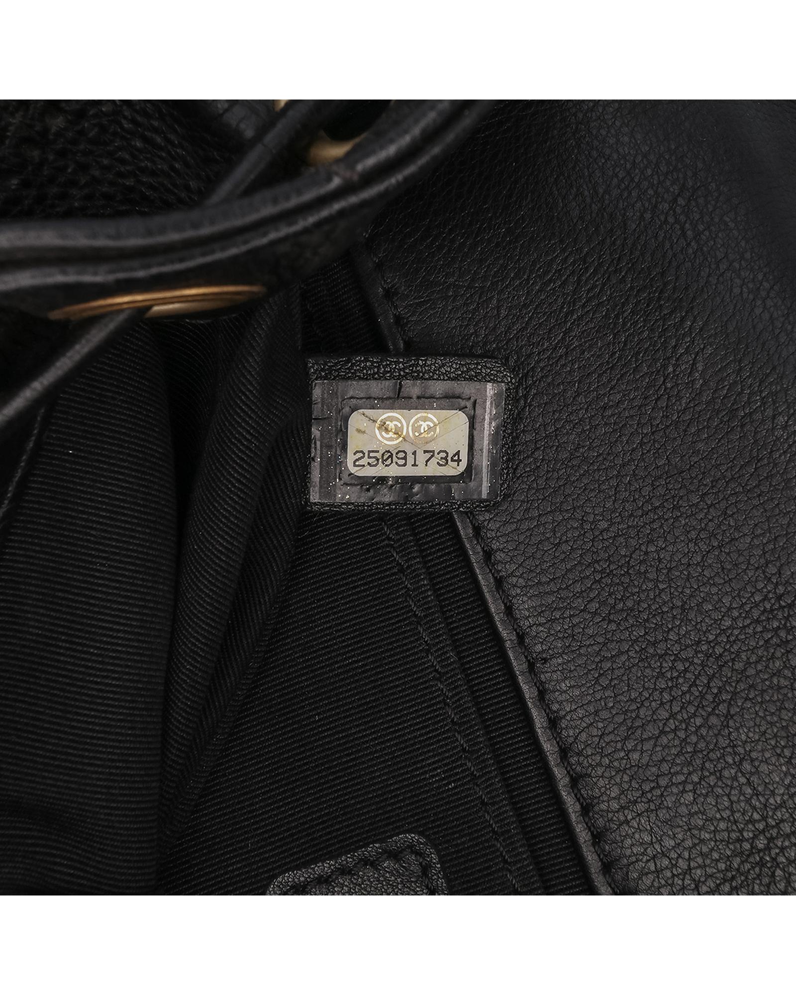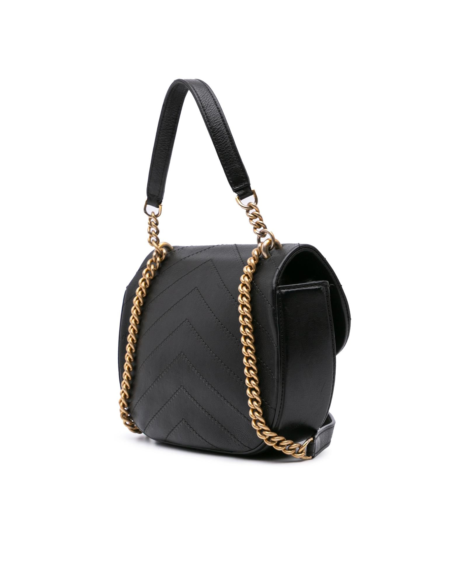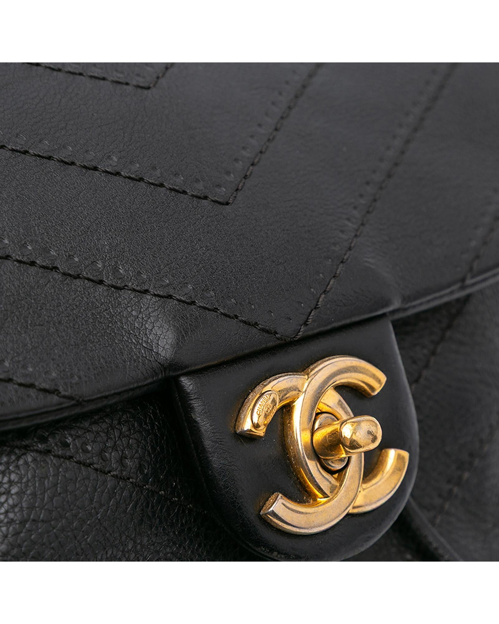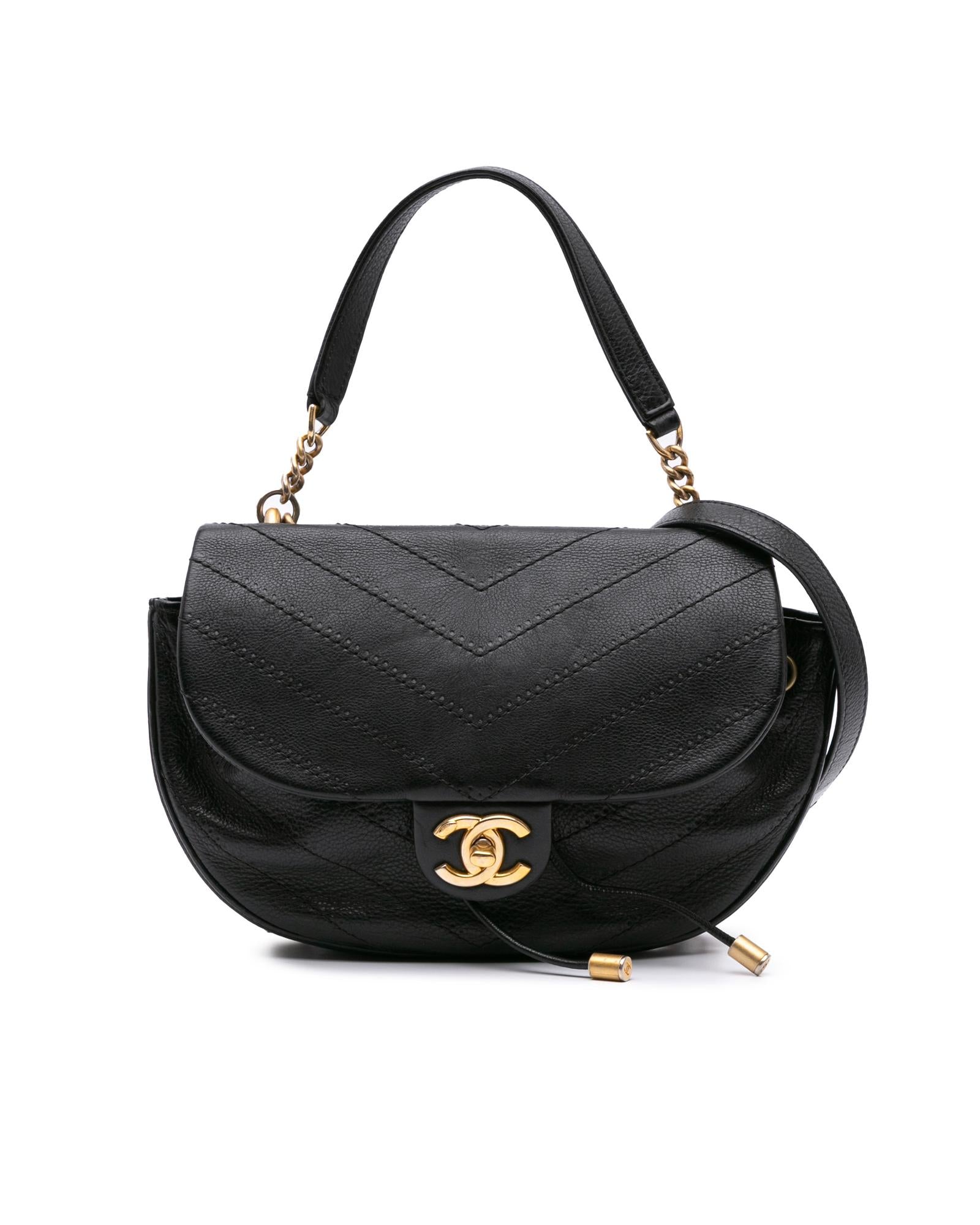 This satchel features a quilted chevron leather body a curb chain handle with leather guard a curb chain shoulder strap with leather guard a drawstring closure a flap with a CC turn lock closure and an interior slip pocket.Brand: Chanel
