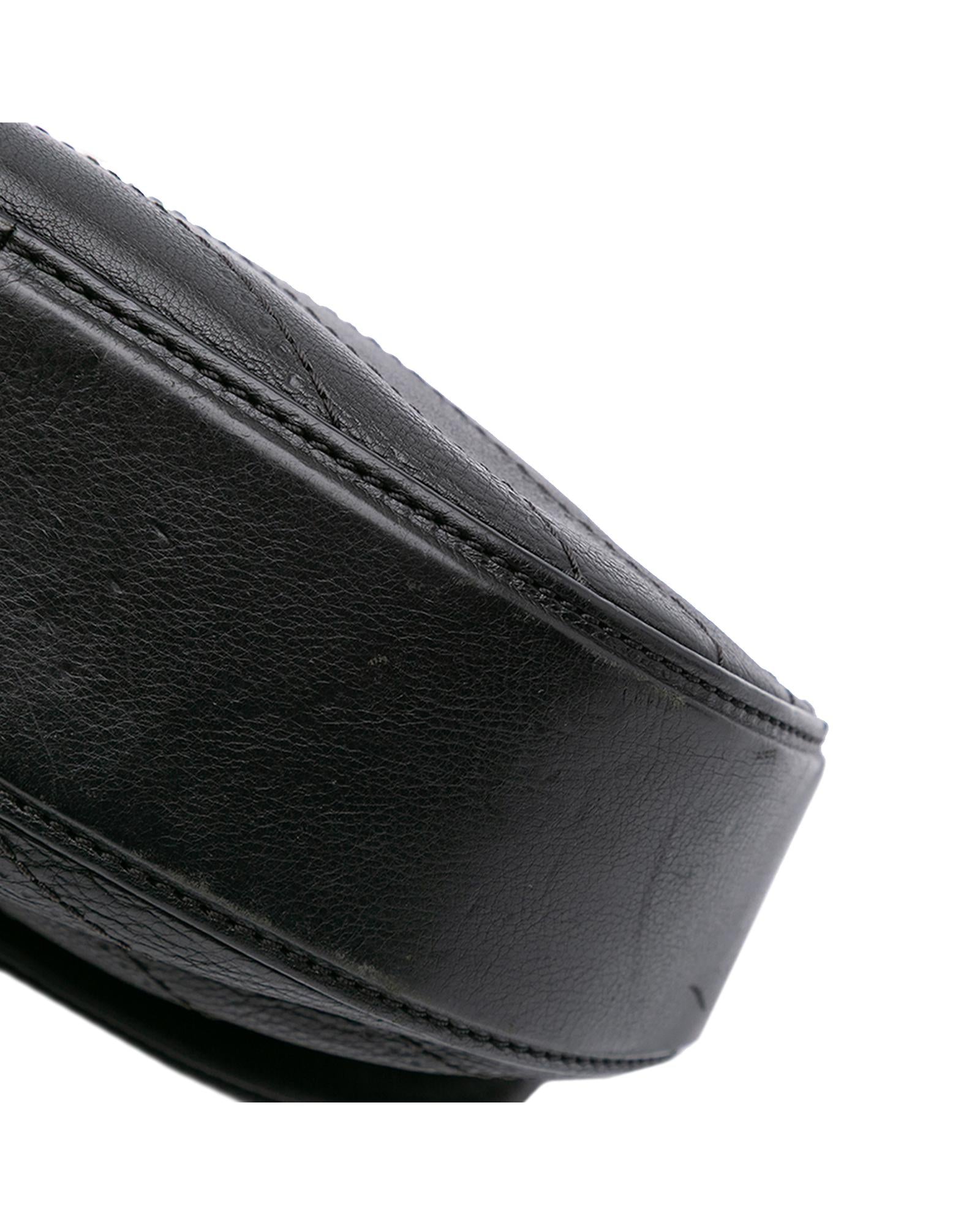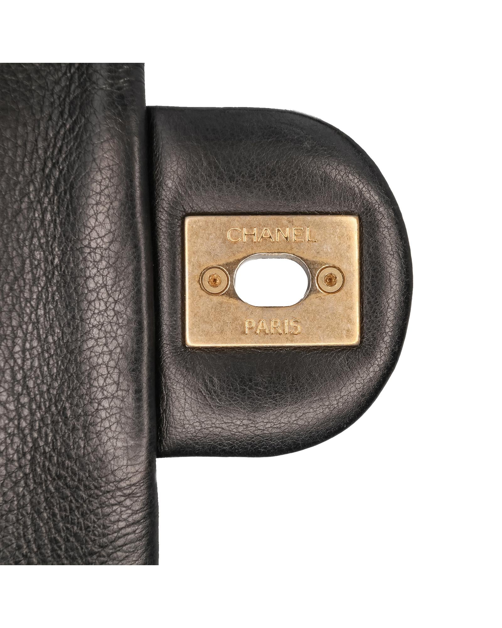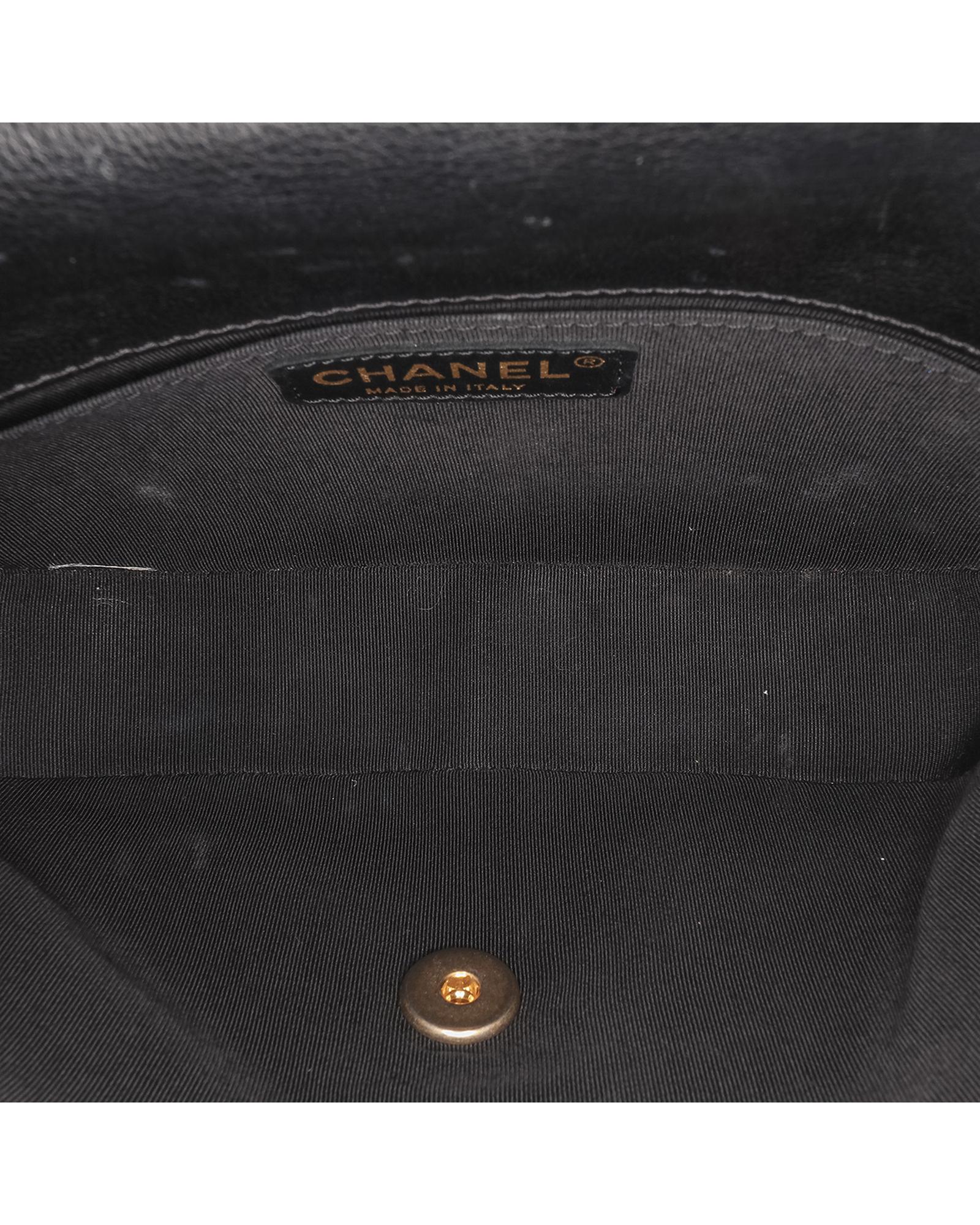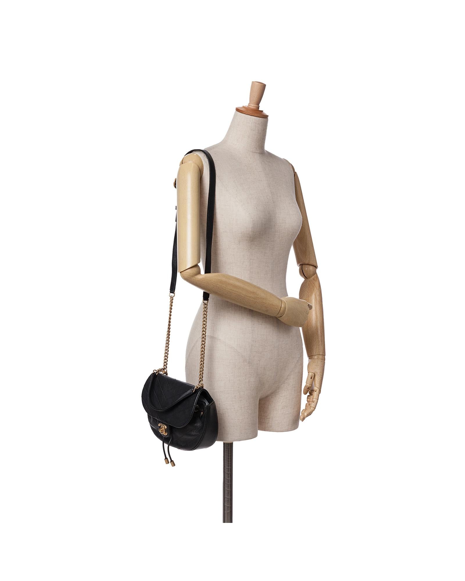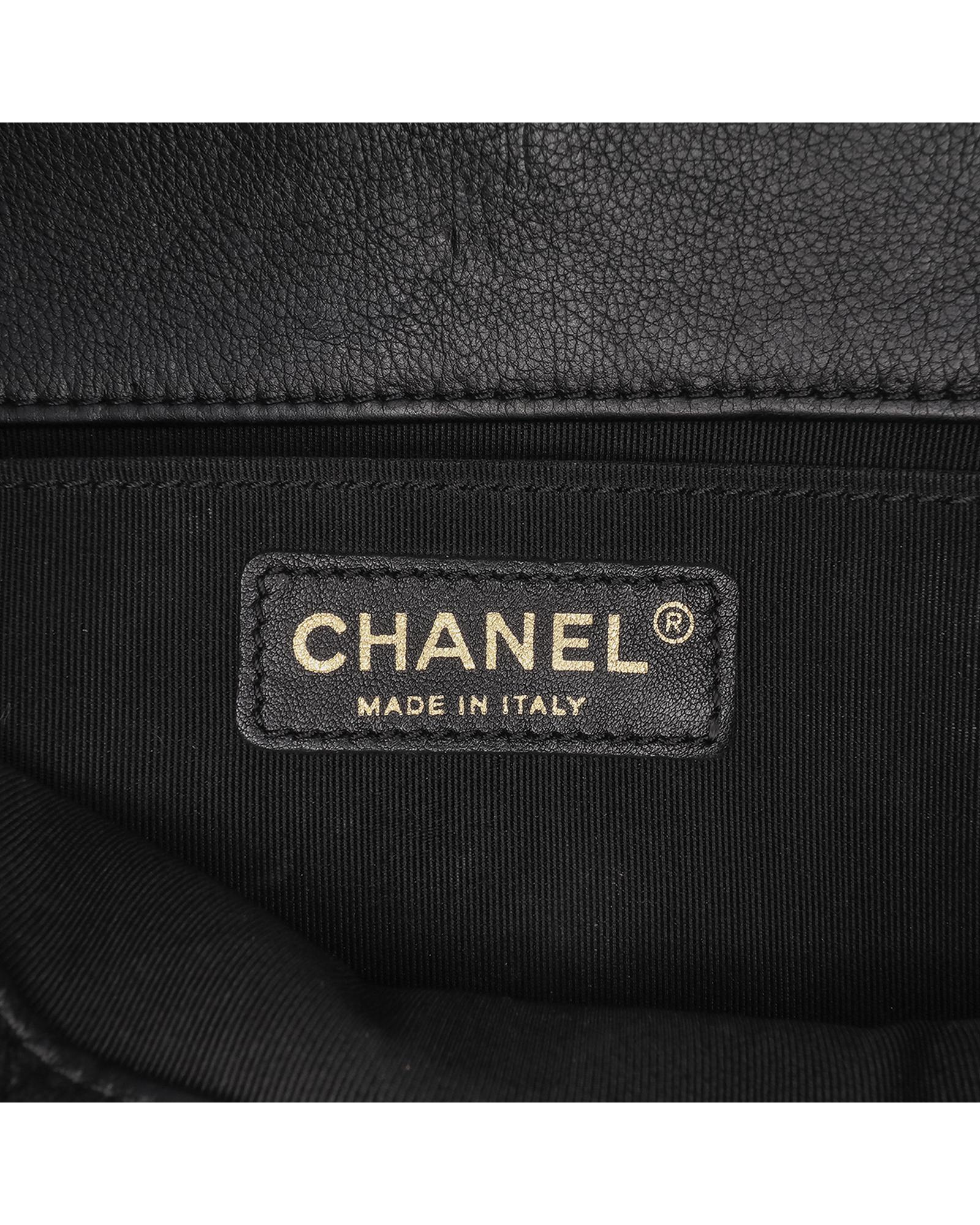 This satchel features a quilted chevron leather body a curb chain handle with leather guard a curb chain shoulder strap with leather guard a drawstring closure a flap with a CC turn lock closure and an interior slip pocket.Brand: Chanel