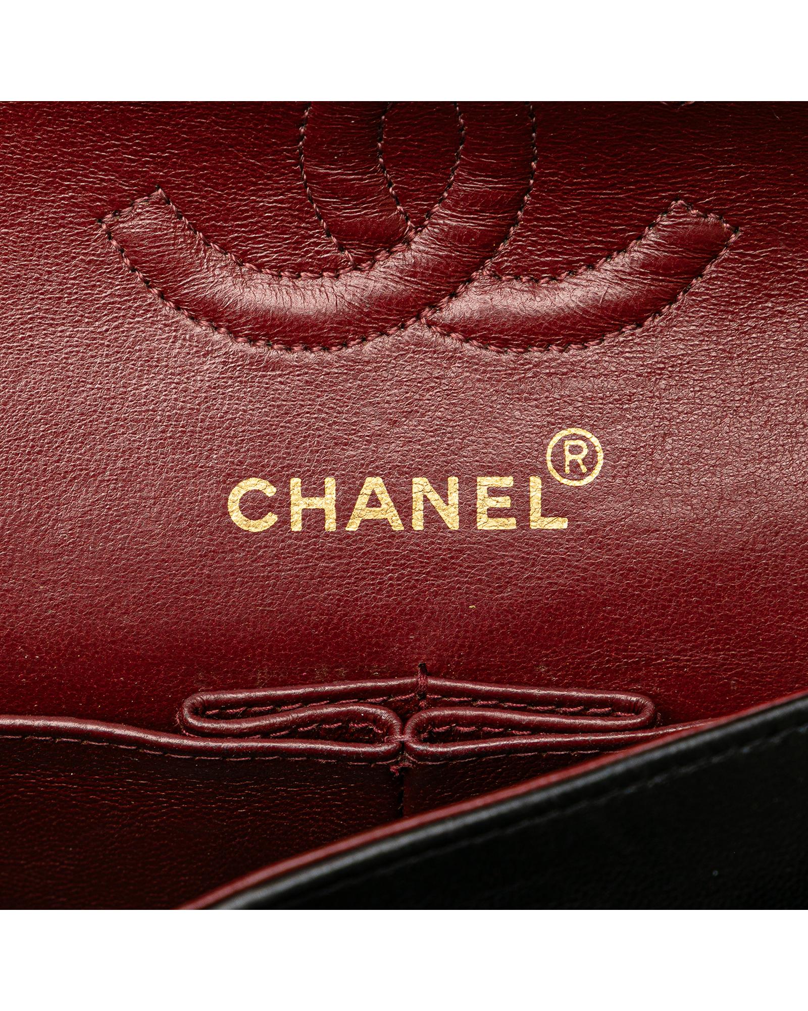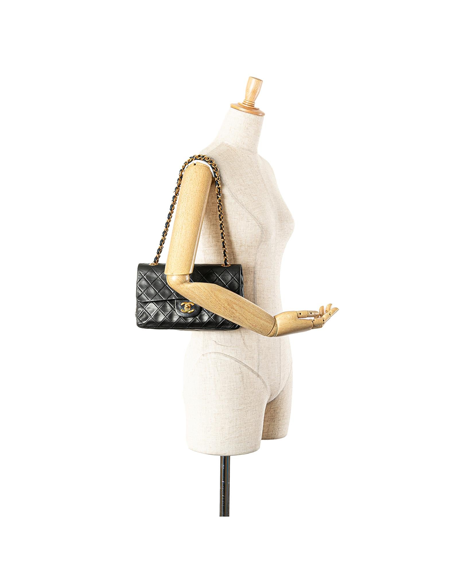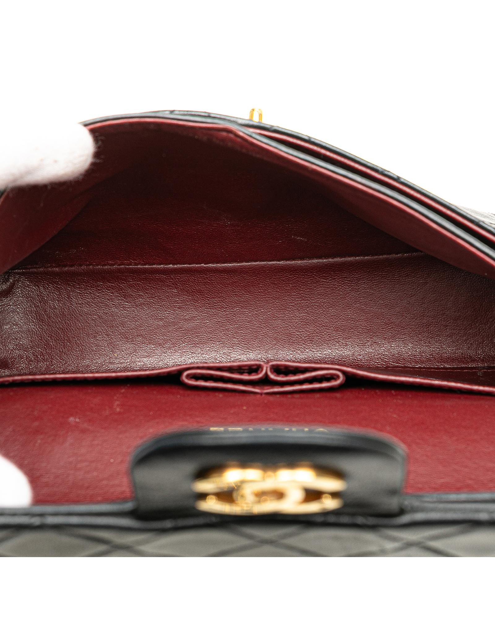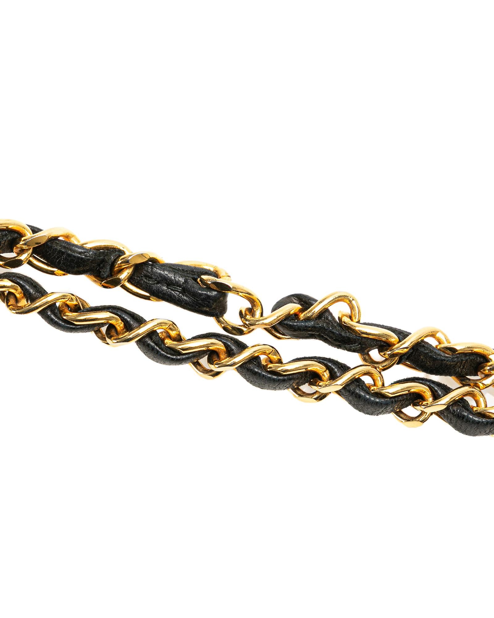 This shoulder bag features a quilted lambskin body leather woven chain shoulder straps double front flaps with interlocking Cs and a twist lock closure an exterior back slip pocket and interior slip pockets.