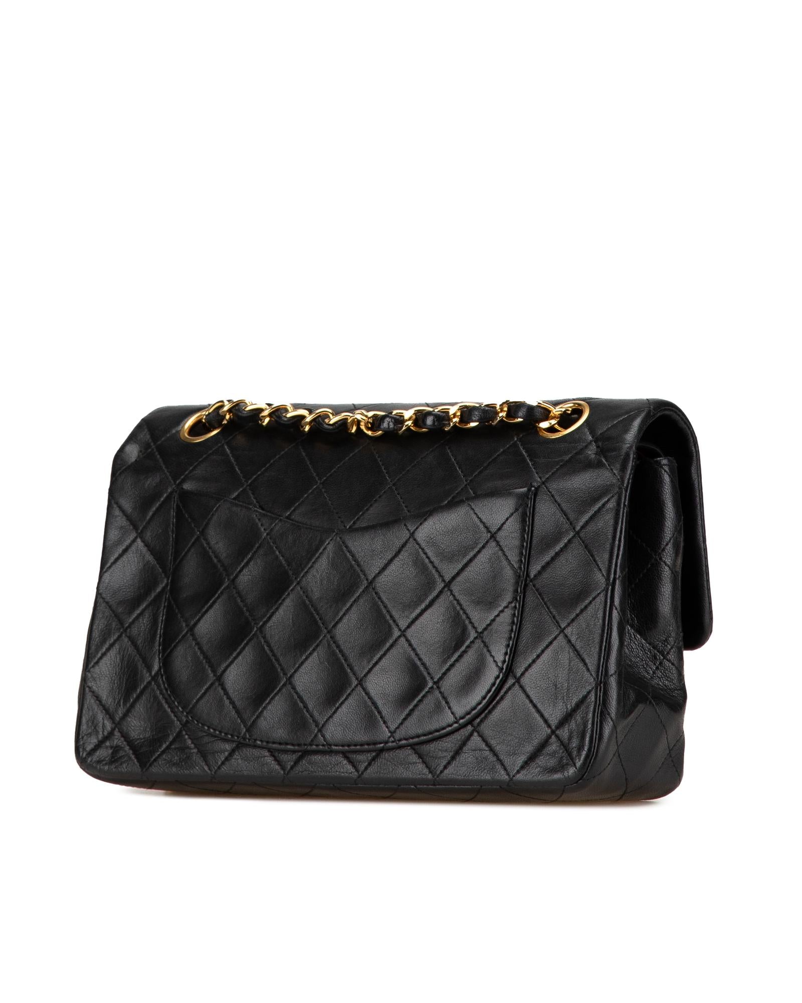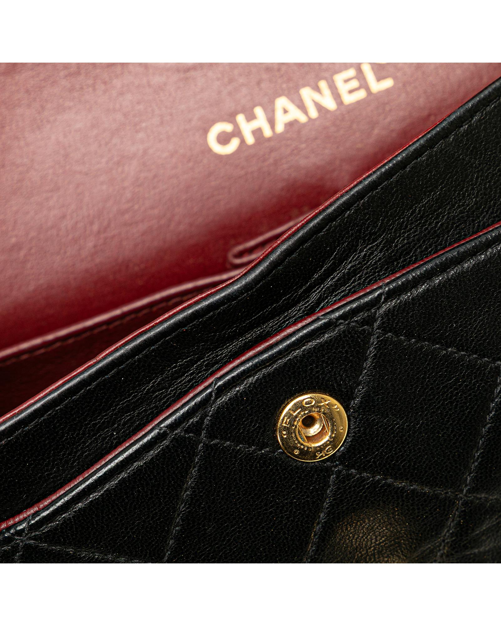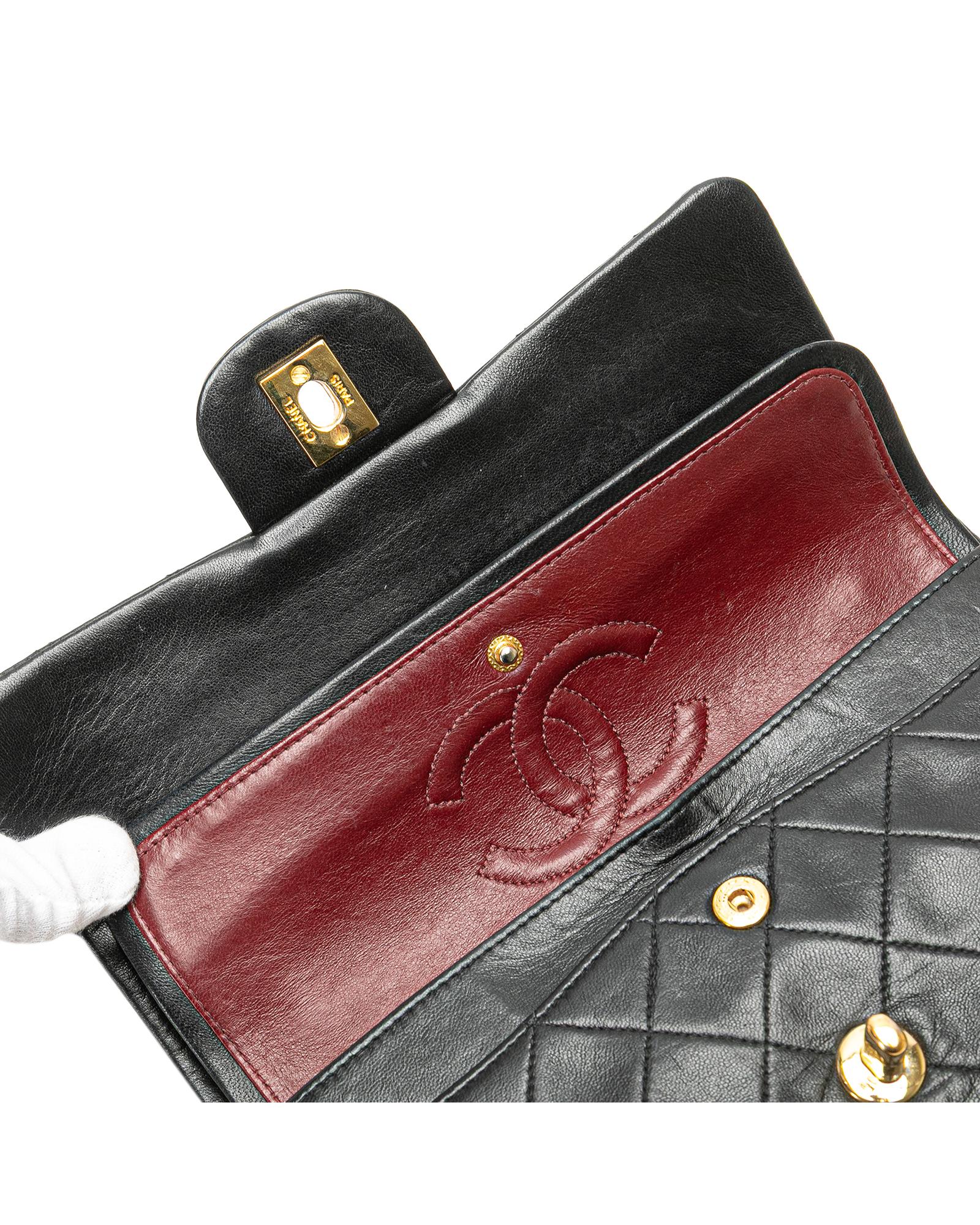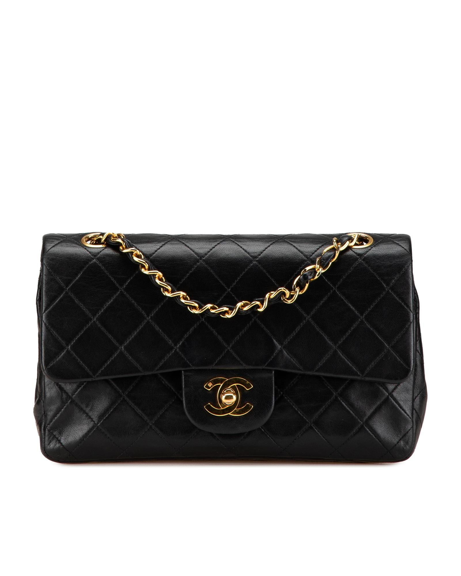 This shoulder bag features a quilted lambskin body leather woven chain shoulder straps double front flaps with interlocking Cs and a twist lock closure an exterior back slip pocket and interior slip pockets.