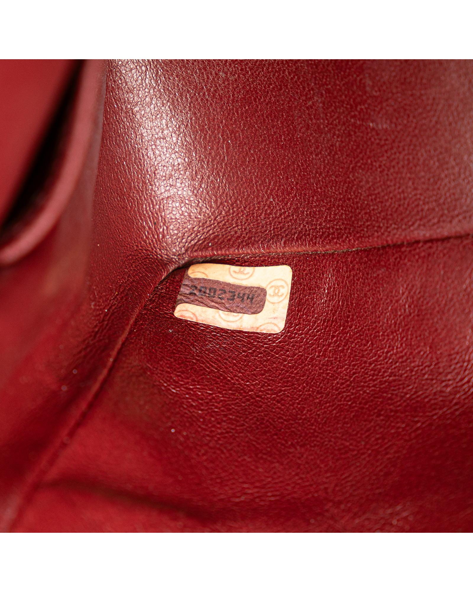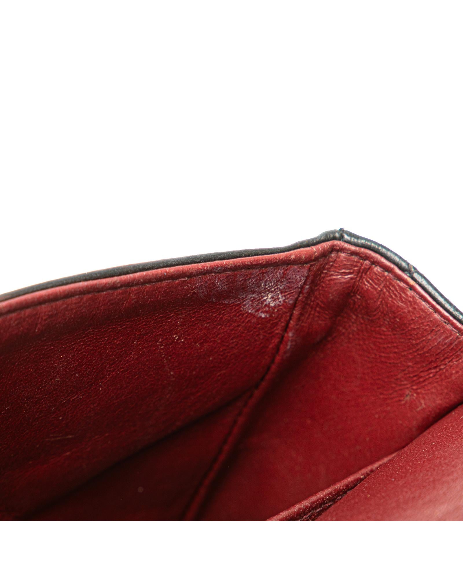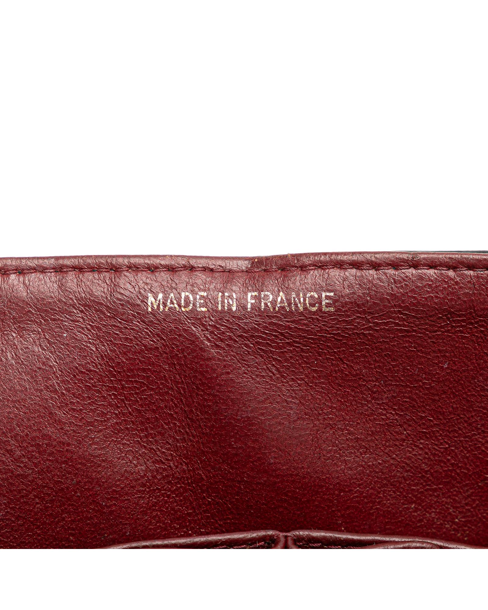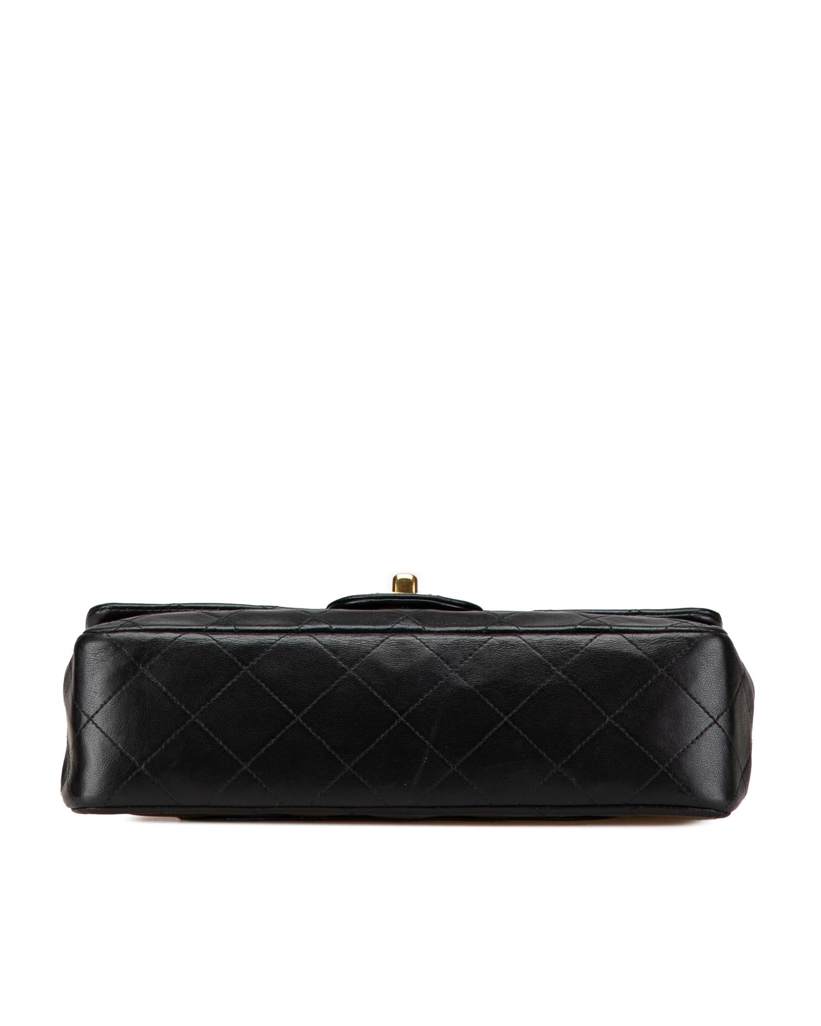 This shoulder bag features a quilted lambskin body leather woven chain shoulder straps double front flaps with interlocking Cs and a twist lock closure an exterior back slip pocket and interior slip pockets.