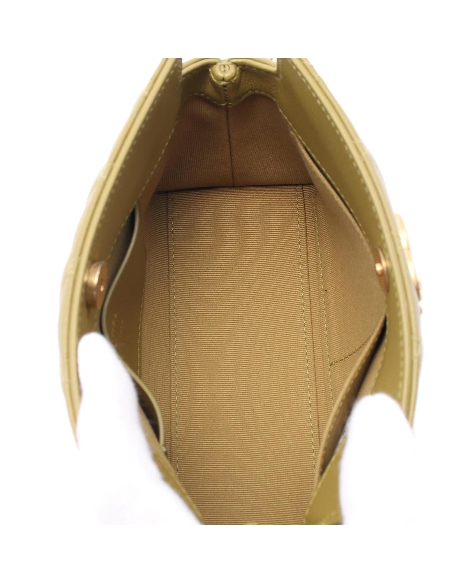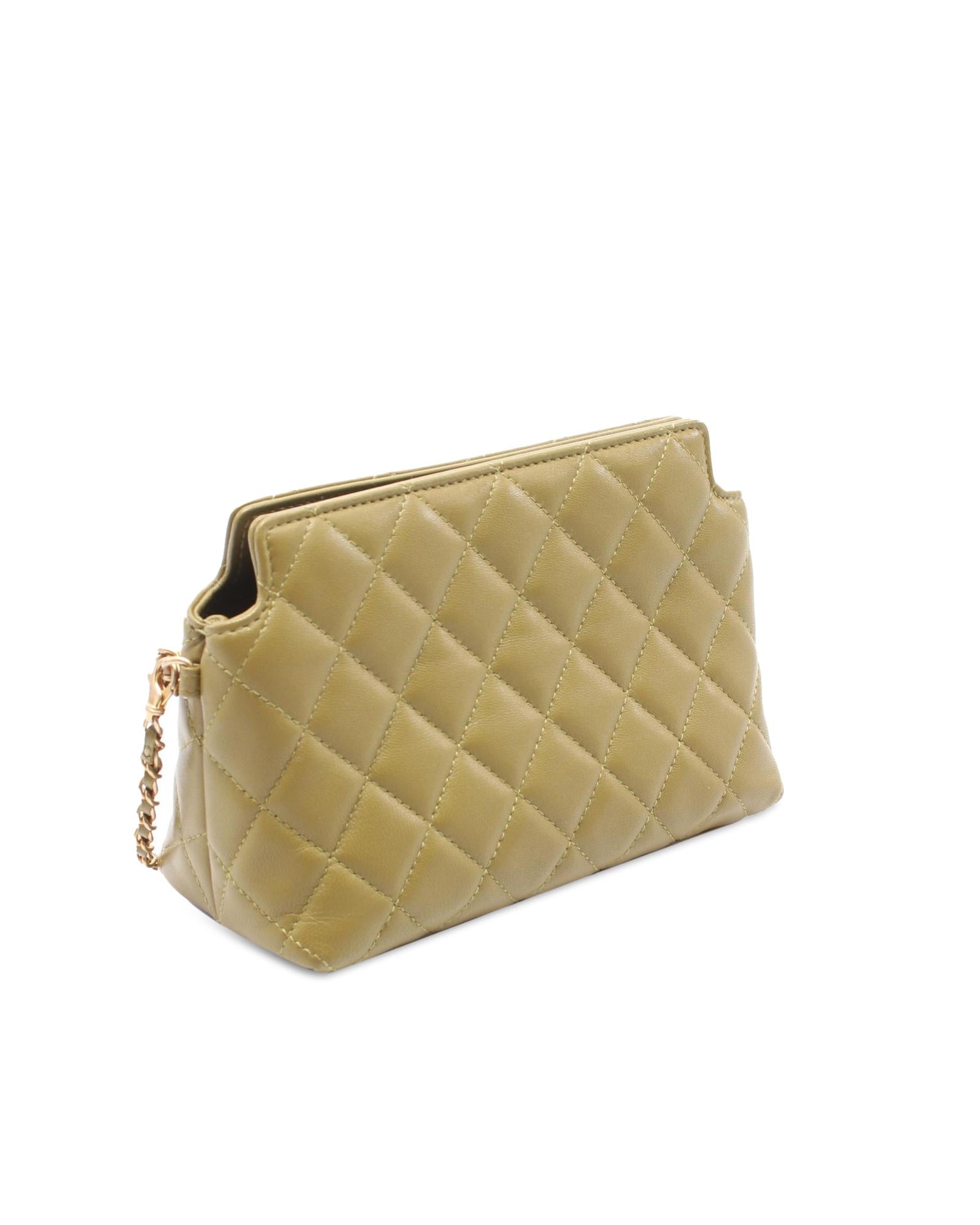 This shoulder bag features a quilted lambskin leather body leather woven chain strap with gold tone lions hardware an open top with magnetic closure and interior slip pockets.