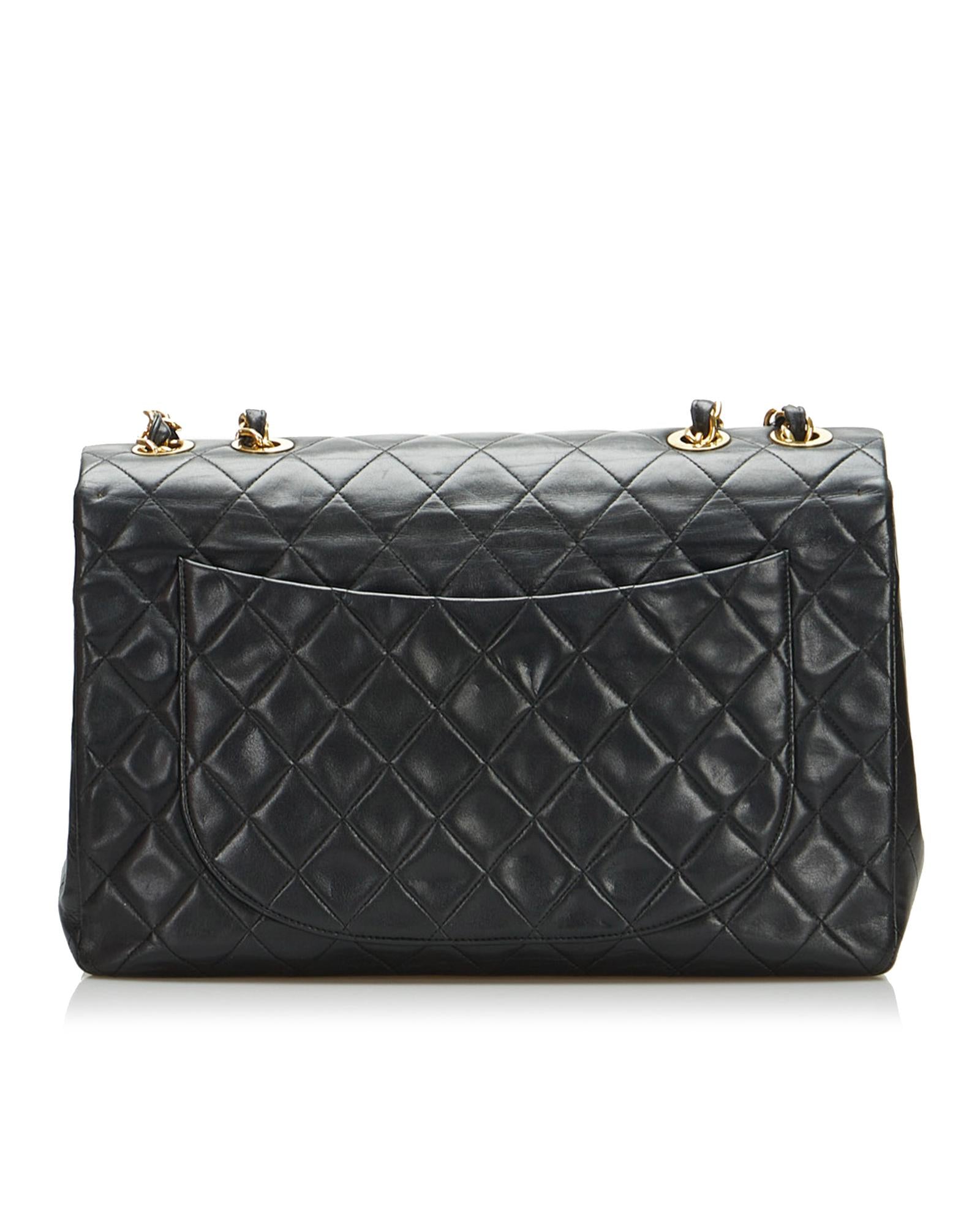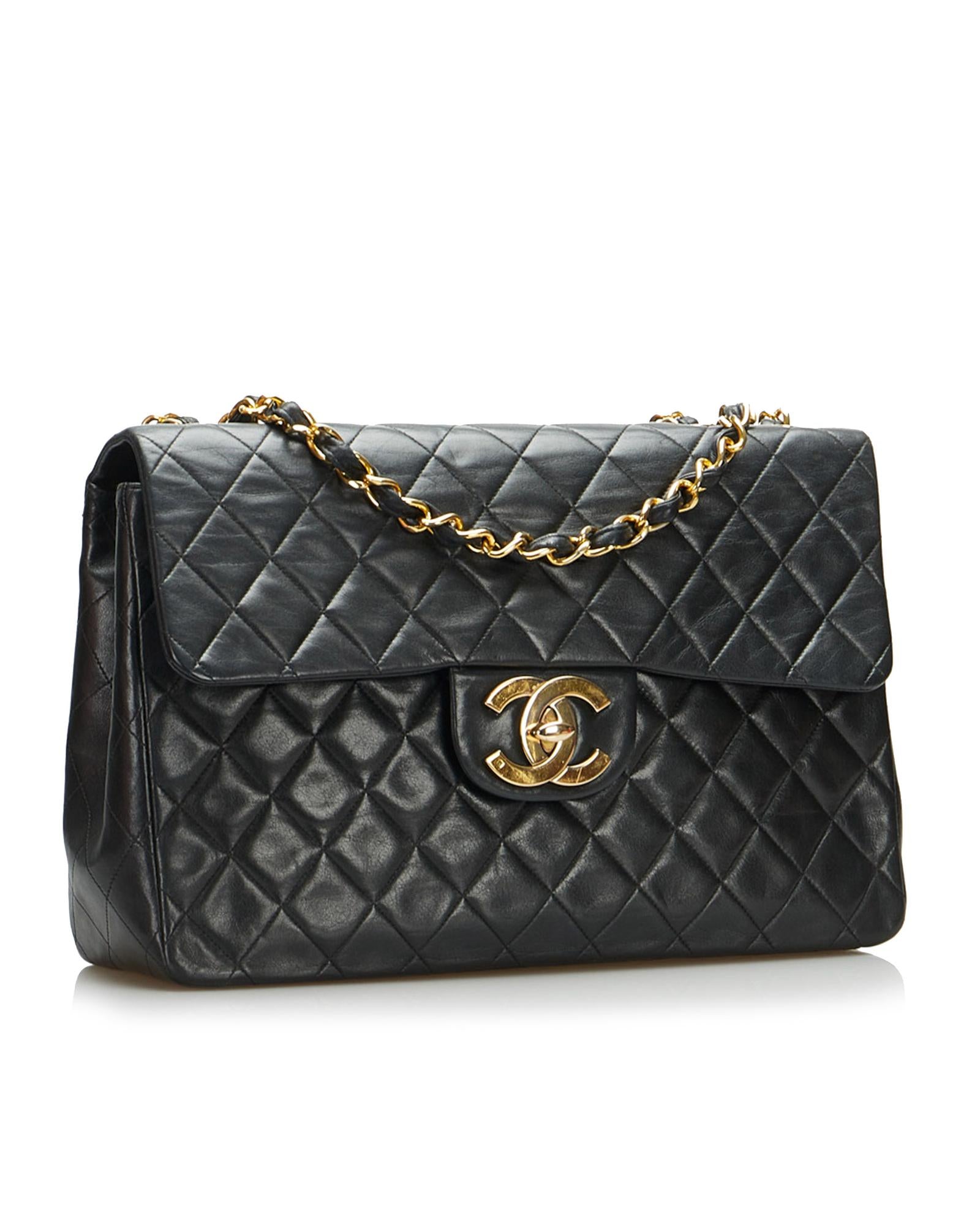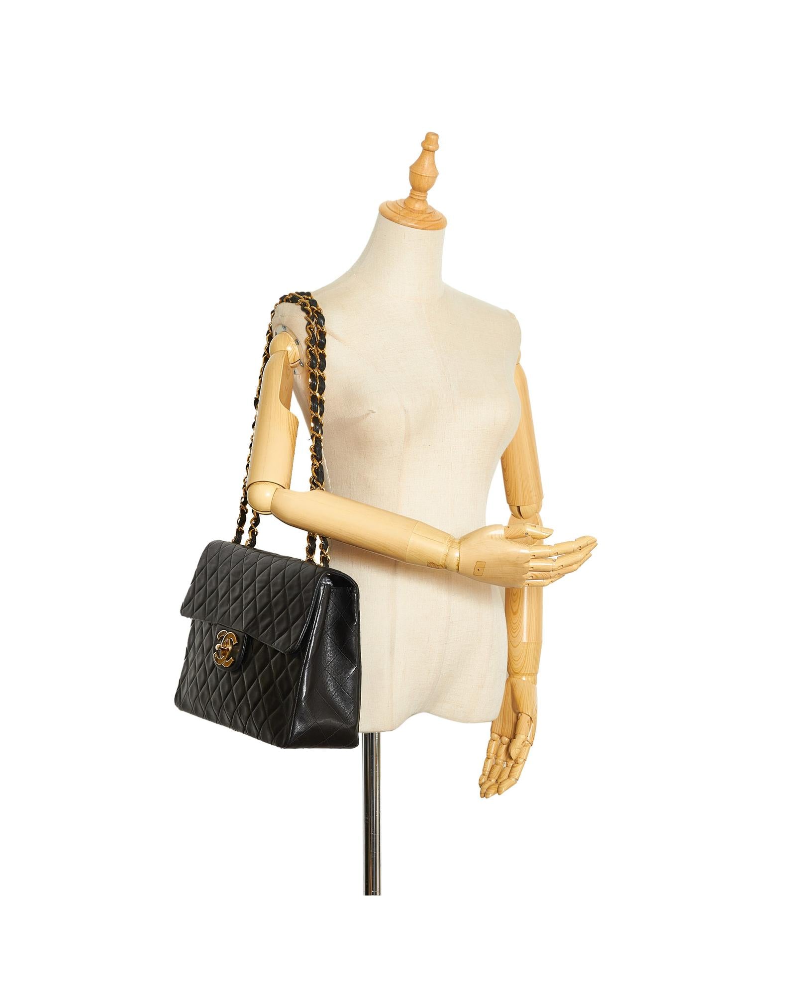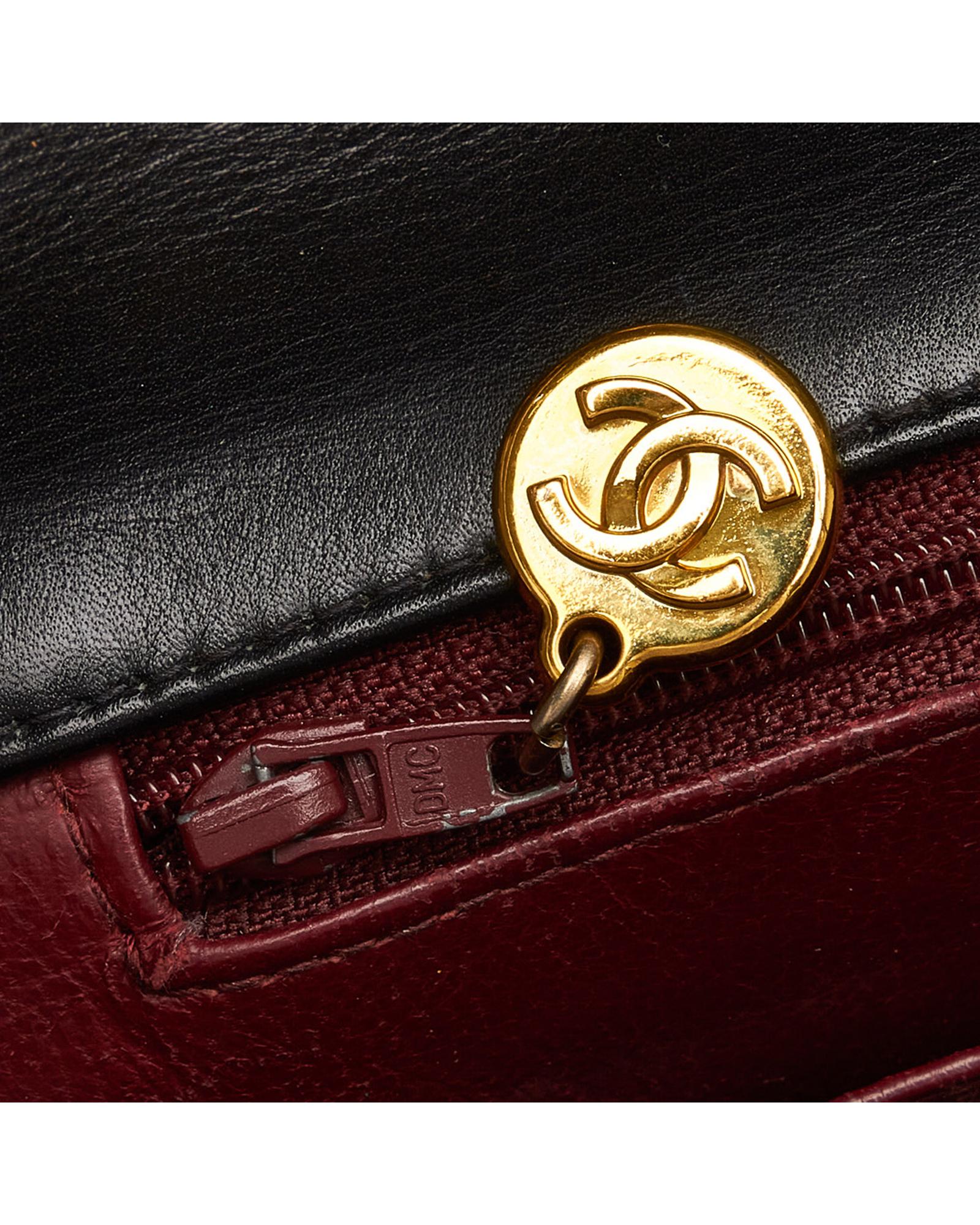 This shoulder bag features a quilted lambskin body an exterior back slip pocket leather woven chain straps a front flap with interlocking Cs and a twist lock closure and interior zip and slip pockets.