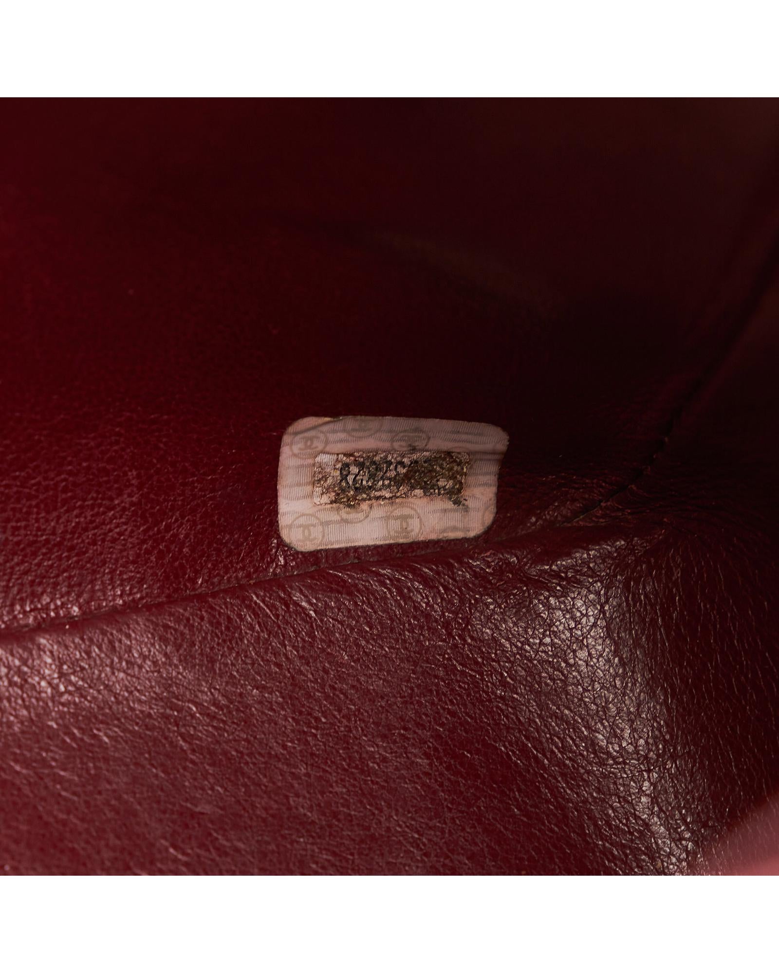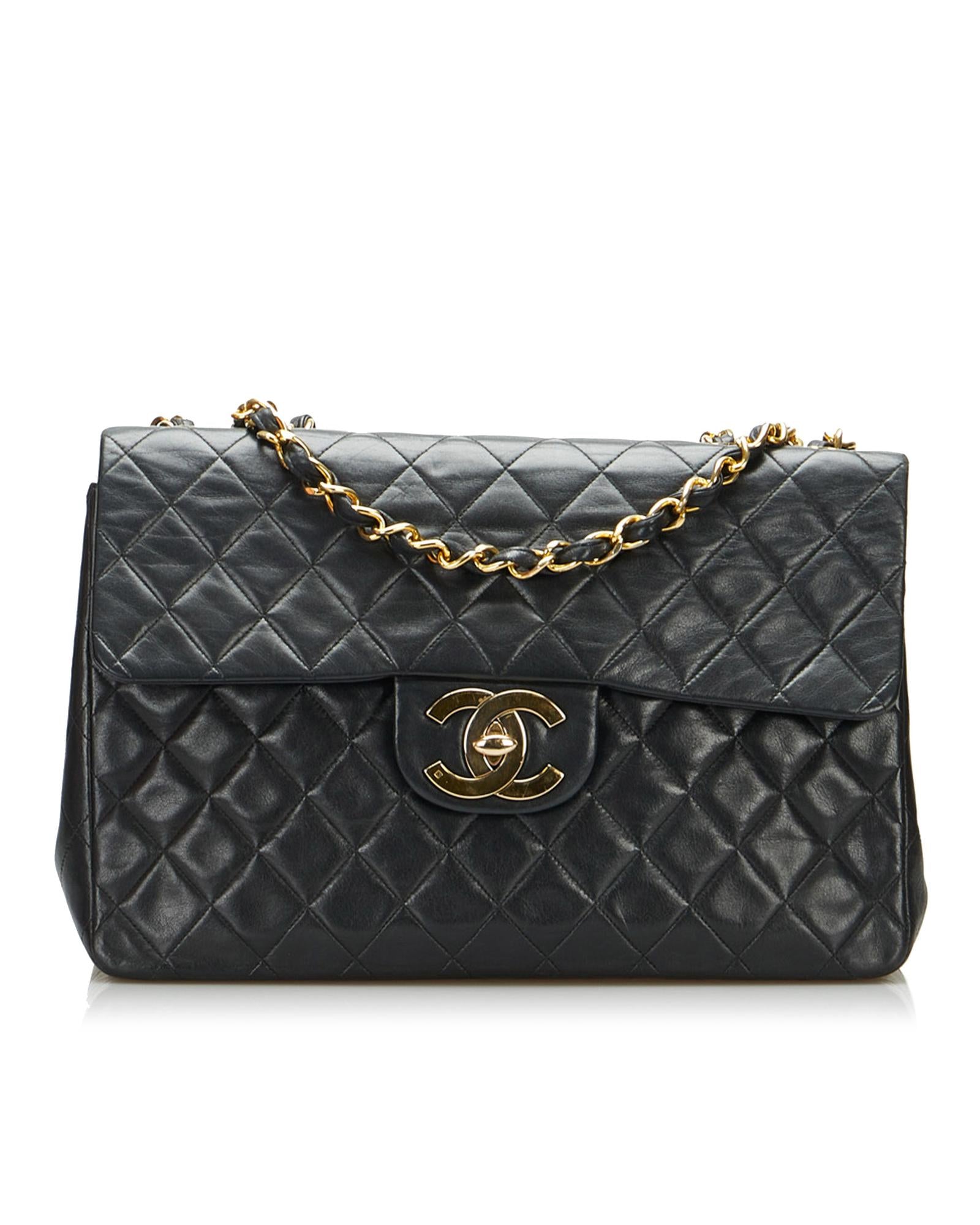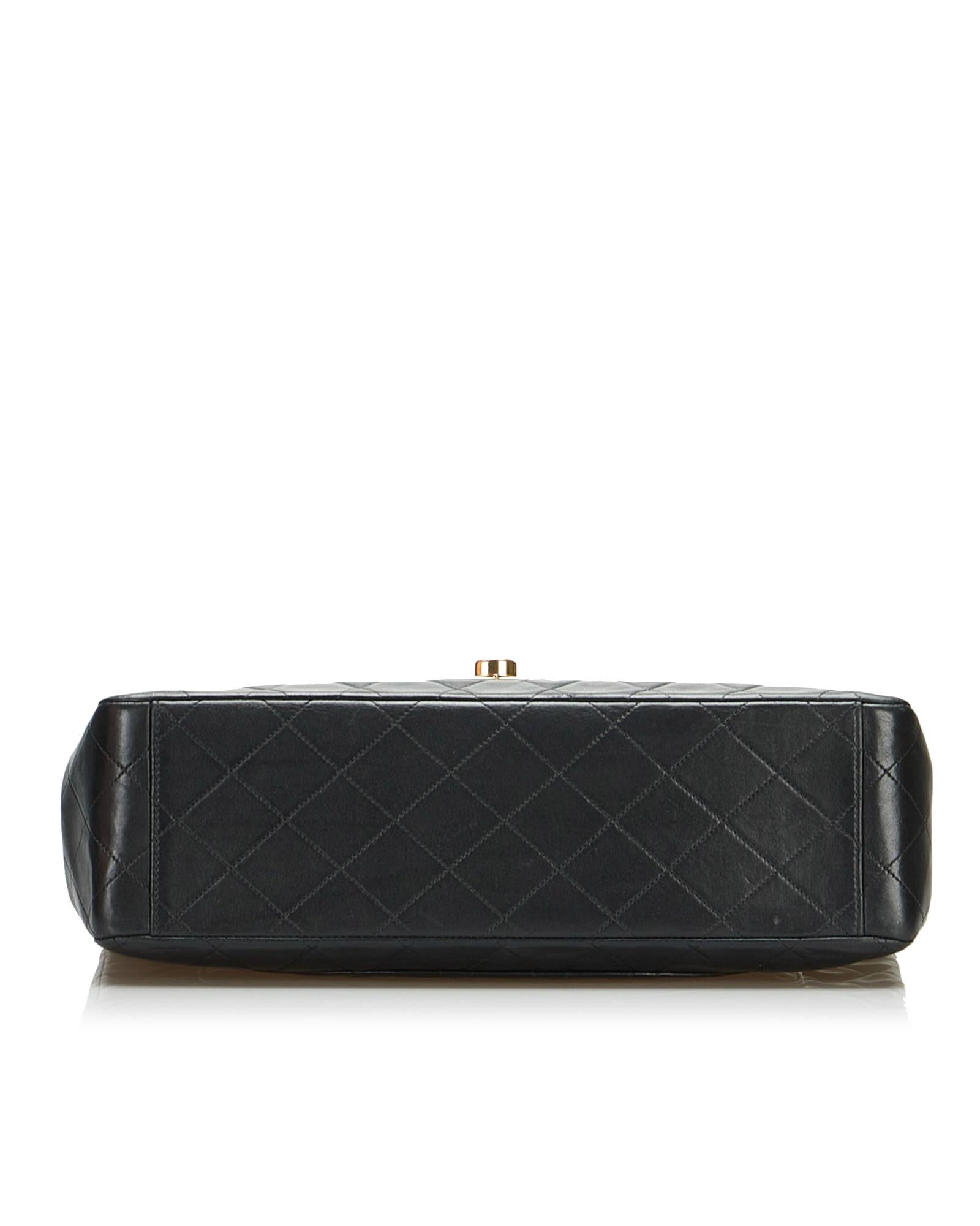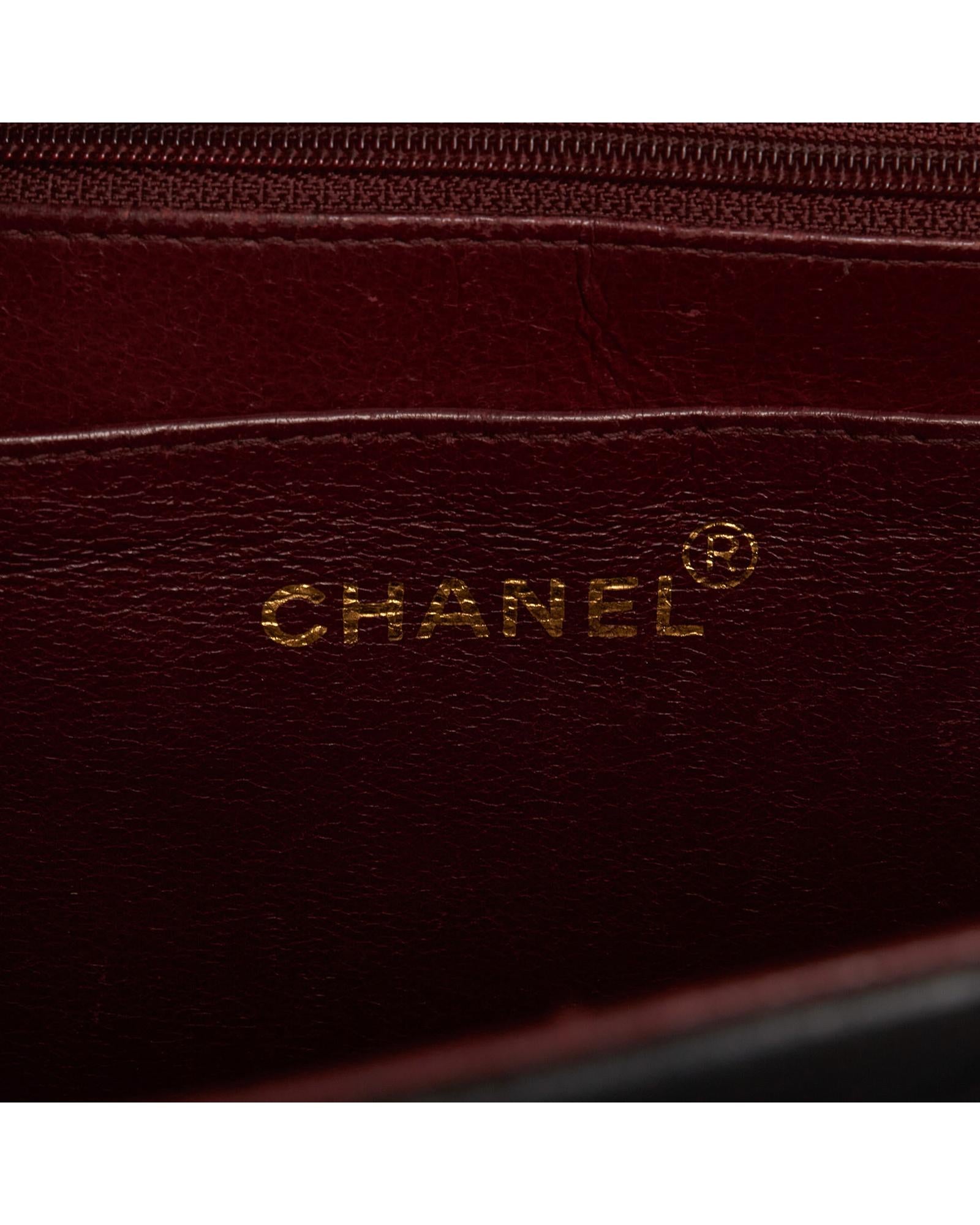 This shoulder bag features a quilted lambskin body an exterior back slip pocket leather woven chain straps a front flap with interlocking Cs and a twist lock closure and interior zip and slip pockets.