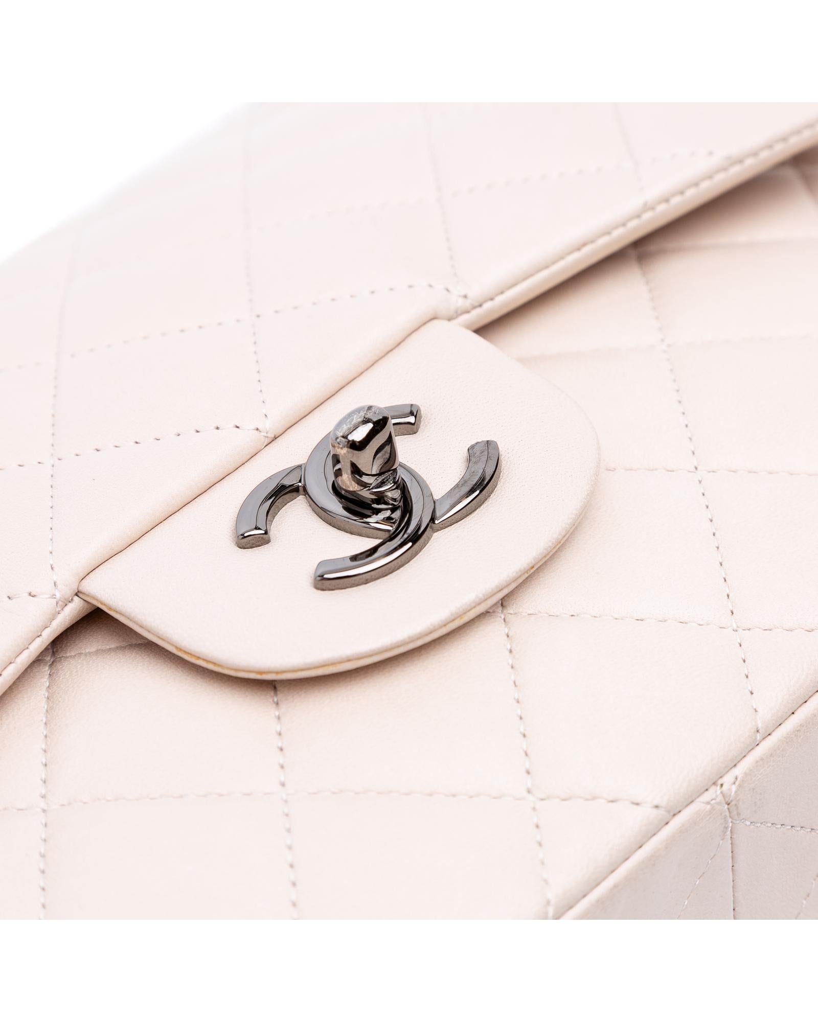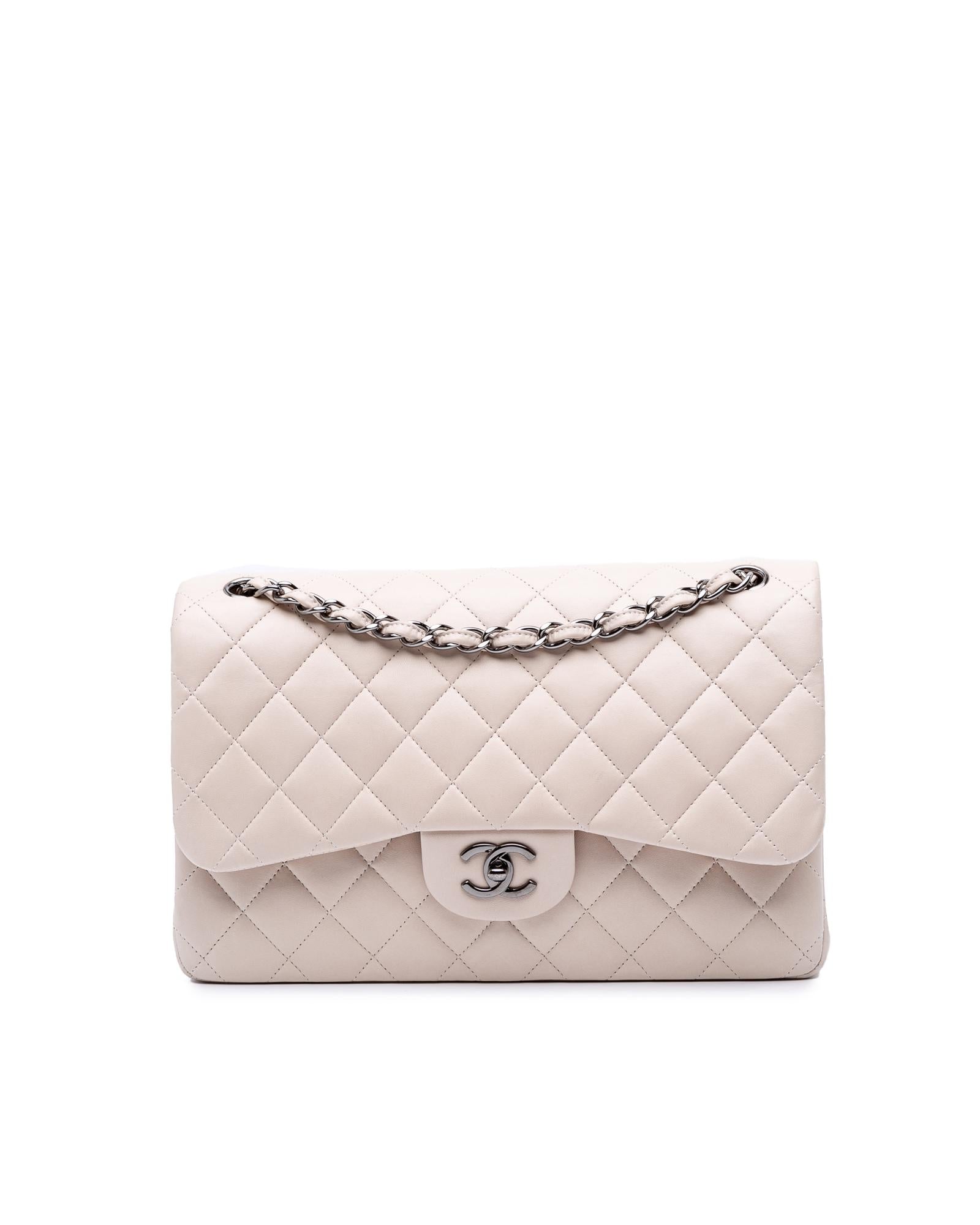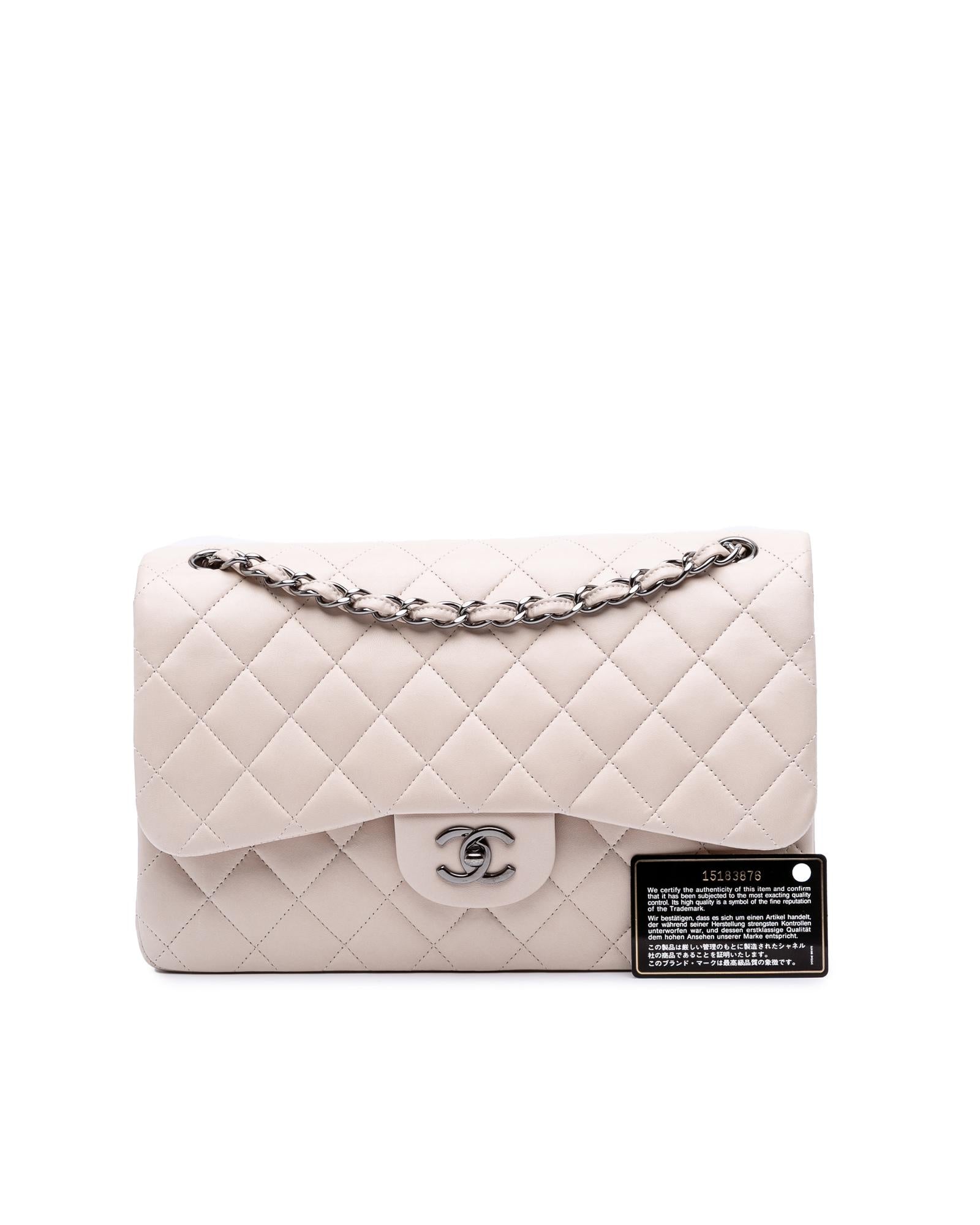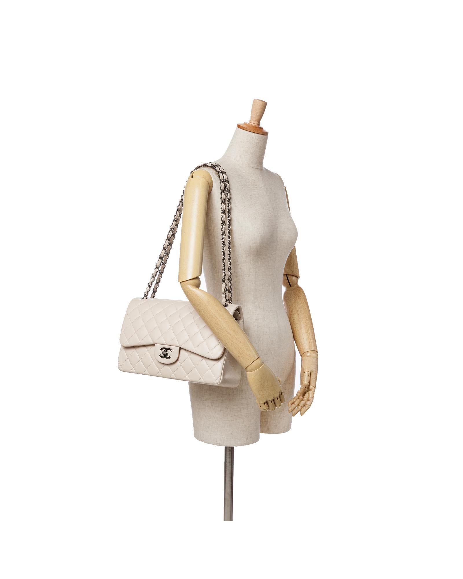 The Classic Jumbo Flap features lambskin leather chain straps a front flap with interlocking Cs twist lock closure an exterior back pocket and interior zip and open pockets.Brand: Chanel