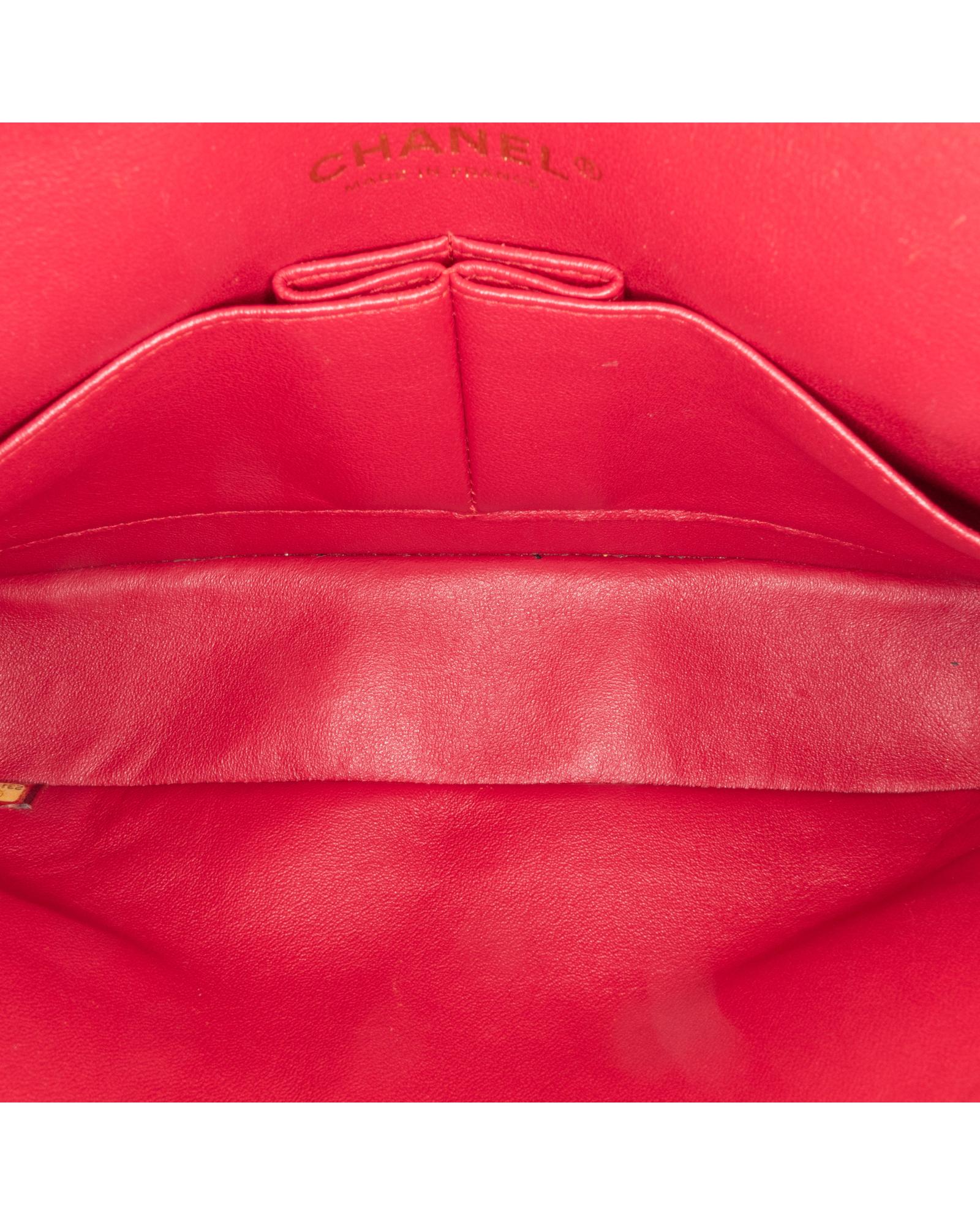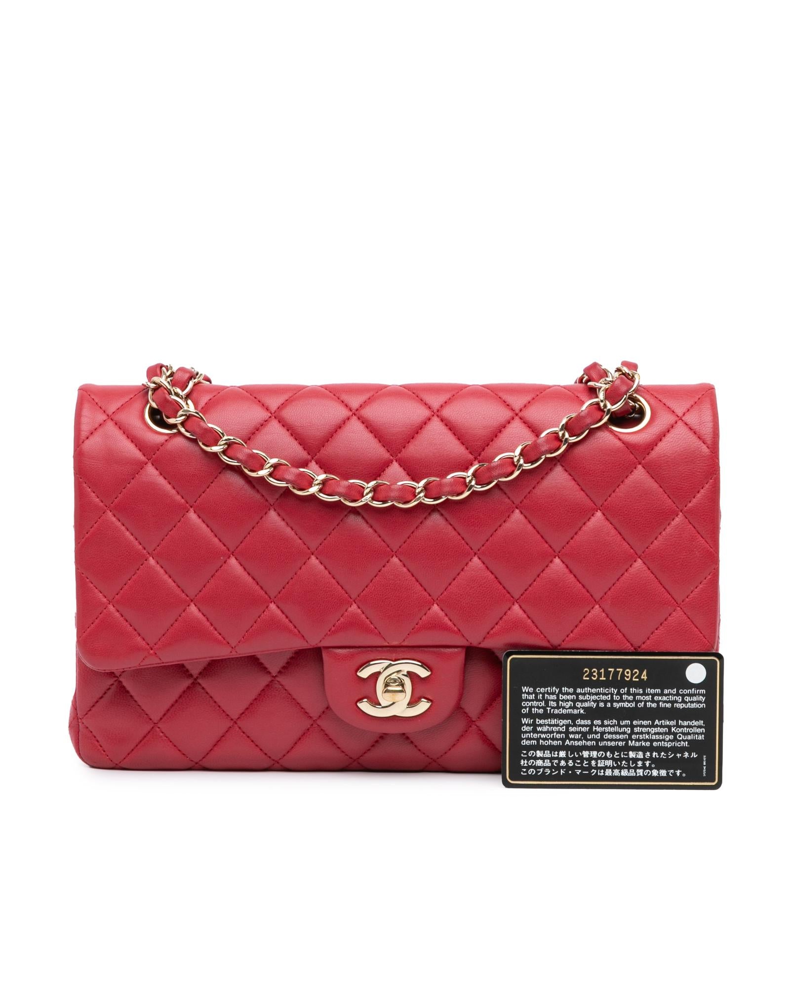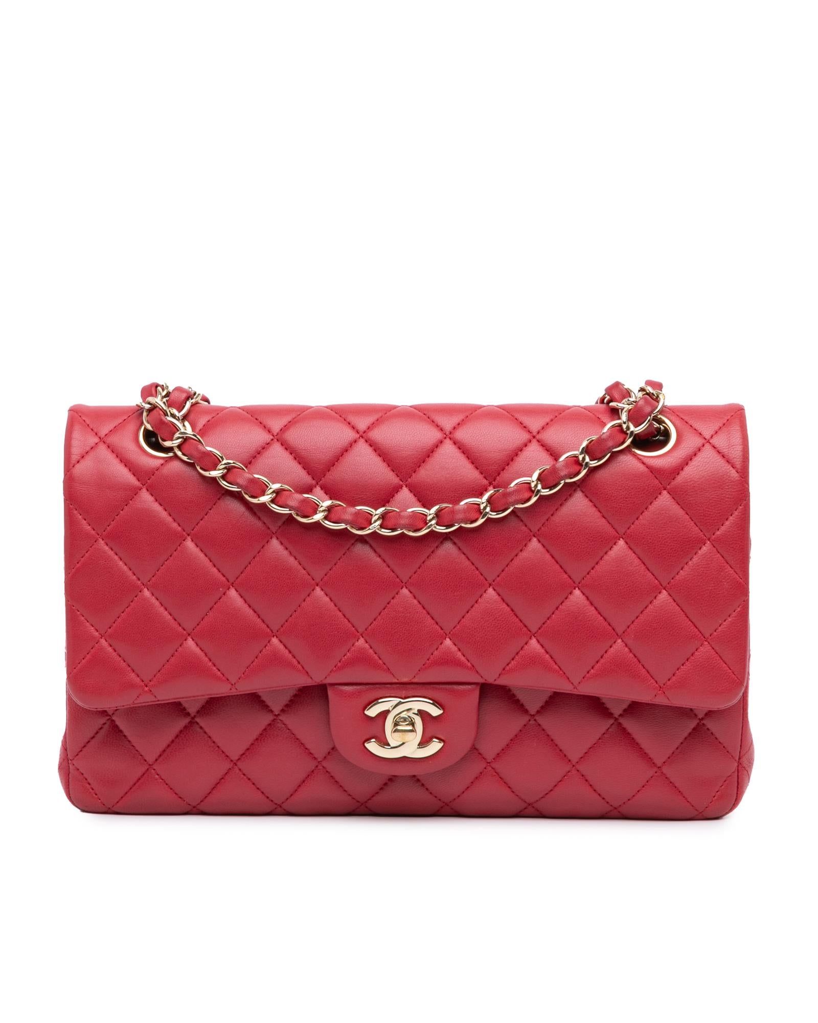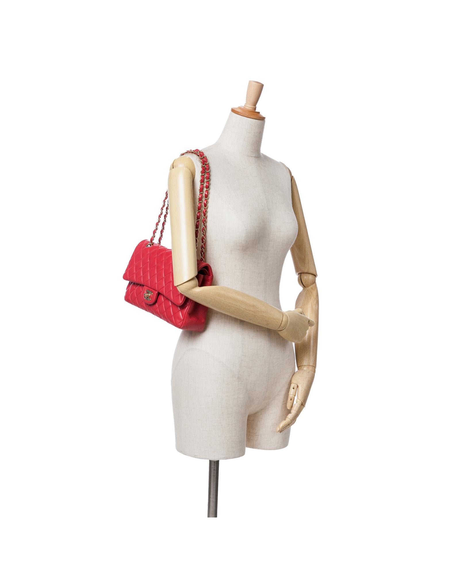 This shoulder bag features a quilted lambskin body leather woven chain straps double front flaps with interlocking Cs and a twist lock closure an exterior back slip pocket and interior zip and slip pockets.