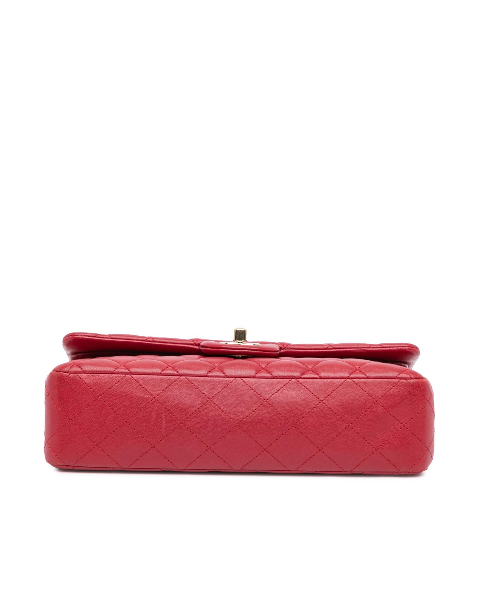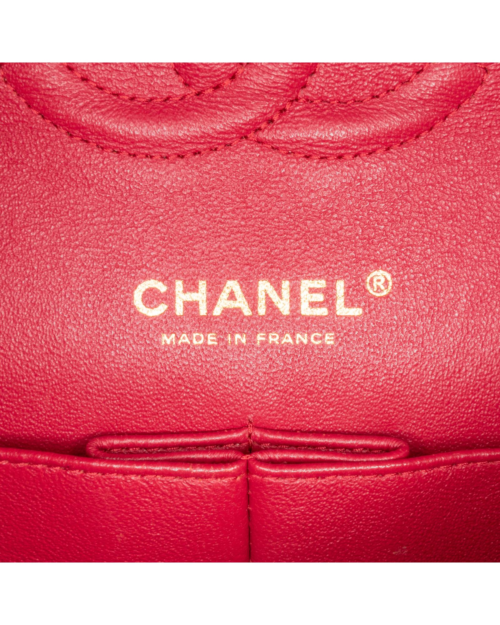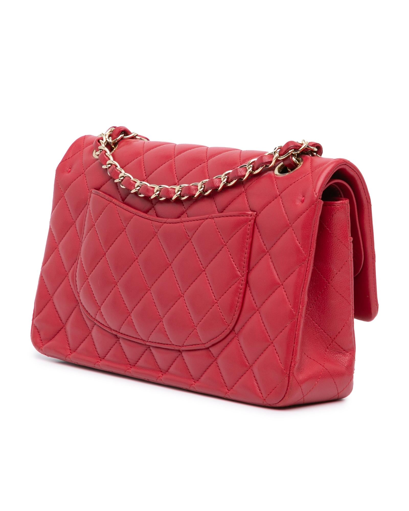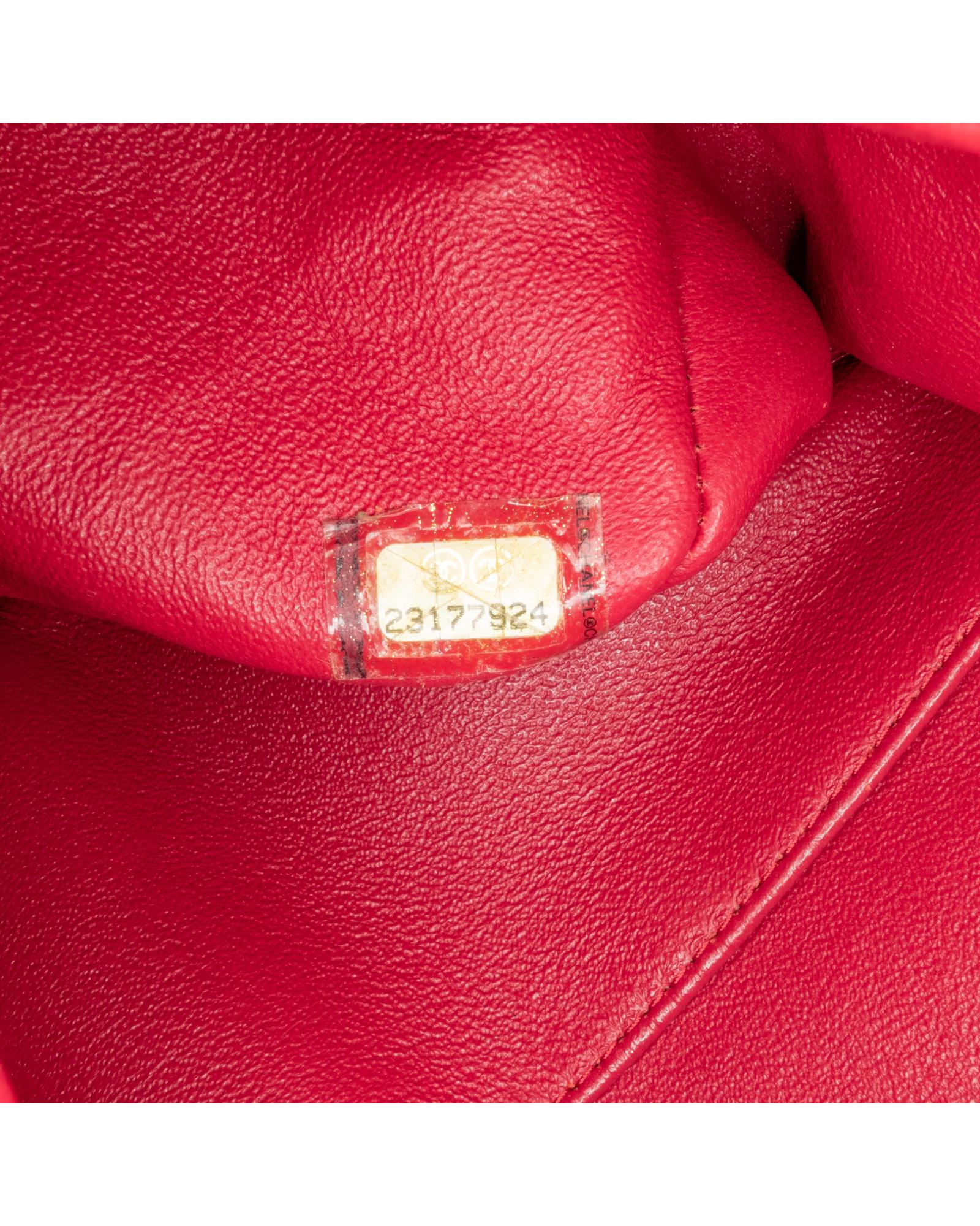 This shoulder bag features a quilted lambskin body leather woven chain straps double front flaps with interlocking Cs and a twist lock closure an exterior back slip pocket and interior zip and slip pockets.