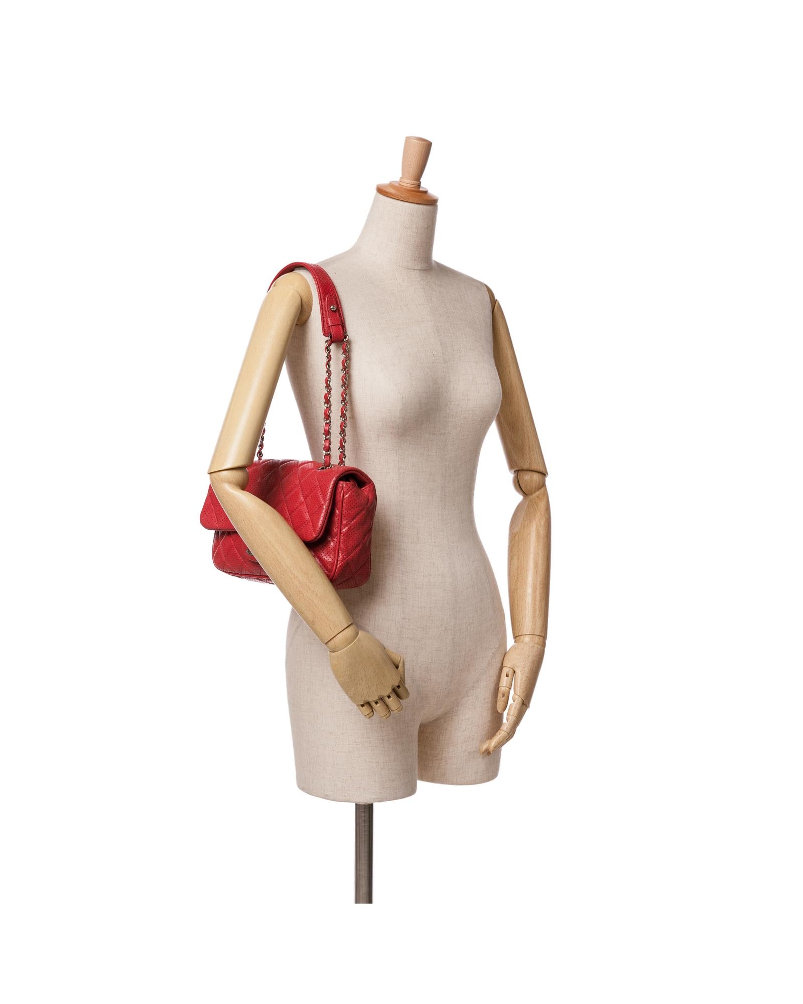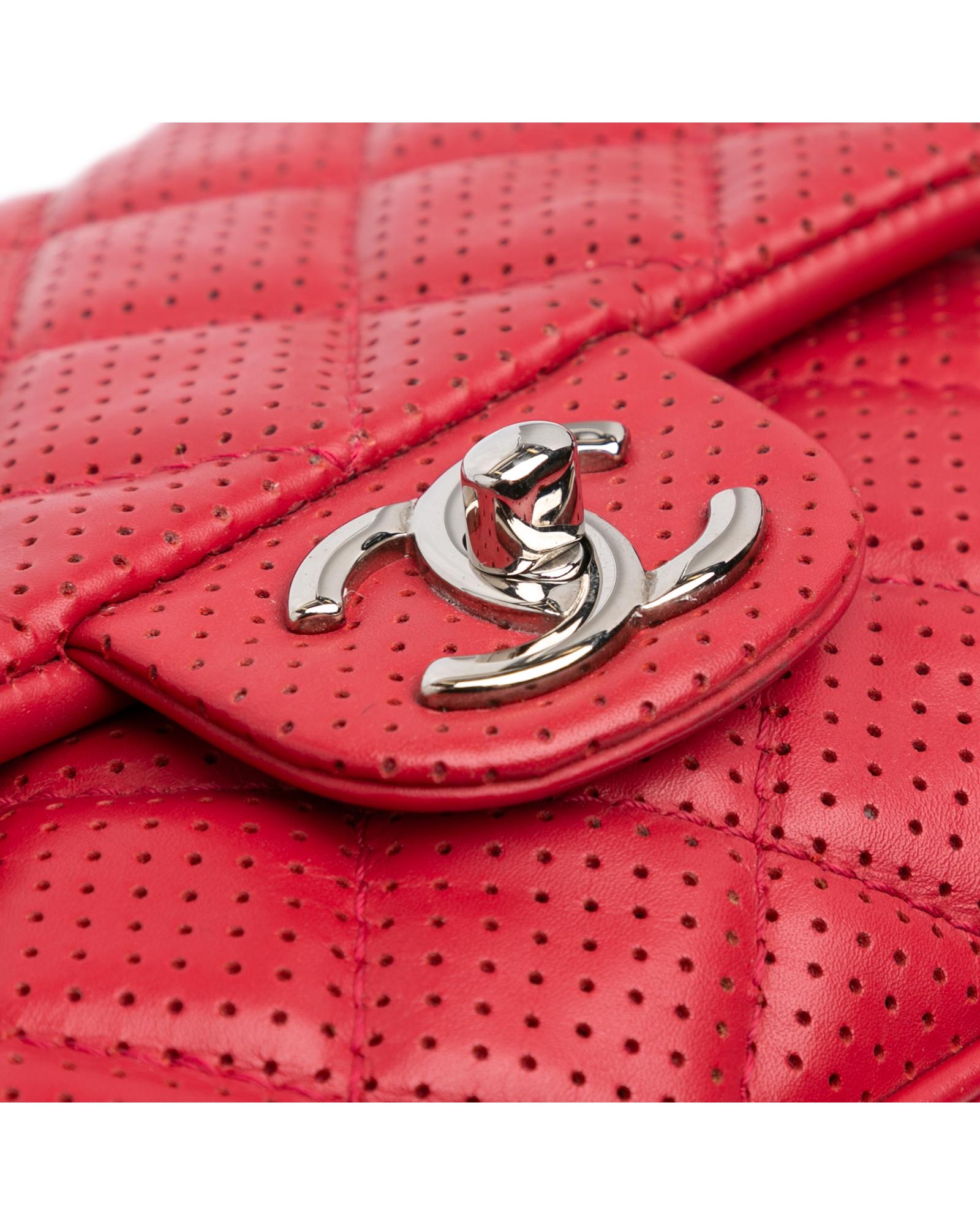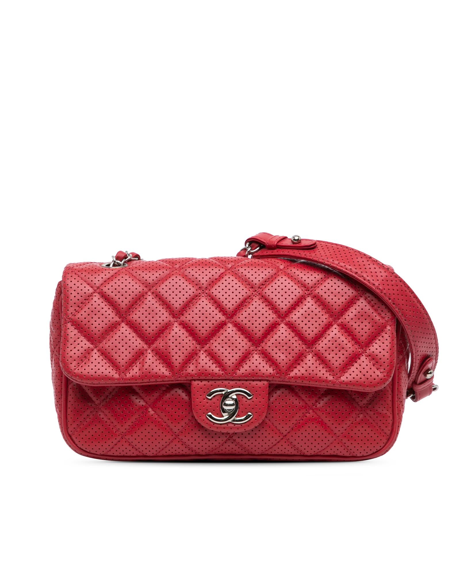 This shoulder bag features a quilted perforated lambskin leather body a leather woven chain link shoulder straps with leather shoulder guard a front flap with a CC turn-lock closure an exterior slip pocket and interior zip and slip pockets.