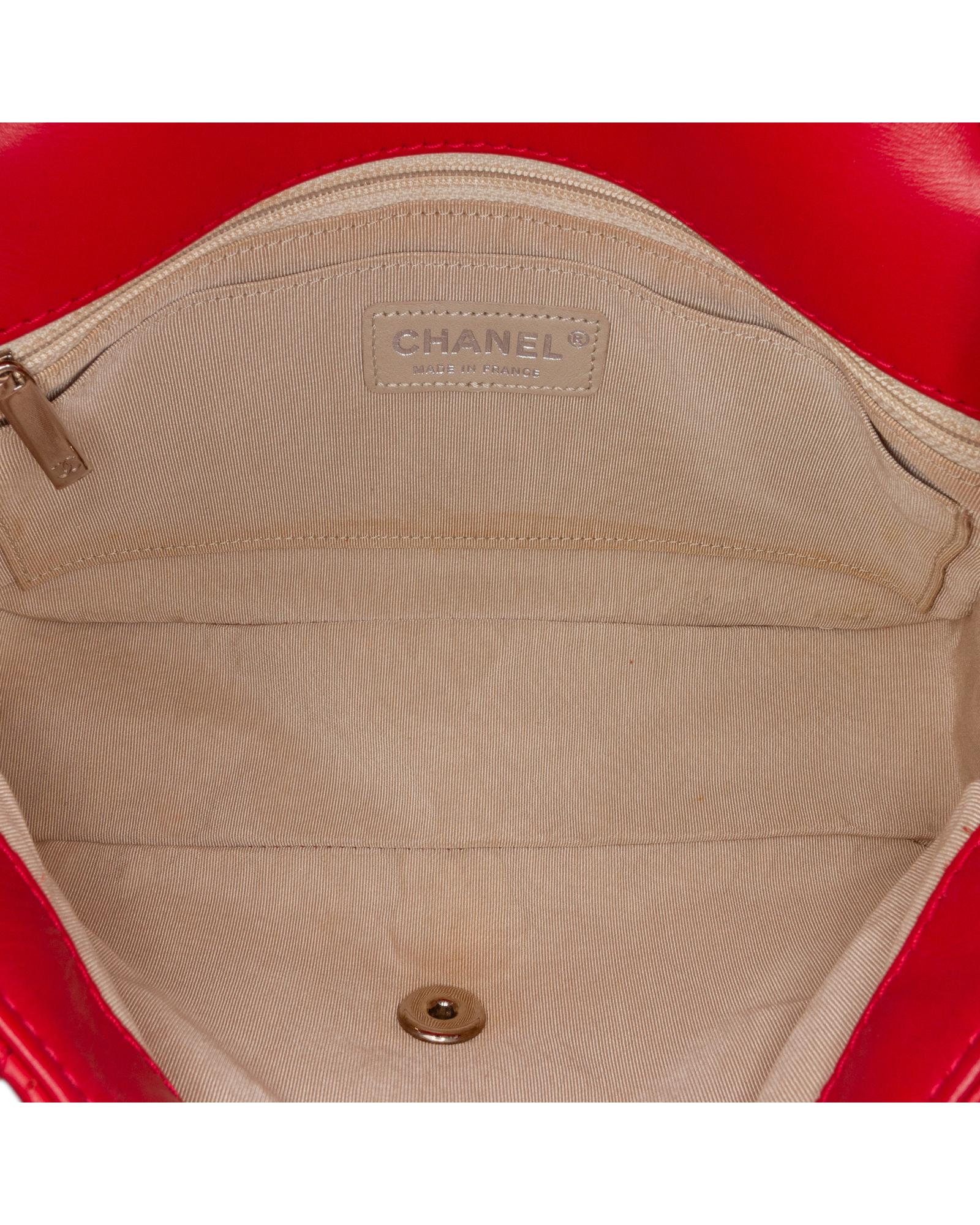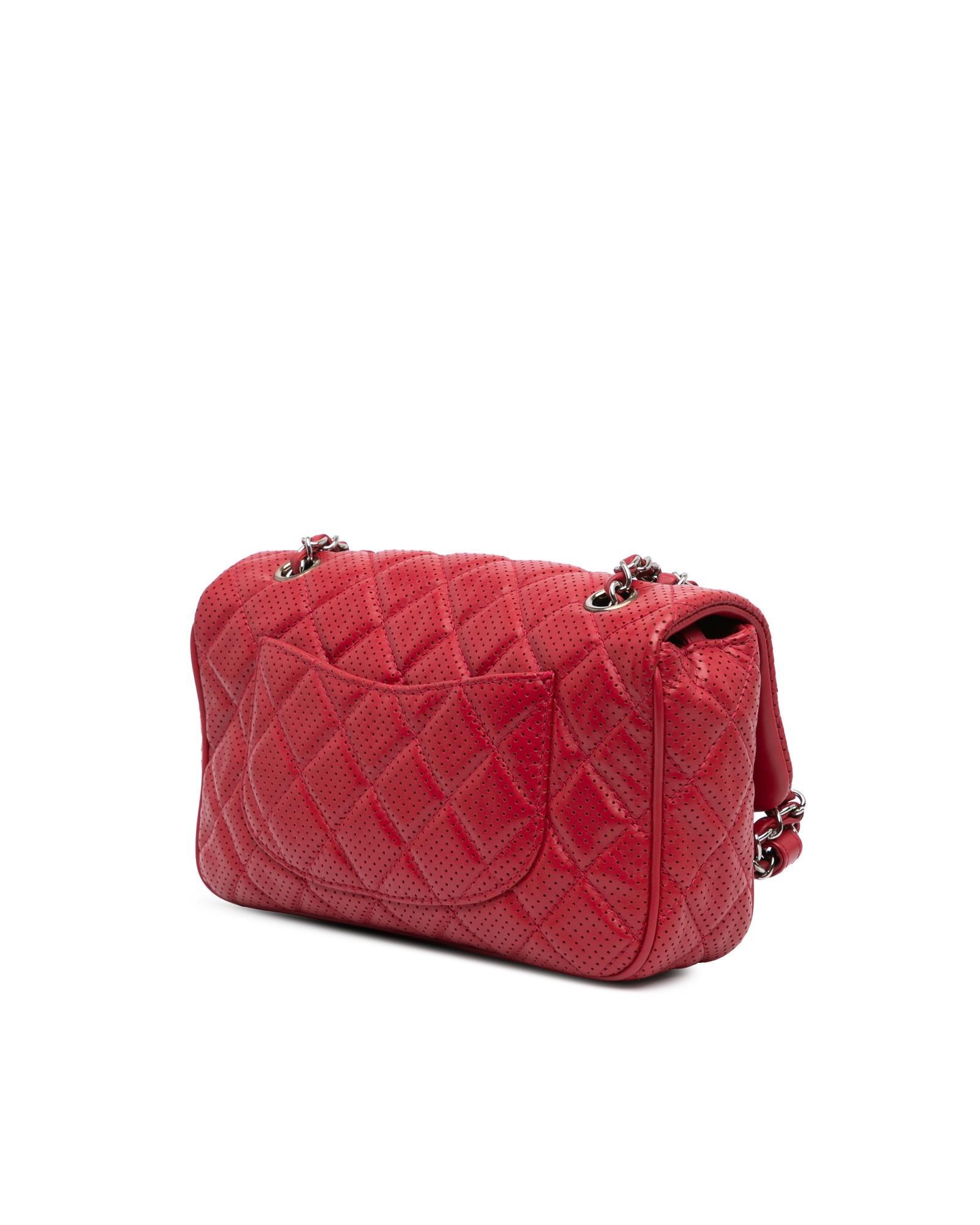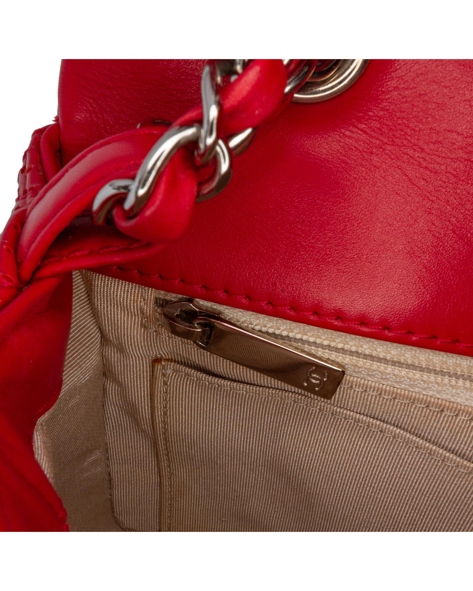 This shoulder bag features a quilted perforated lambskin leather body a leather woven chain link shoulder straps with leather shoulder guard a front flap with a CC turn-lock closure an exterior slip pocket and interior zip and slip pockets.