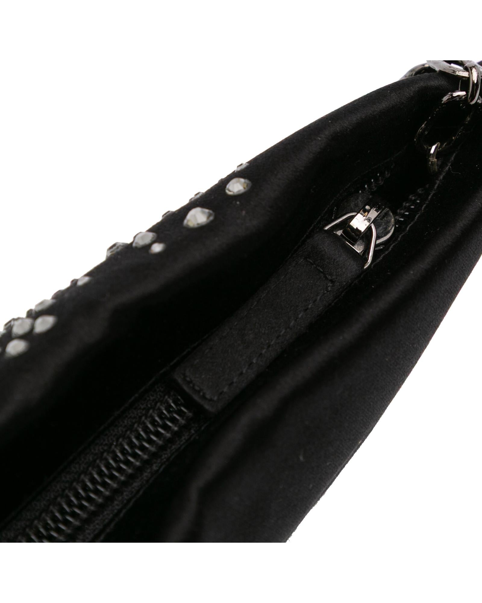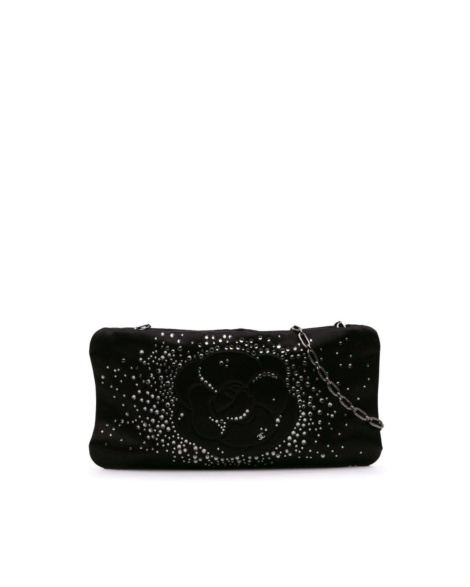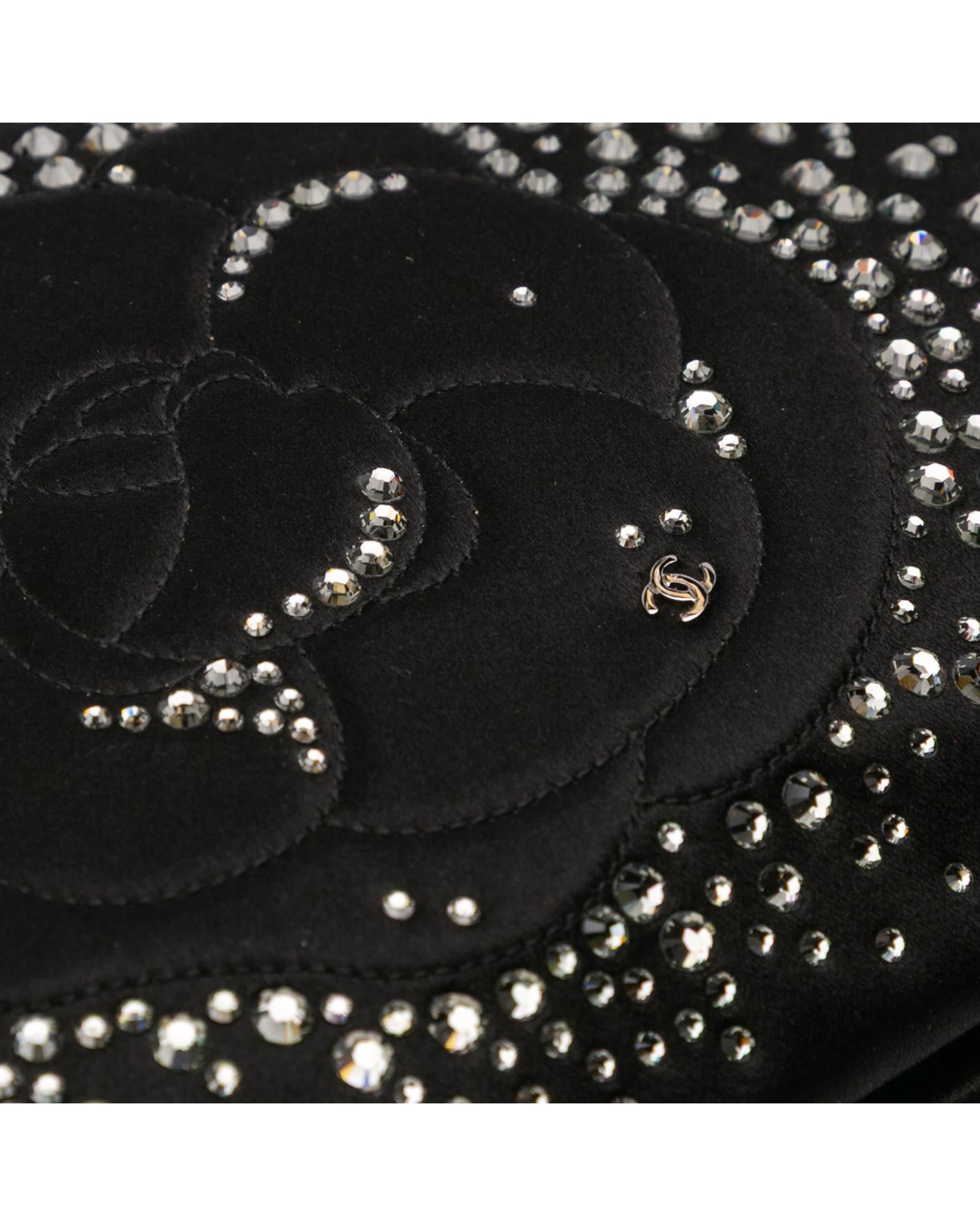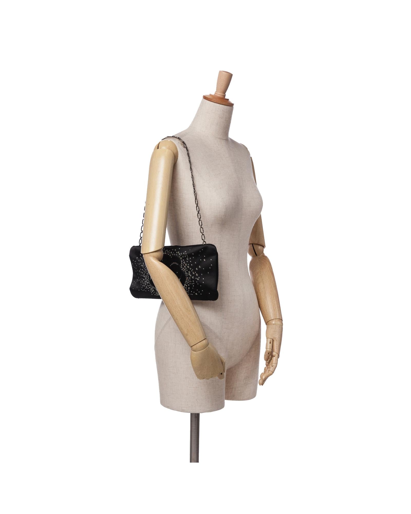 This shoulder bag features a satin body with crystal embellishments a chain link strap a top zip closure and an interior slip pocket.Brand: Chanel