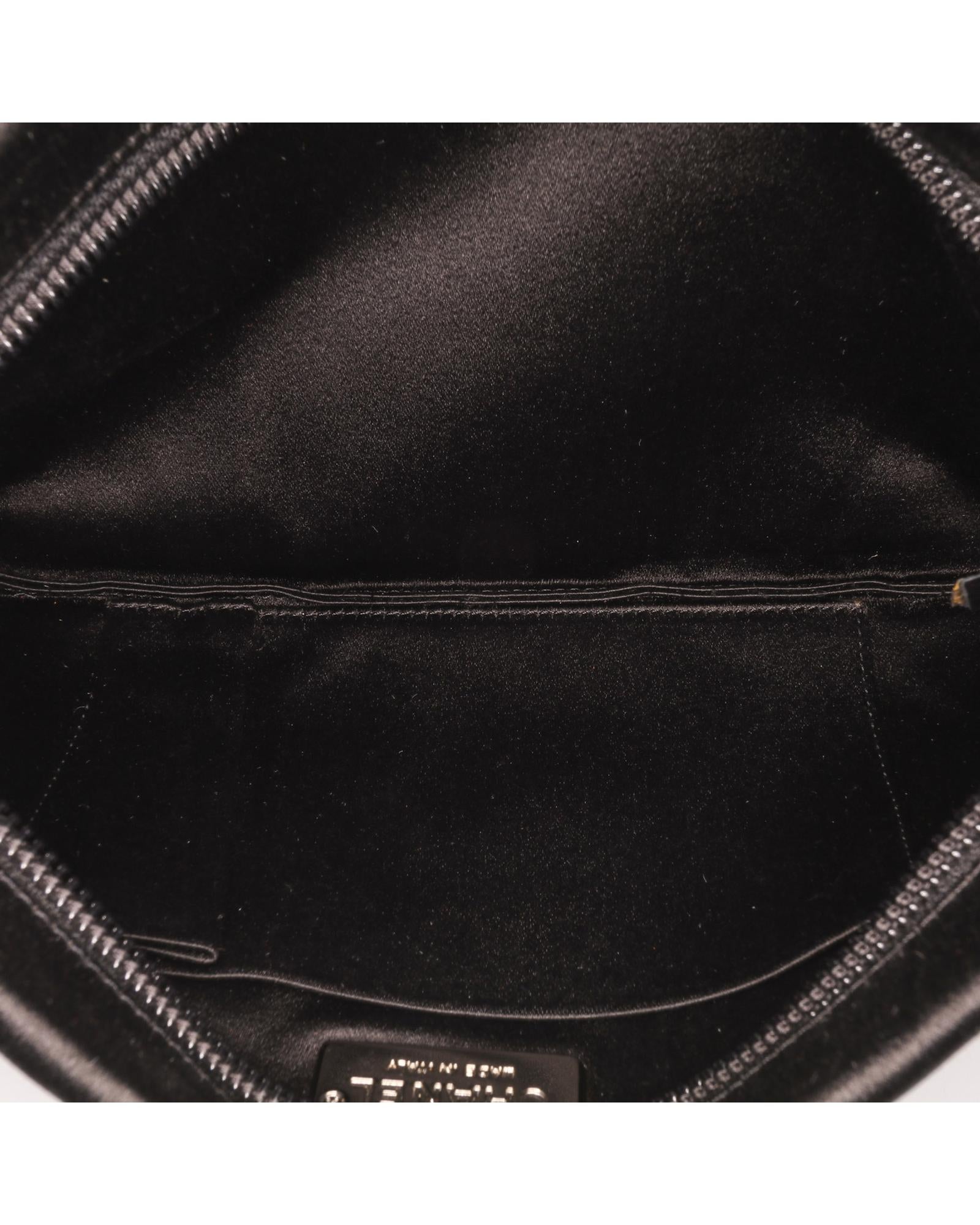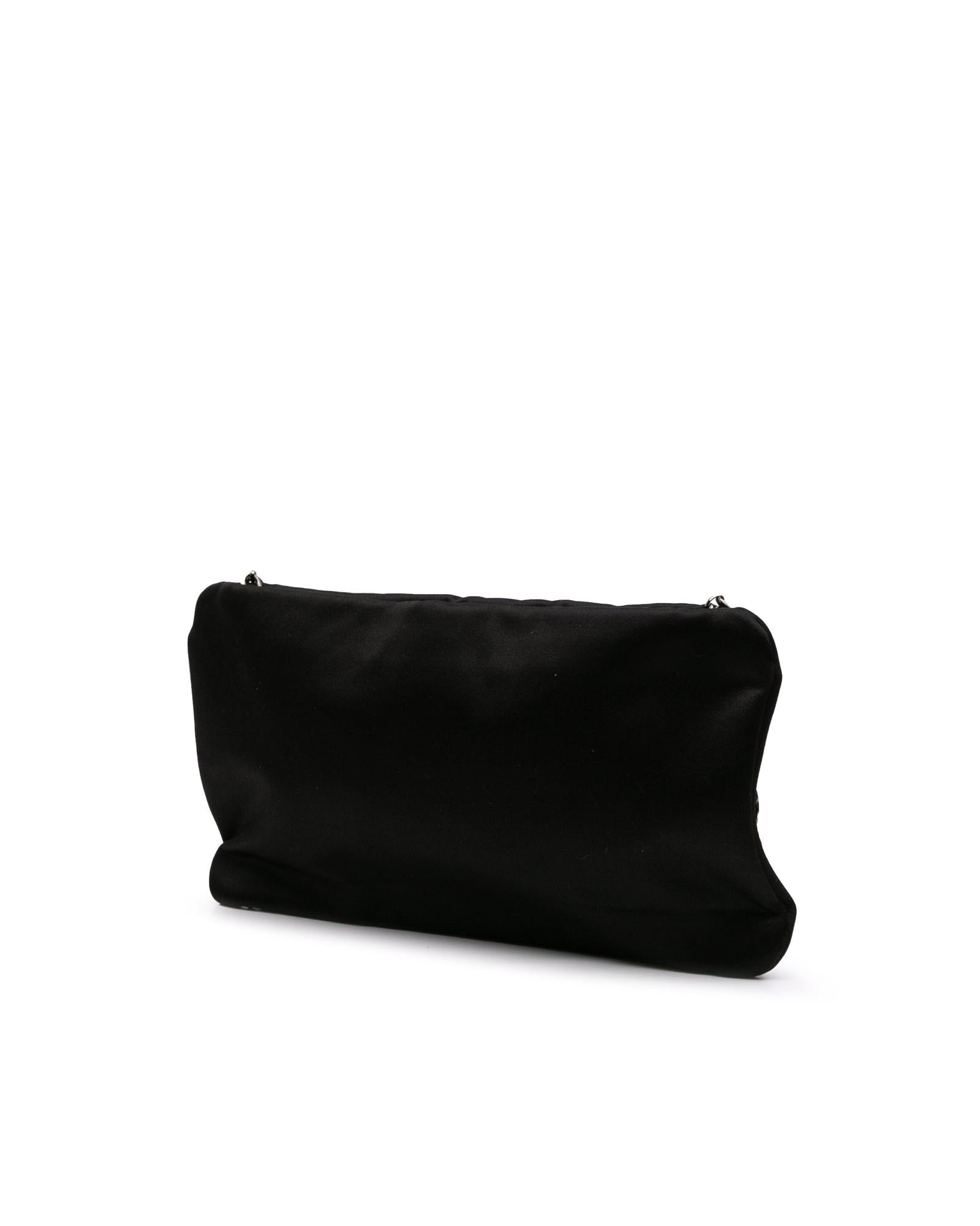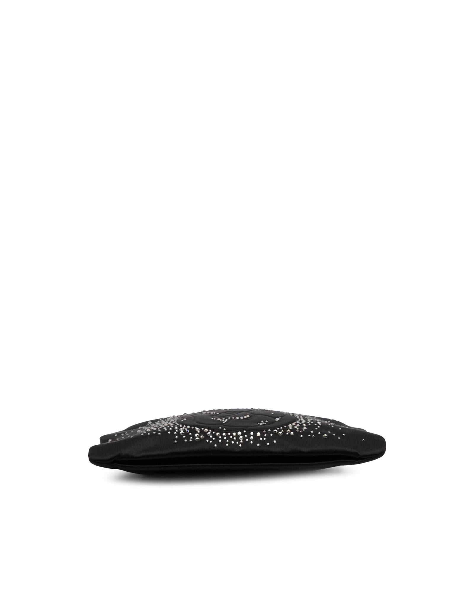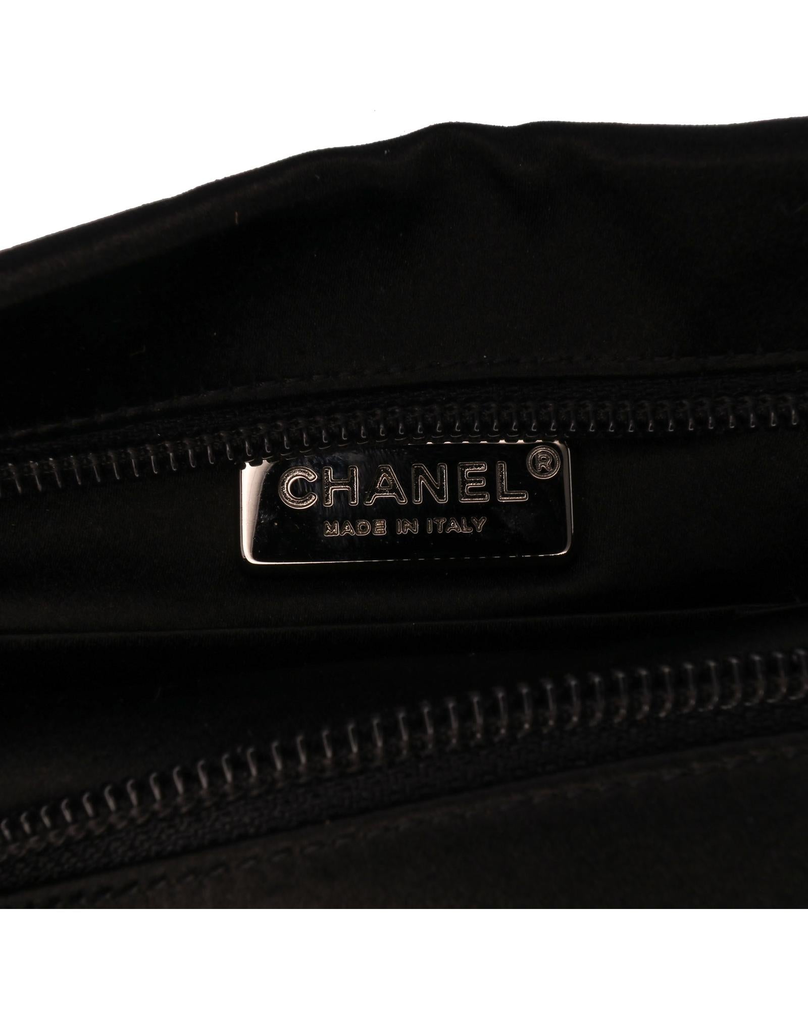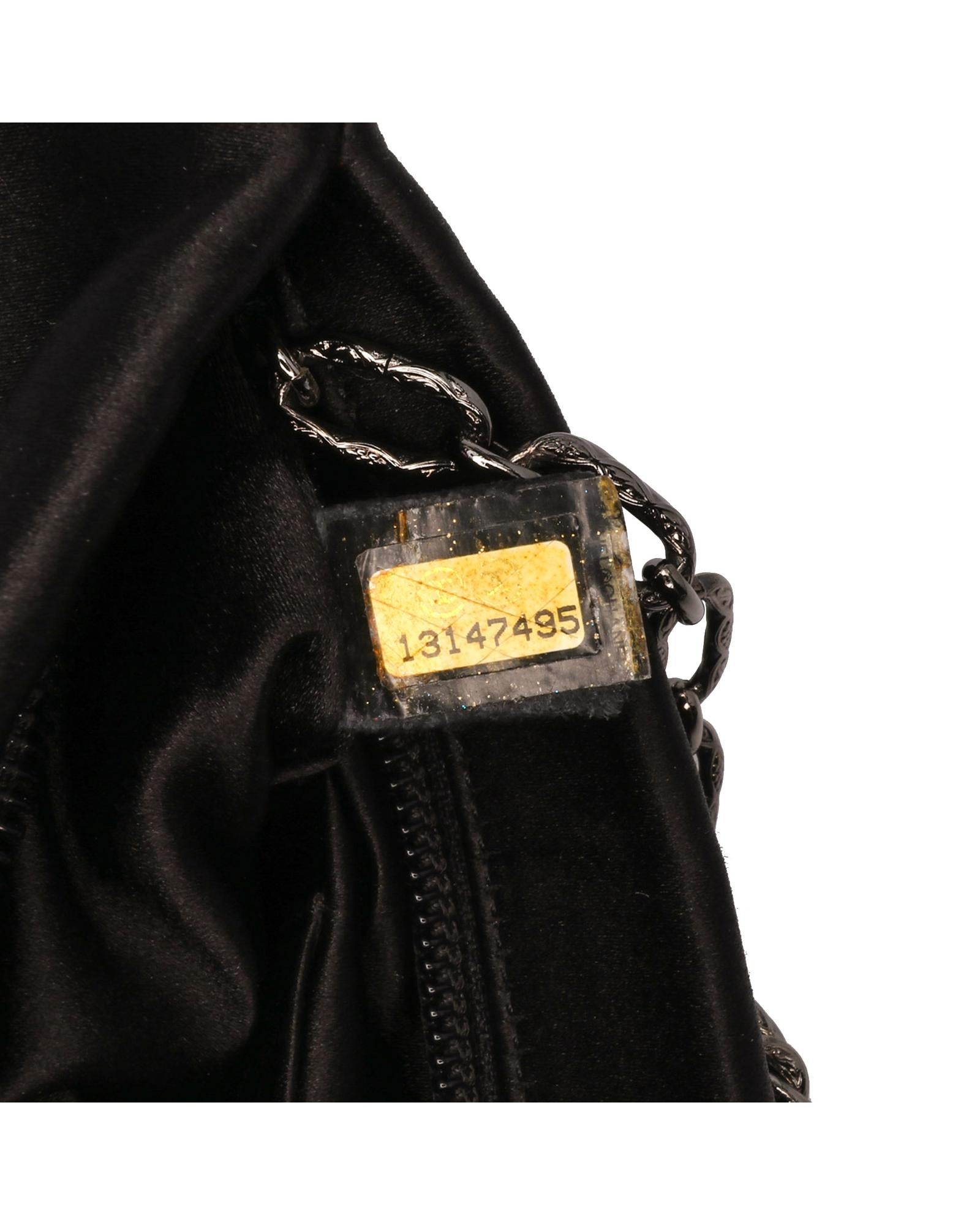 This shoulder bag features a satin body with crystal embellishments a chain link strap a top zip closure and an interior slip pocket.Brand: Chanel