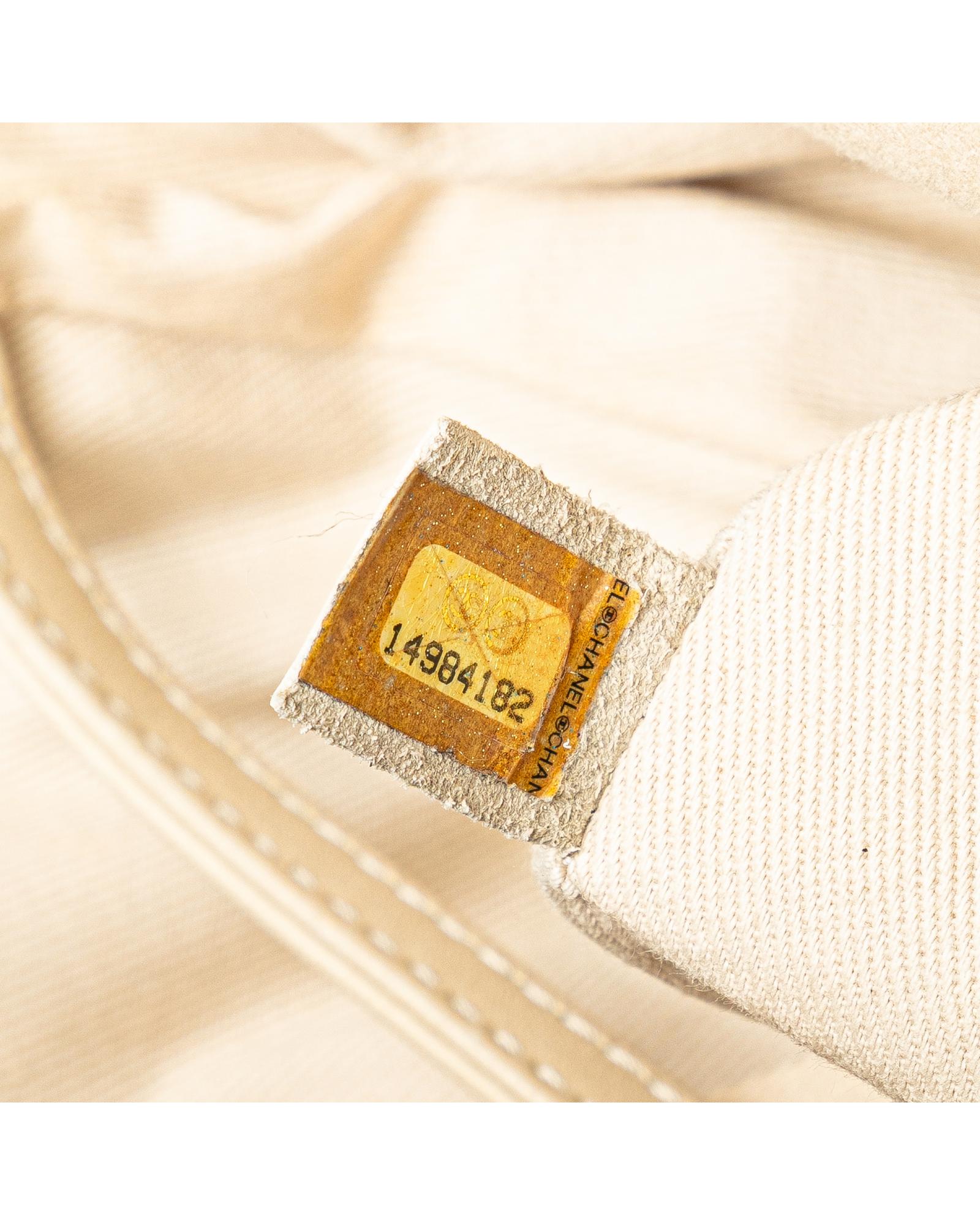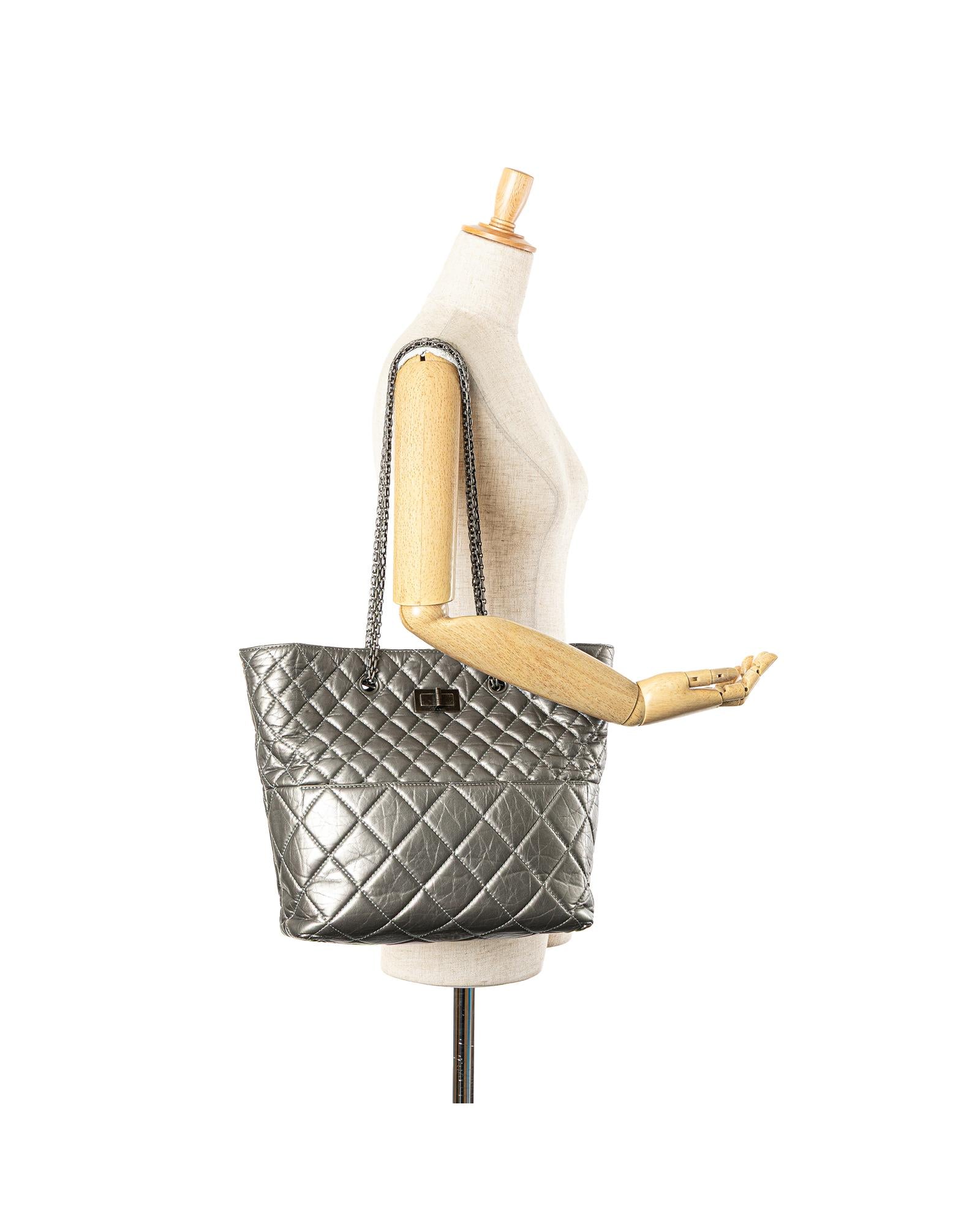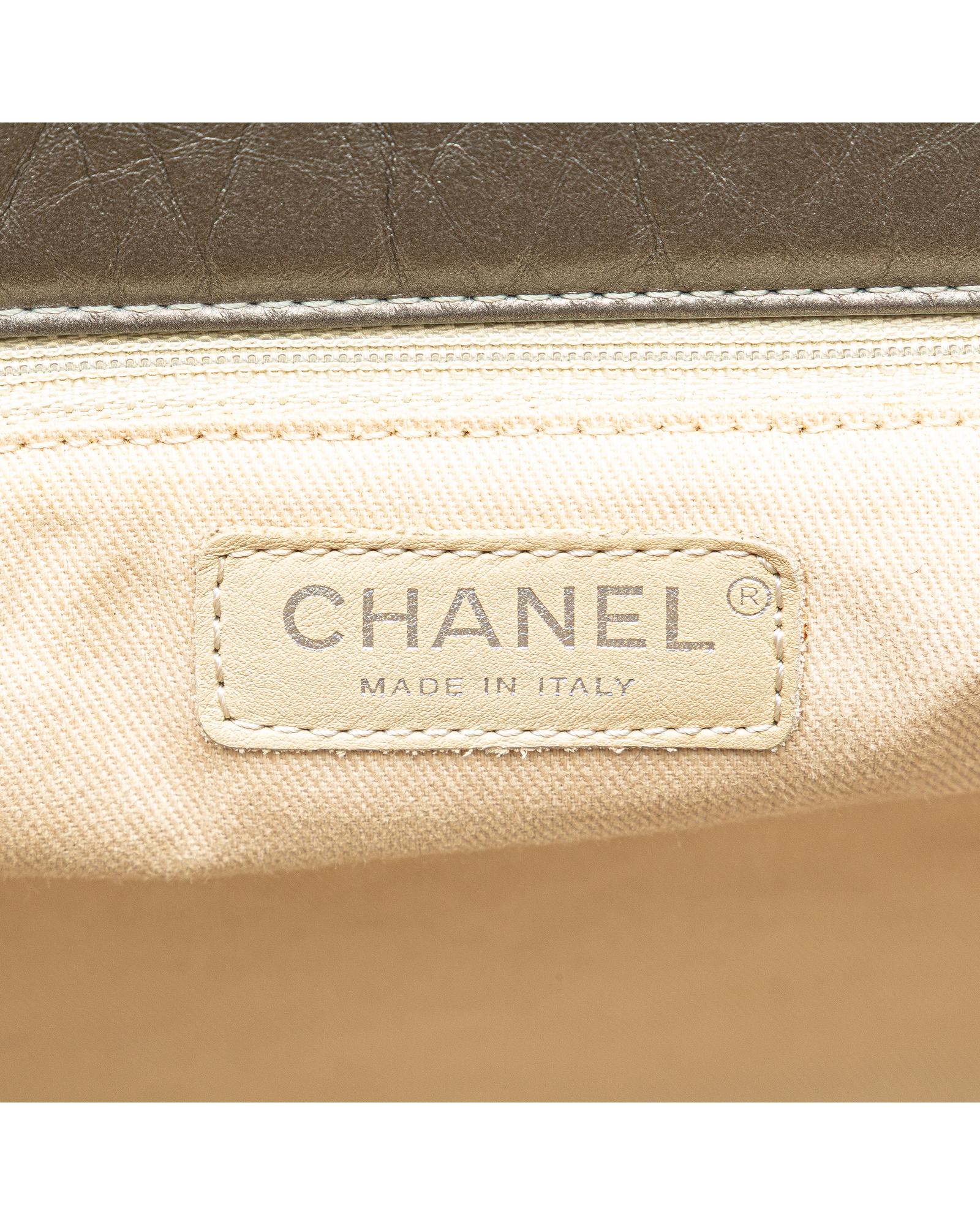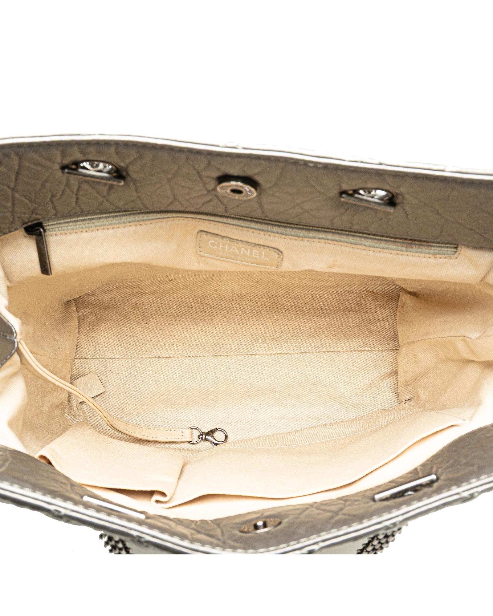 This tote bag features an aged calfskin leather body chain link shoulder straps an open top with magnetic snap button closure and interior zip and slip pockets.Brand: Chanel